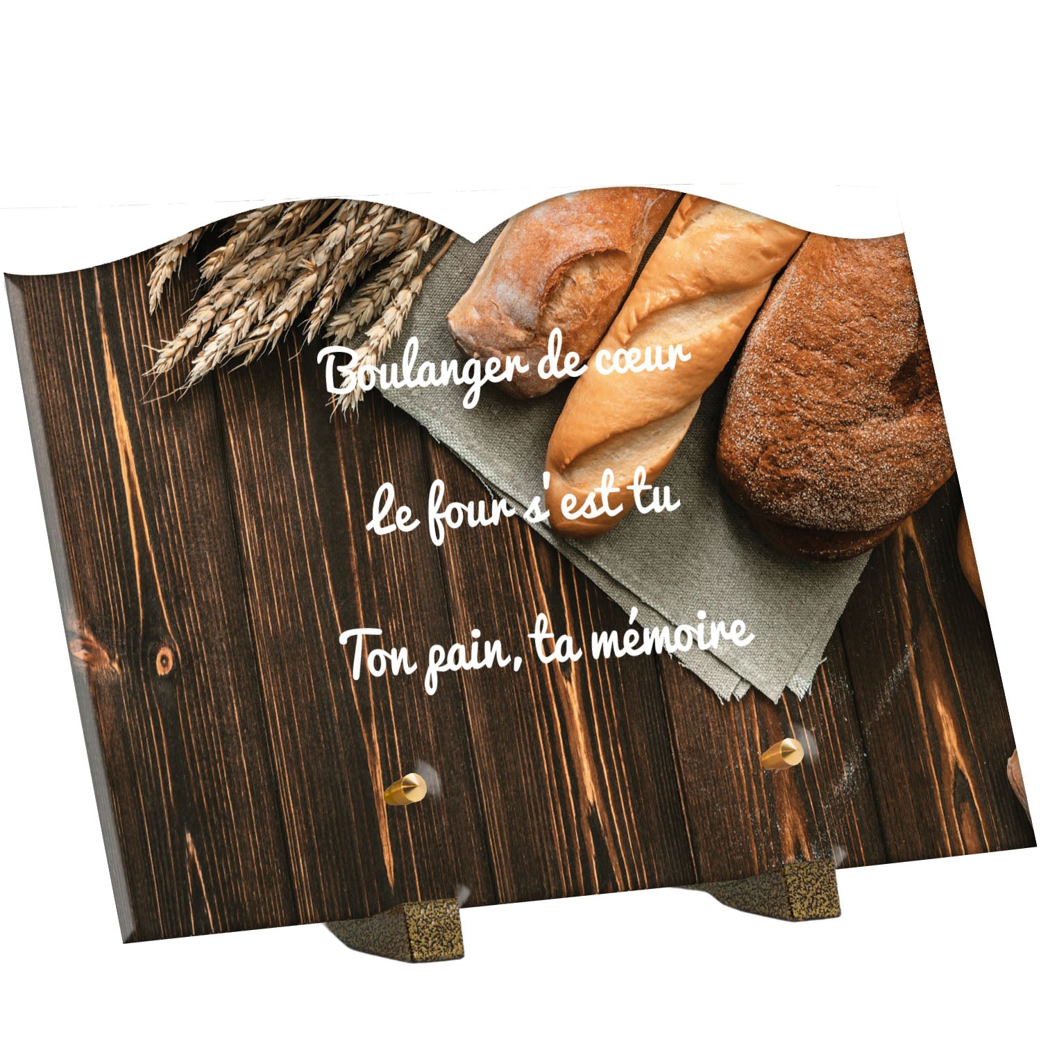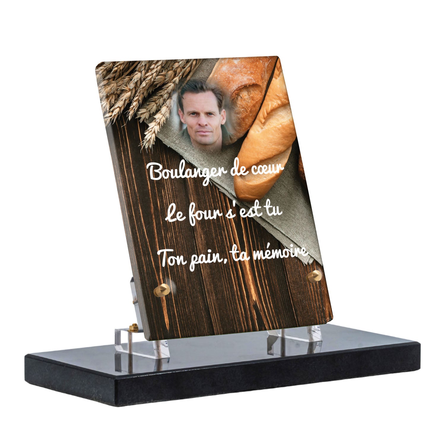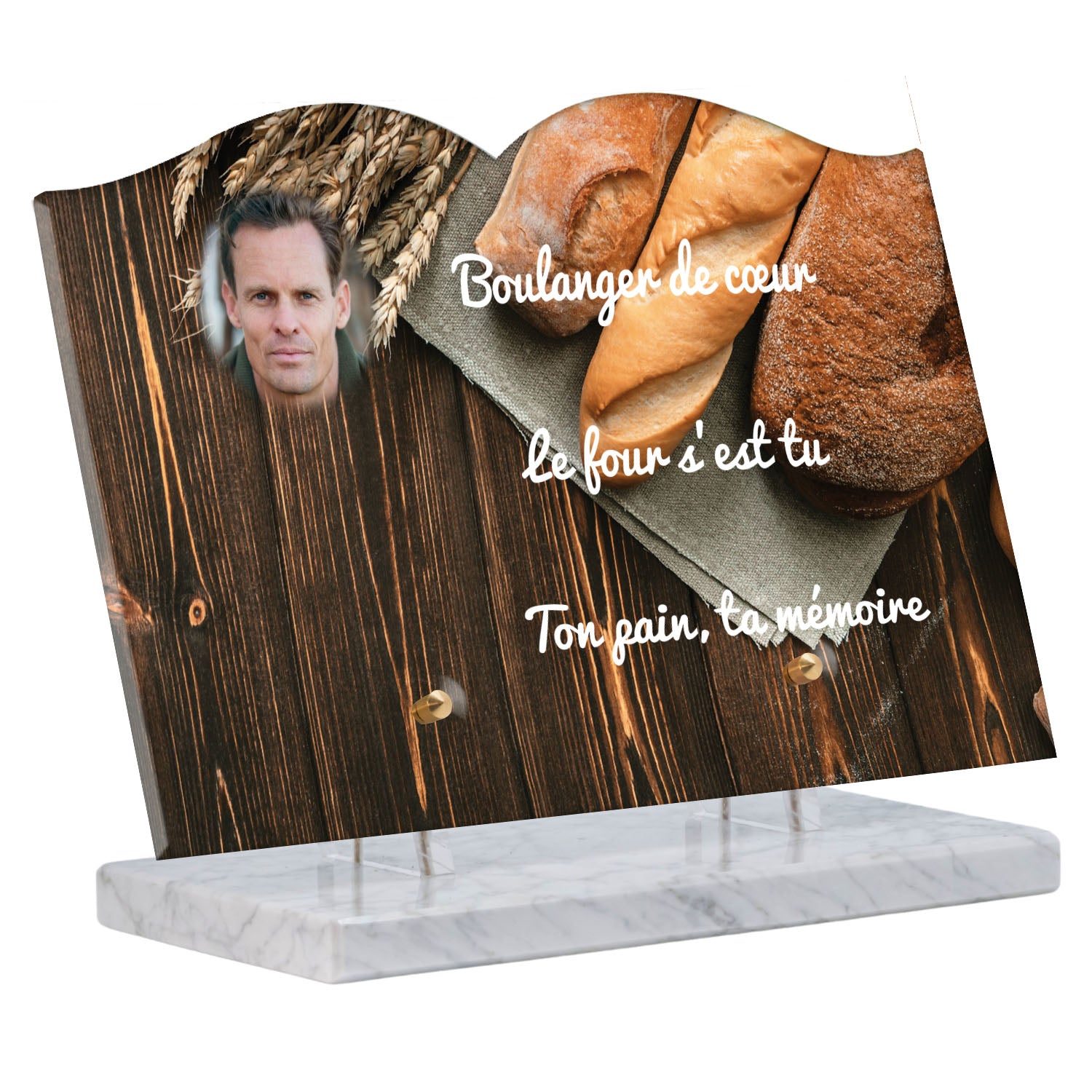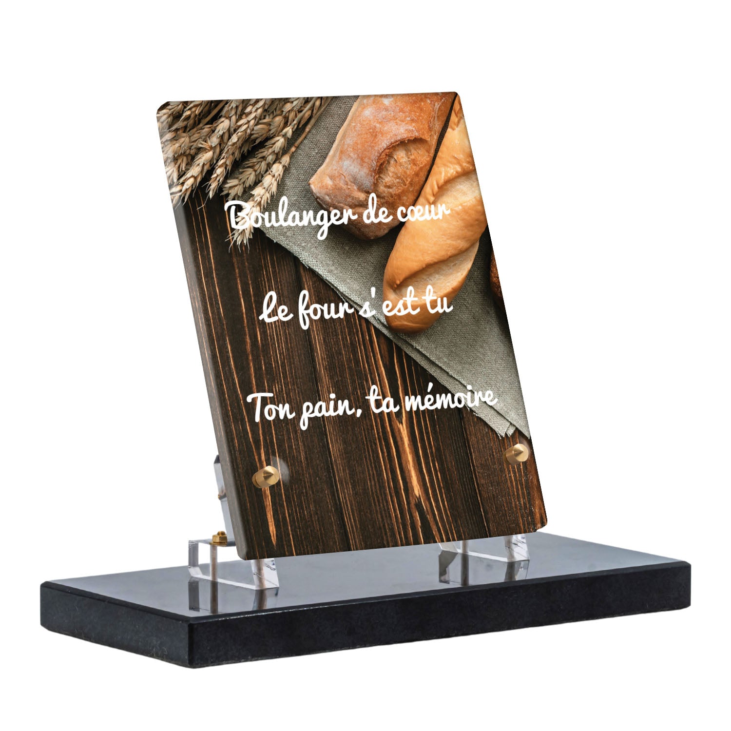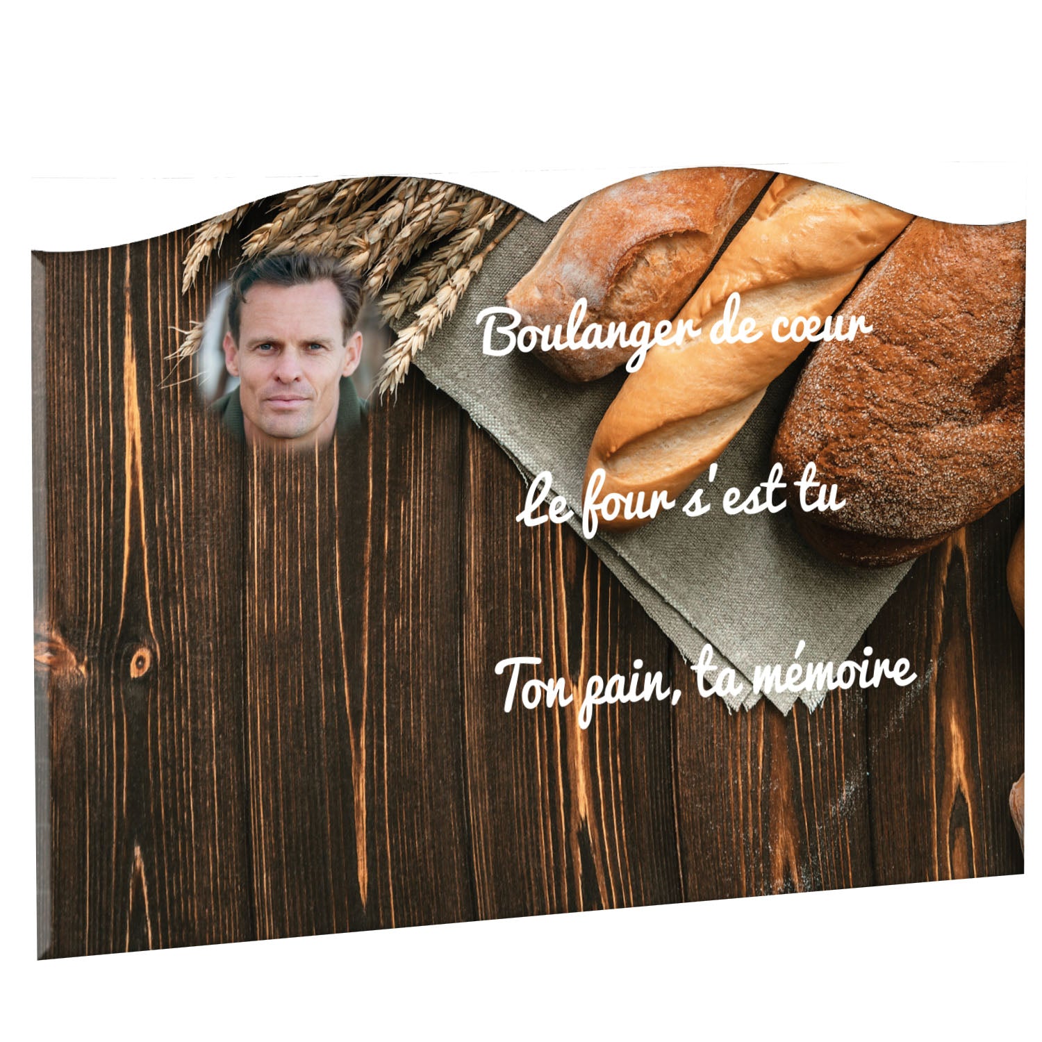 Cette plaque funéraire personnalisée "Boulanger" illustre avec finesse une planche en bois ornée d’un pain, alliant authenticité et symbolisme. Véritable plaque mortuaire, elle apporte une touche respectueuse et touchante au geste hommage. Son style allie tradition et design contemporain, faisant d’elle une plaque funéraire moderne qui saura valoriser la mémoire de vos proches.