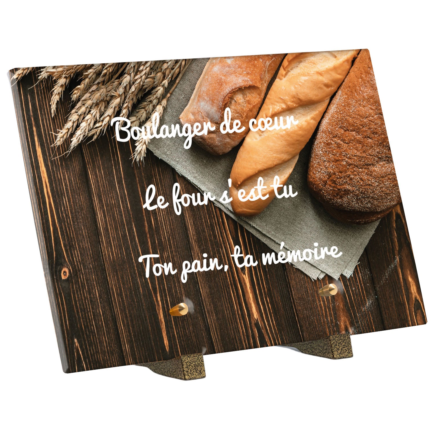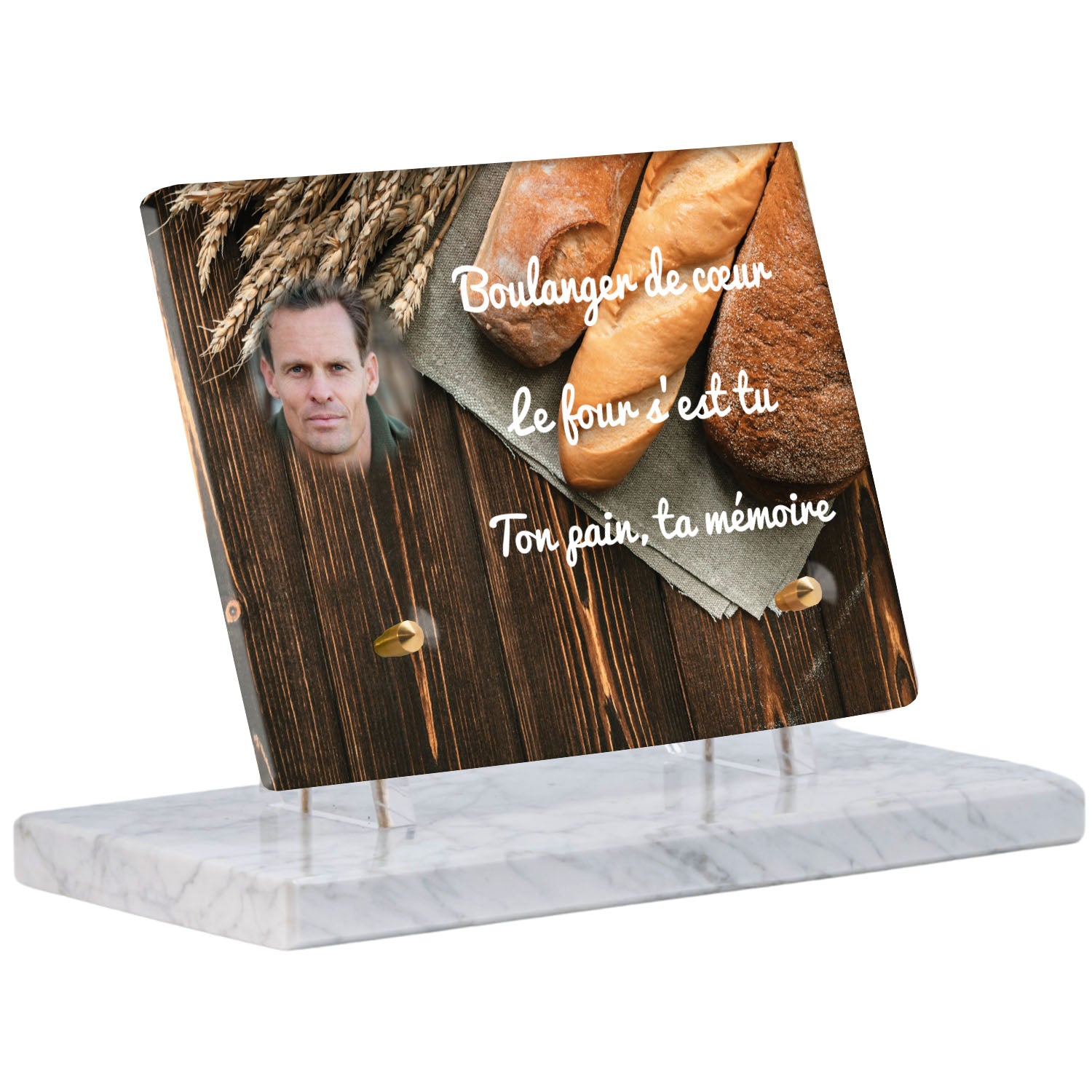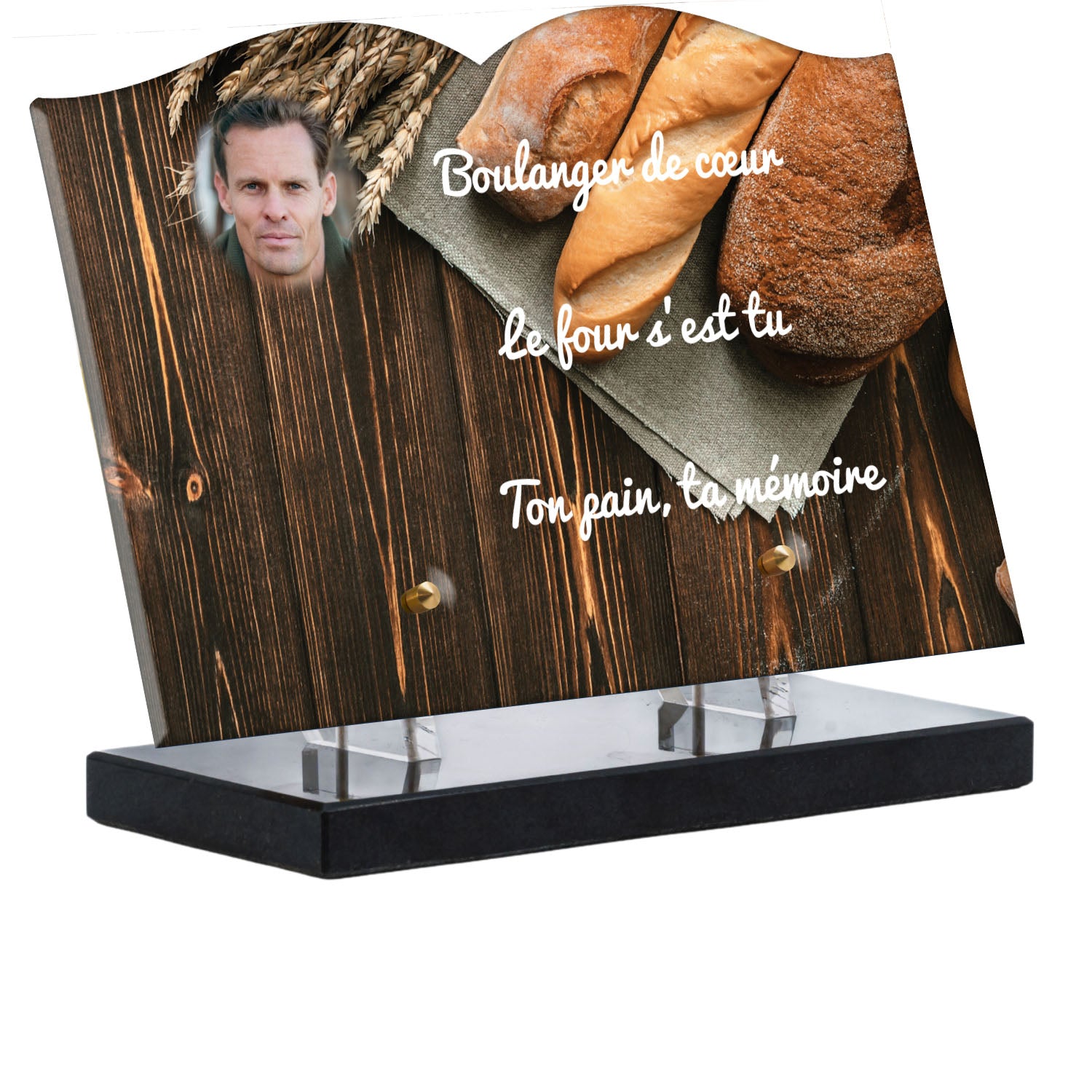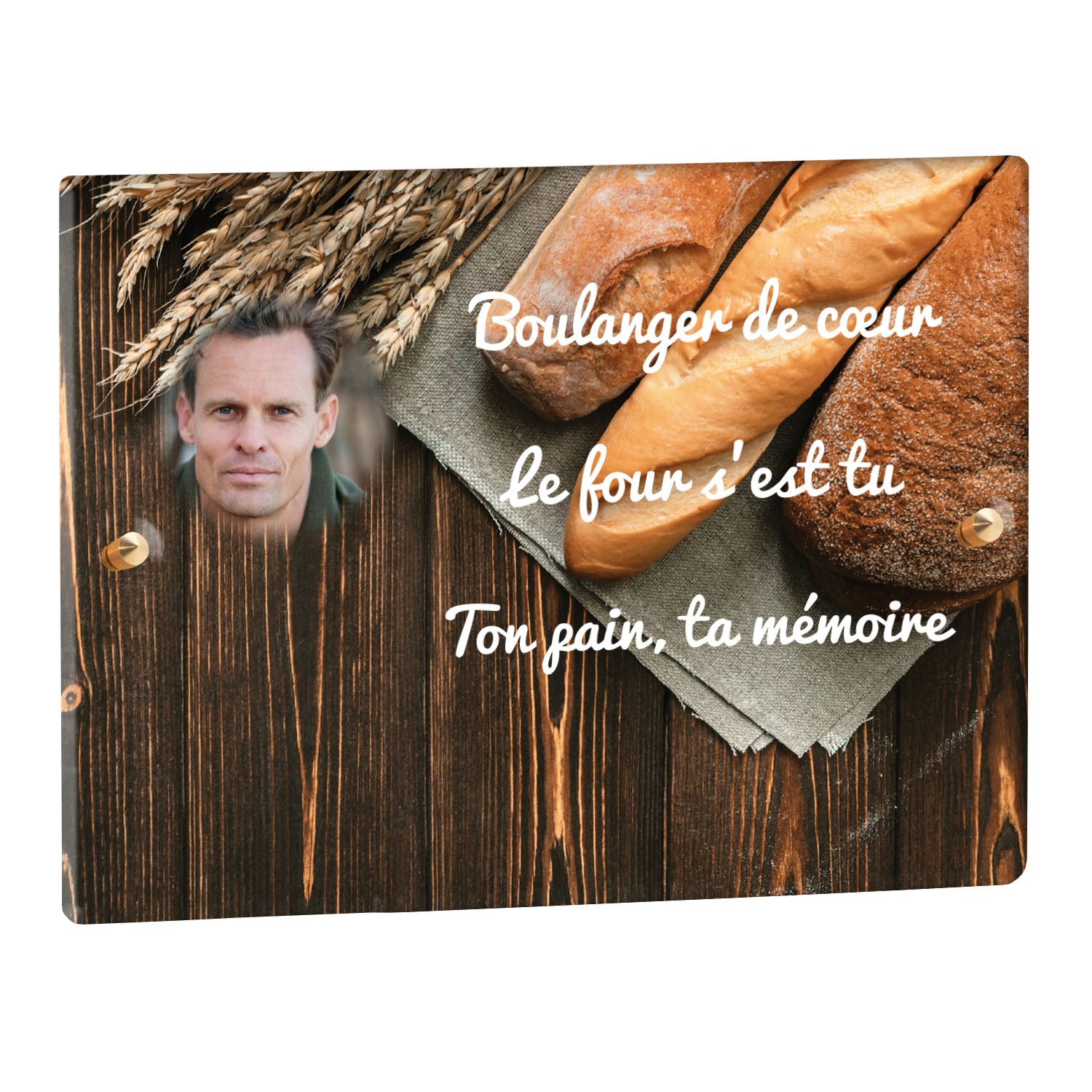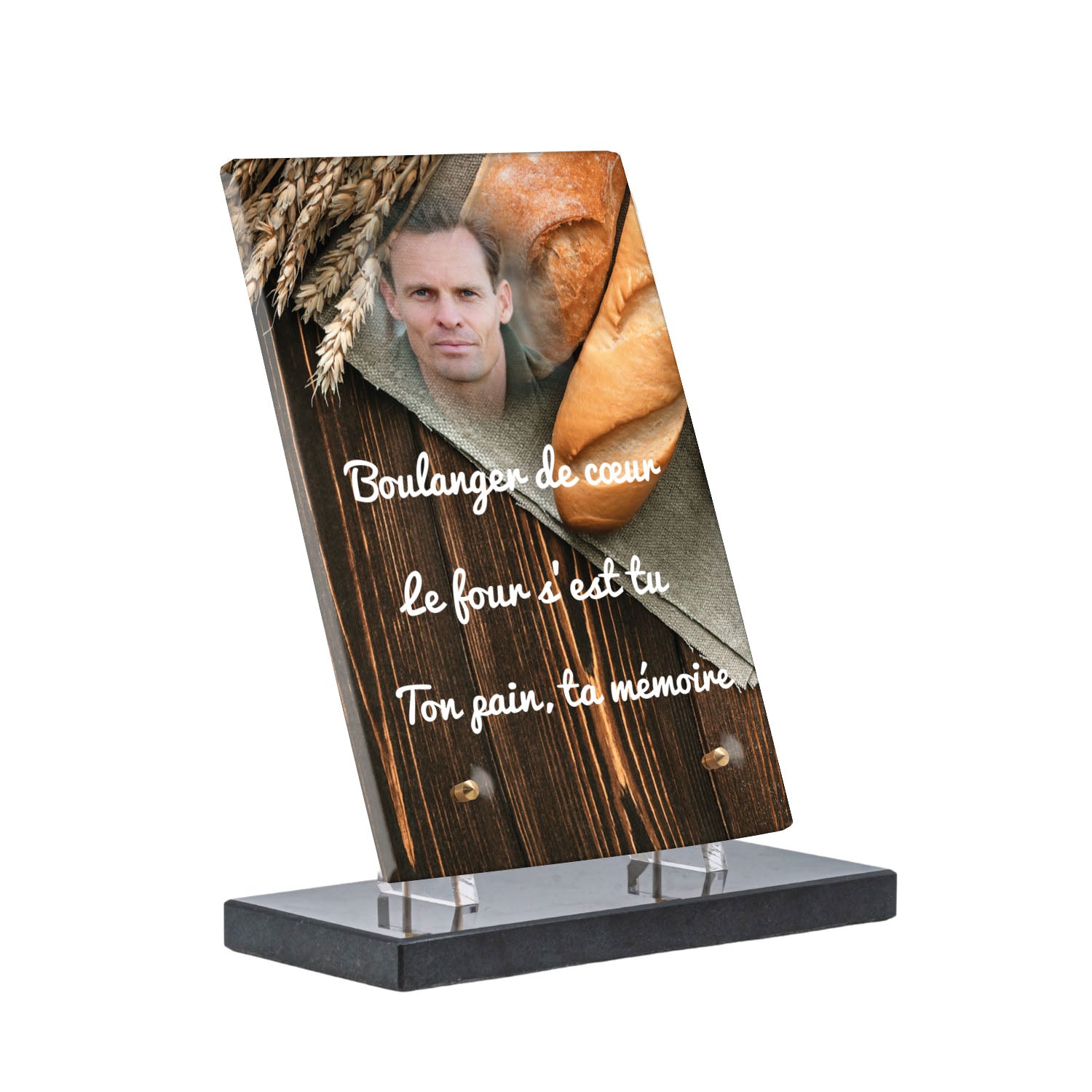 Cette plaque funéraire personnalisée "Boulanger" illustre avec finesse une planche en bois ornée d’un pain, alliant authenticité et symbolisme. Véritable plaque mortuaire, elle apporte une touche respectueuse et touchante au geste hommage. Son style allie tradition et design contemporain, faisant d’elle une plaque funéraire moderne qui saura valoriser la mémoire de vos proches.