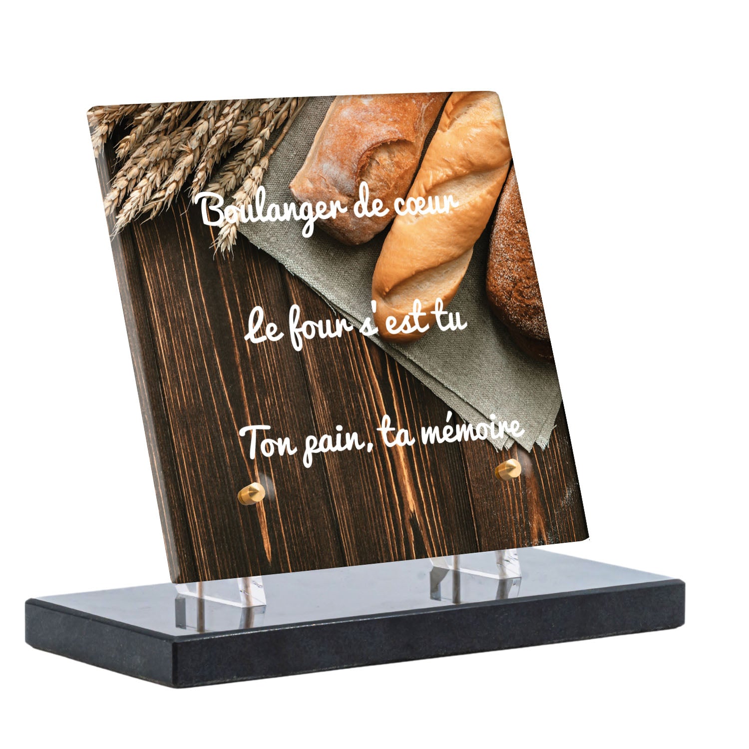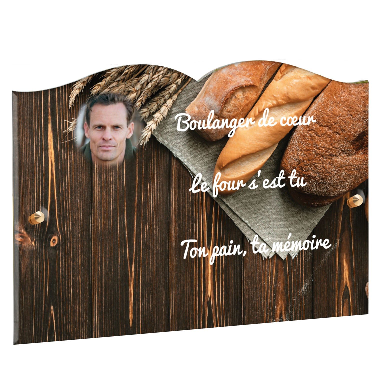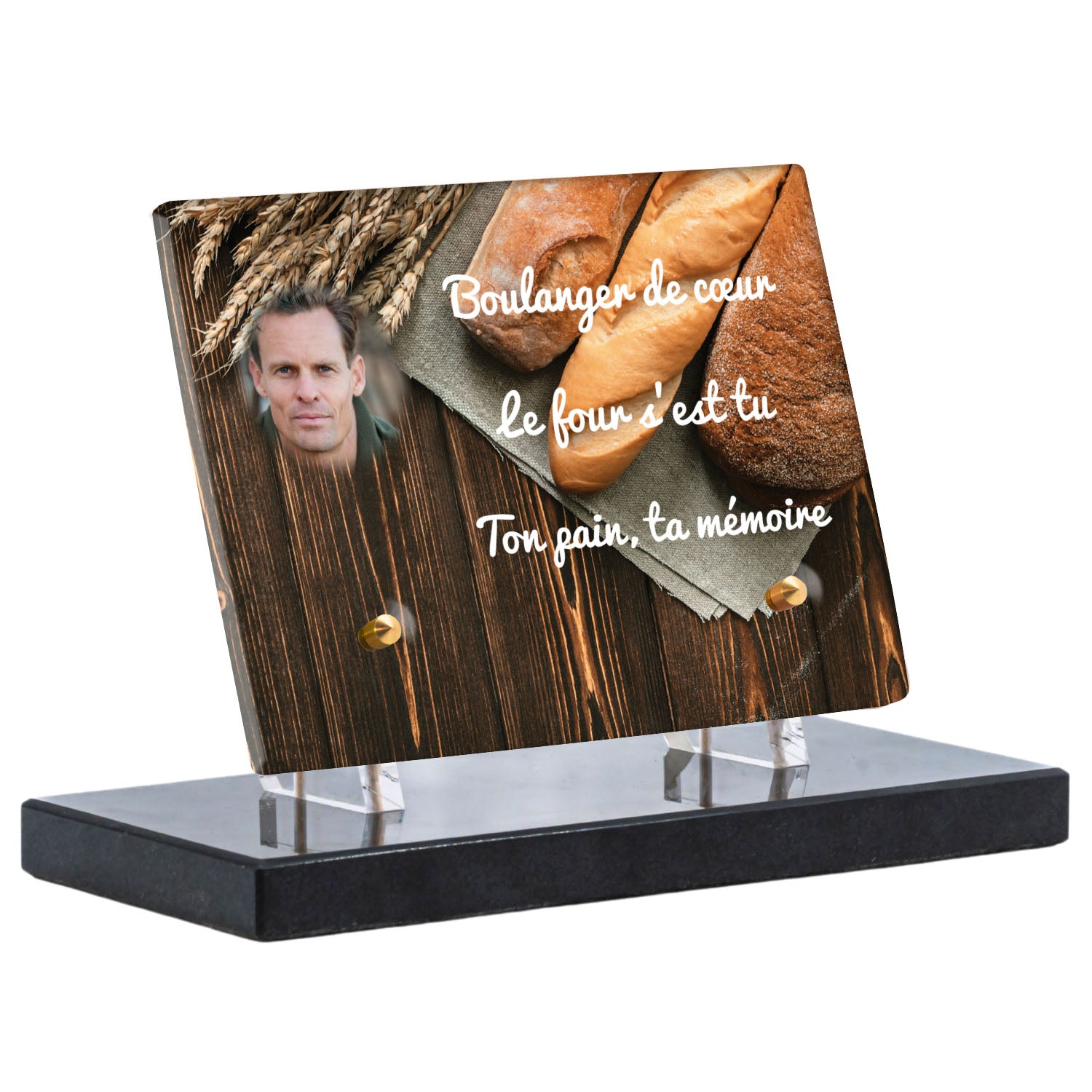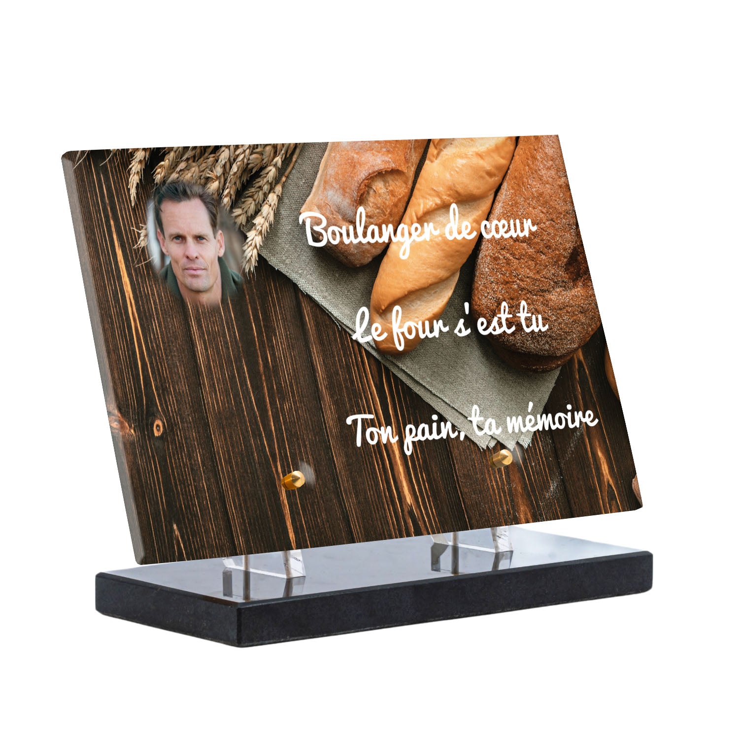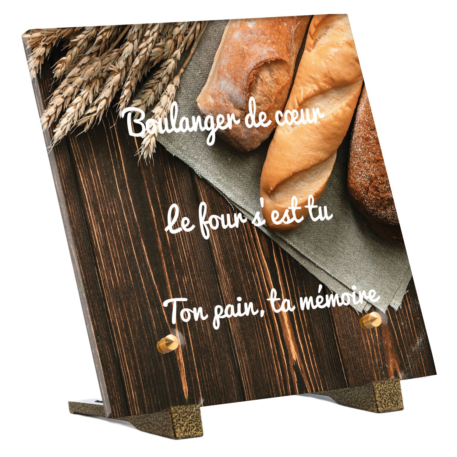 Cette plaque funéraire personnalisée "Boulanger" illustre avec finesse une planche en bois ornée d’un pain, alliant authenticité et symbolisme. Véritable plaque mortuaire, elle apporte une touche respectueuse et touchante au geste hommage. Son style allie tradition et design contemporain, faisant d’elle une plaque funéraire moderne qui saura valoriser la mémoire de vos proches.