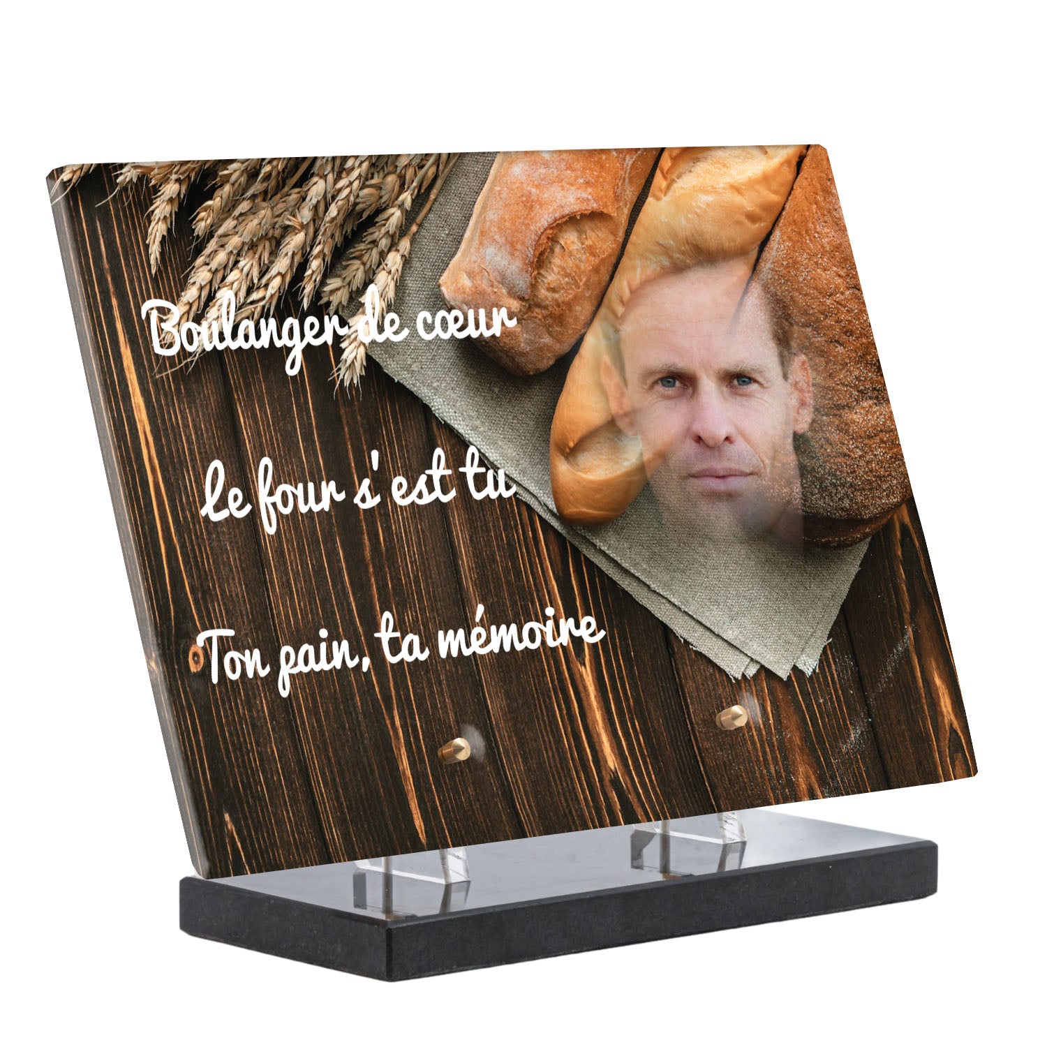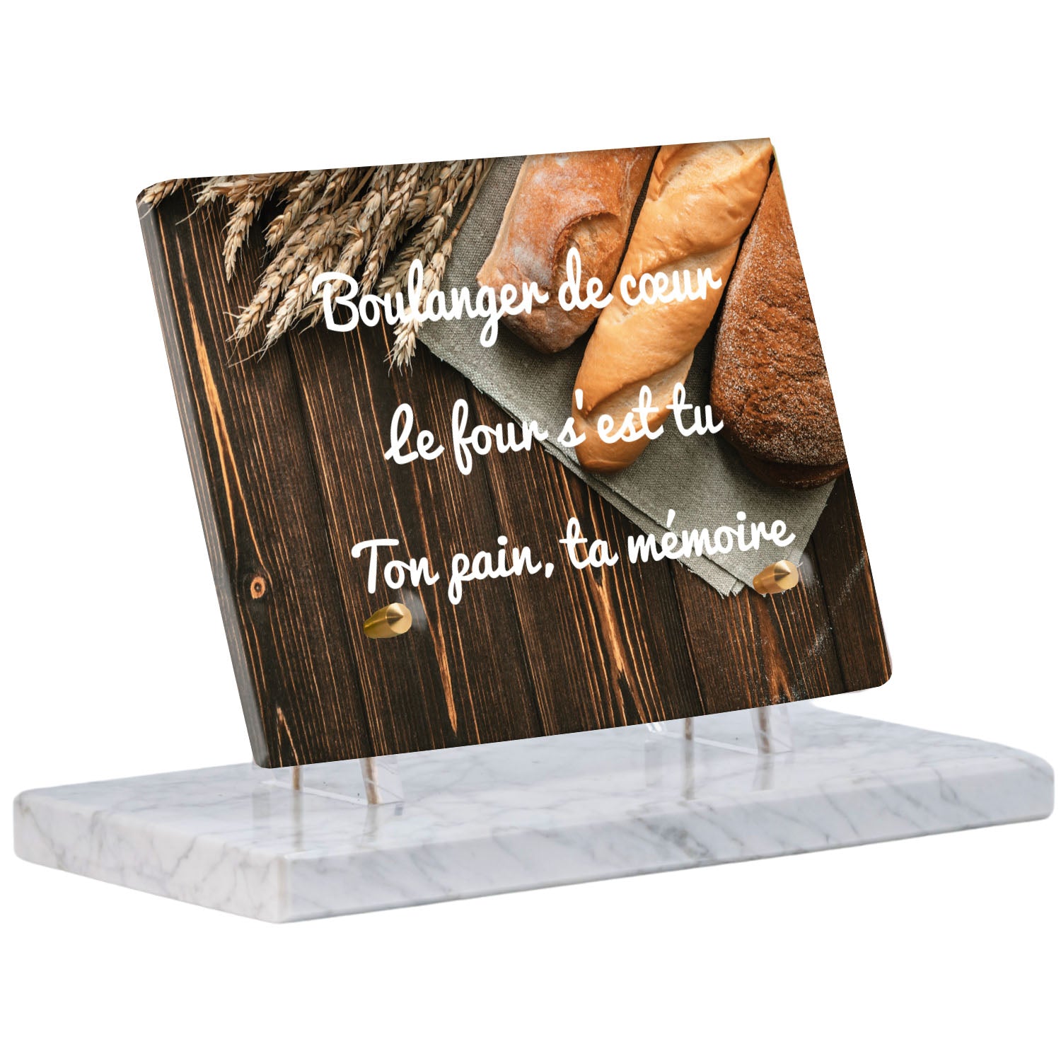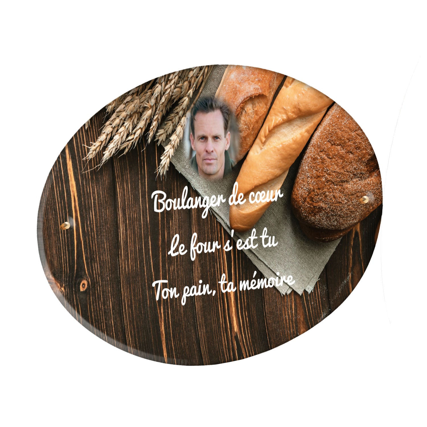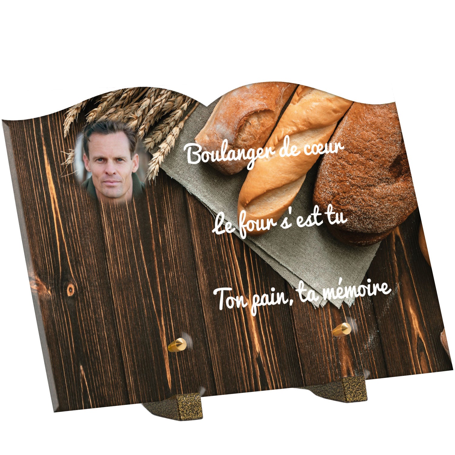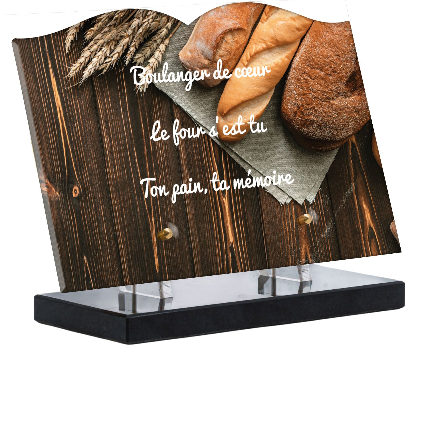 Cette plaque funéraire personnalisée "Boulanger" illustre avec finesse une planche en bois ornée d’un pain, alliant authenticité et symbolisme. Véritable plaque mortuaire, elle apporte une touche respectueuse et touchante au geste hommage. Son style allie tradition et design contemporain, faisant d’elle une plaque funéraire moderne qui saura valoriser la mémoire de vos proches.