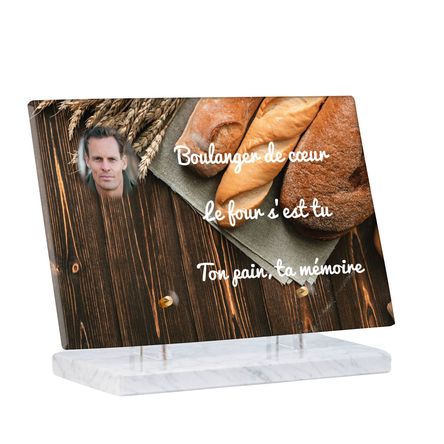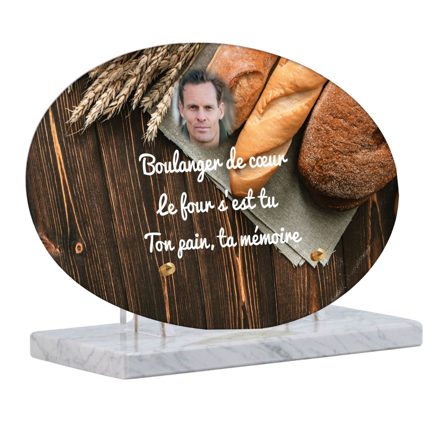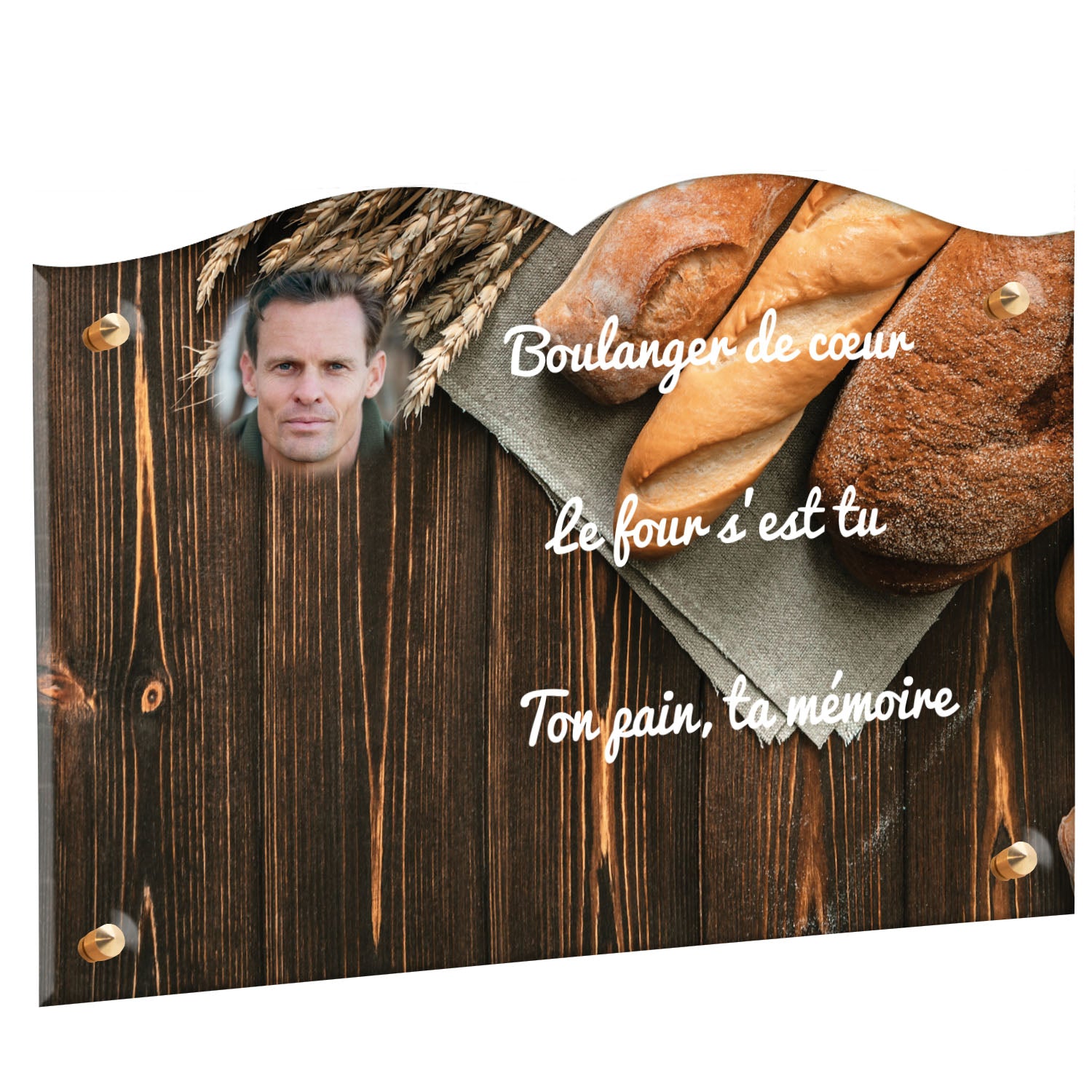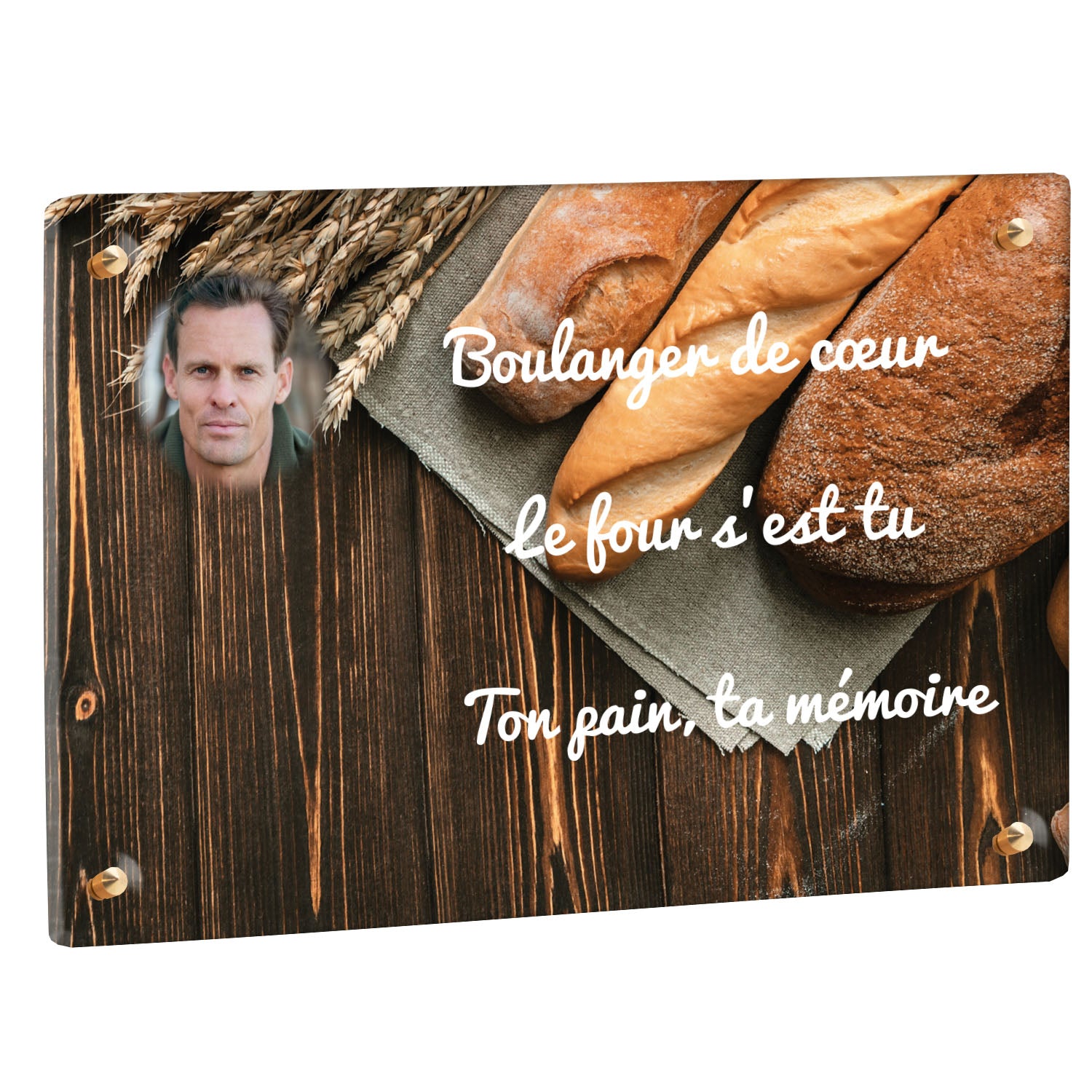 Cette plaque funéraire personnalisée "Boulanger" illustre avec finesse une planche en bois ornée d’un pain, alliant authenticité et symbolisme. Véritable plaque mortuaire, elle apporte une touche respectueuse et touchante au geste hommage. Son style allie tradition et design contemporain, faisant d’elle une plaque funéraire moderne qui saura valoriser la mémoire de vos proches.
