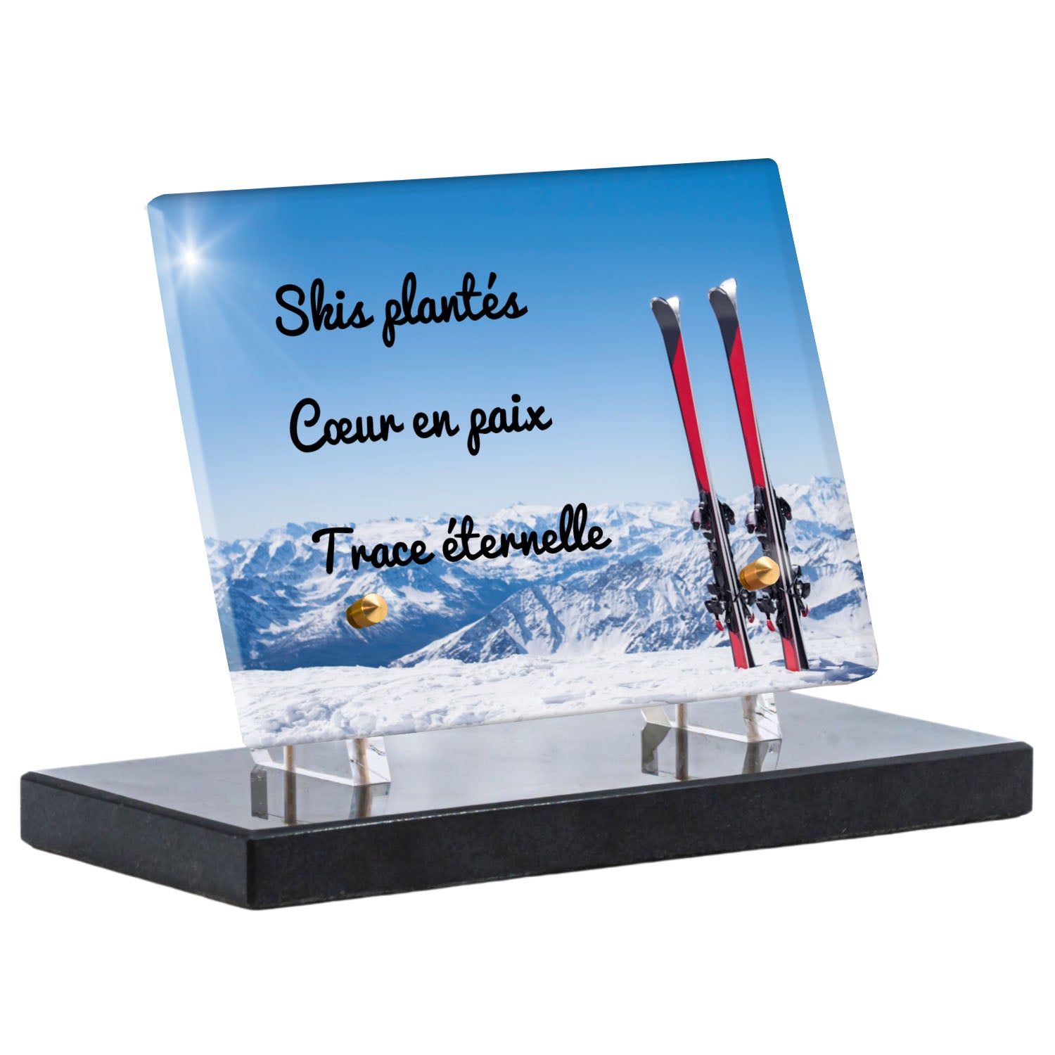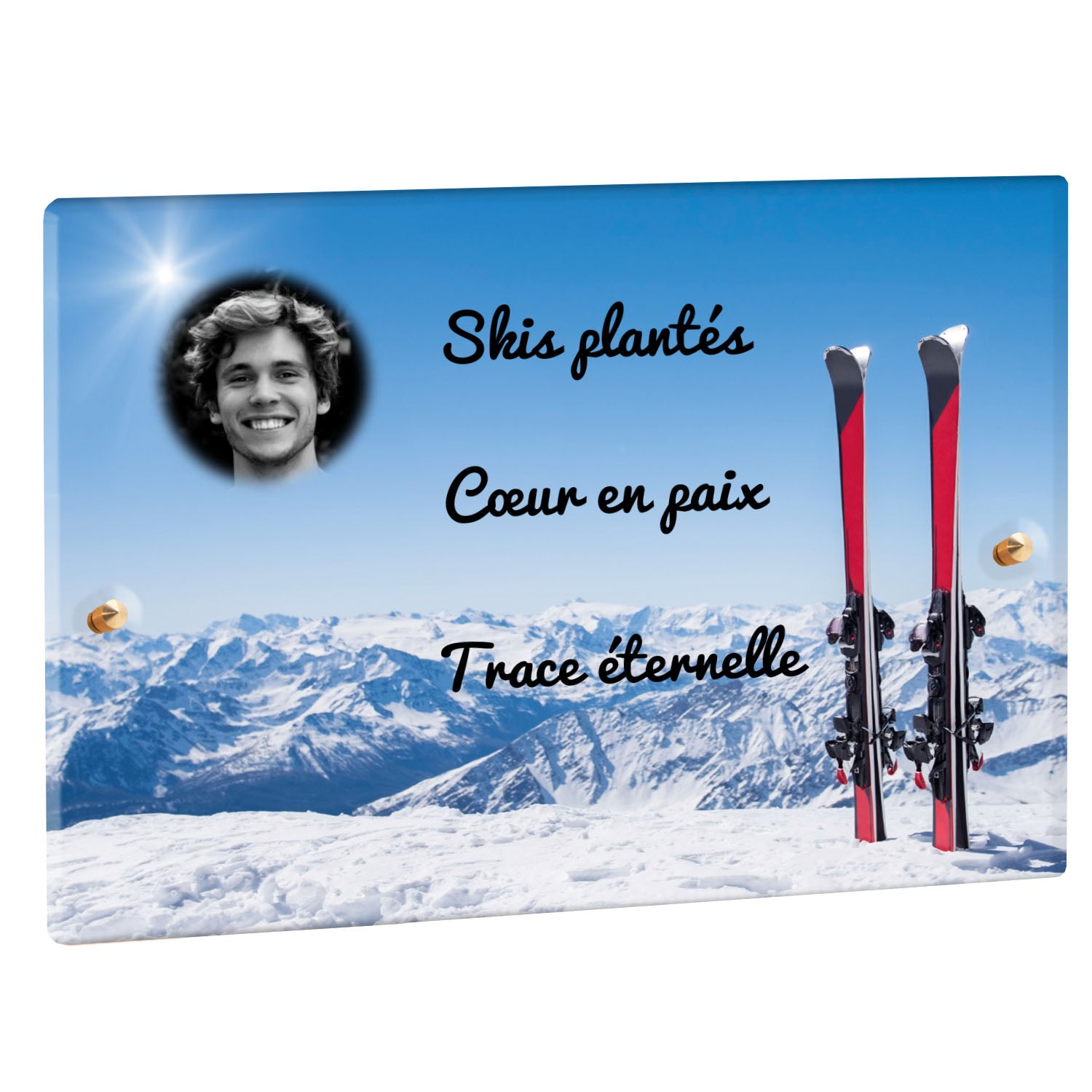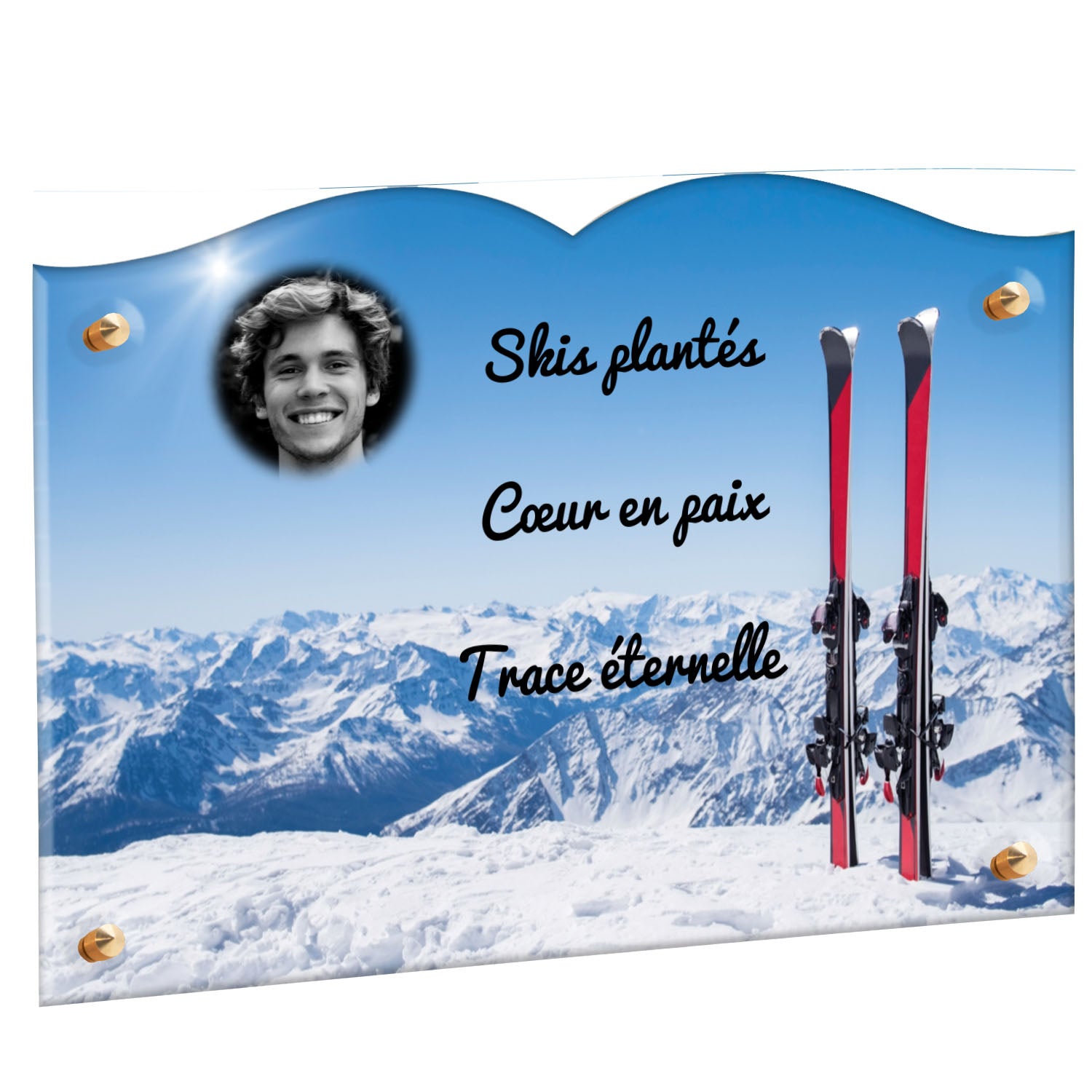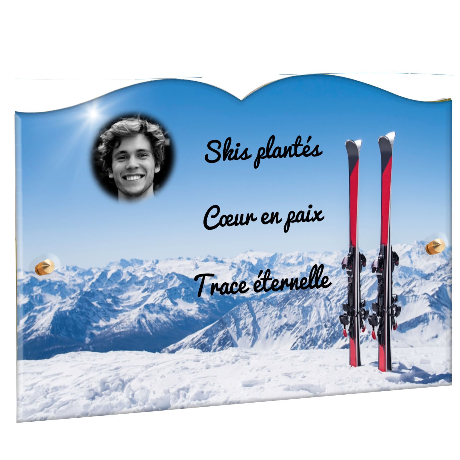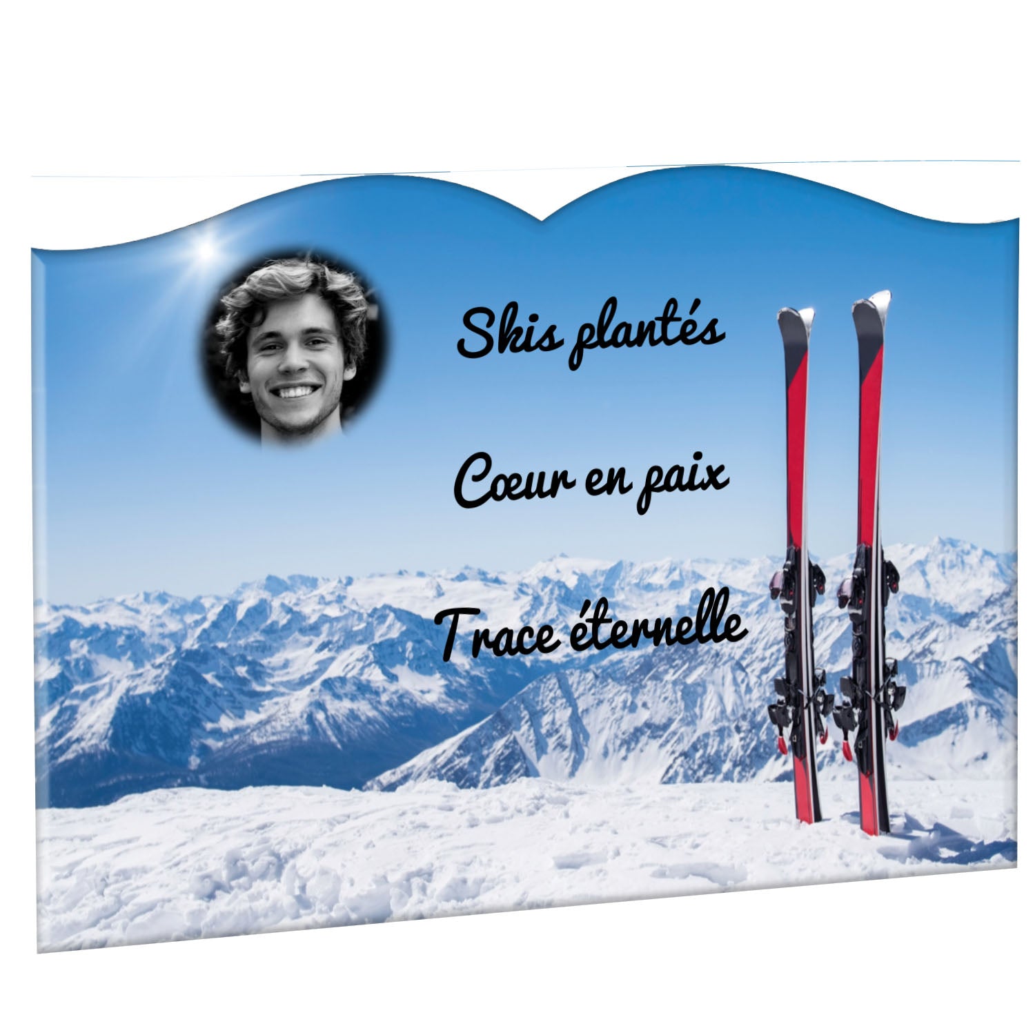 Cette plaque funéraire personnalisée met en scène une paire de ski sur la piste, idéale pour honorer la mémoire d’un amateur de sports d’hiver avec élégance. Fabriquée à partir de matériaux haut de gamme, cette plaque mortuaire allie esthétique et robustesse. Le choix du plexiglas confère à cette plaque funéraire moderne une finition lumineuse et une excellente résistance aux intempéries pour un hommage durable.