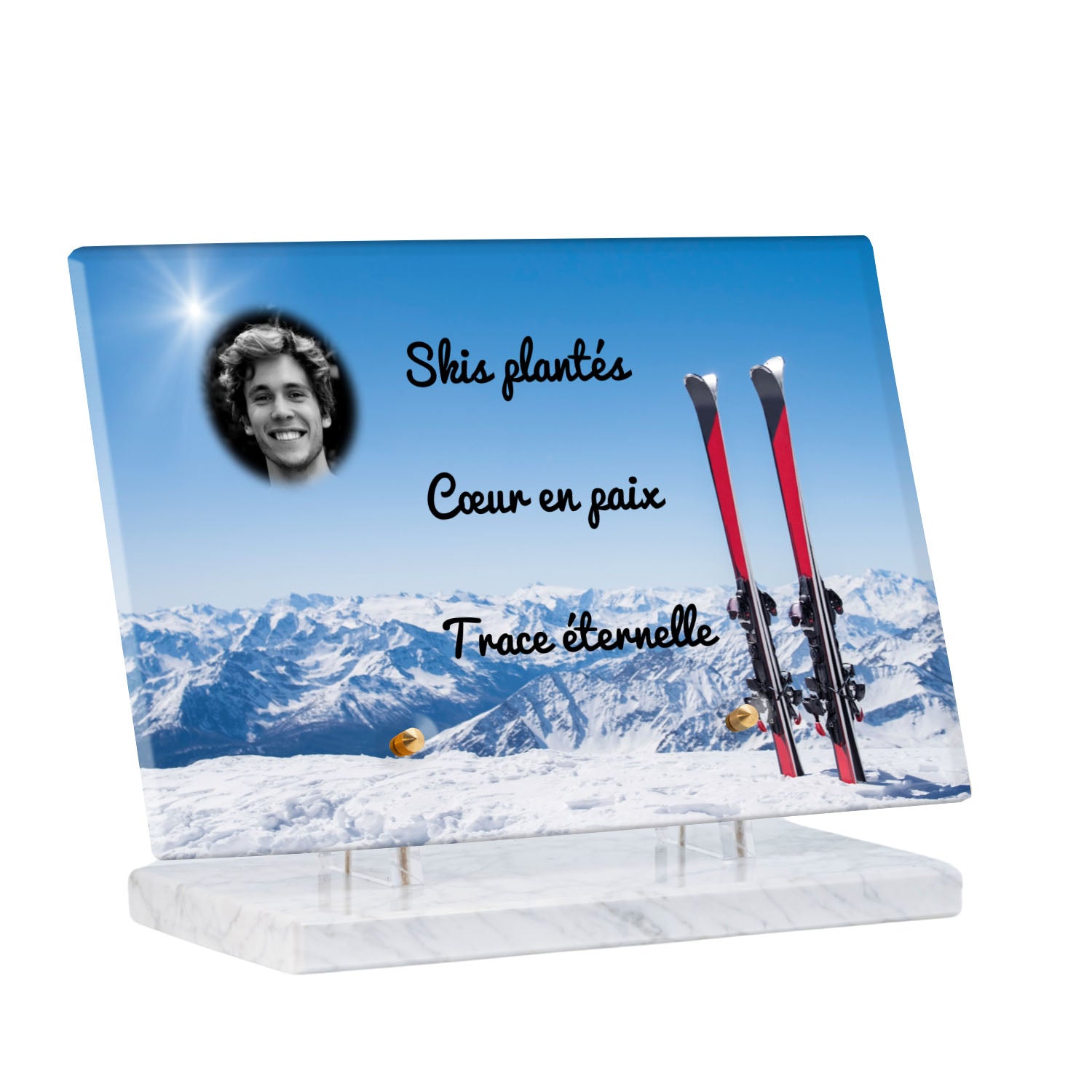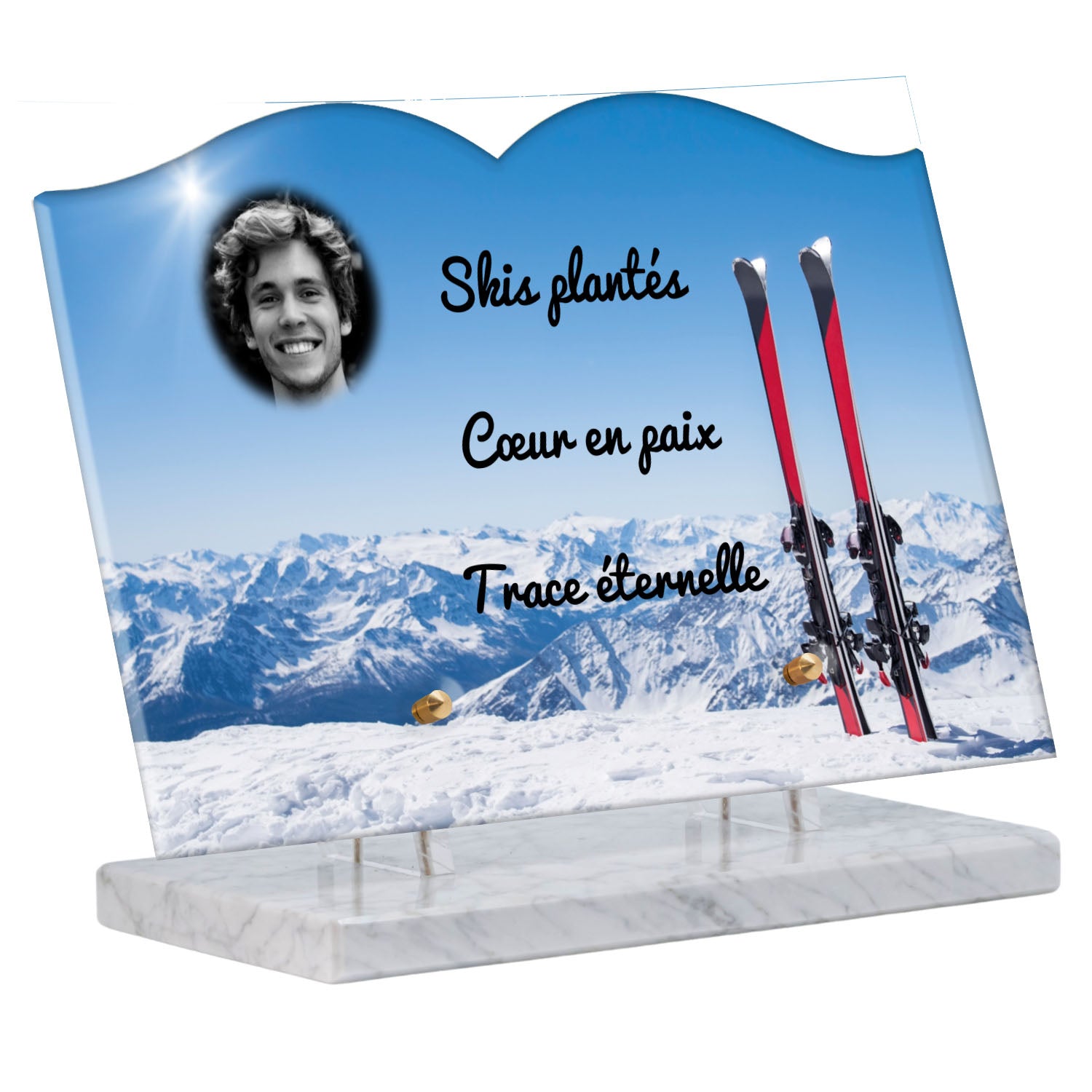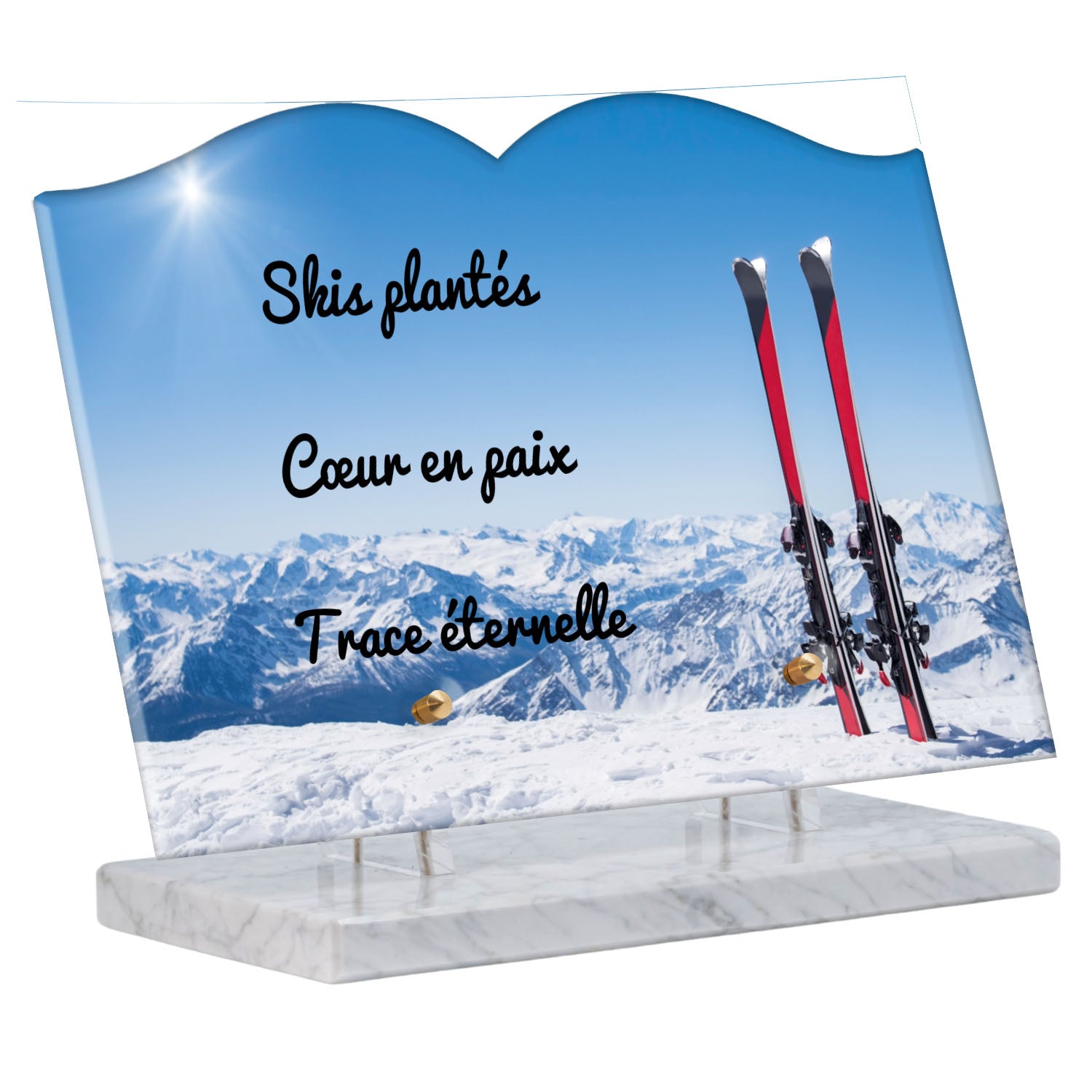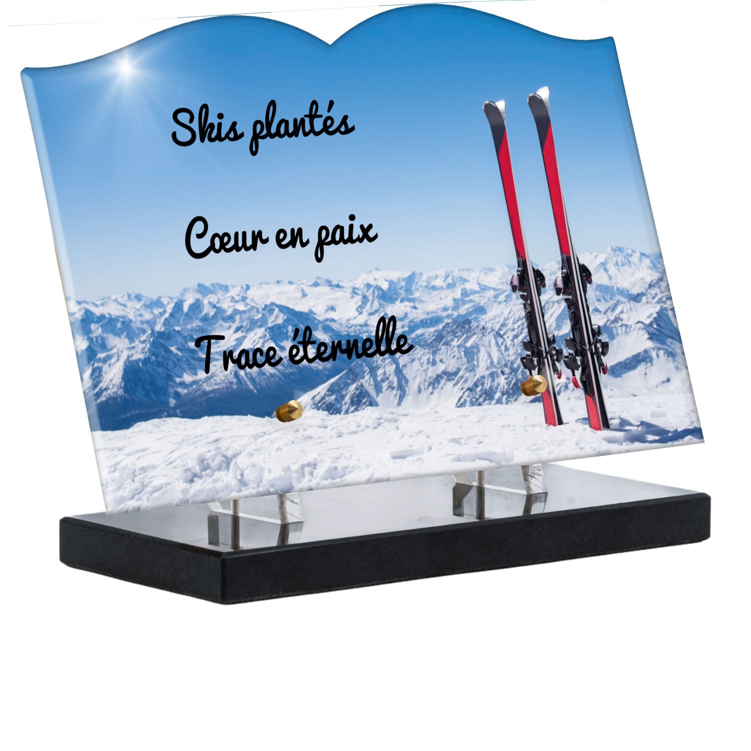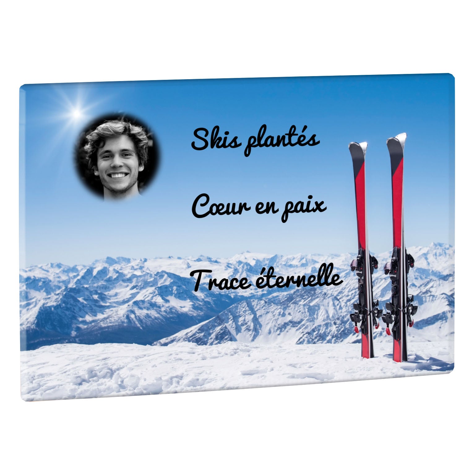 Cette plaque funéraire personnalisée met en scène une paire de ski sur la piste, idéale pour honorer la mémoire d’un amateur de sports d’hiver avec élégance. Fabriquée à partir de matériaux haut de gamme, cette plaque mortuaire allie esthétique et robustesse. Le choix du plexiglas confère à cette plaque funéraire moderne une finition lumineuse et une excellente résistance aux intempéries pour un hommage durable.