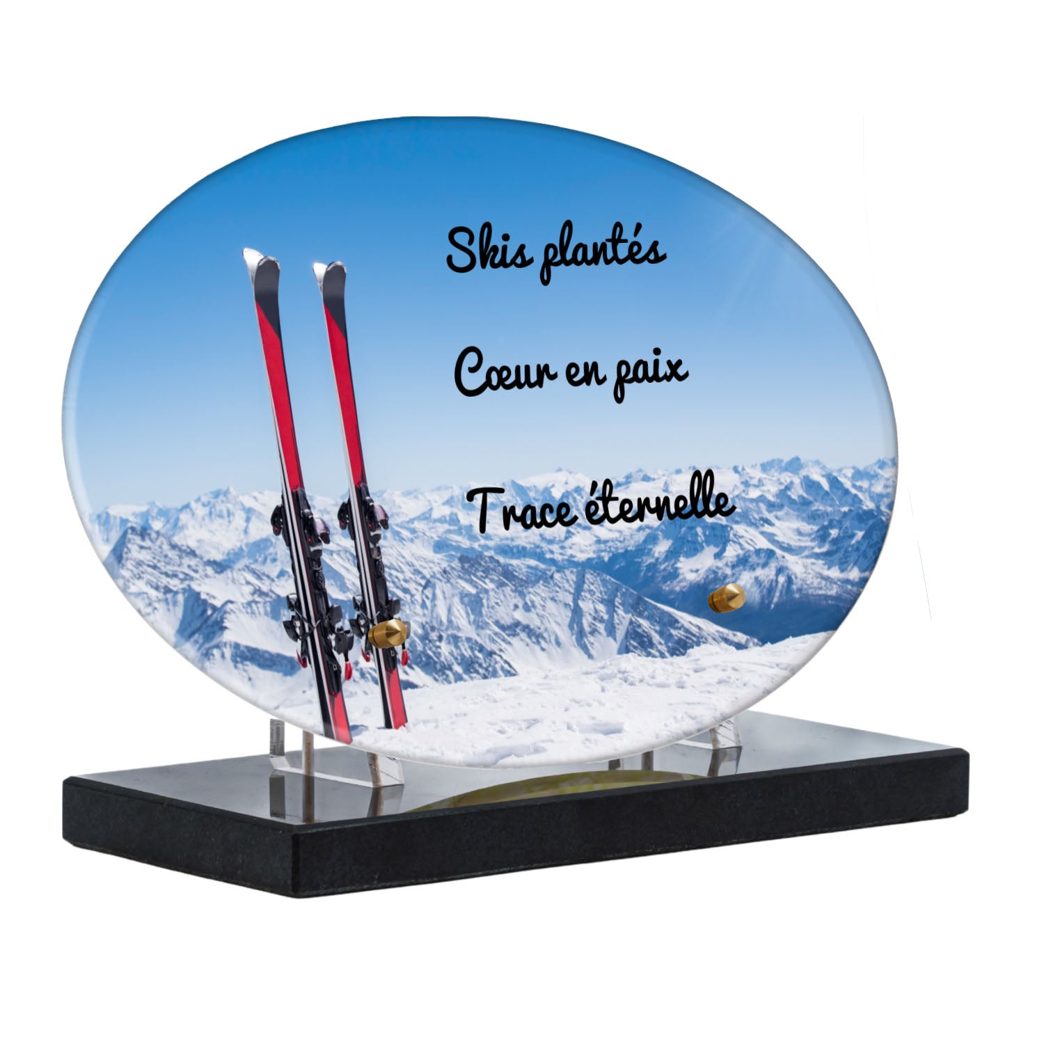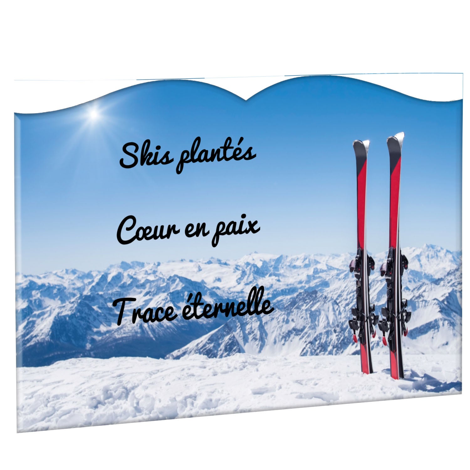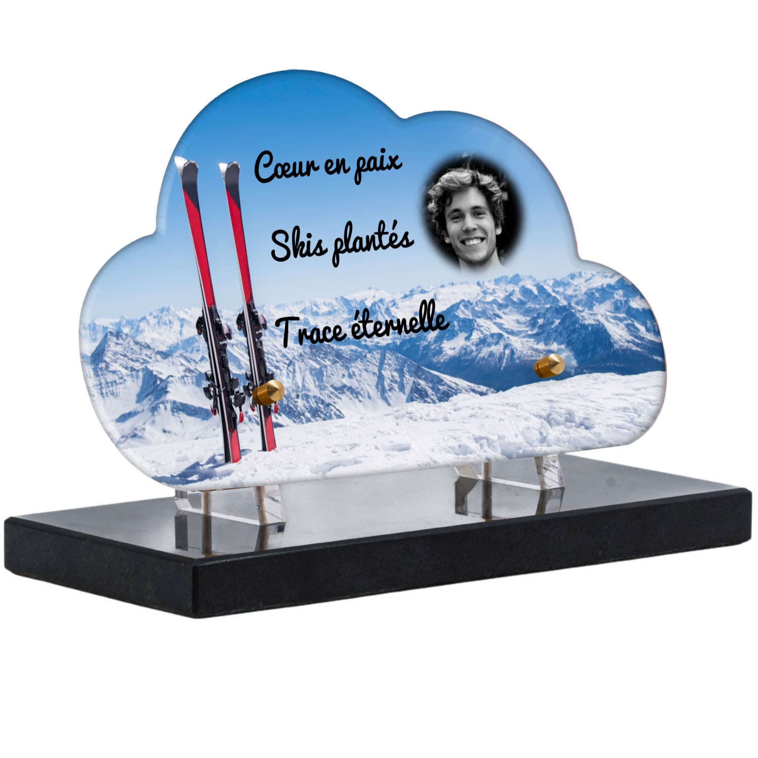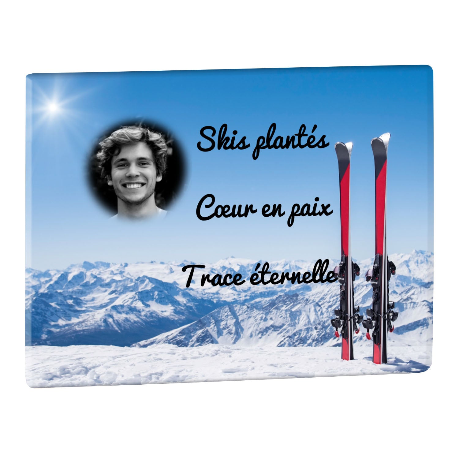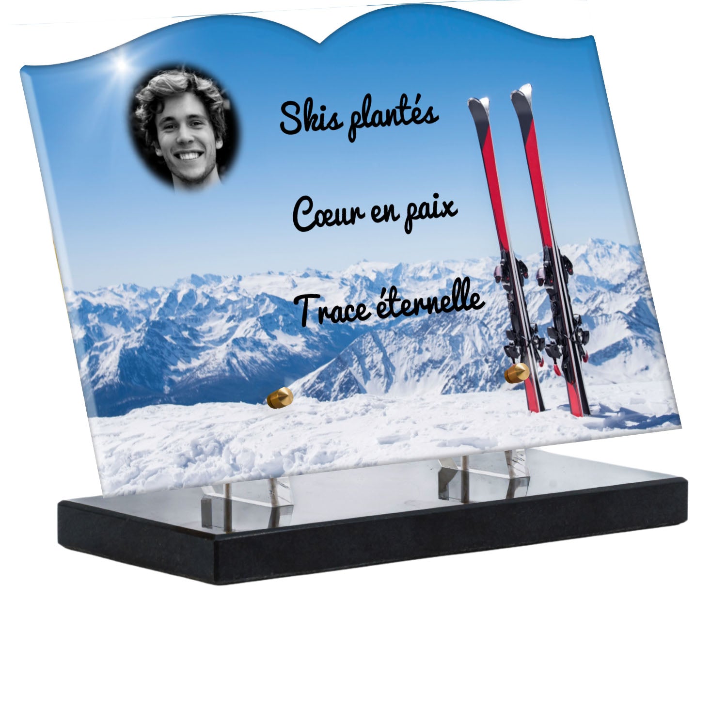 Cette plaque funéraire personnalisée met en scène une paire de ski sur la piste, idéale pour honorer la mémoire d’un amateur de sports d’hiver avec élégance. Fabriquée à partir de matériaux haut de gamme, cette plaque mortuaire allie esthétique et robustesse. Le choix du plexiglas confère à cette plaque funéraire moderne une finition lumineuse et une excellente résistance aux intempéries pour un hommage durable.