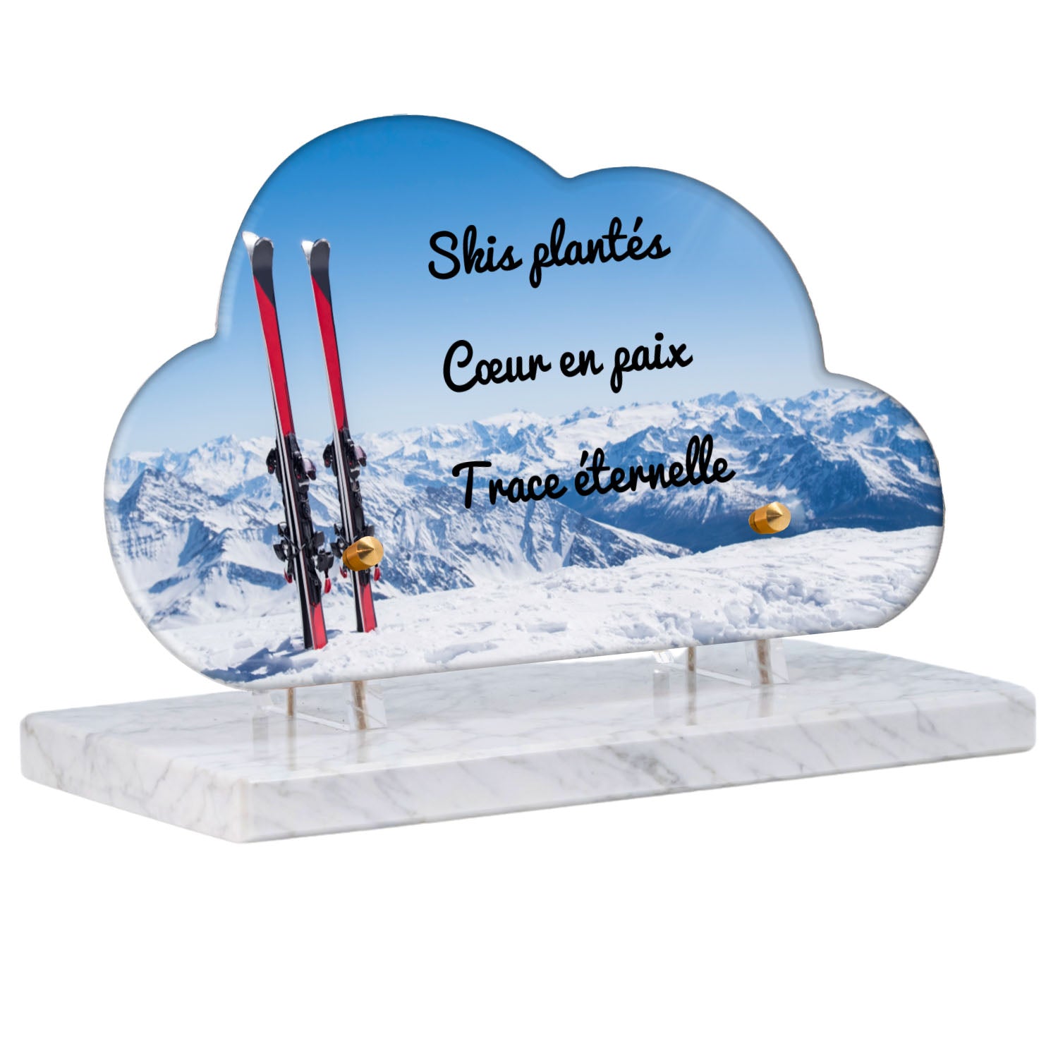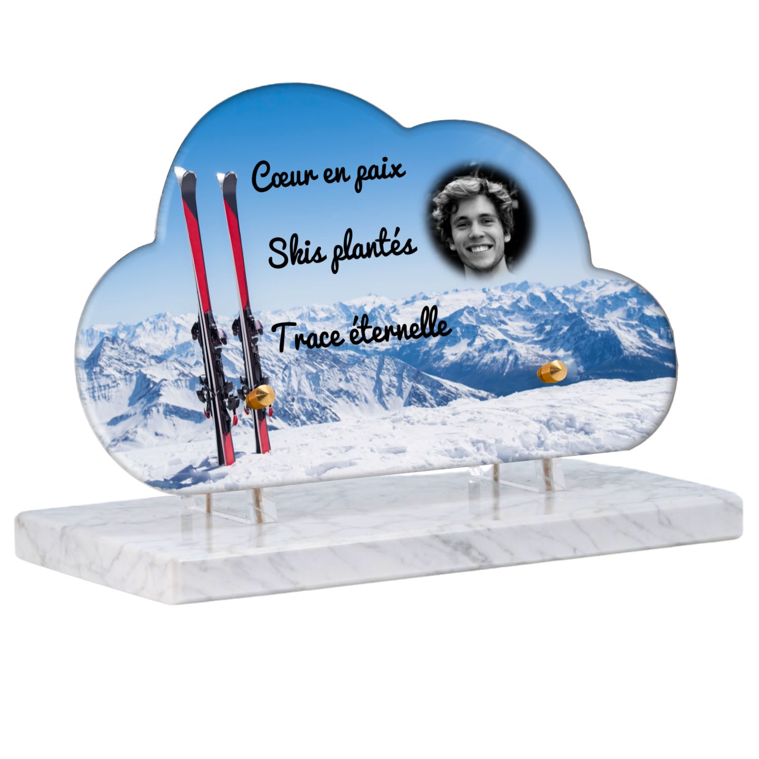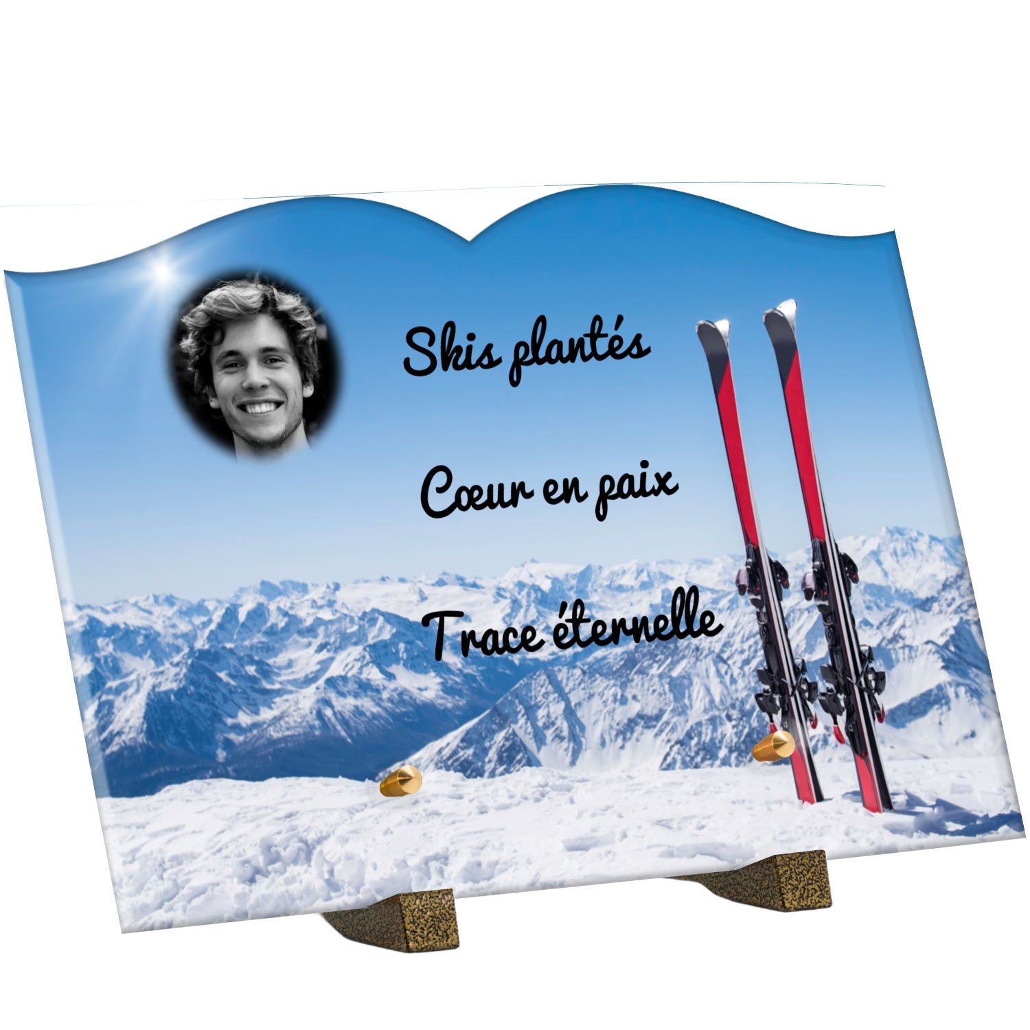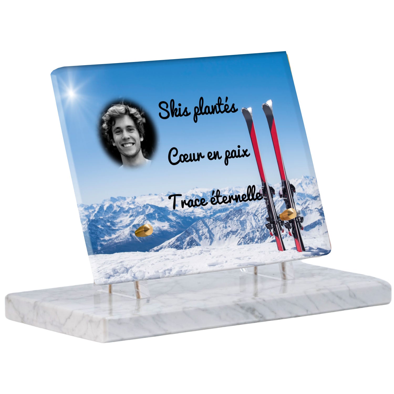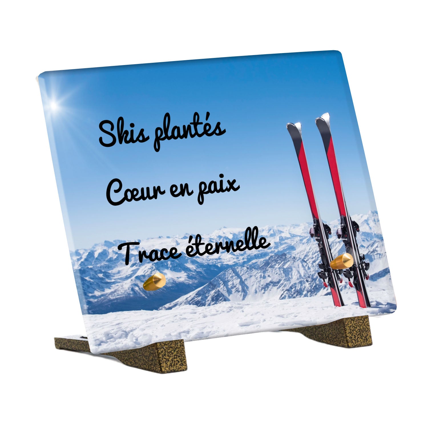 Cette plaque funéraire personnalisée met en scène une paire de ski sur la piste, idéale pour honorer la mémoire d’un amateur de sports d’hiver avec élégance. Fabriquée à partir de matériaux haut de gamme, cette plaque mortuaire allie esthétique et robustesse. Le choix du plexiglas confère à cette plaque funéraire moderne une finition lumineuse et une excellente résistance aux intempéries pour un hommage durable.