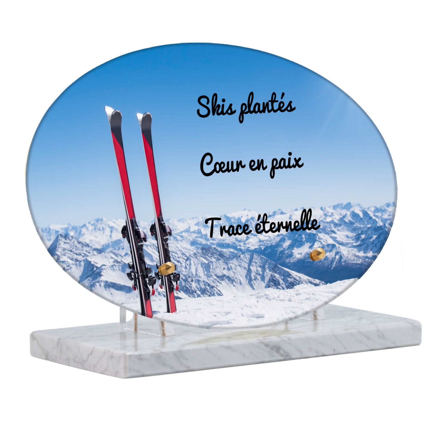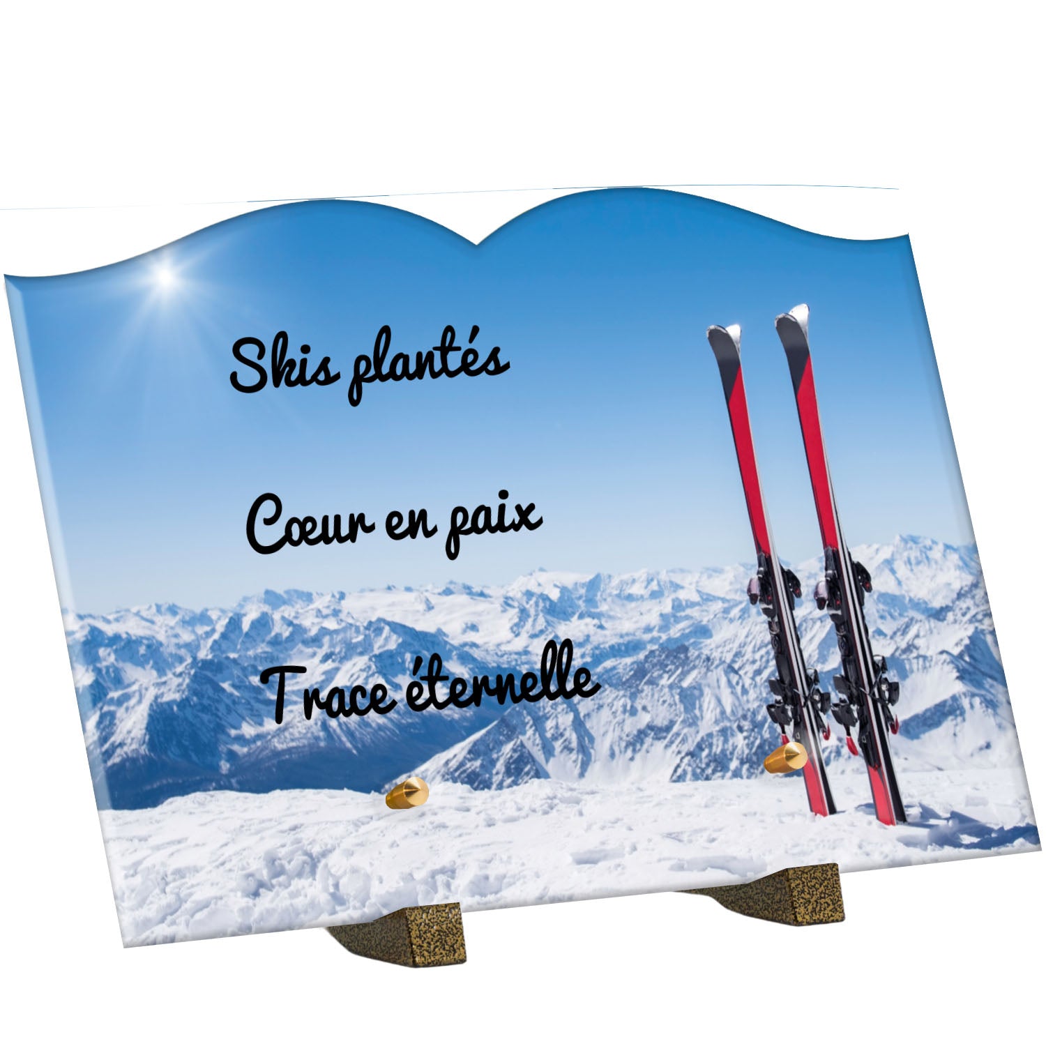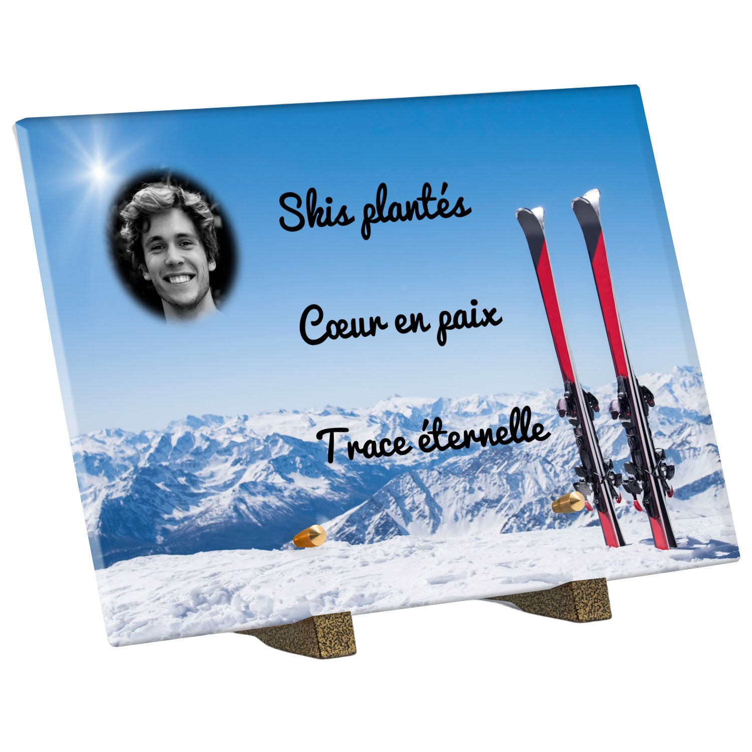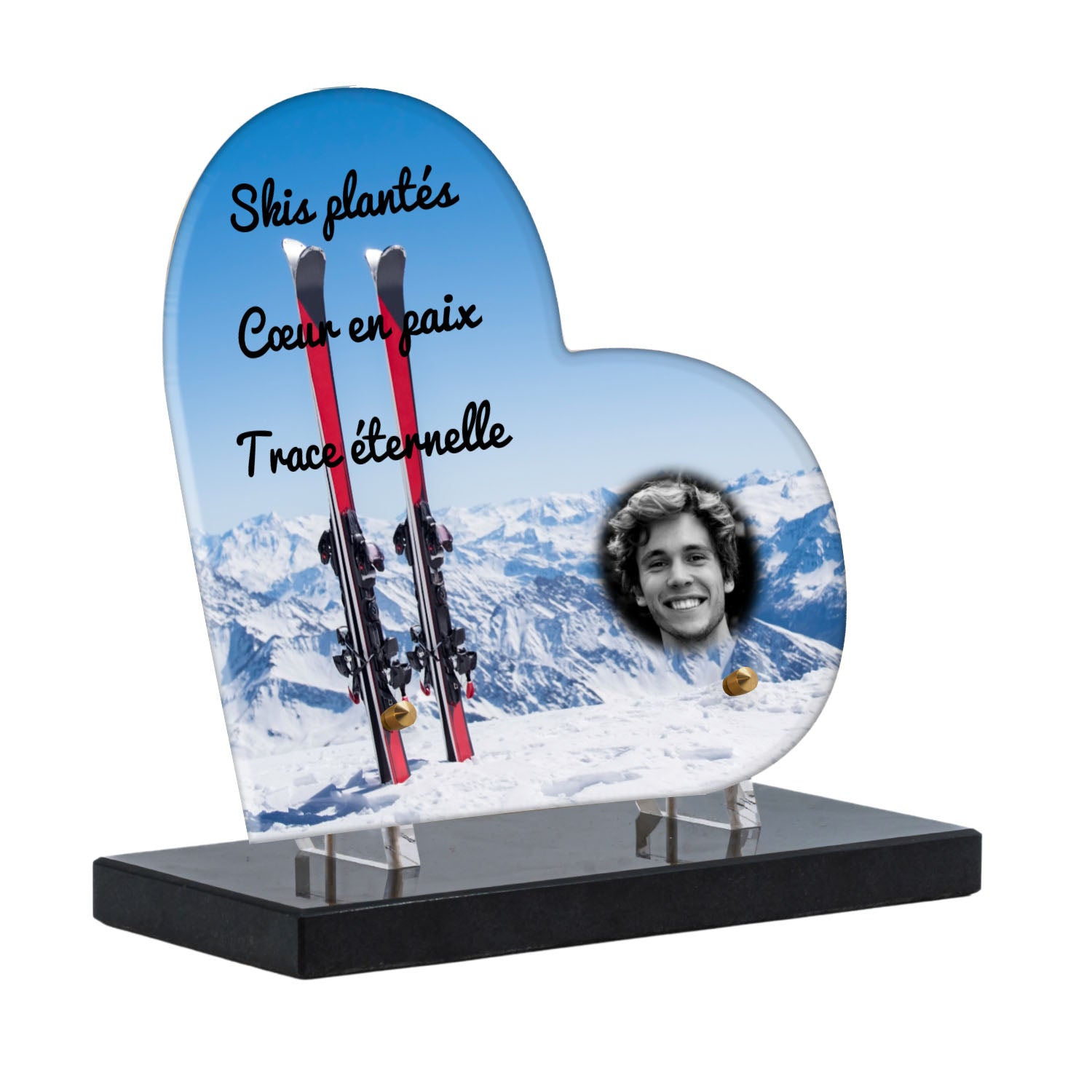 Cette plaque funéraire personnalisée met en scène une paire de ski sur la piste, idéale pour honorer la mémoire d’un amateur de sports d’hiver avec élégance. Fabriquée à partir de matériaux haut de gamme, cette plaque mortuaire allie esthétique et robustesse. Le choix du plexiglas confère à cette plaque funéraire moderne une finition lumineuse et une excellente résistance aux intempéries pour un hommage durable.