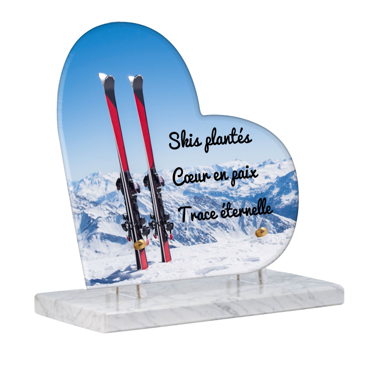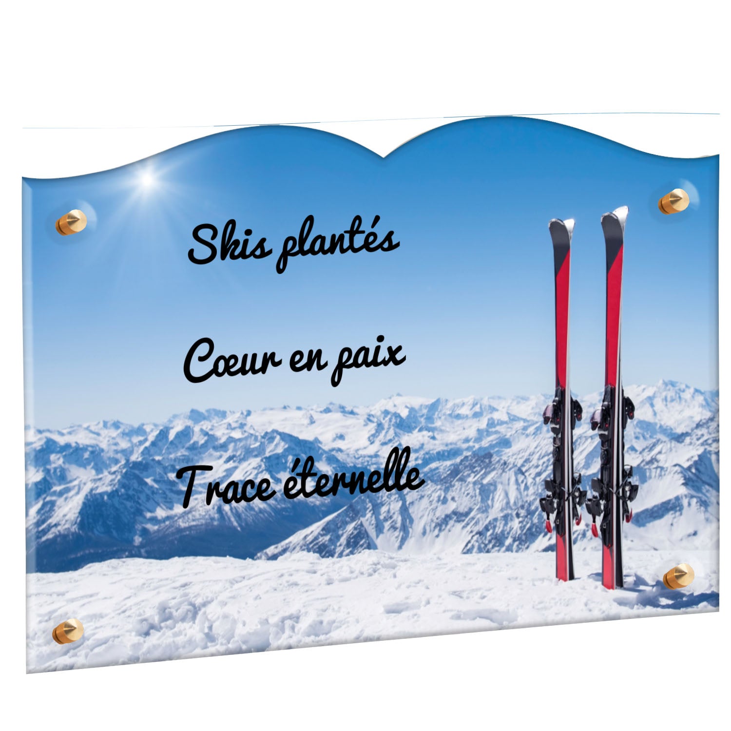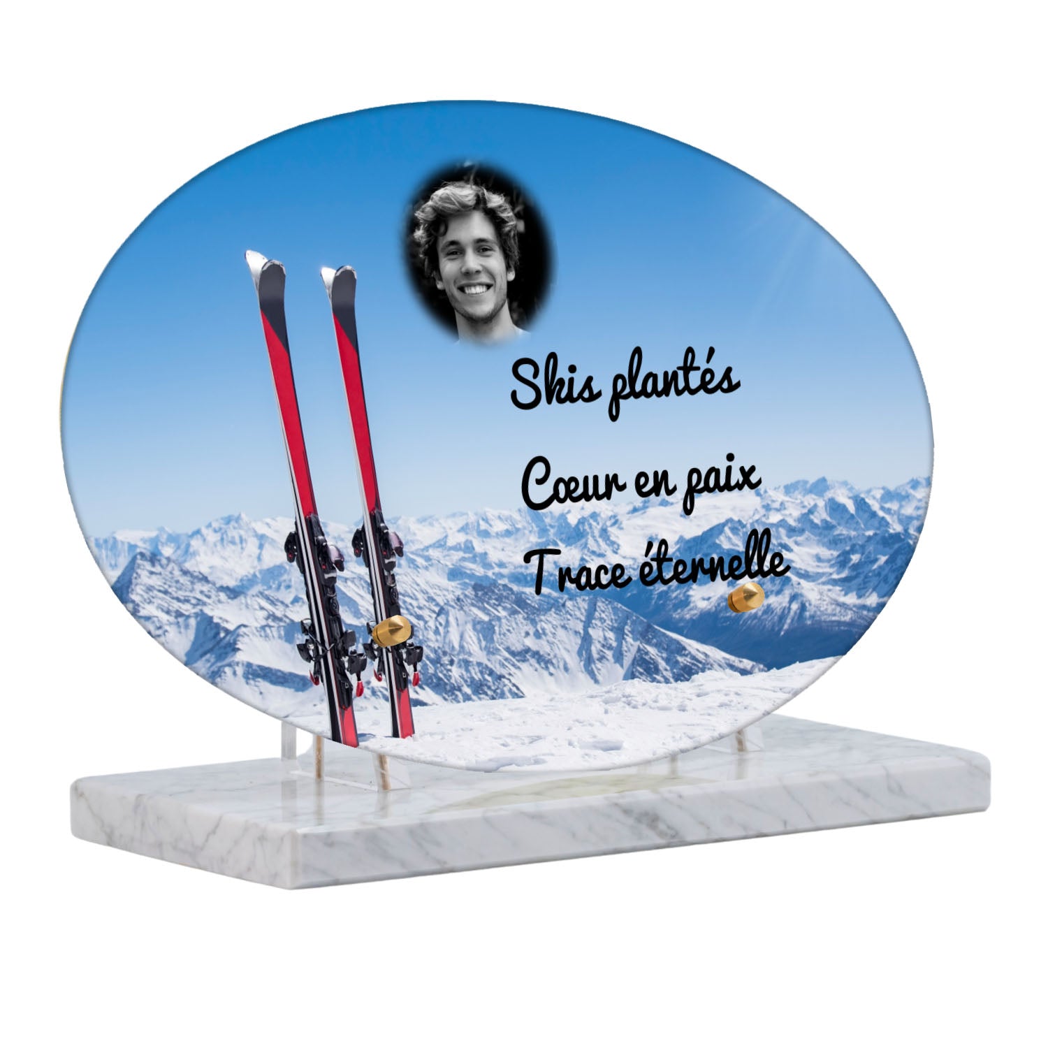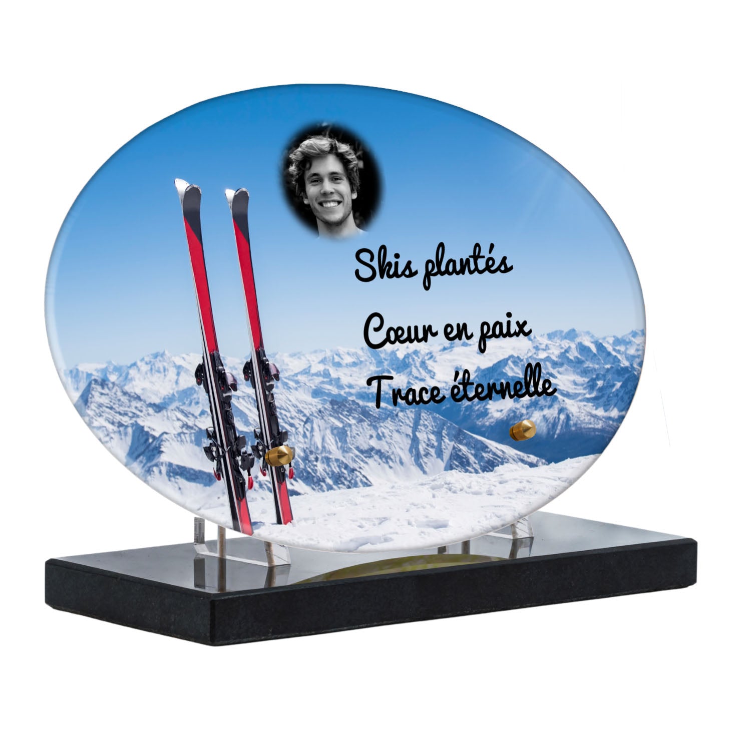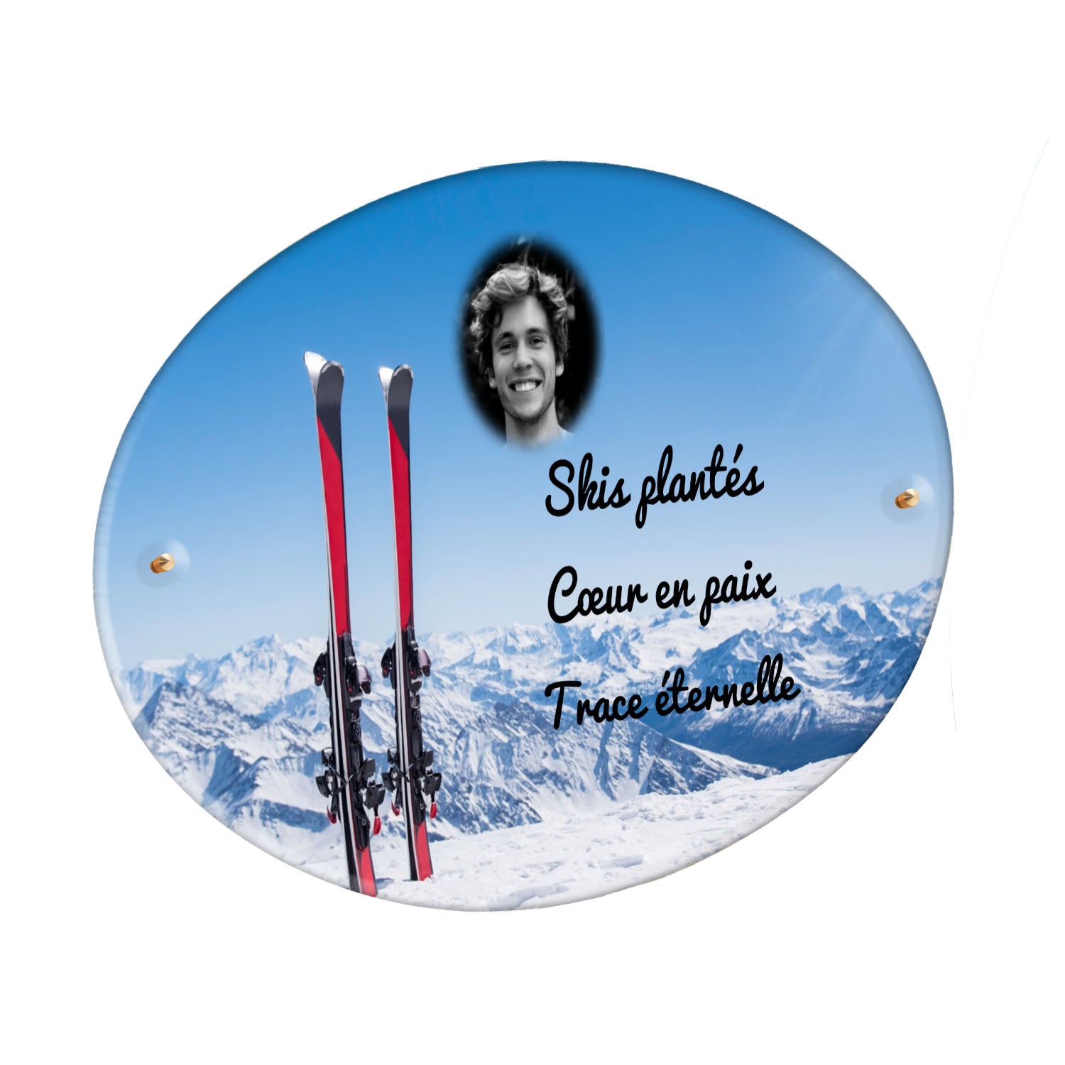 Cette plaque funéraire personnalisée met en scène une paire de ski sur la piste, idéale pour honorer la mémoire d’un amateur de sports d’hiver avec élégance. Fabriquée à partir de matériaux haut de gamme, cette plaque mortuaire allie esthétique et robustesse. Le choix du plexiglas confère à cette plaque funéraire moderne une finition lumineuse et une excellente résistance aux intempéries pour un hommage durable.