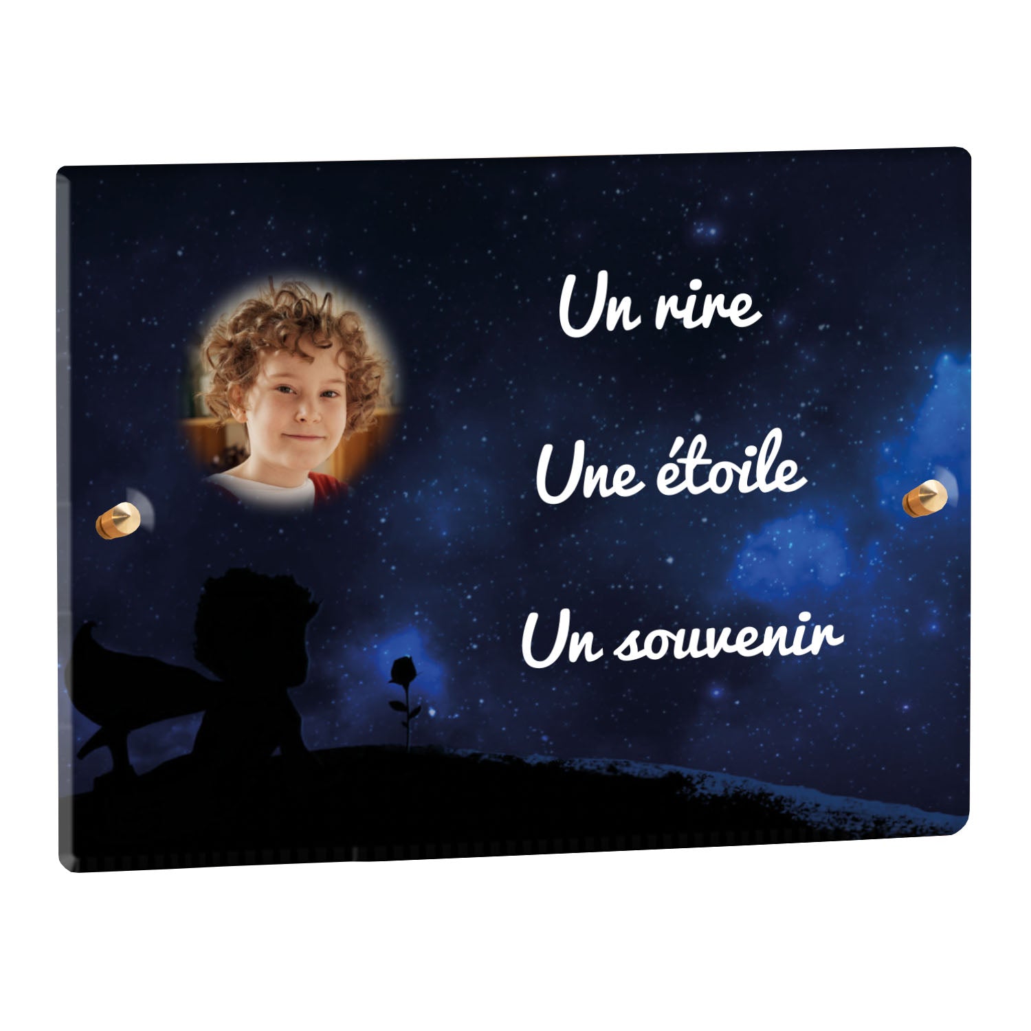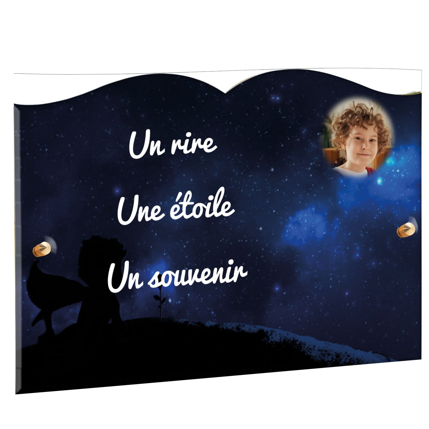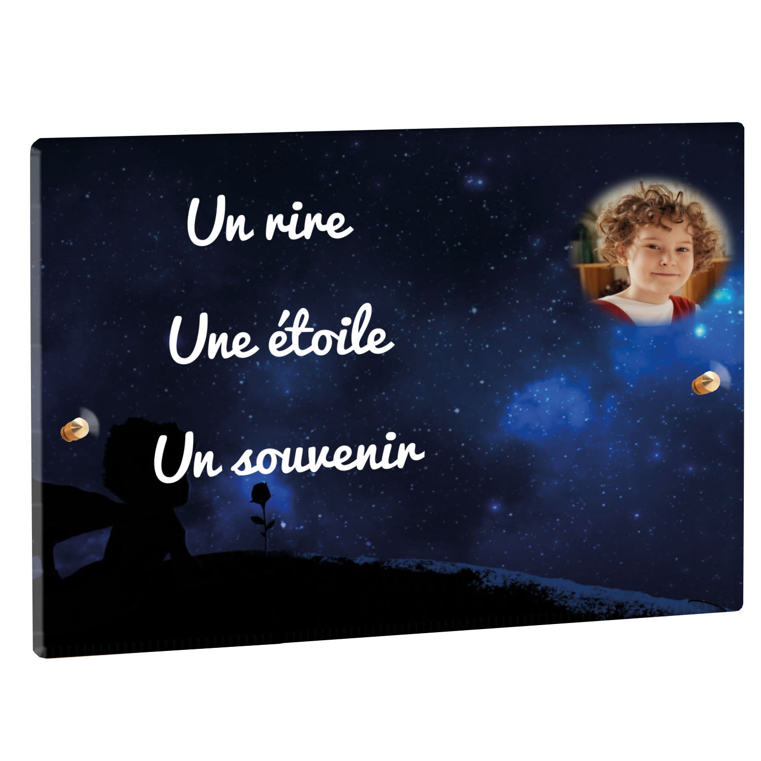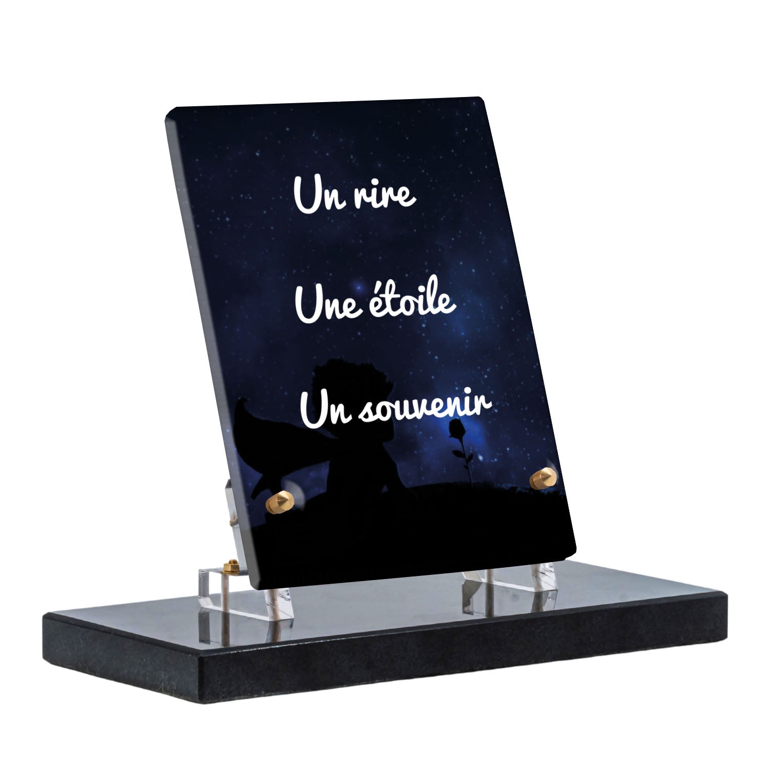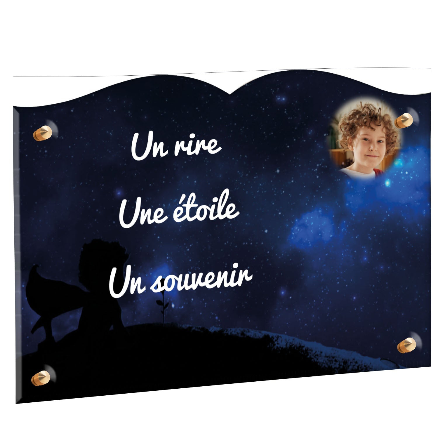 Cette plaque funéraire personnalisée illustre le Petit Prince contemplant un ciel étoilé, offrant un hommage poétique et délicat. Réalisée en matériaux de qualité, cette plaque mortuaire allie design raffiné et modernité grâce à sa composition en plexiglas. Son style contemporain en fait une plaque funéraire moderne, parfaite pour célébrer la mémoire avec sensibilité et élégance. Chaque plaque funéraire est créée sur mesure, assurant une personnalisation fidèle qui rend hommage à l’unicité du défunt. Sa durabilité approuvée garantit une longue conservation face aux éléments, faisant de cette plaque un souvenir pérenne et respectueux.