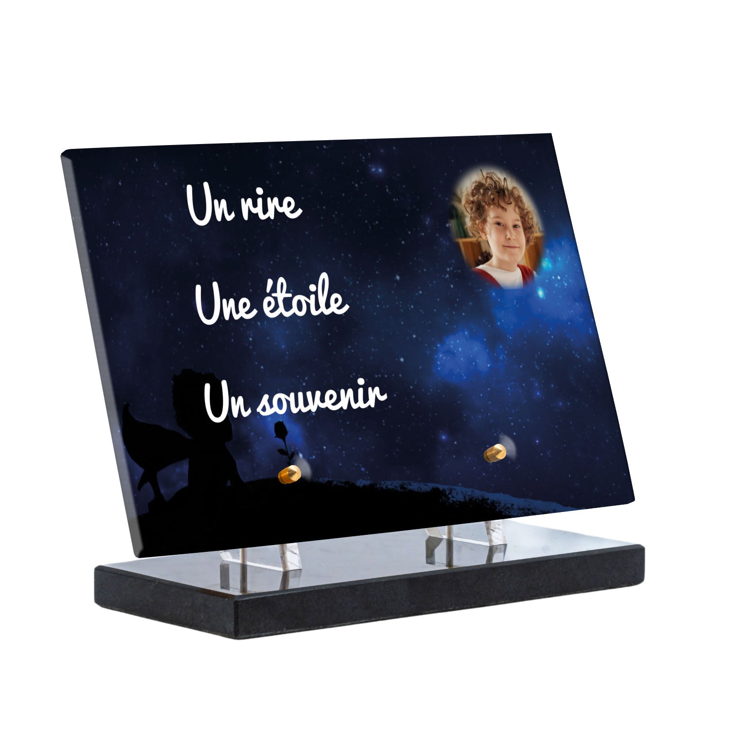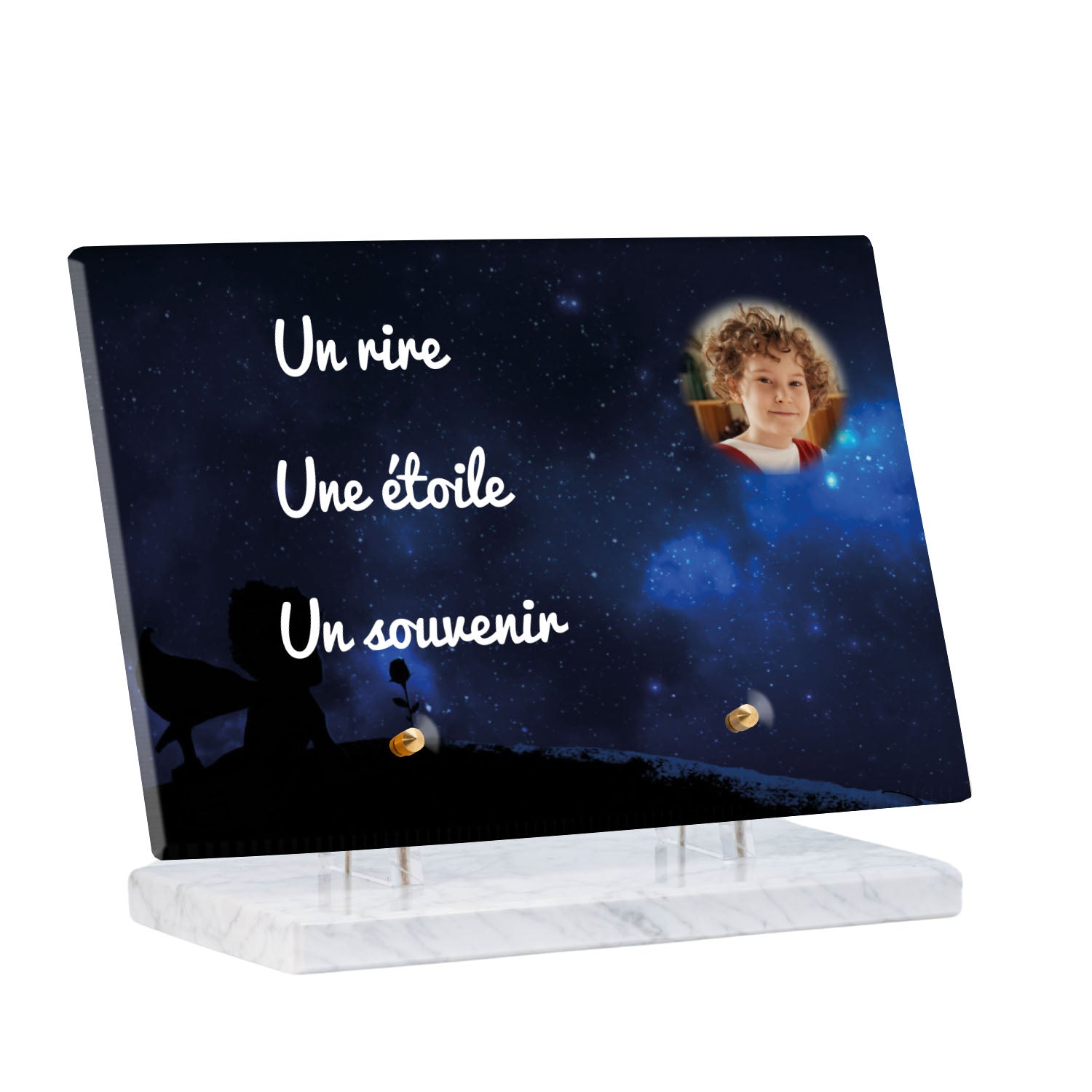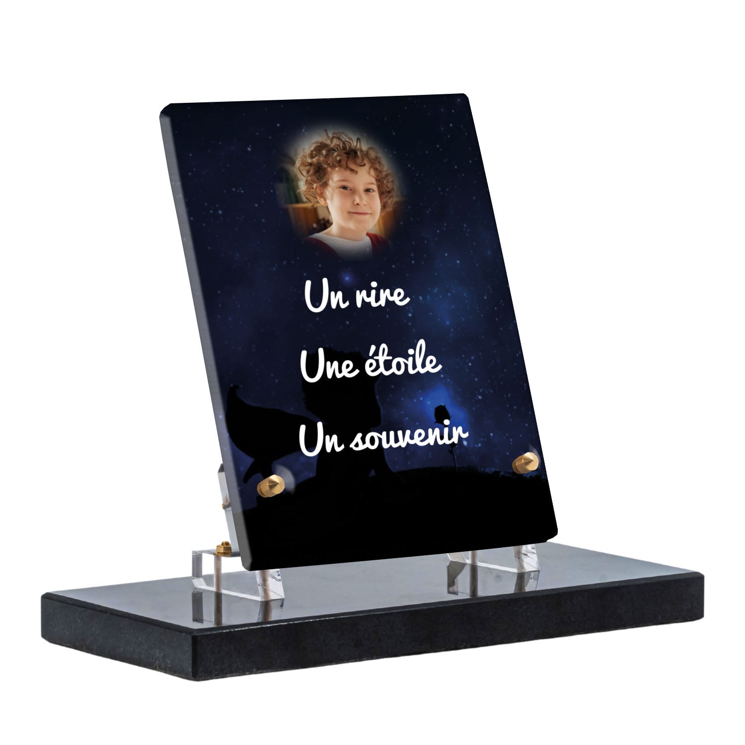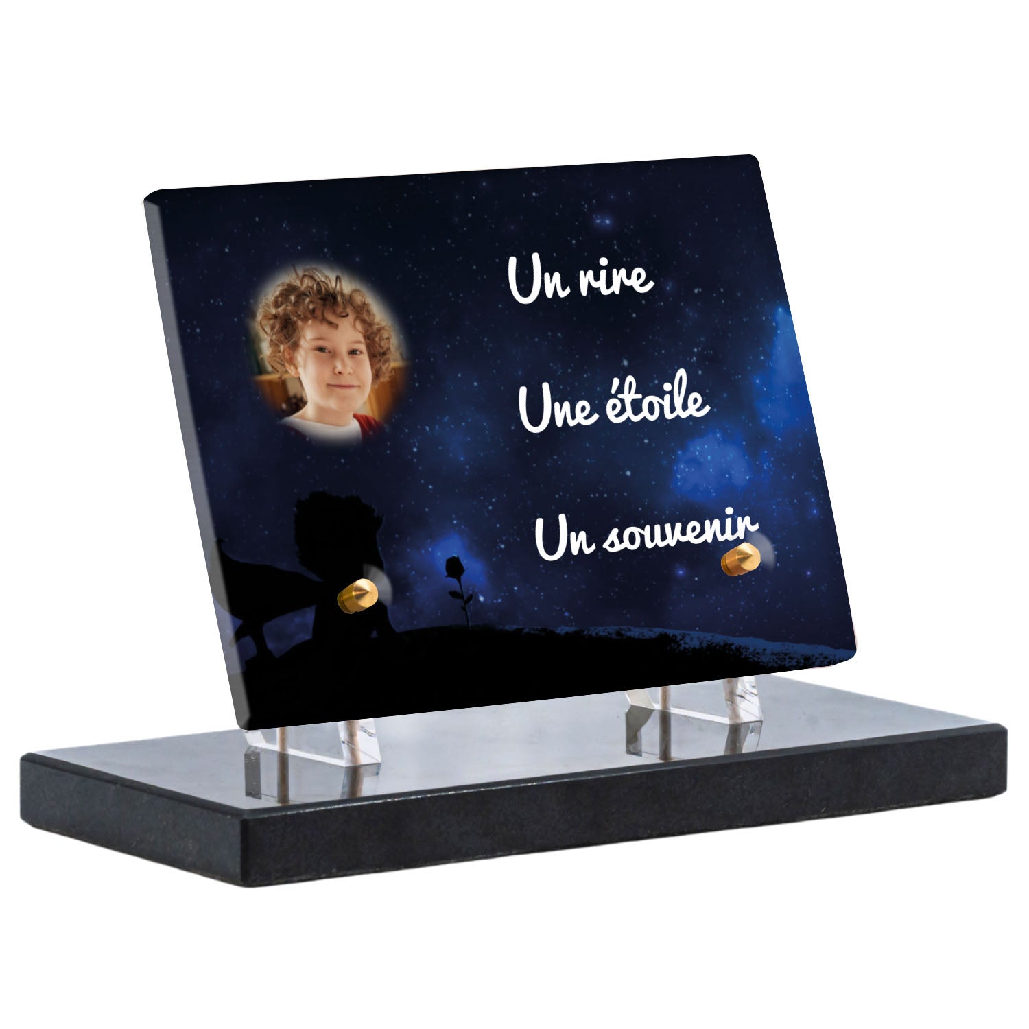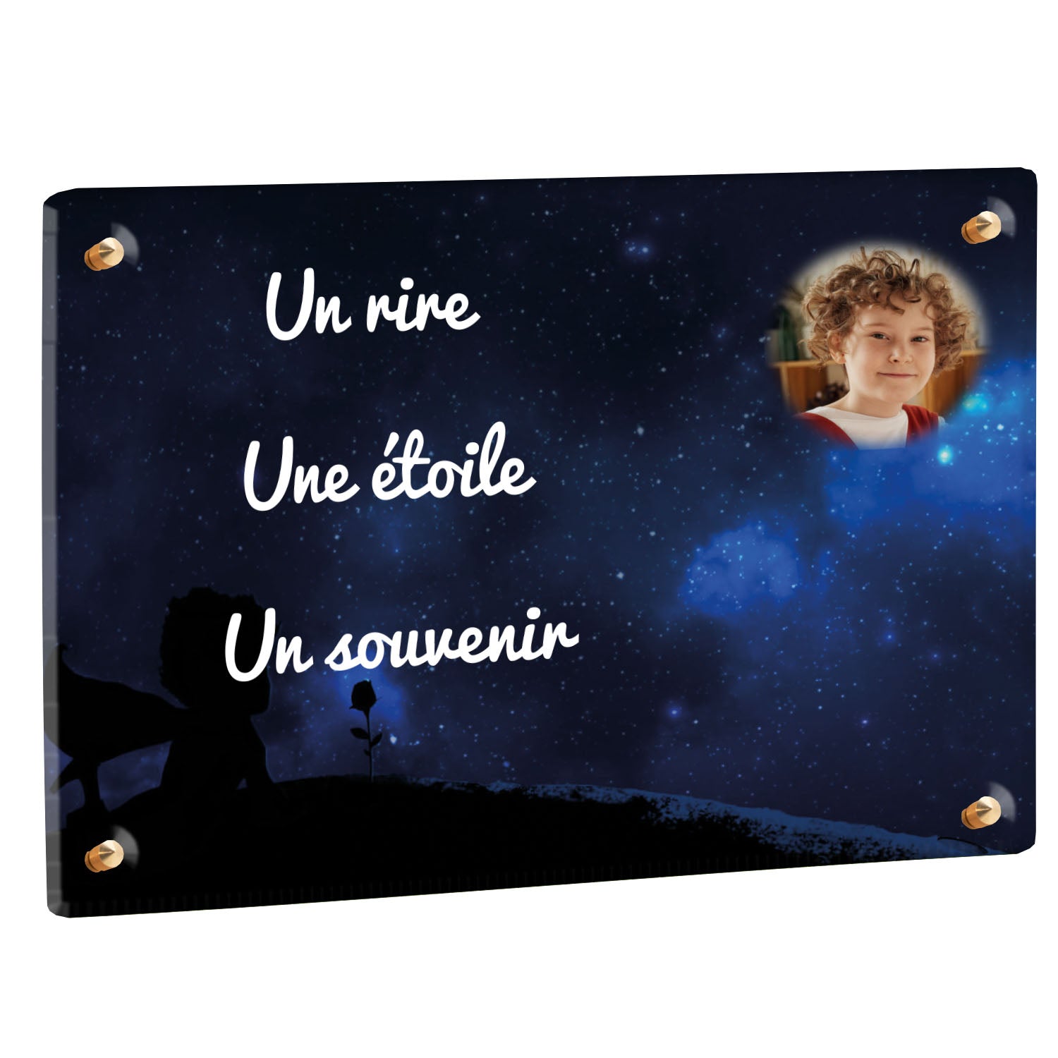 Cette plaque funéraire personnalisée illustre le Petit Prince contemplant un ciel étoilé, offrant un hommage poétique et délicat. Réalisée en matériaux de qualité, cette plaque mortuaire allie design raffiné et modernité grâce à sa composition en plexiglas. Son style contemporain en fait une plaque funéraire moderne, parfaite pour célébrer la mémoire avec sensibilité et élégance. Chaque plaque funéraire est créée sur mesure, assurant une personnalisation fidèle qui rend hommage à l’unicité du défunt. Sa durabilité approuvée garantit une longue conservation face aux éléments, faisant de cette plaque un souvenir pérenne et respectueux.