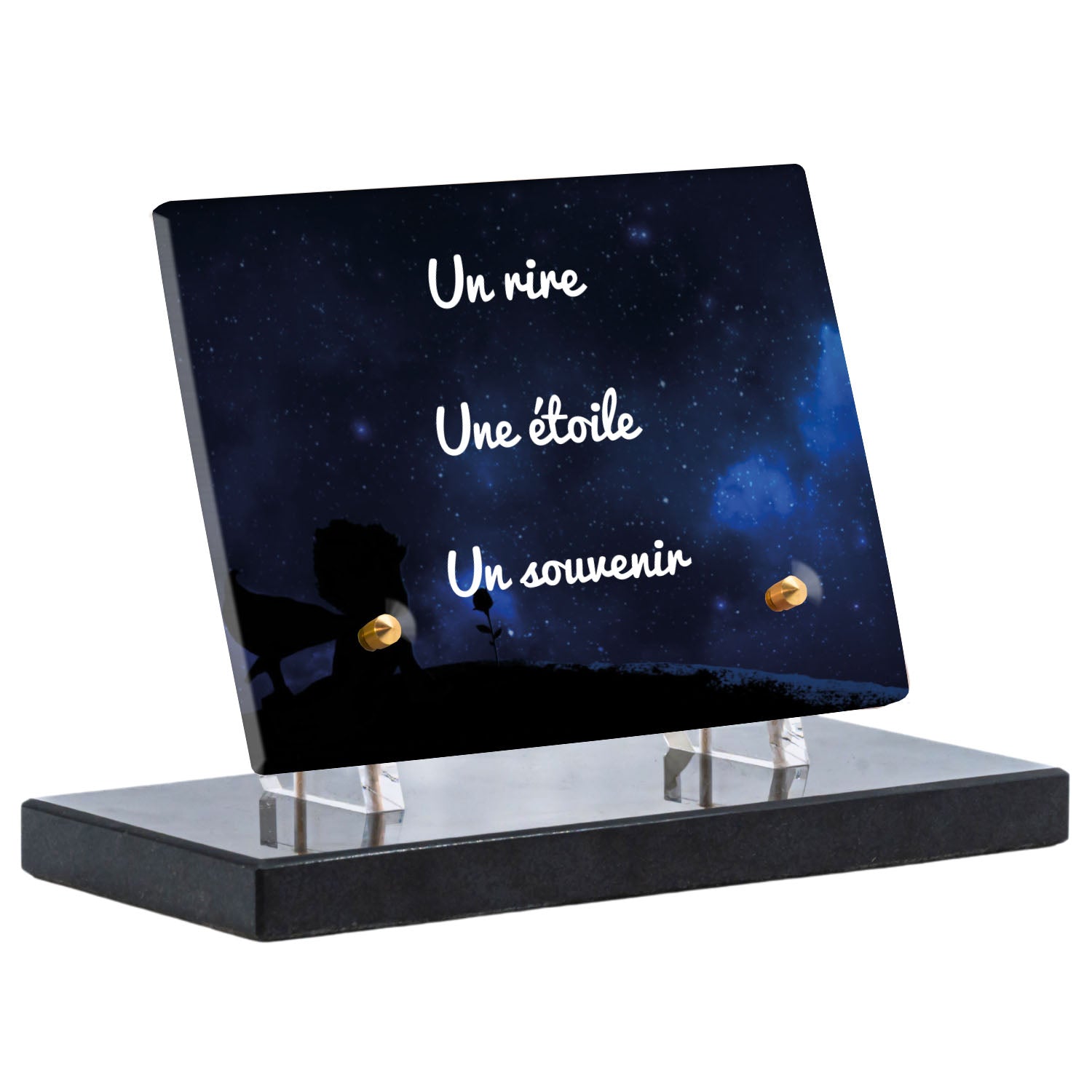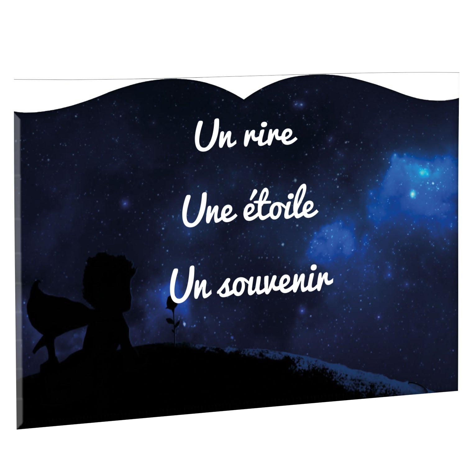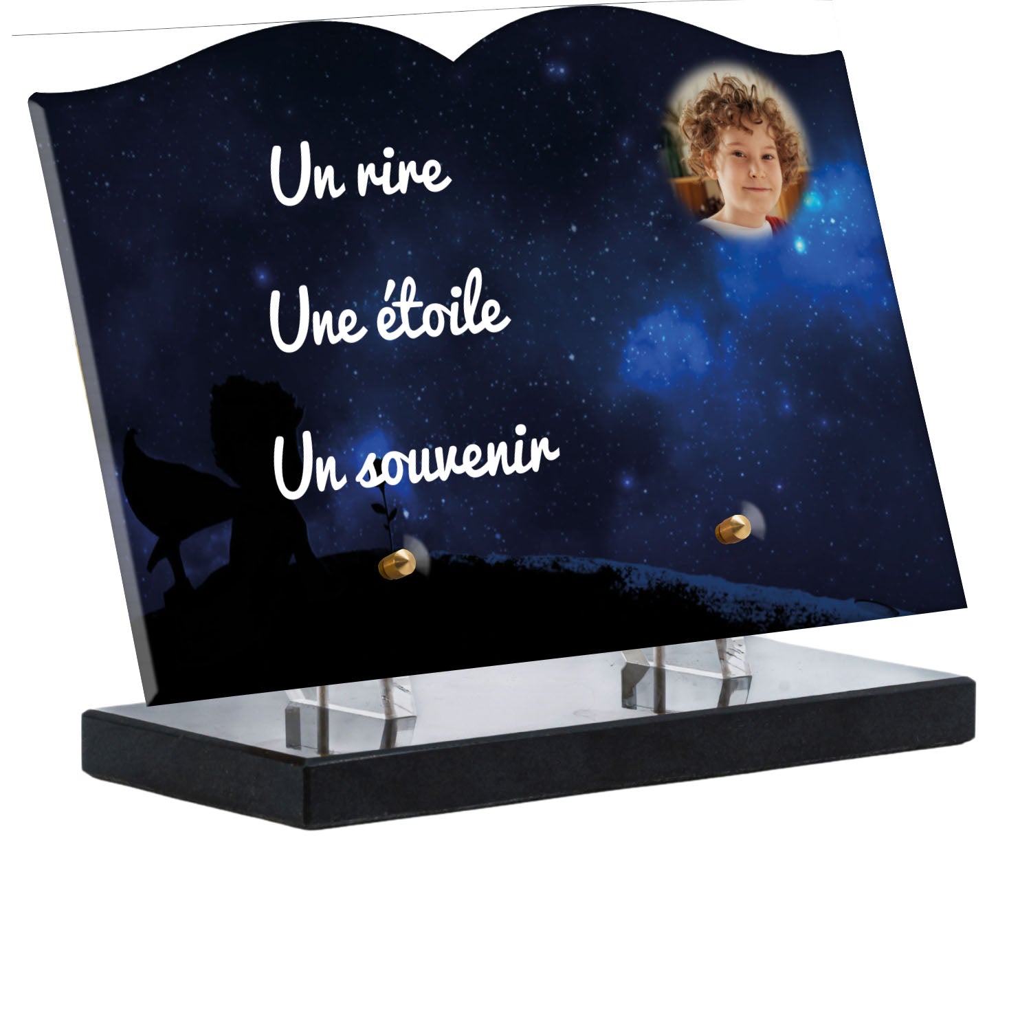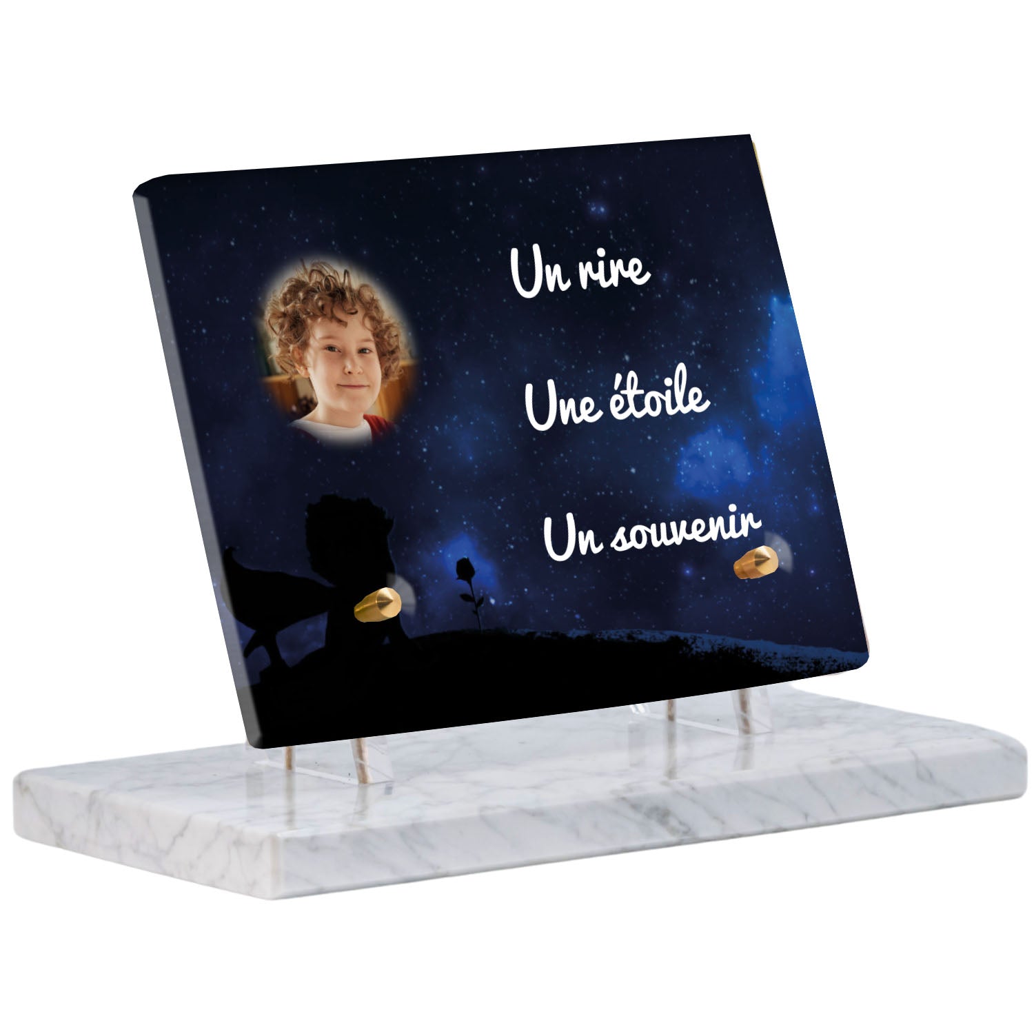 Cette plaque funéraire personnalisée illustre le Petit Prince contemplant un ciel étoilé, offrant un hommage poétique et délicat. Réalisée en matériaux de qualité, cette plaque mortuaire allie design raffiné et modernité grâce à sa composition en plexiglas. Son style contemporain en fait une plaque funéraire moderne, parfaite pour célébrer la mémoire avec sensibilité et élégance. Chaque plaque funéraire est créée sur mesure, assurant une personnalisation fidèle qui rend hommage à l’unicité du défunt. Sa durabilité approuvée garantit une longue conservation face aux éléments, faisant de cette plaque un souvenir pérenne et respectueux.