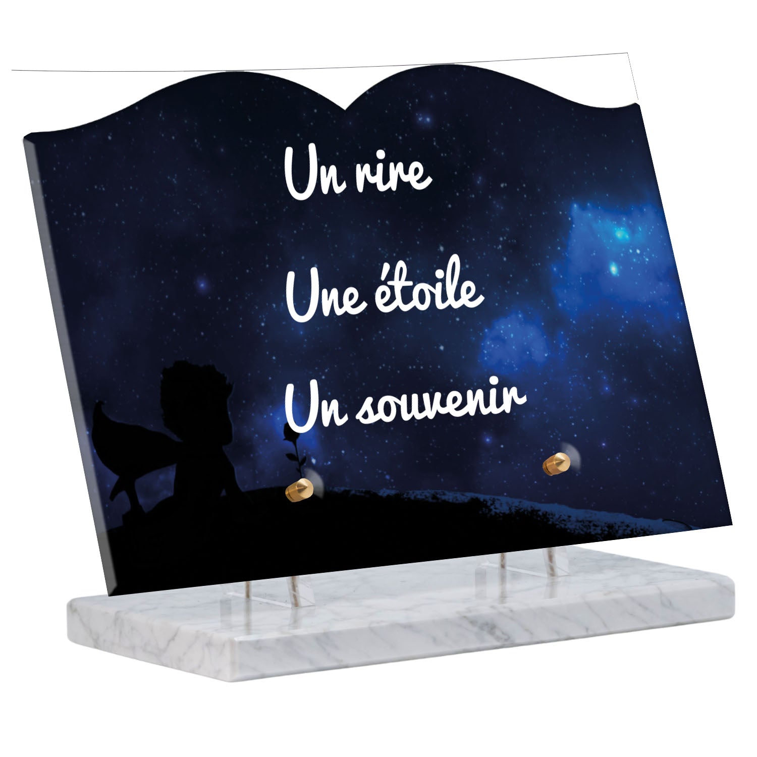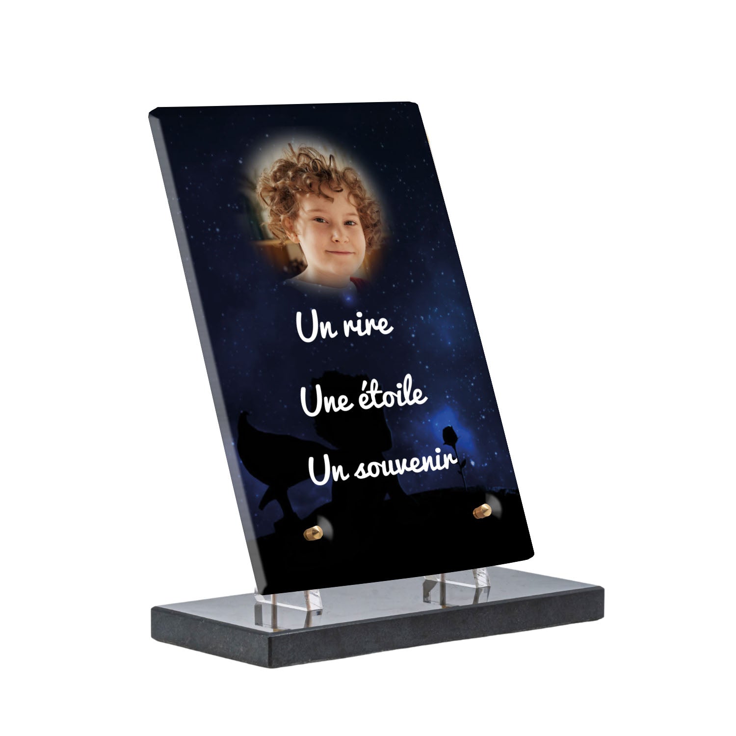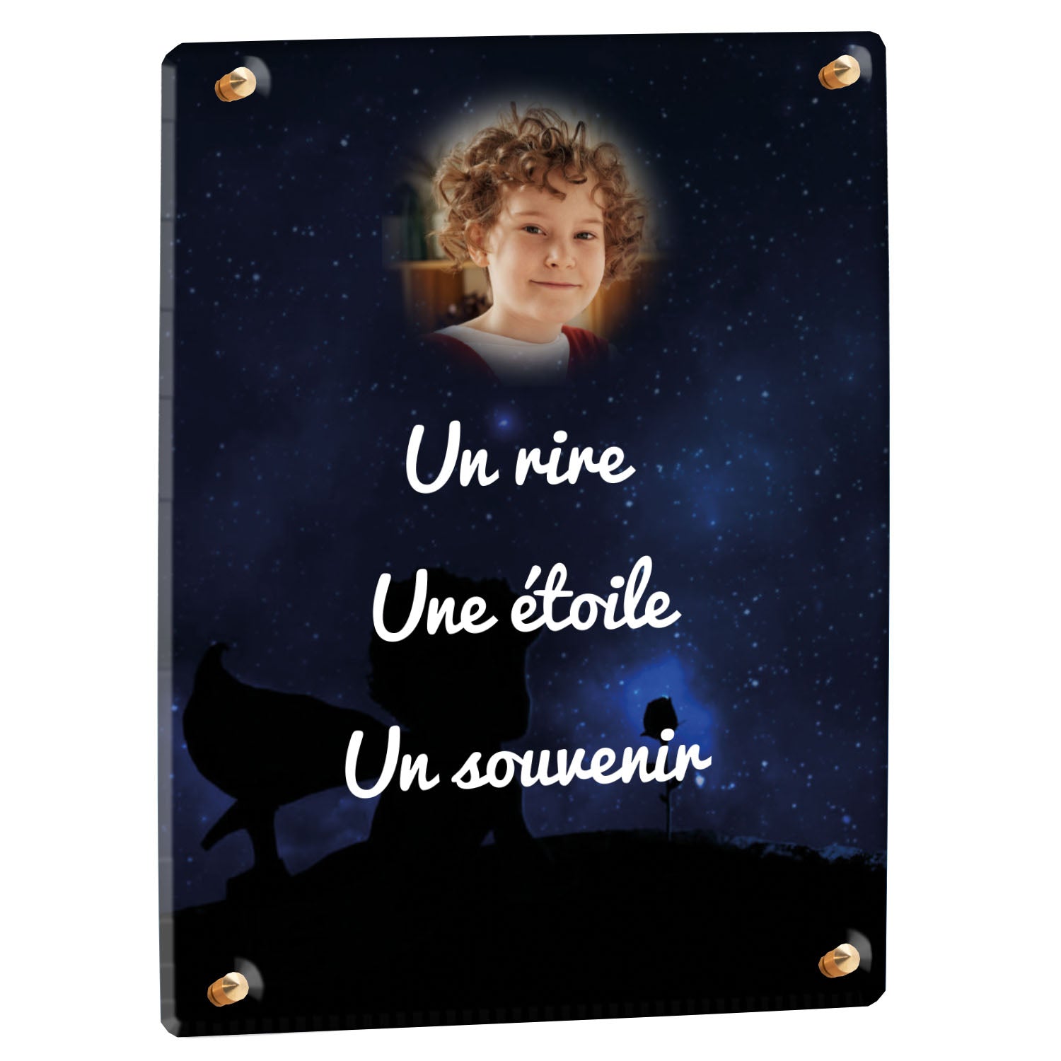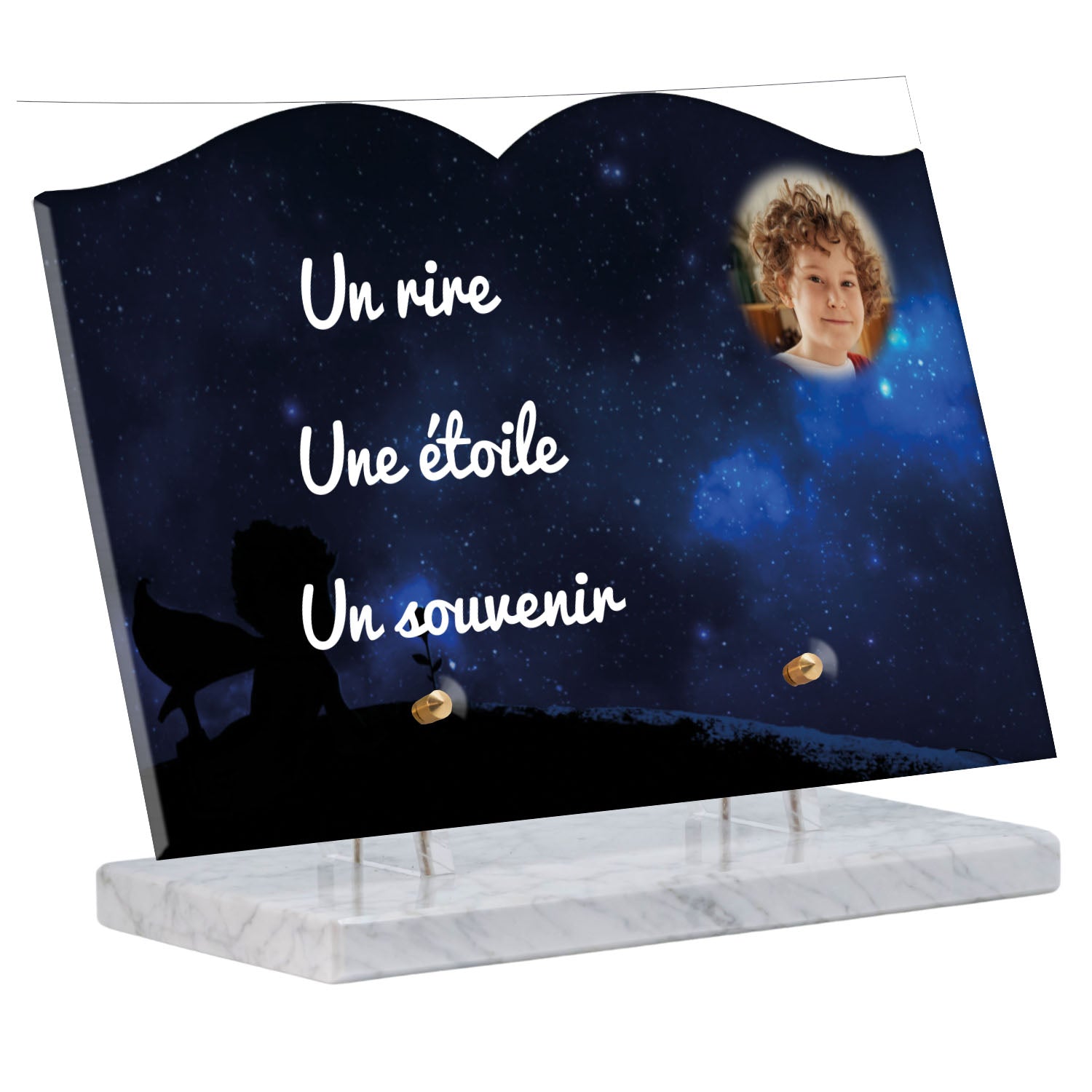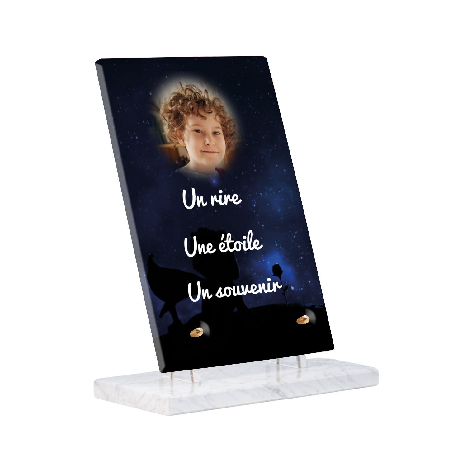 Cette plaque funéraire personnalisée illustre le Petit Prince contemplant un ciel étoilé, offrant un hommage poétique et délicat. Réalisée en matériaux de qualité, cette plaque mortuaire allie design raffiné et modernité grâce à sa composition en plexiglas. Son style contemporain en fait une plaque funéraire moderne, parfaite pour célébrer la mémoire avec sensibilité et élégance. Chaque plaque funéraire est créée sur mesure, assurant une personnalisation fidèle qui rend hommage à l’unicité du défunt. Sa durabilité approuvée garantit une longue conservation face aux éléments, faisant de cette plaque un souvenir pérenne et respectueux.