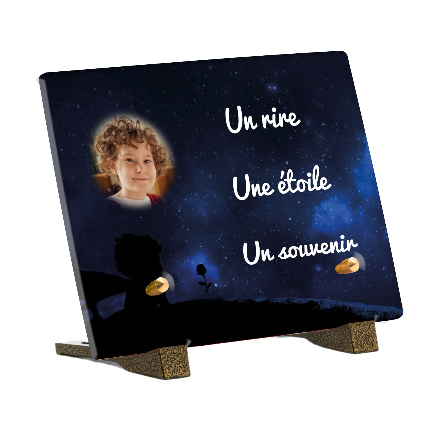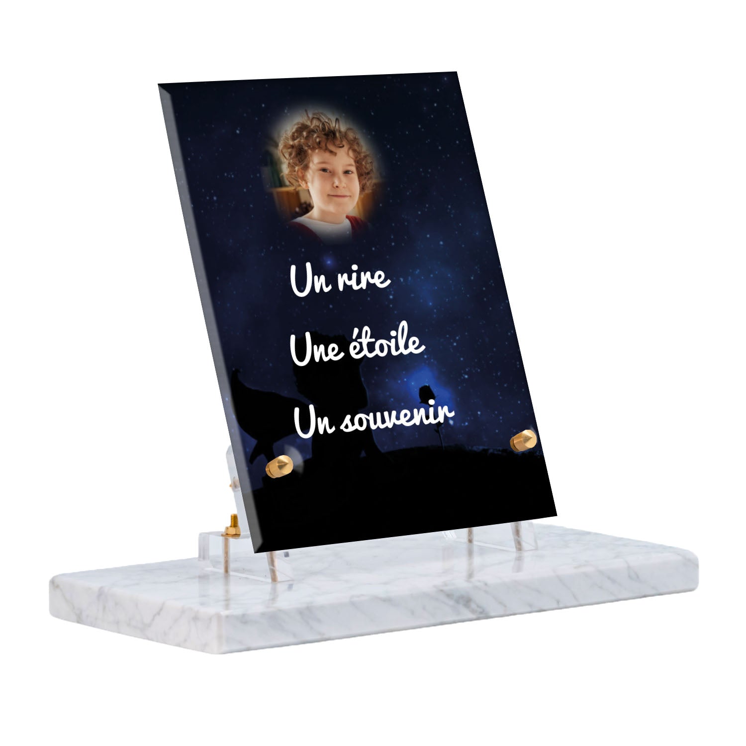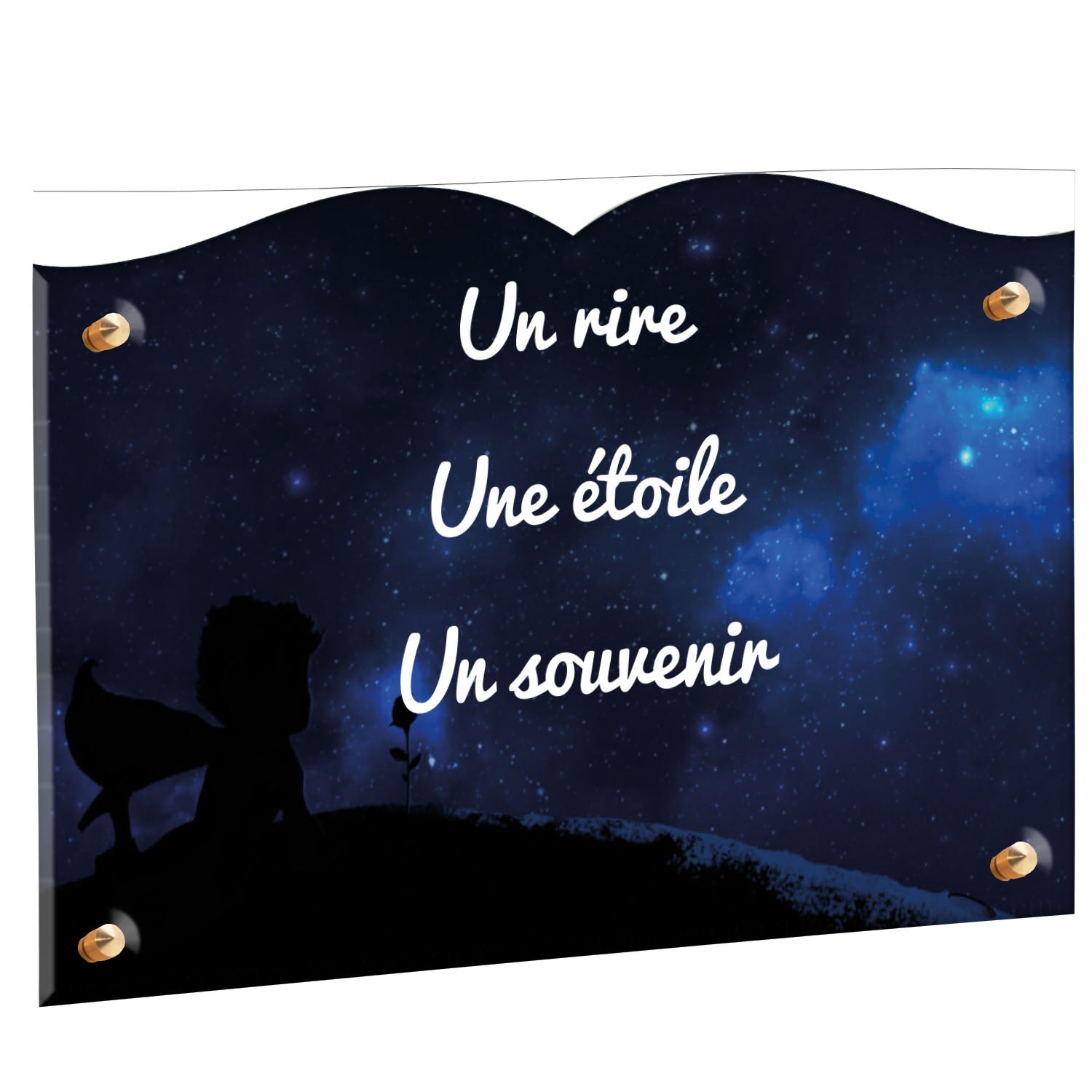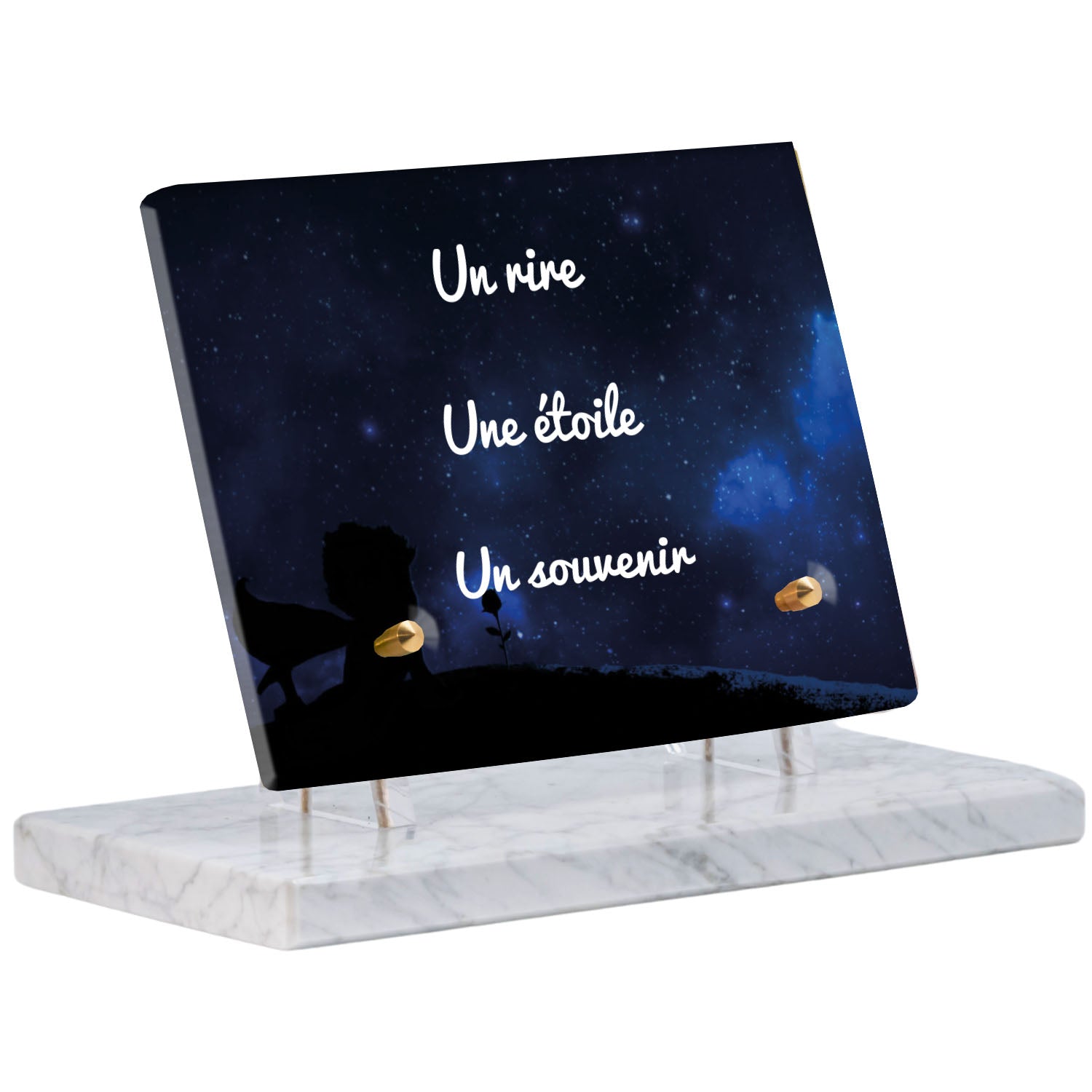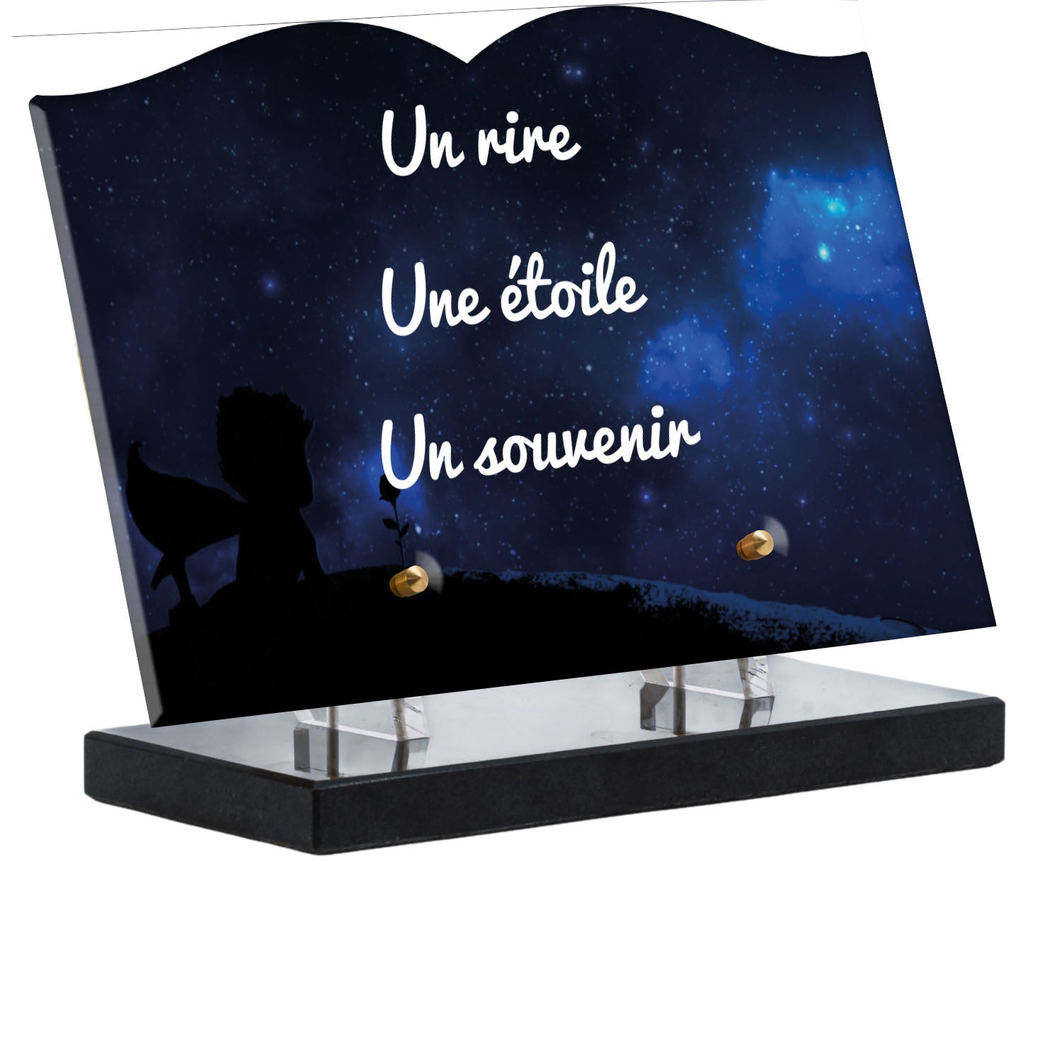 Cette plaque funéraire personnalisée illustre le Petit Prince contemplant un ciel étoilé, offrant un hommage poétique et délicat. Réalisée en matériaux de qualité, cette plaque mortuaire allie design raffiné et modernité grâce à sa composition en plexiglas. Son style contemporain en fait une plaque funéraire moderne, parfaite pour célébrer la mémoire avec sensibilité et élégance. Chaque plaque funéraire est créée sur mesure, assurant une personnalisation fidèle qui rend hommage à l’unicité du défunt. Sa durabilité approuvée garantit une longue conservation face aux éléments, faisant de cette plaque un souvenir pérenne et respectueux.