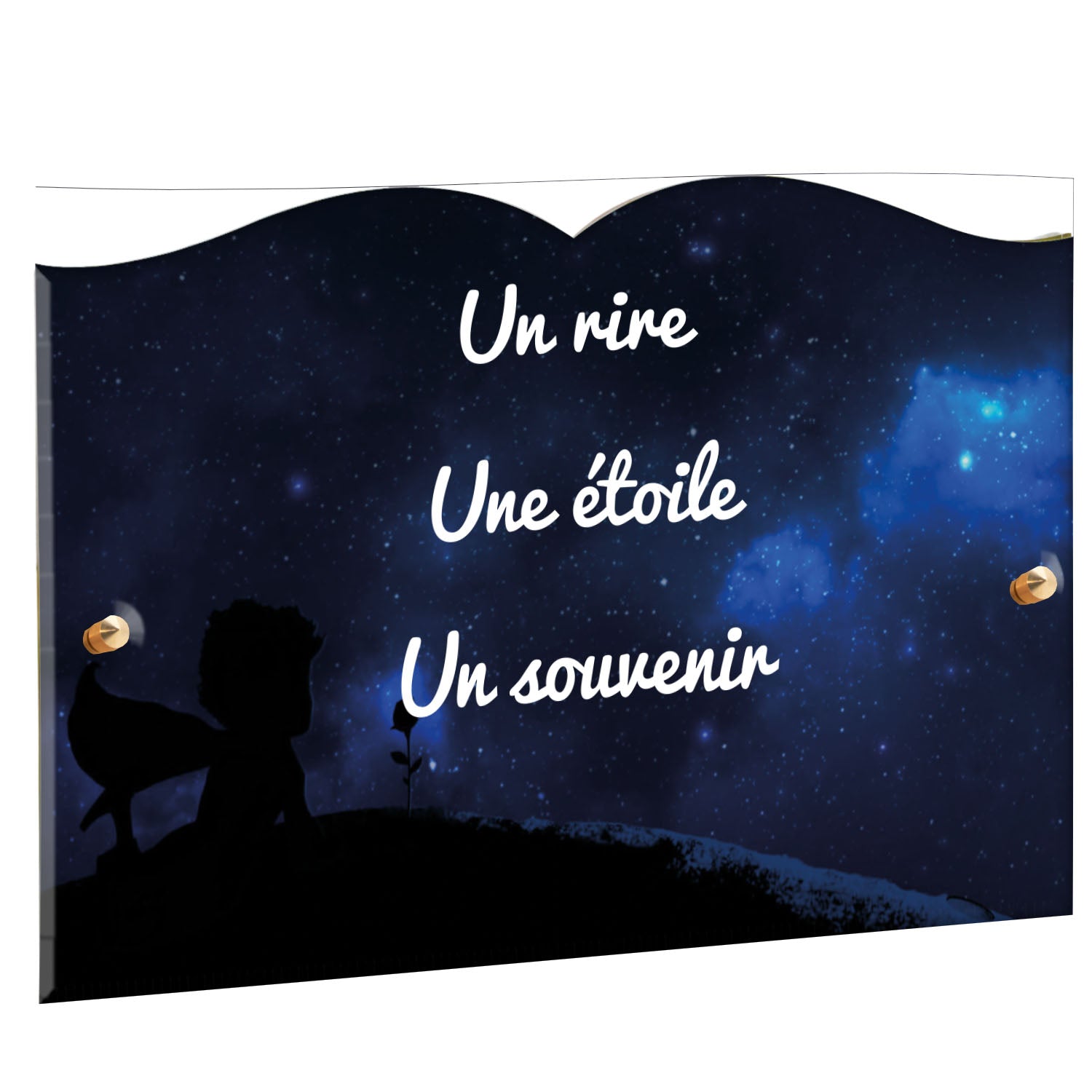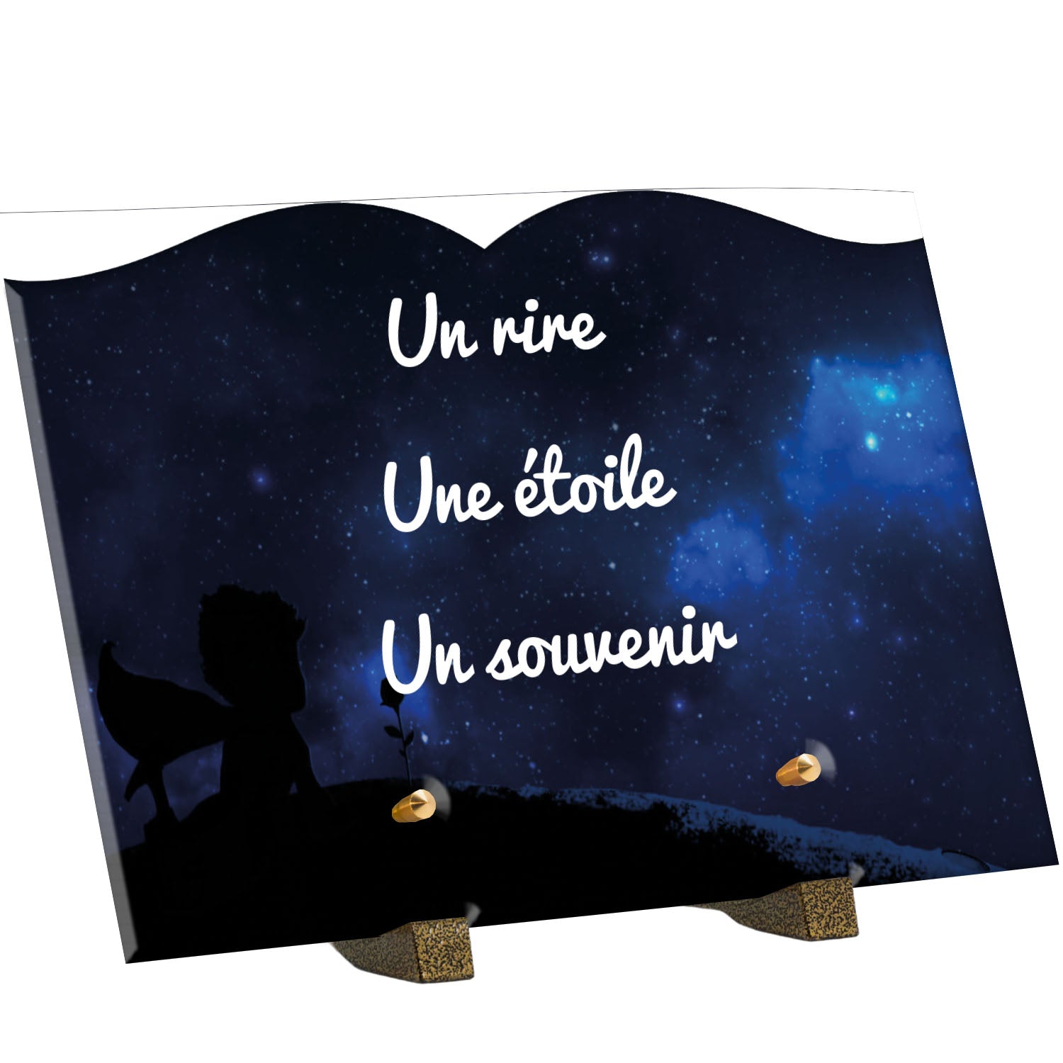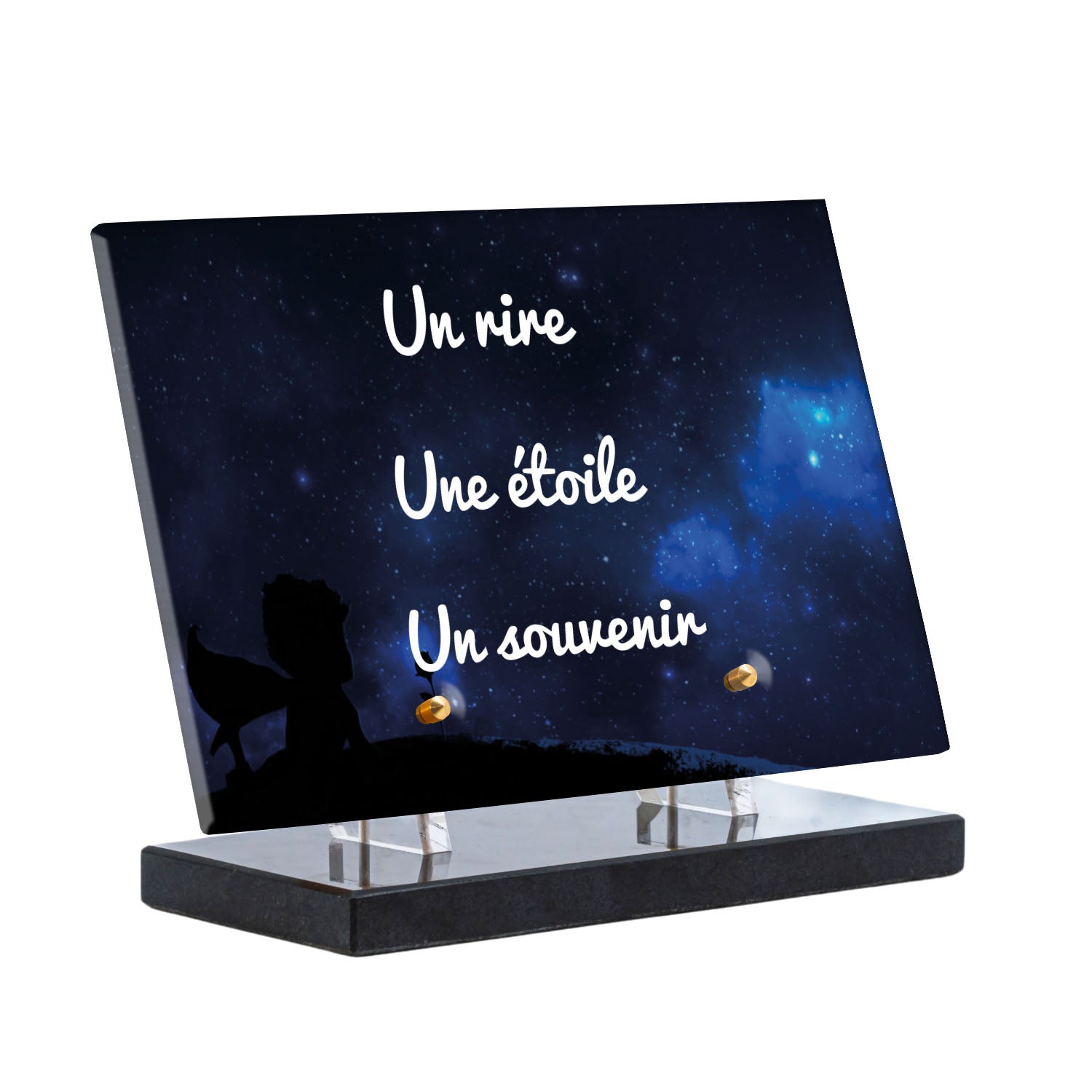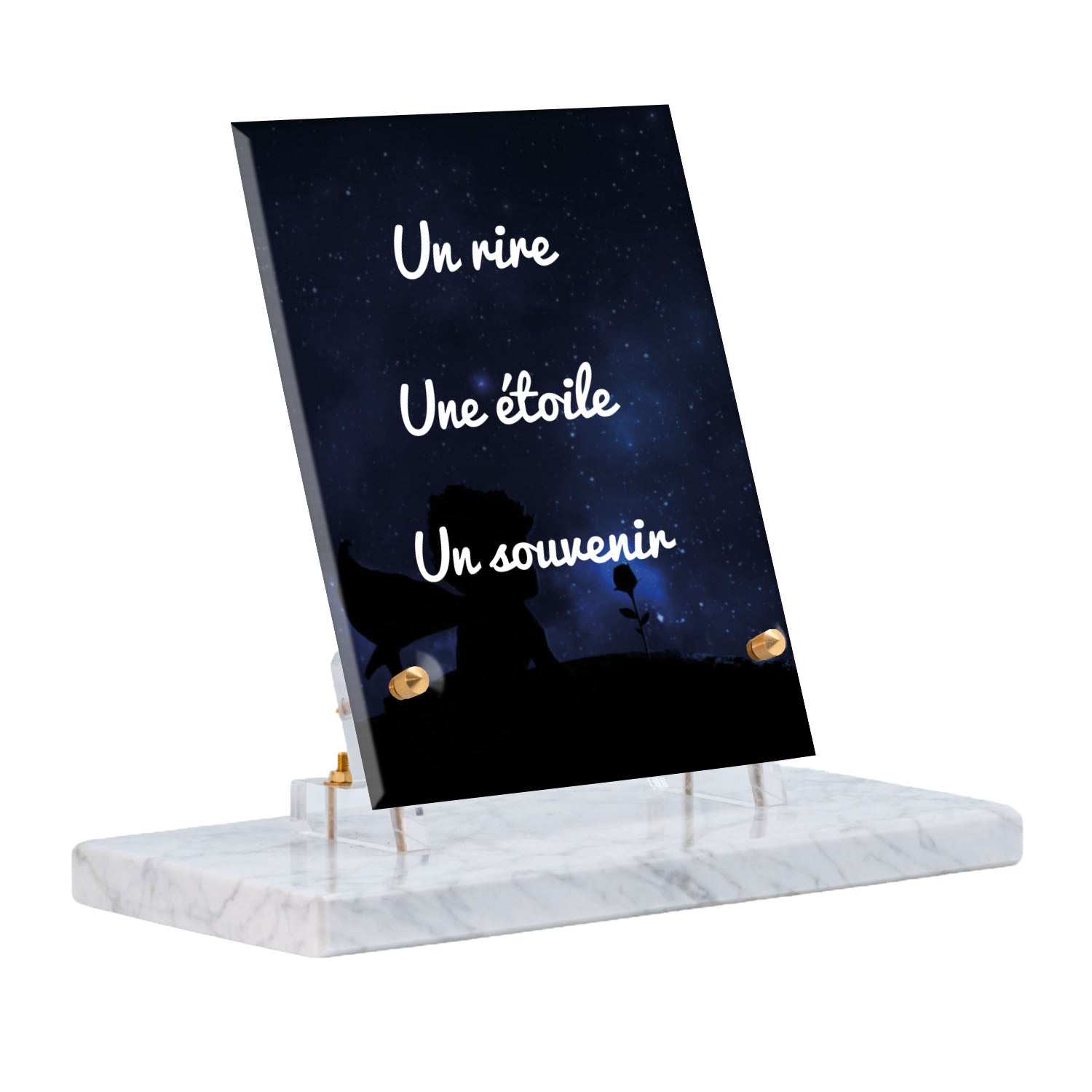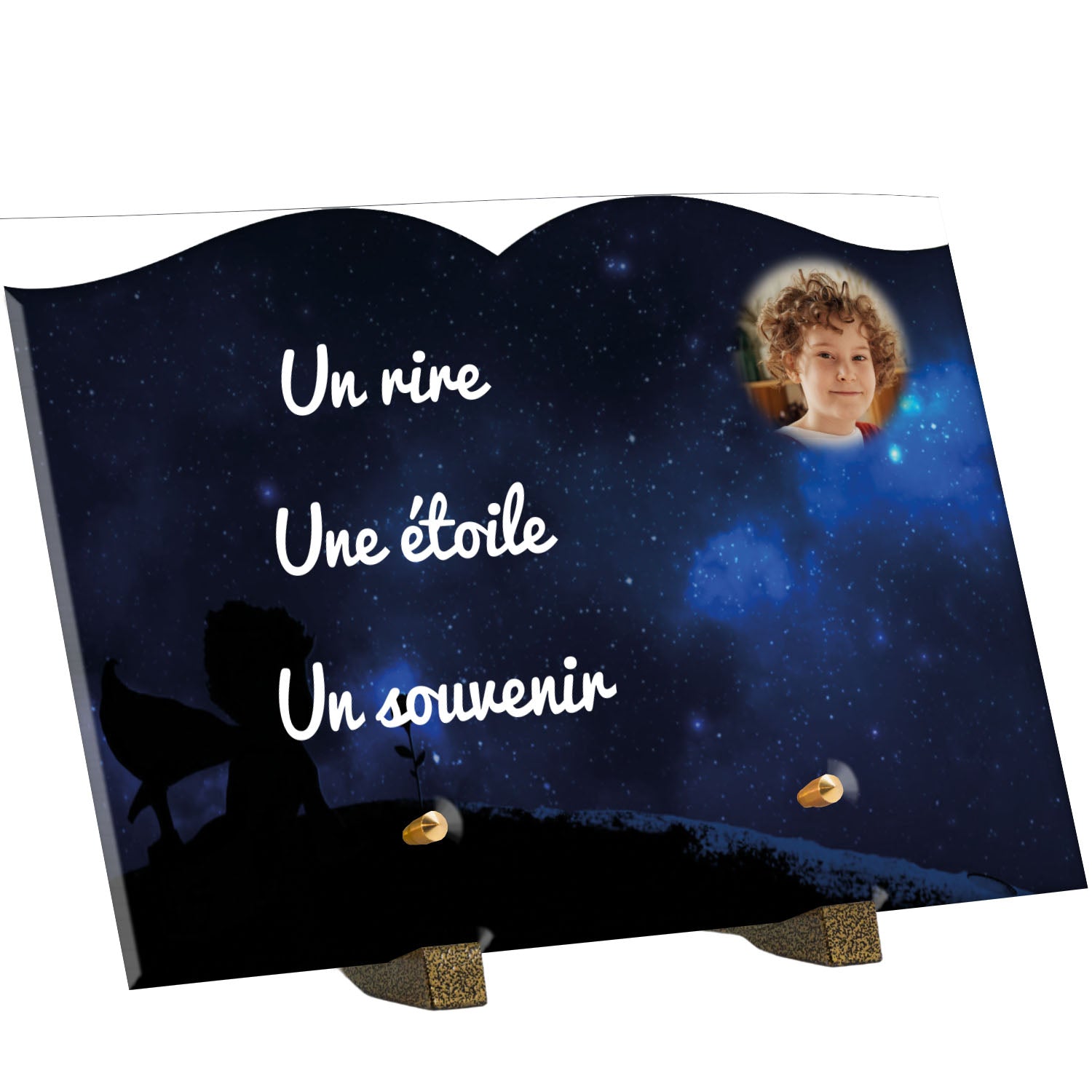 Cette plaque funéraire personnalisée illustre le Petit Prince contemplant un ciel étoilé, offrant un hommage poétique et délicat. Réalisée en matériaux de qualité, cette plaque mortuaire allie design raffiné et modernité grâce à sa composition en plexiglas. Son style contemporain en fait une plaque funéraire moderne, parfaite pour célébrer la mémoire avec sensibilité et élégance. Chaque plaque funéraire est créée sur mesure, assurant une personnalisation fidèle qui rend hommage à l’unicité du défunt. Sa durabilité approuvée garantit une longue conservation face aux éléments, faisant de cette plaque un souvenir pérenne et respectueux.