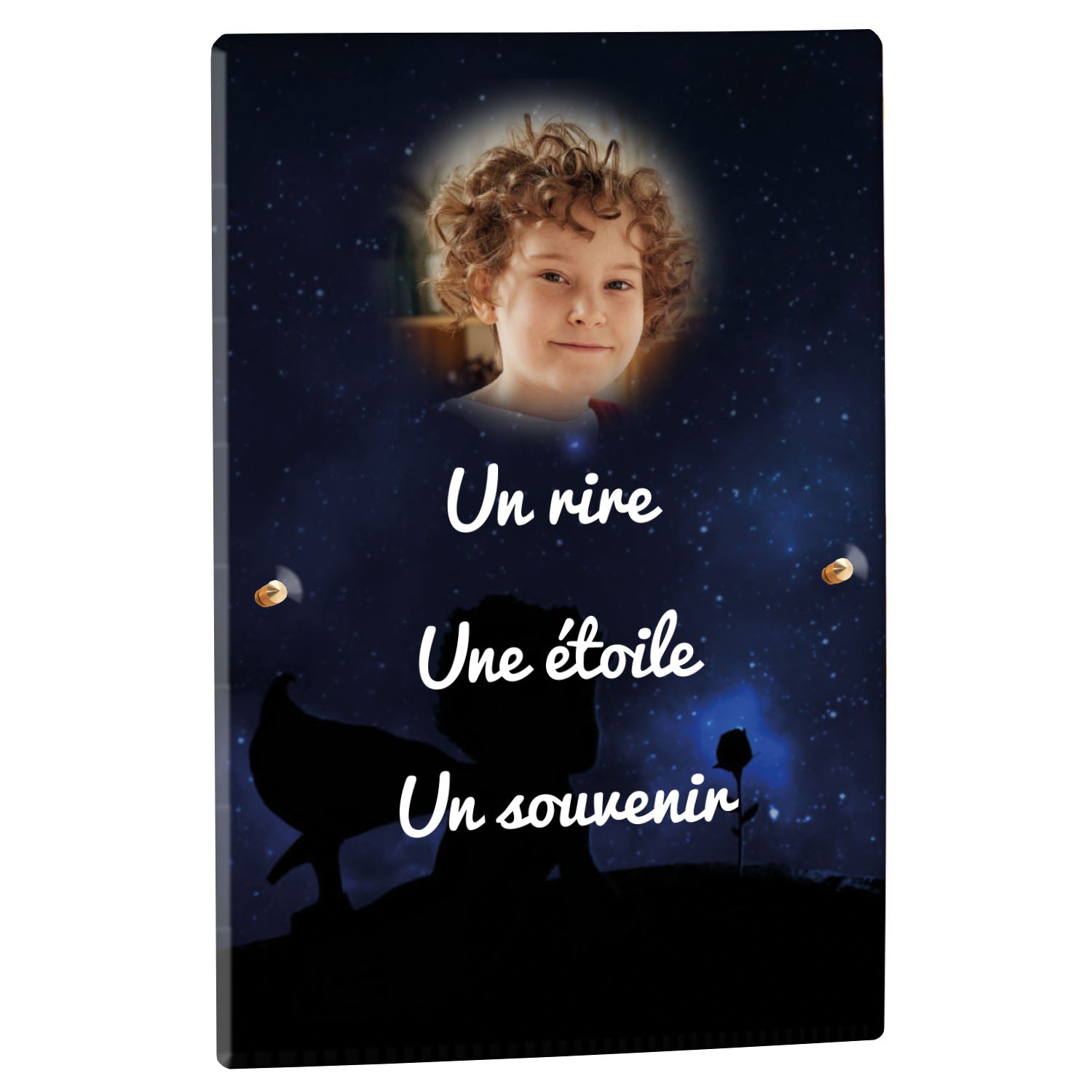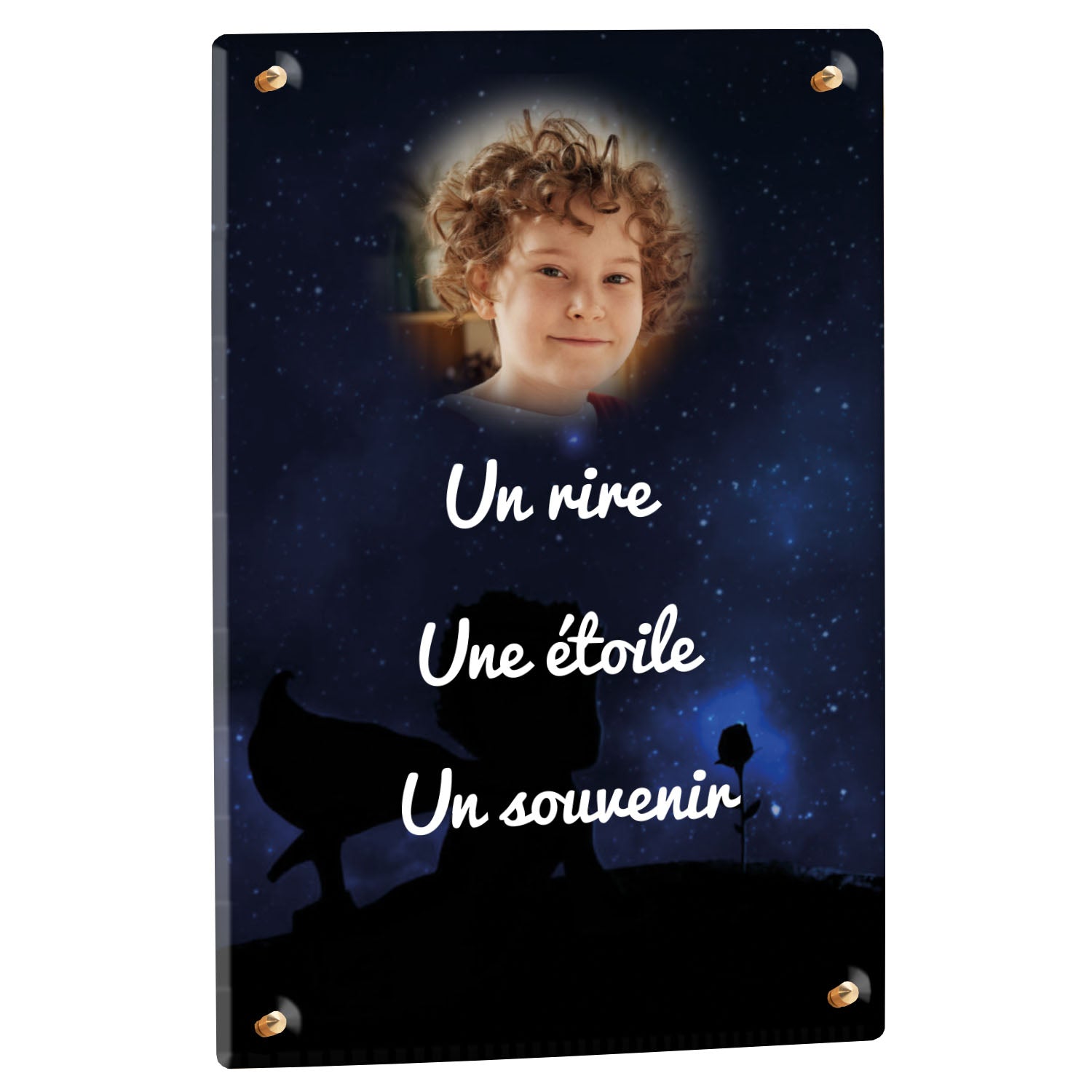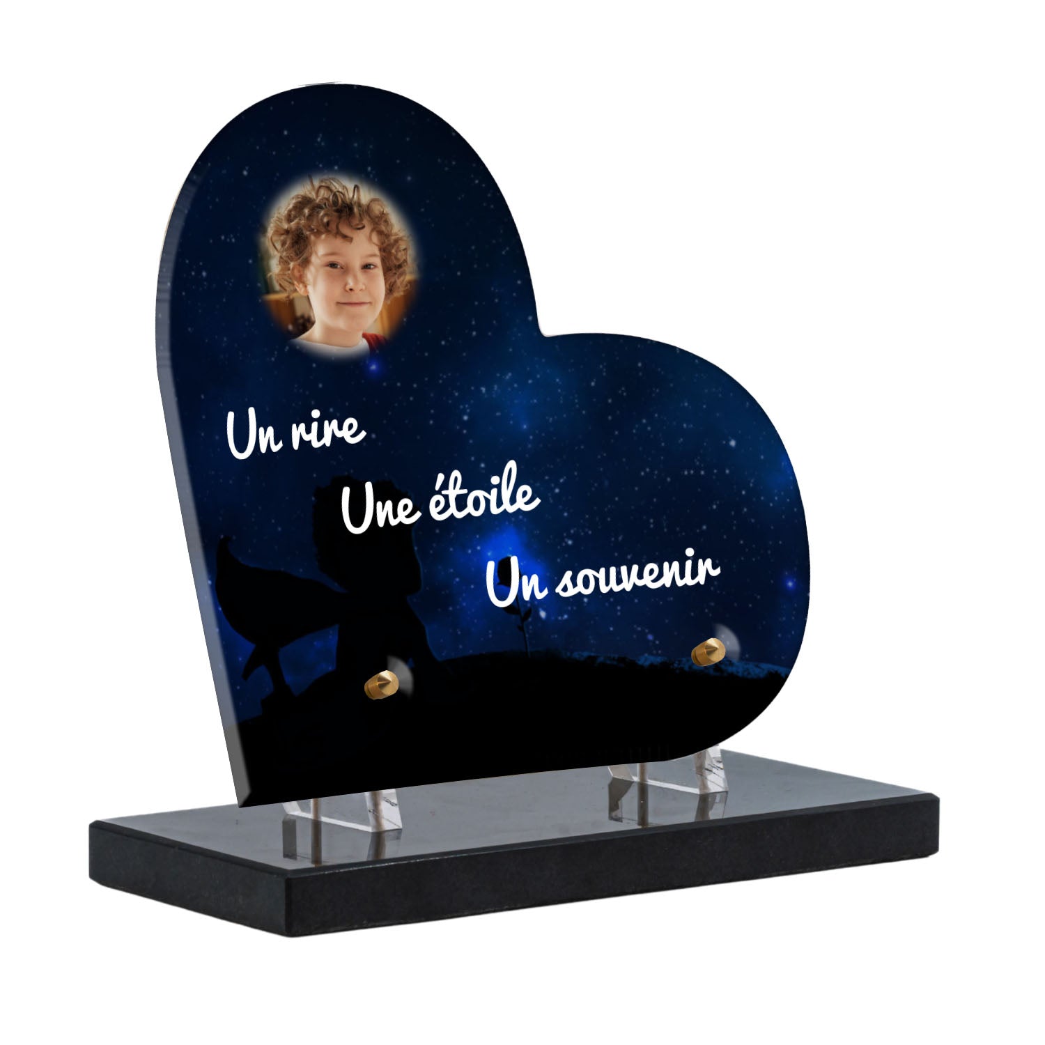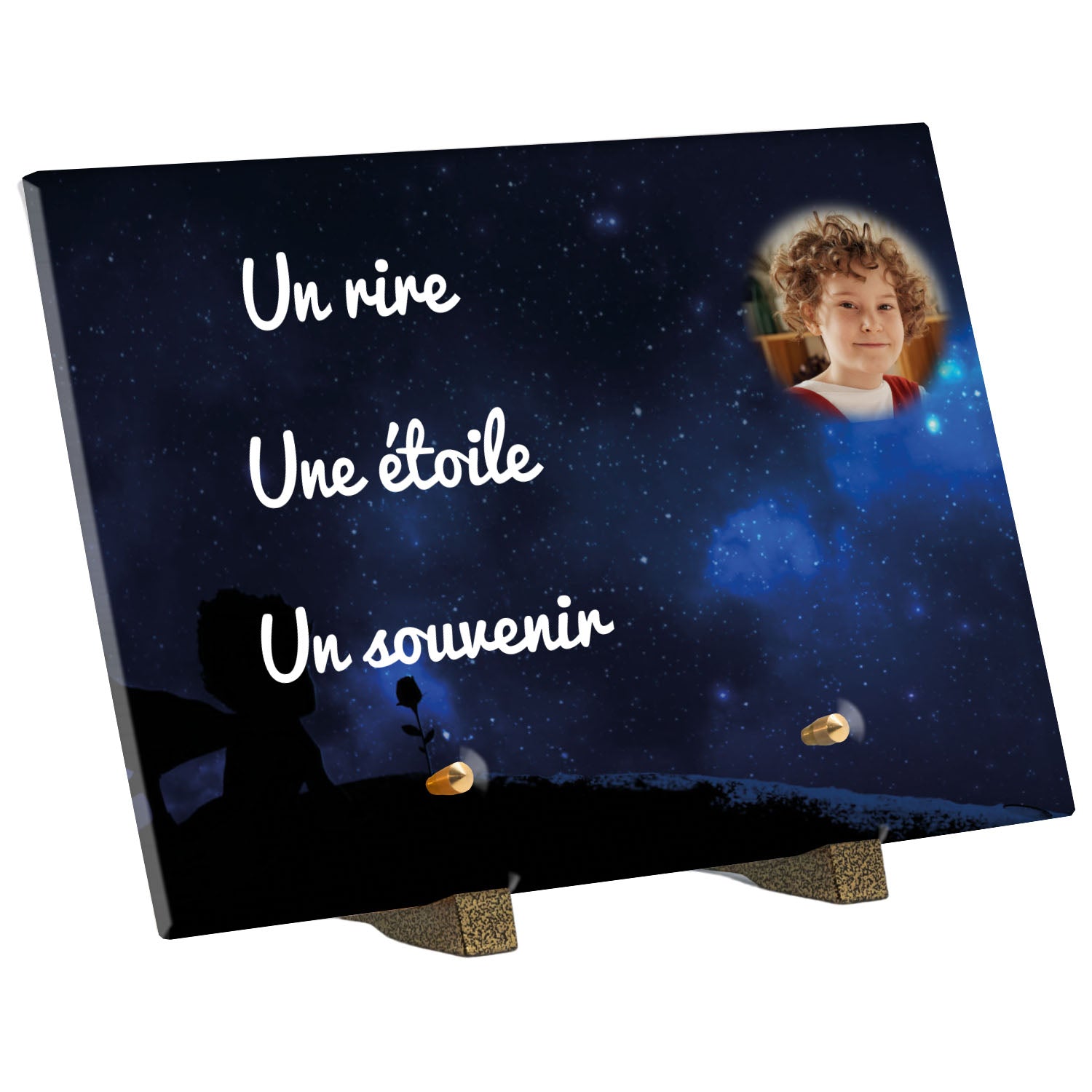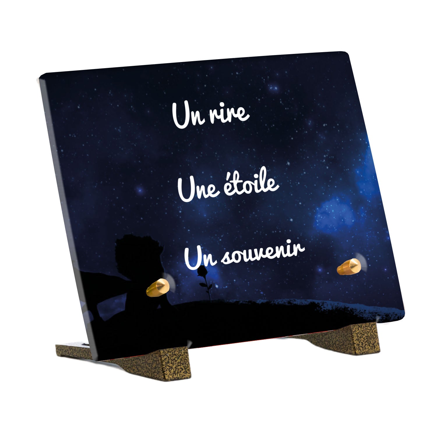 Cette plaque funéraire personnalisée illustre le Petit Prince contemplant un ciel étoilé, offrant un hommage poétique et délicat. Réalisée en matériaux de qualité, cette plaque mortuaire allie design raffiné et modernité grâce à sa composition en plexiglas. Son style contemporain en fait une plaque funéraire moderne, parfaite pour célébrer la mémoire avec sensibilité et élégance. Chaque plaque funéraire est créée sur mesure, assurant une personnalisation fidèle qui rend hommage à l’unicité du défunt. Sa durabilité approuvée garantit une longue conservation face aux éléments, faisant de cette plaque un souvenir pérenne et respectueux.