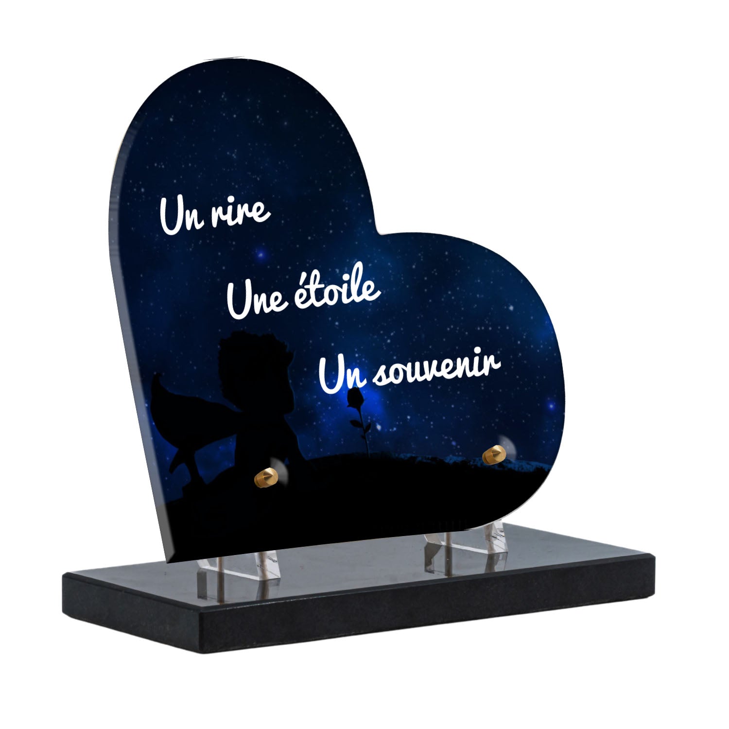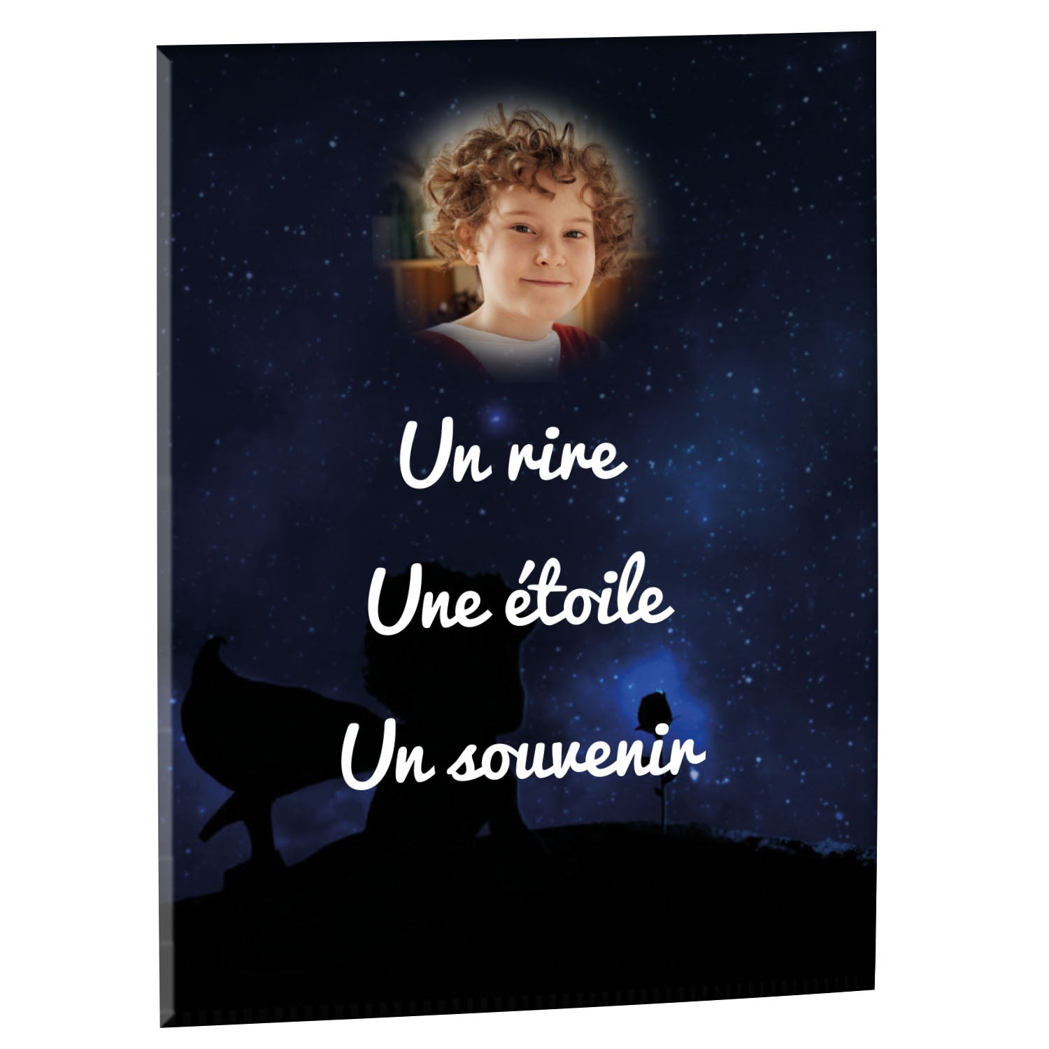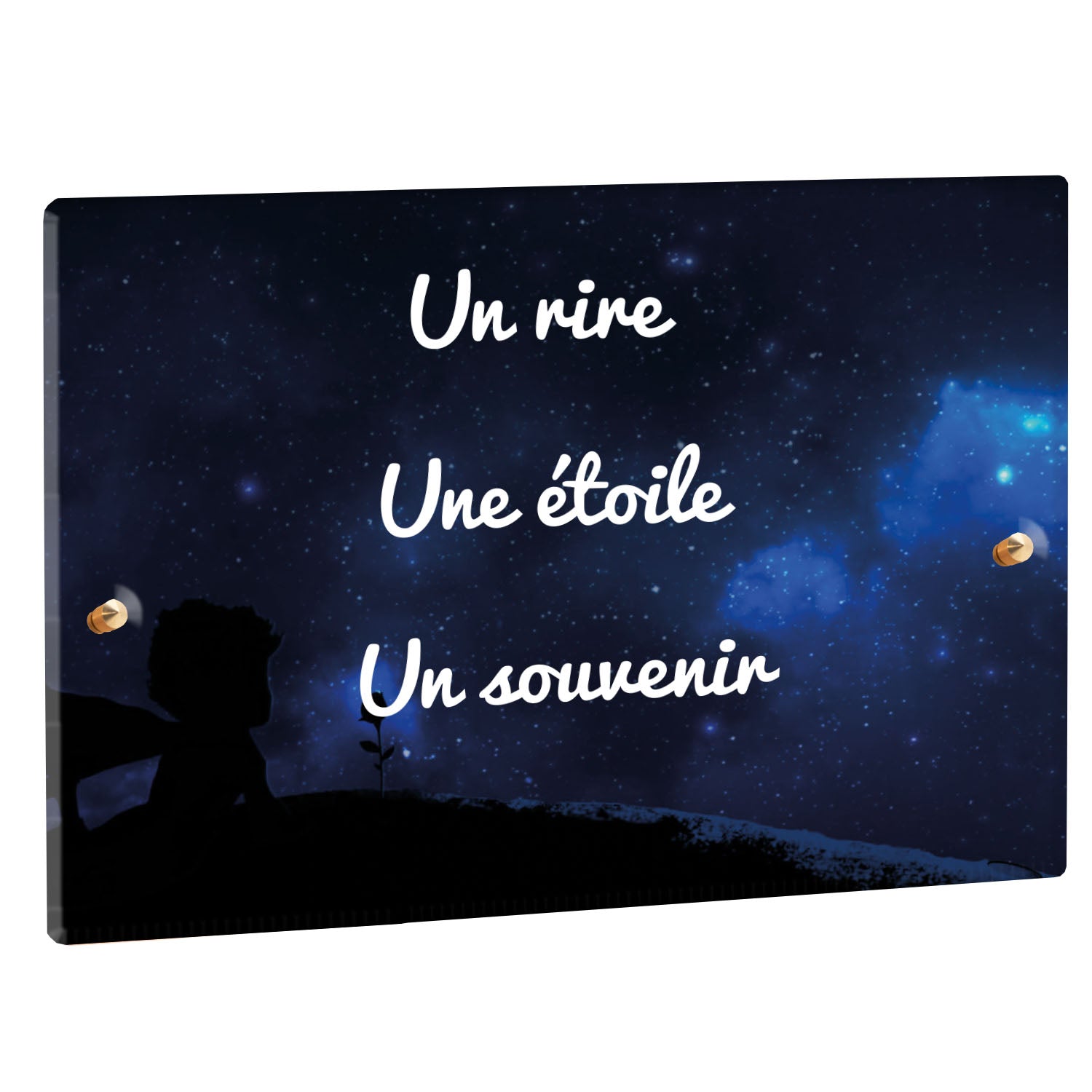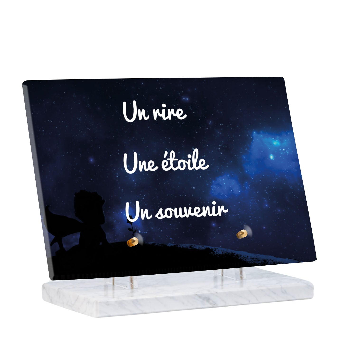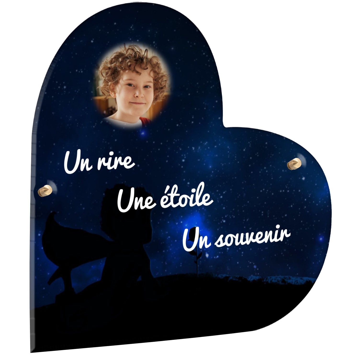 Cette plaque funéraire personnalisée illustre le Petit Prince contemplant un ciel étoilé, offrant un hommage poétique et délicat. Réalisée en matériaux de qualité, cette plaque mortuaire allie design raffiné et modernité grâce à sa composition en plexiglas. Son style contemporain en fait une plaque funéraire moderne, parfaite pour célébrer la mémoire avec sensibilité et élégance. Chaque plaque funéraire est créée sur mesure, assurant une personnalisation fidèle qui rend hommage à l’unicité du défunt. Sa durabilité approuvée garantit une longue conservation face aux éléments, faisant de cette plaque un souvenir pérenne et respectueux.