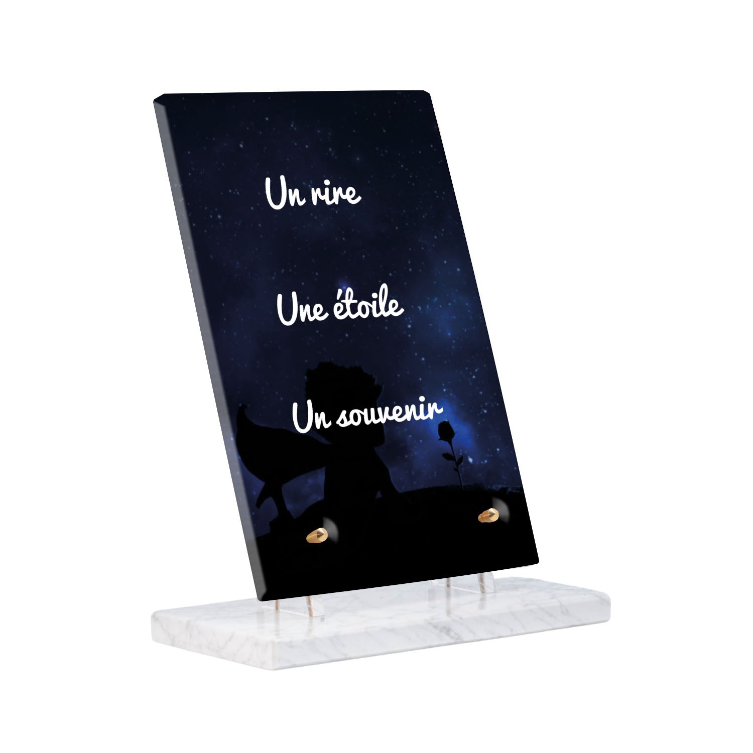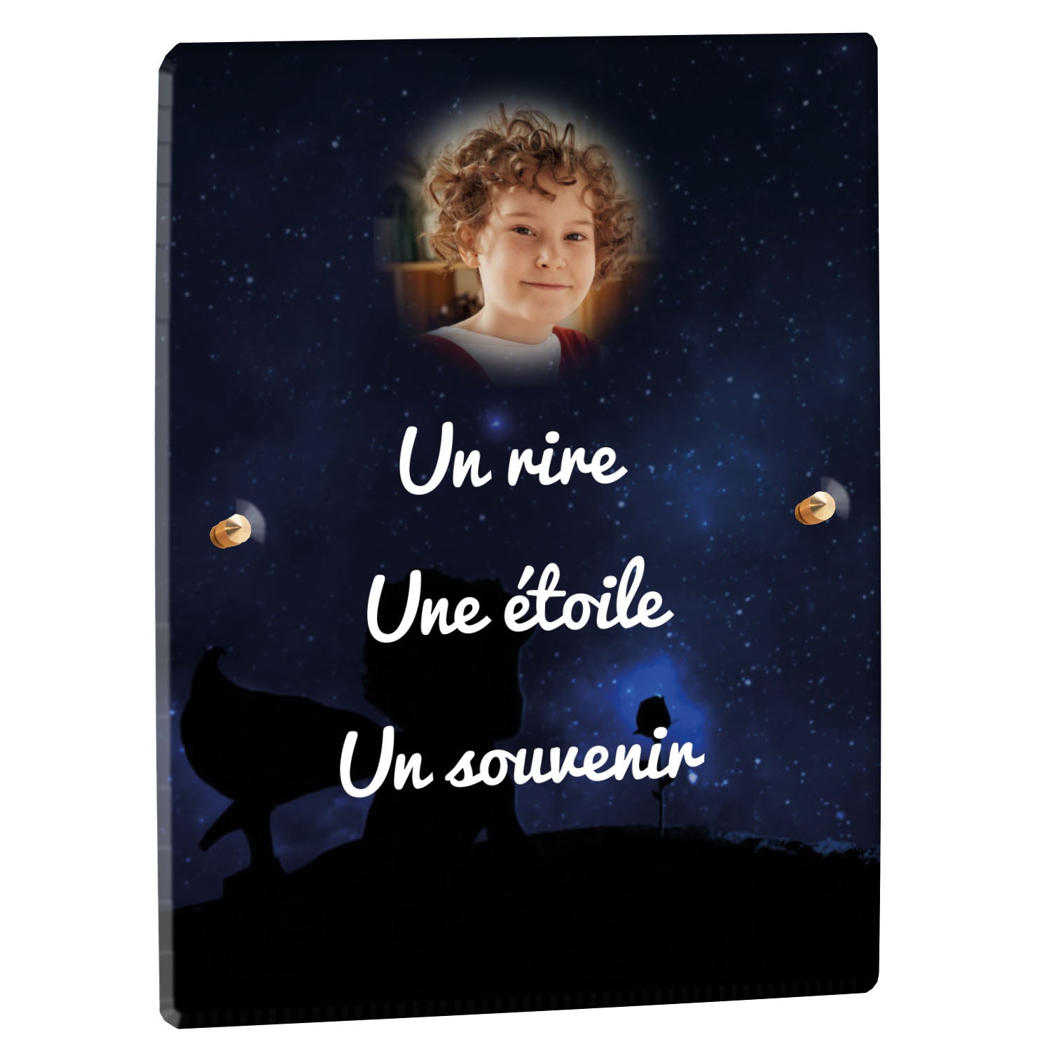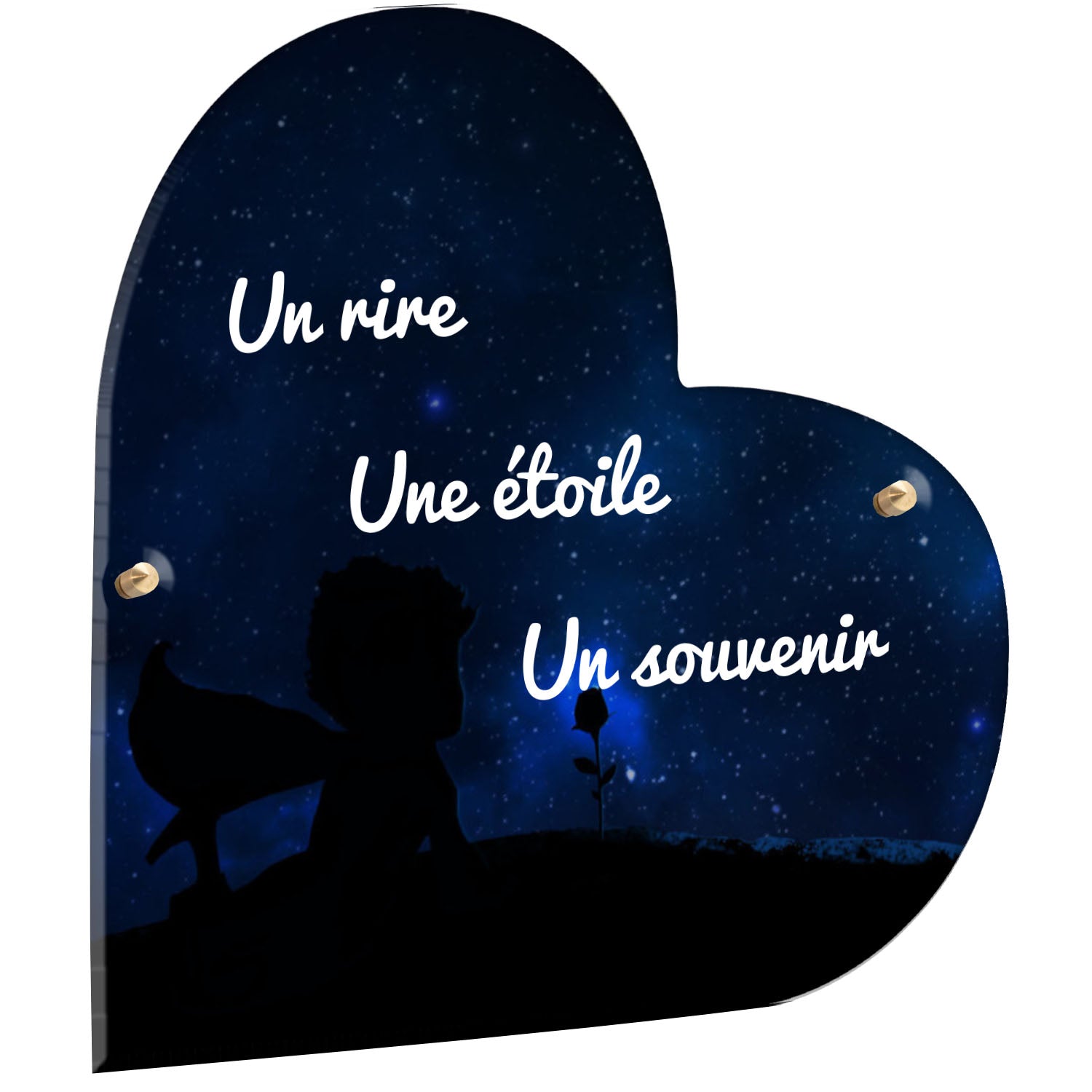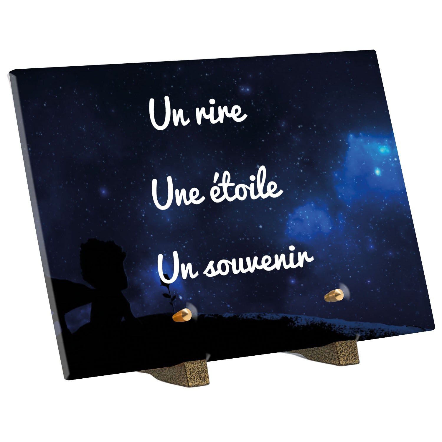 Cette plaque funéraire personnalisée illustre le Petit Prince contemplant un ciel étoilé, offrant un hommage poétique et délicat. Réalisée en matériaux de qualité, cette plaque mortuaire allie design raffiné et modernité grâce à sa composition en plexiglas. Son style contemporain en fait une plaque funéraire moderne, parfaite pour célébrer la mémoire avec sensibilité et élégance. Chaque plaque funéraire est créée sur mesure, assurant une personnalisation fidèle qui rend hommage à l’unicité du défunt. Sa durabilité approuvée garantit une longue conservation face aux éléments, faisant de cette plaque un souvenir pérenne et respectueux.