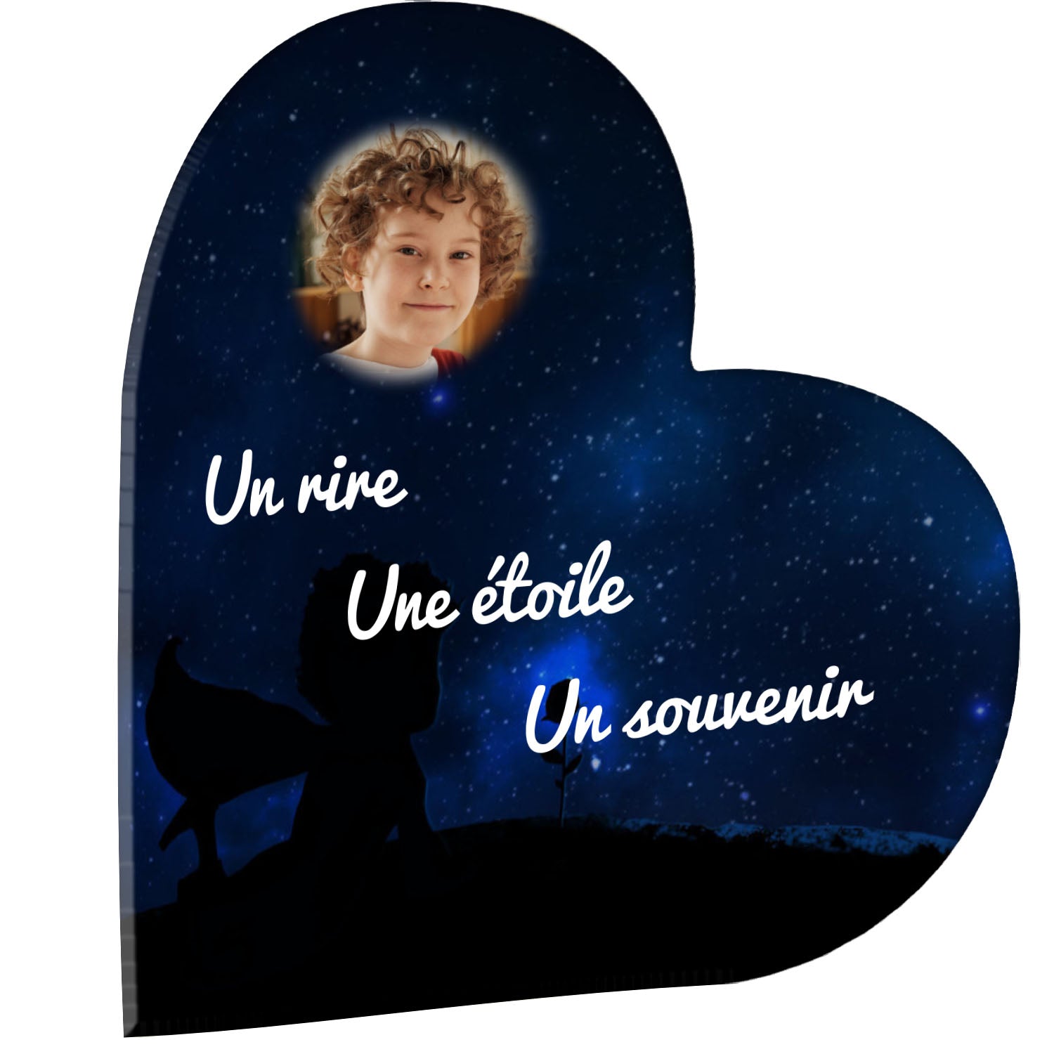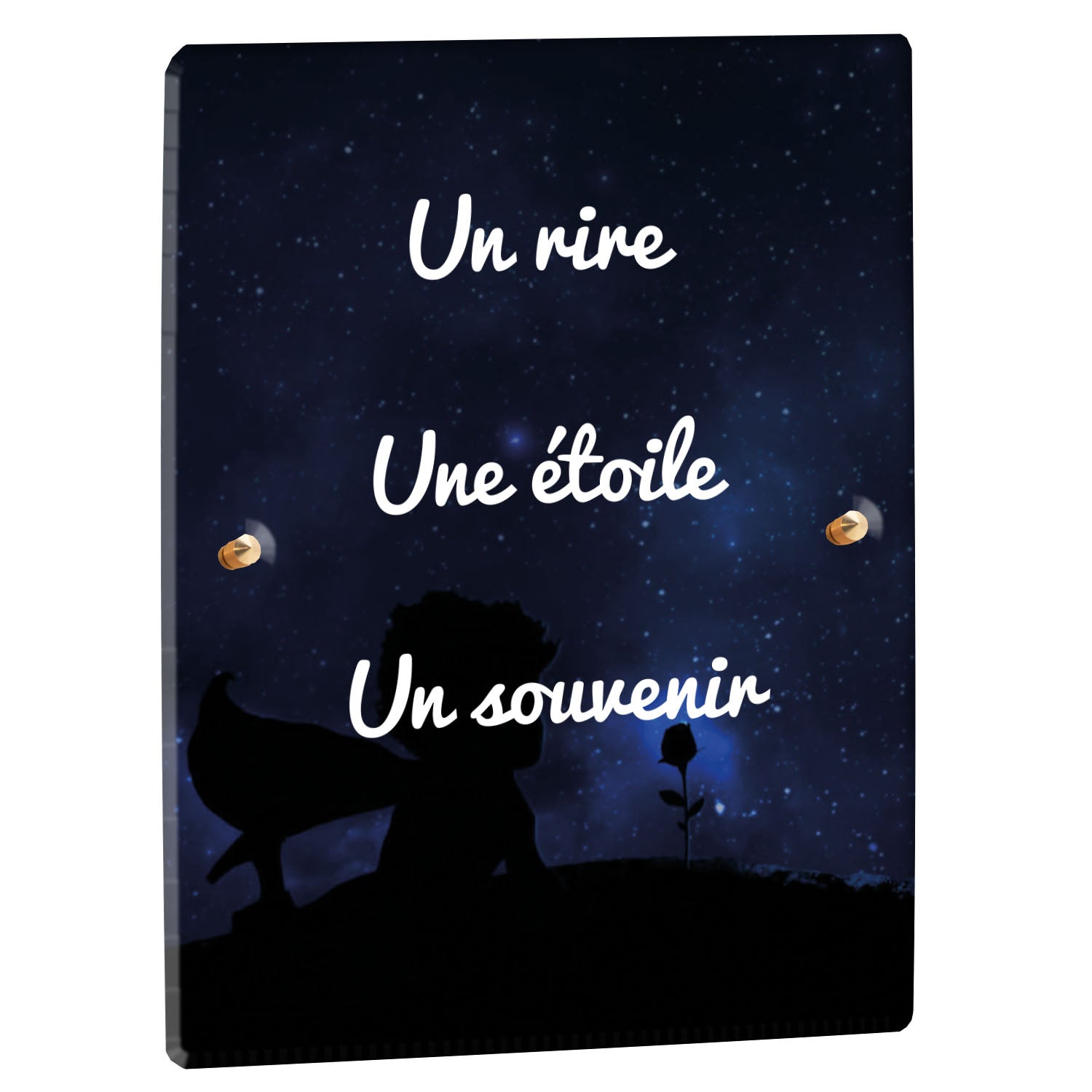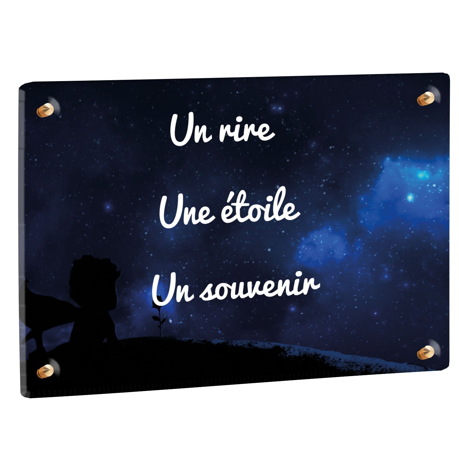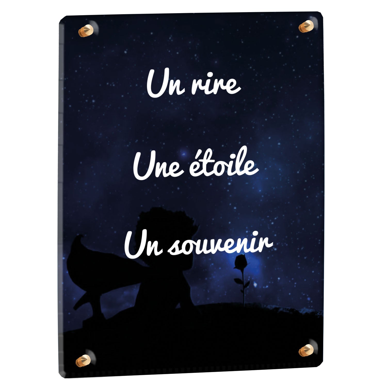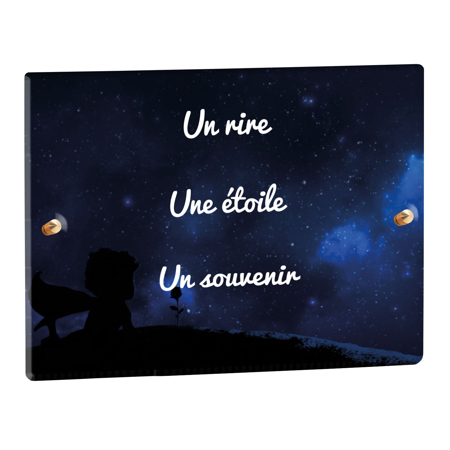 Cette plaque funéraire personnalisée illustre le Petit Prince contemplant un ciel étoilé, offrant un hommage poétique et délicat. Réalisée en matériaux de qualité, cette plaque mortuaire allie design raffiné et modernité grâce à sa composition en plexiglas. Son style contemporain en fait une plaque funéraire moderne, parfaite pour célébrer la mémoire avec sensibilité et élégance. Chaque plaque funéraire est créée sur mesure, assurant une personnalisation fidèle qui rend hommage à l’unicité du défunt. Sa durabilité approuvée garantit une longue conservation face aux éléments, faisant de cette plaque un souvenir pérenne et respectueux.