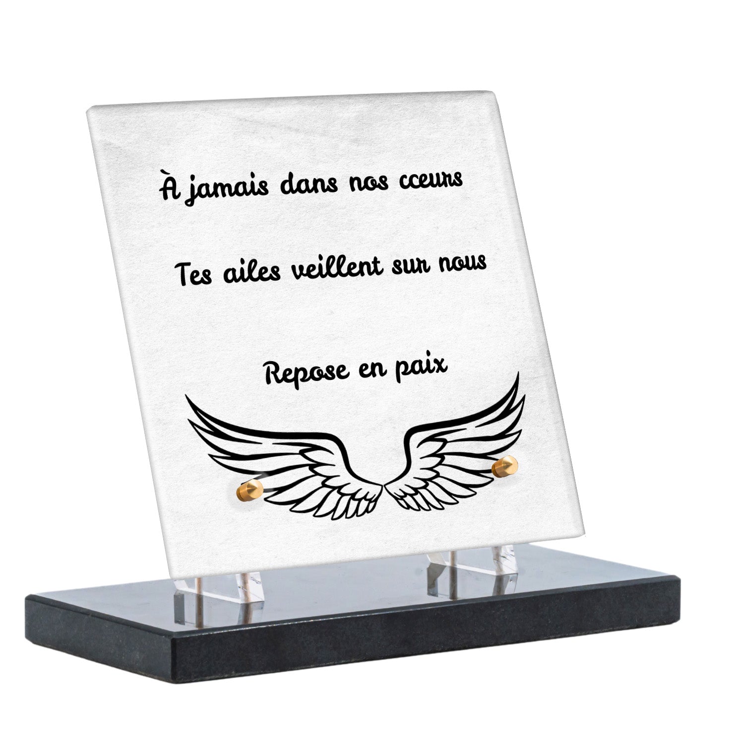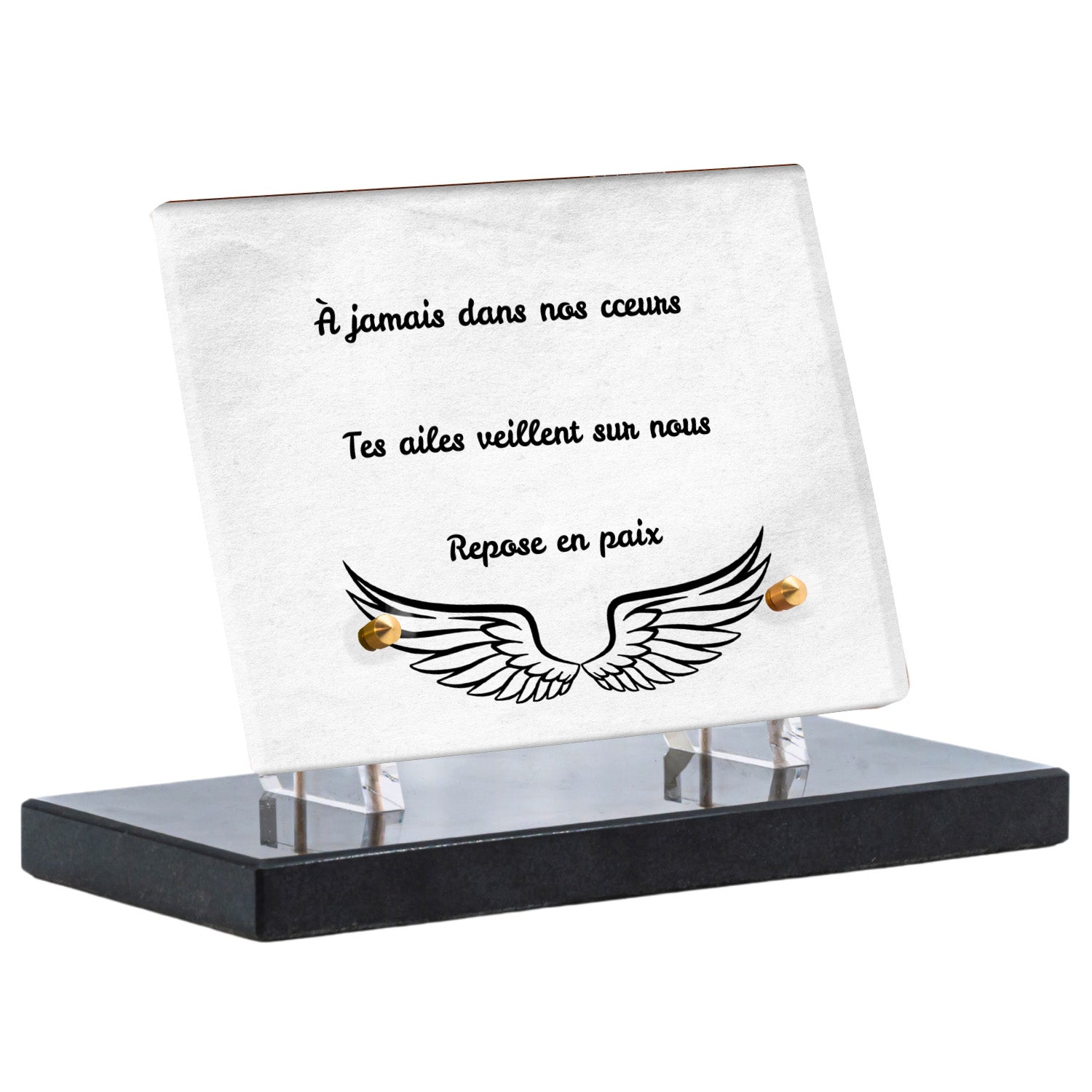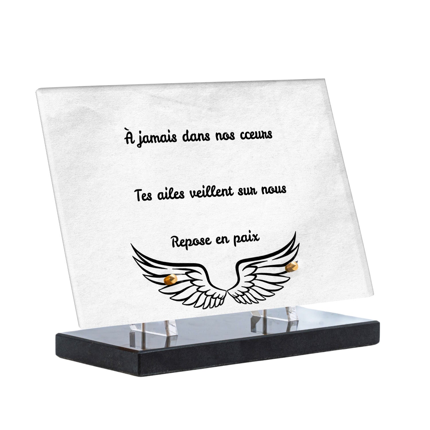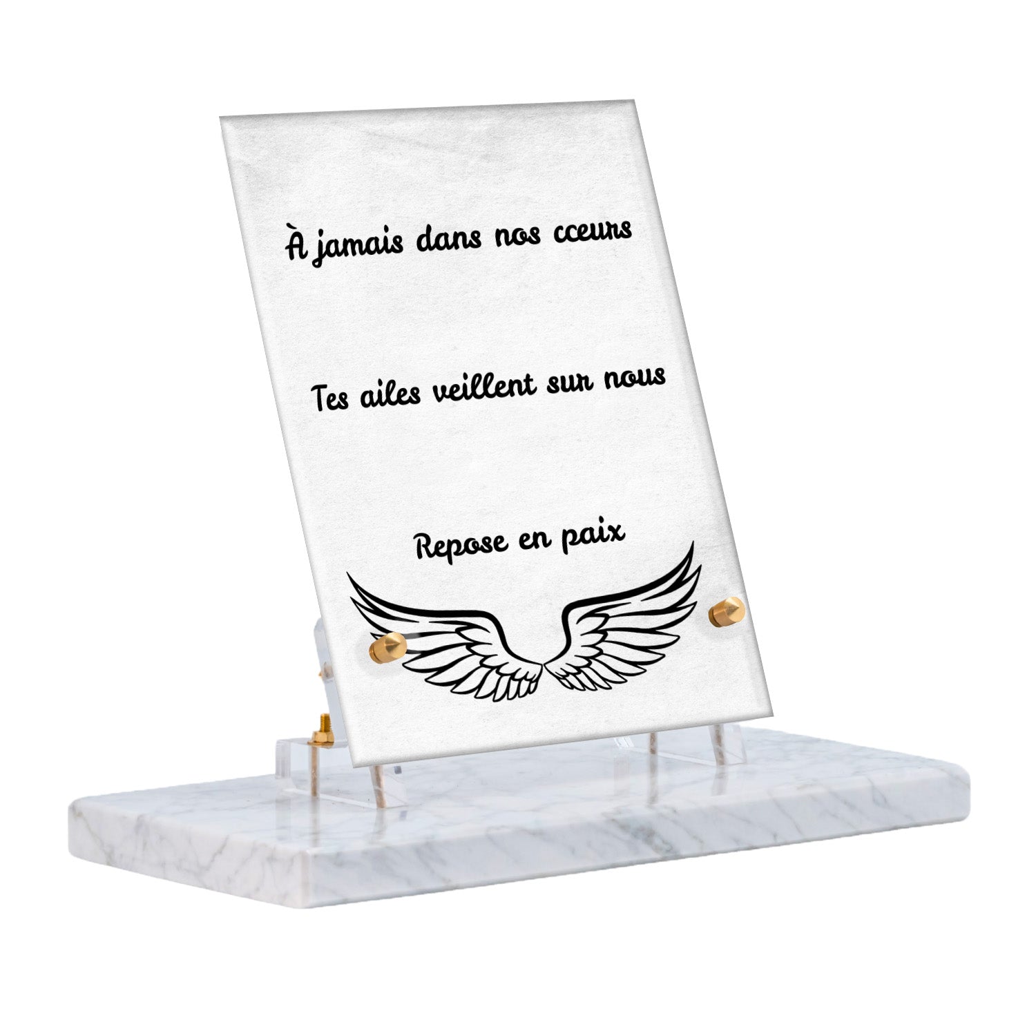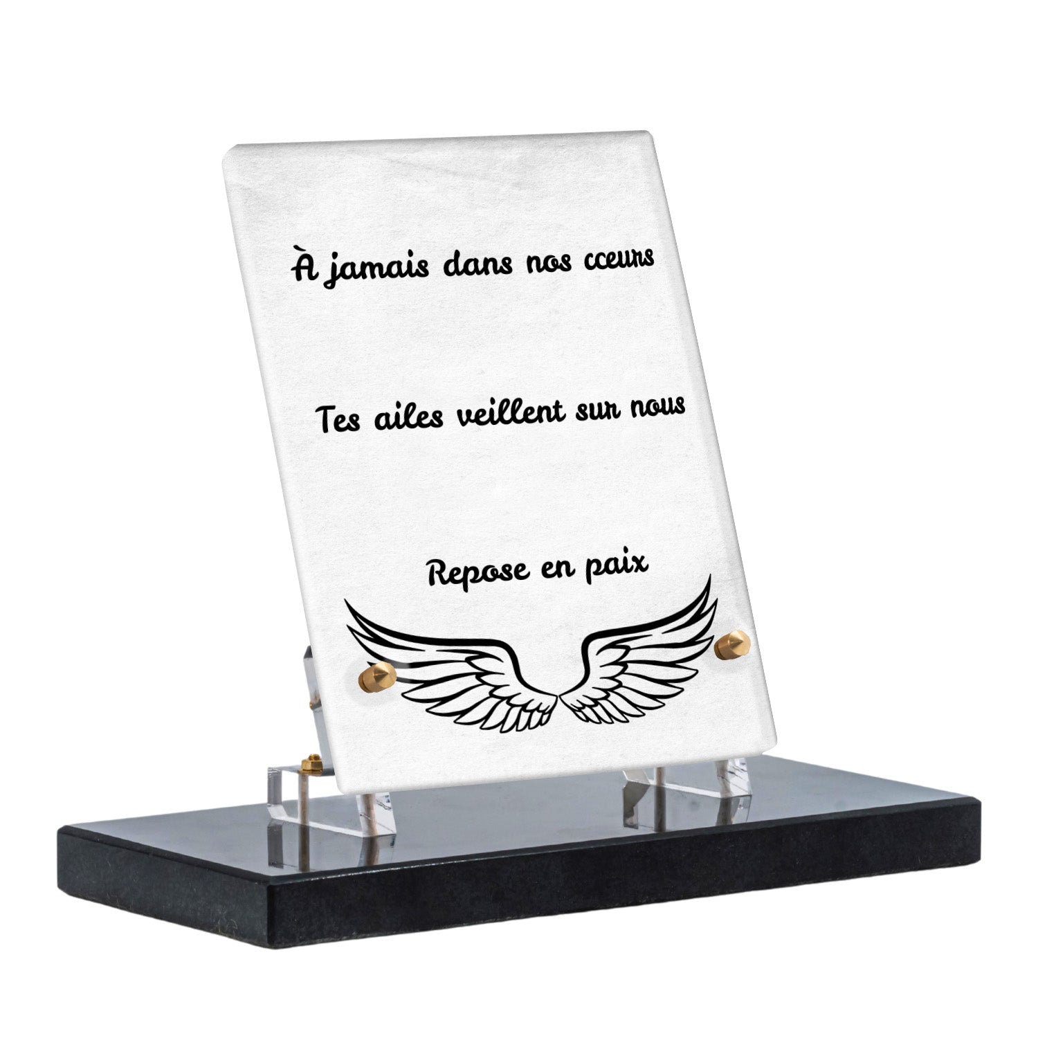 Notre plaque funéraire personnalisée « Ailes d'ange » allie design délicat et modernité. Cette plaque mortuaire, réalisée en plexiglas, présente une gravure élégante d'ailes d'ange qui symbolise la protection et la paix. Sa finition soignée en fait une plaque funéraire moderne, parfaite pour rendre hommage avec dignité.