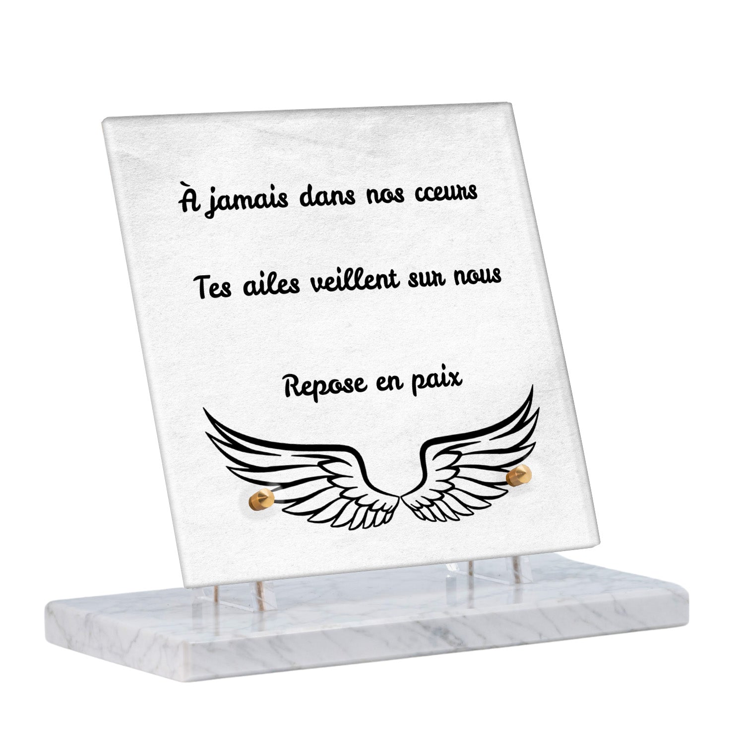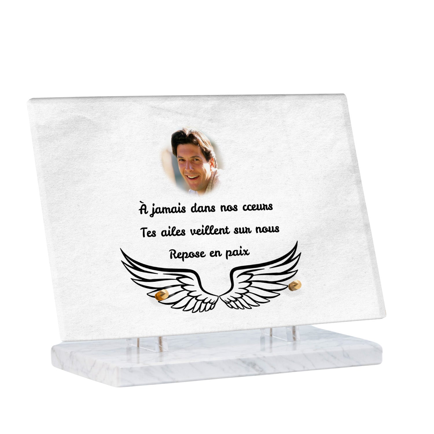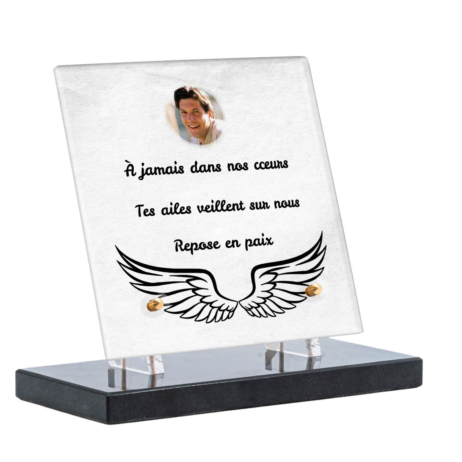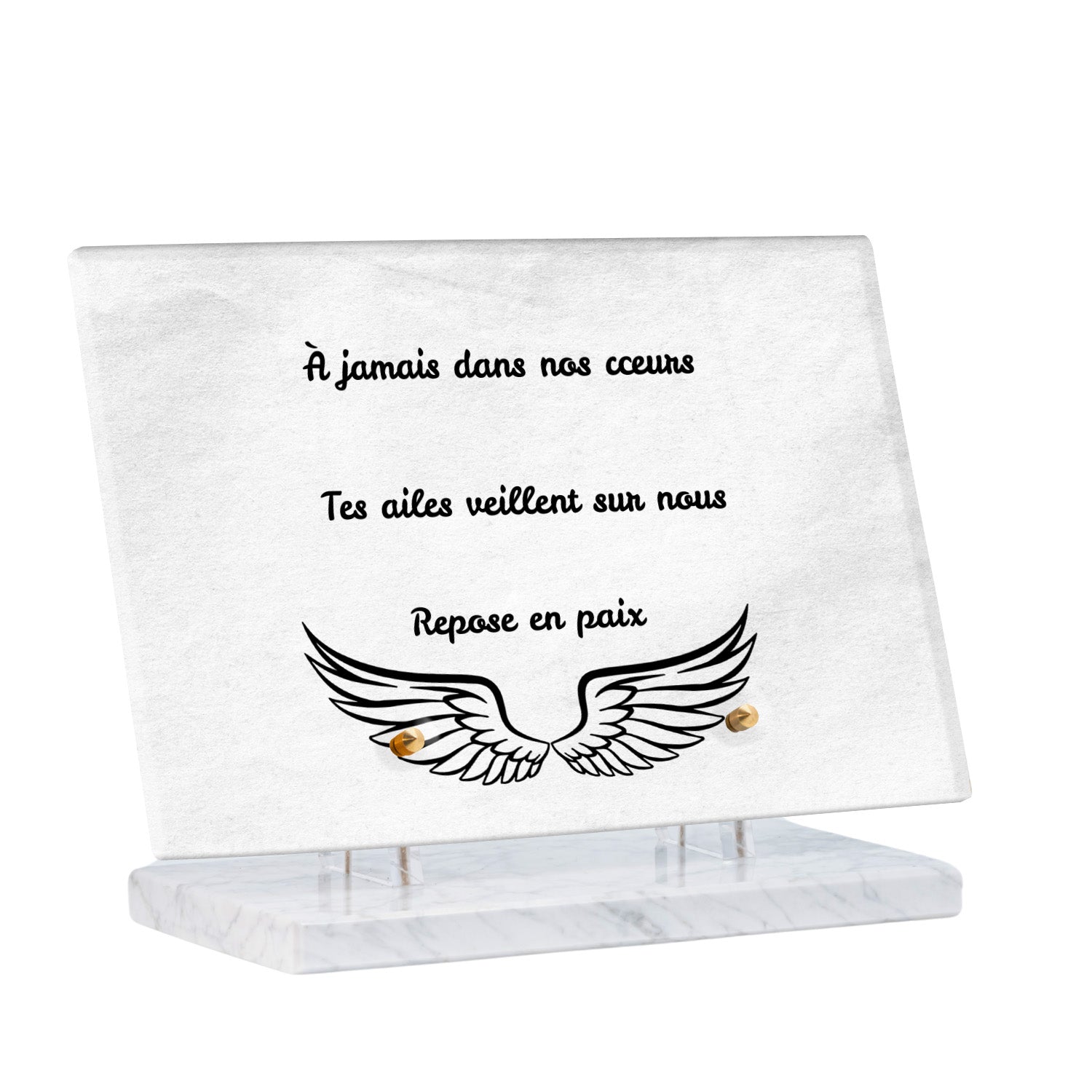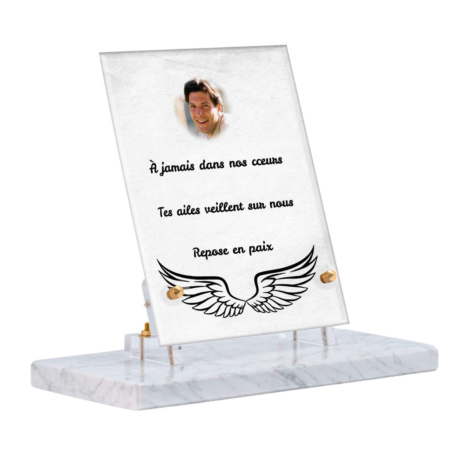 Notre plaque funéraire personnalisée « Ailes d'ange » allie design délicat et modernité. Cette plaque mortuaire, réalisée en plexiglas, présente une gravure élégante d'ailes d'ange qui symbolise la protection et la paix. Sa finition soignée en fait une plaque funéraire moderne, parfaite pour rendre hommage avec dignité.