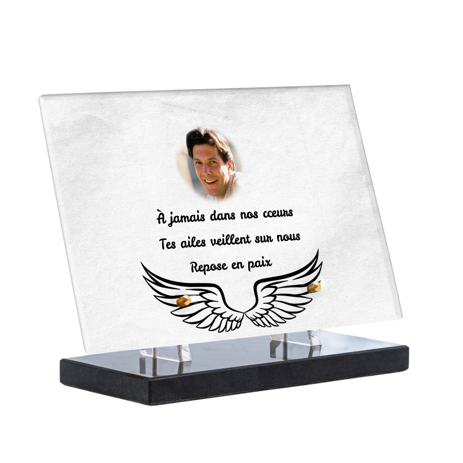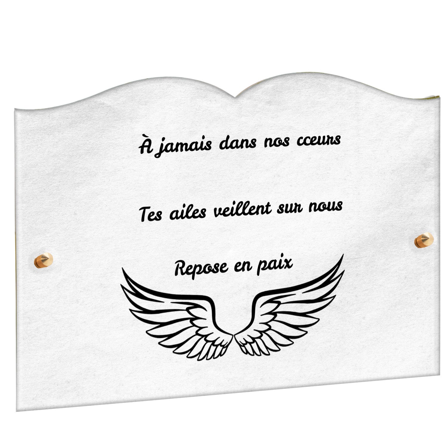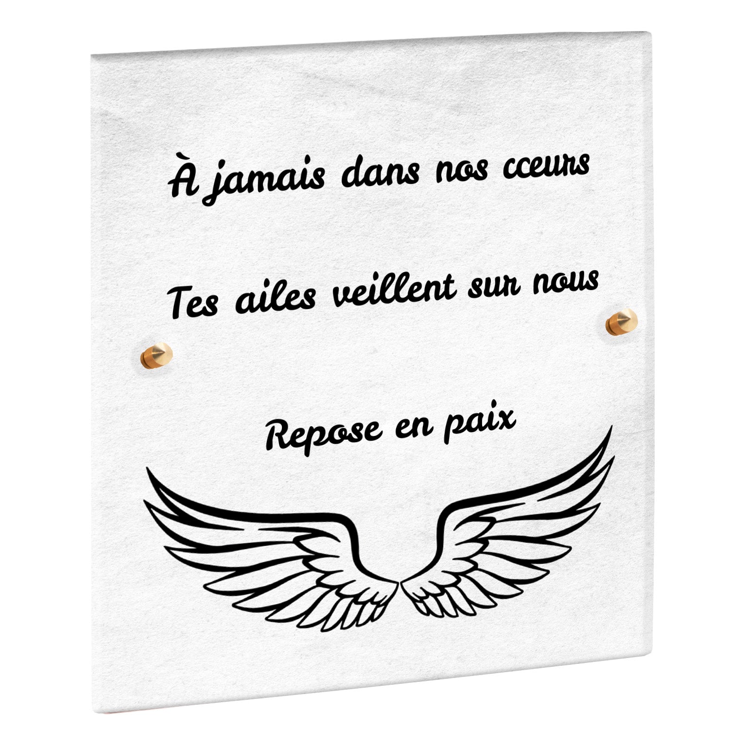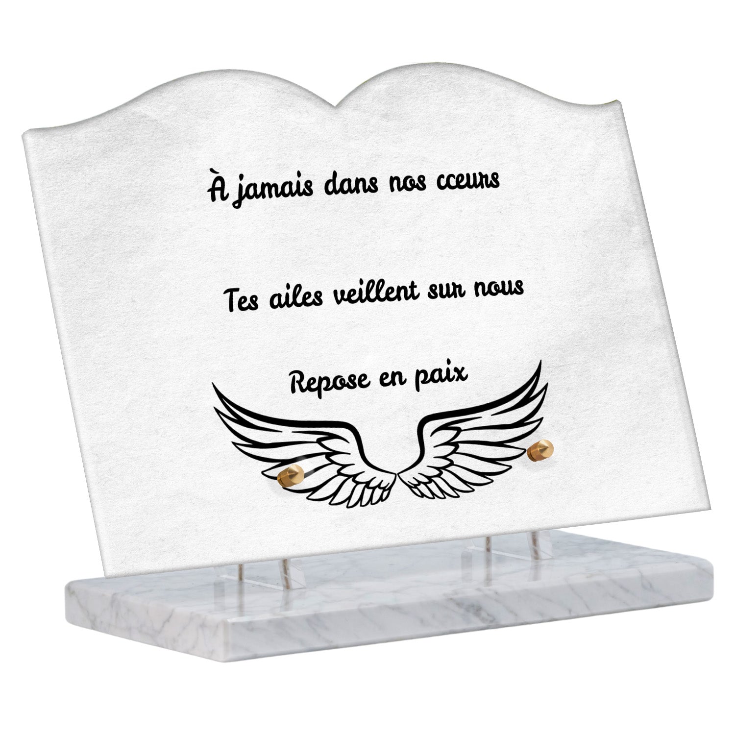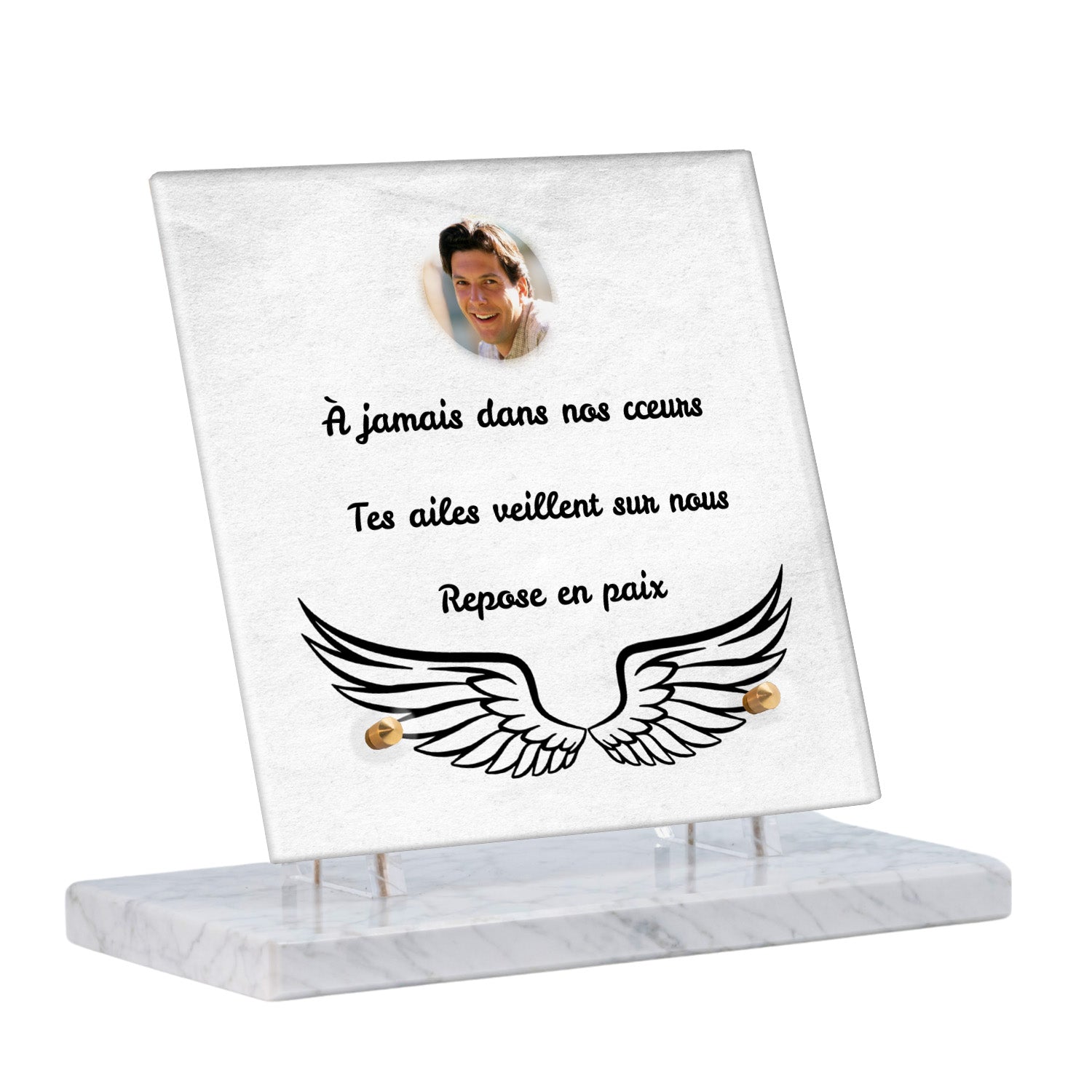 Notre plaque funéraire personnalisée « Ailes d'ange » allie design délicat et modernité. Cette plaque mortuaire, réalisée en plexiglas, présente une gravure élégante d'ailes d'ange qui symbolise la protection et la paix. Sa finition soignée en fait une plaque funéraire moderne, parfaite pour rendre hommage avec dignité.