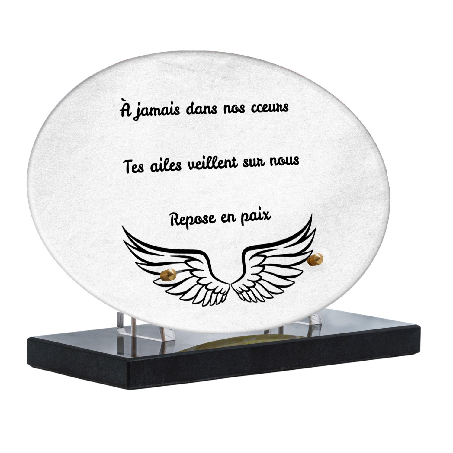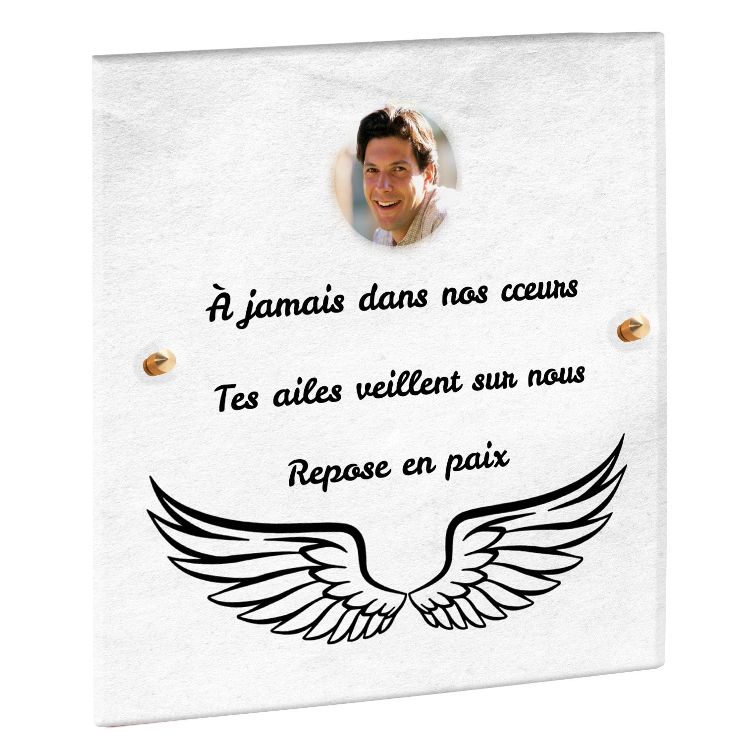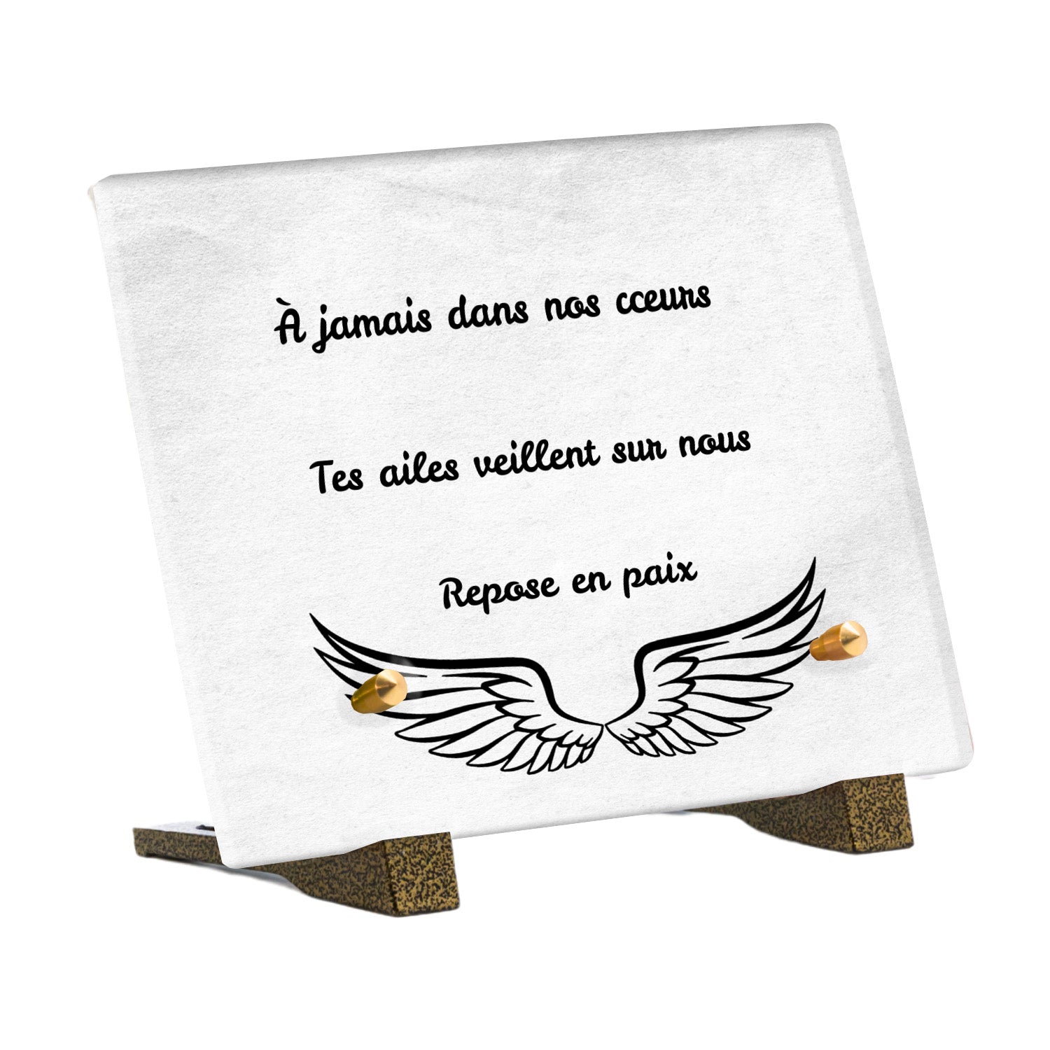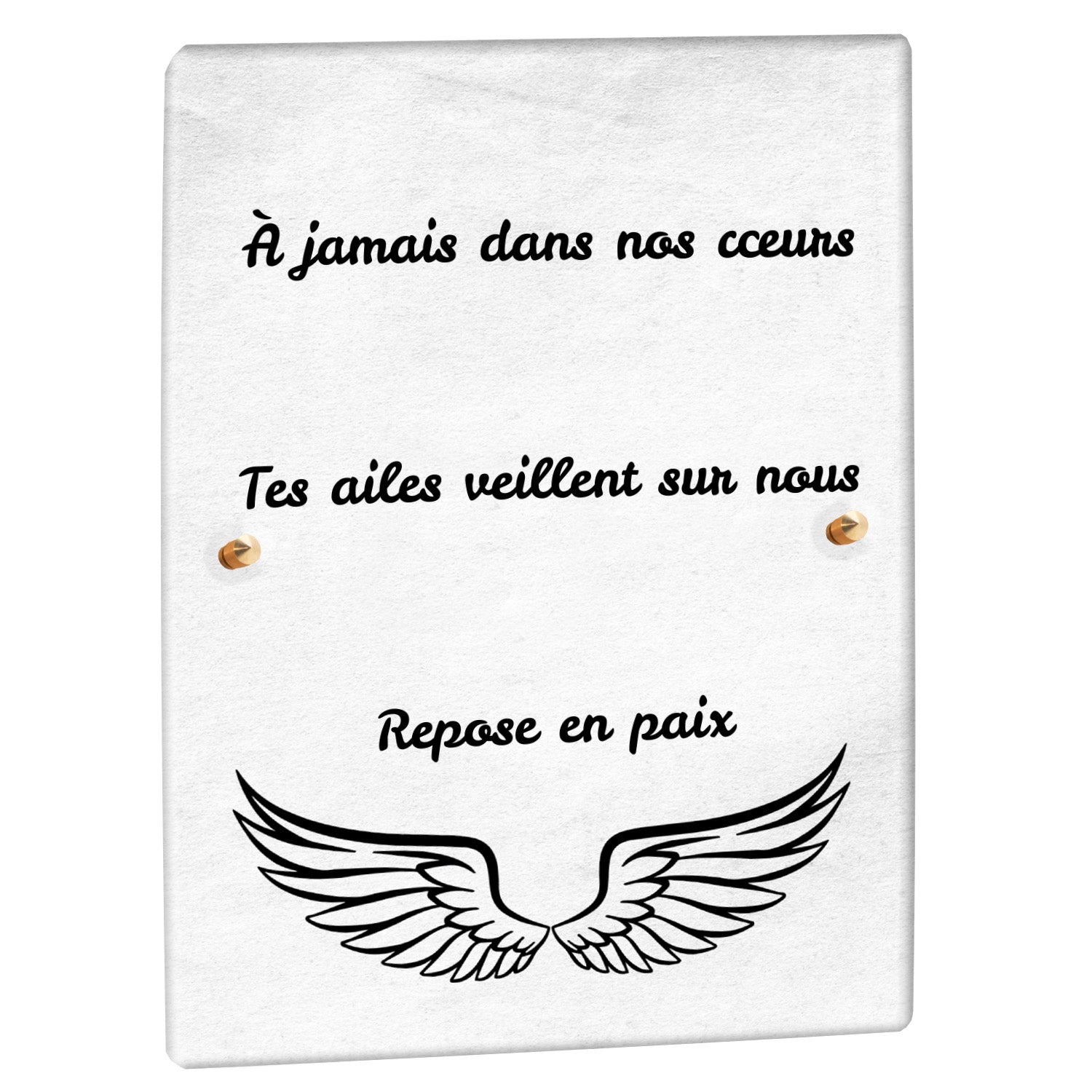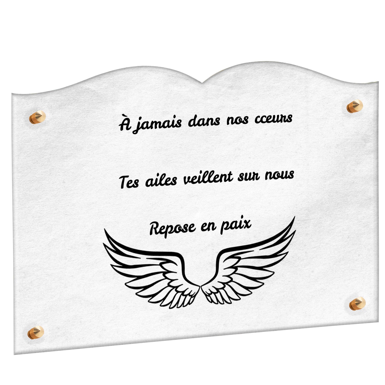 Notre plaque funéraire personnalisée « Ailes d'ange » allie design délicat et modernité. Cette plaque mortuaire, réalisée en plexiglas, présente une gravure élégante d'ailes d'ange qui symbolise la protection et la paix. Sa finition soignée en fait une plaque funéraire moderne, parfaite pour rendre hommage avec dignité.