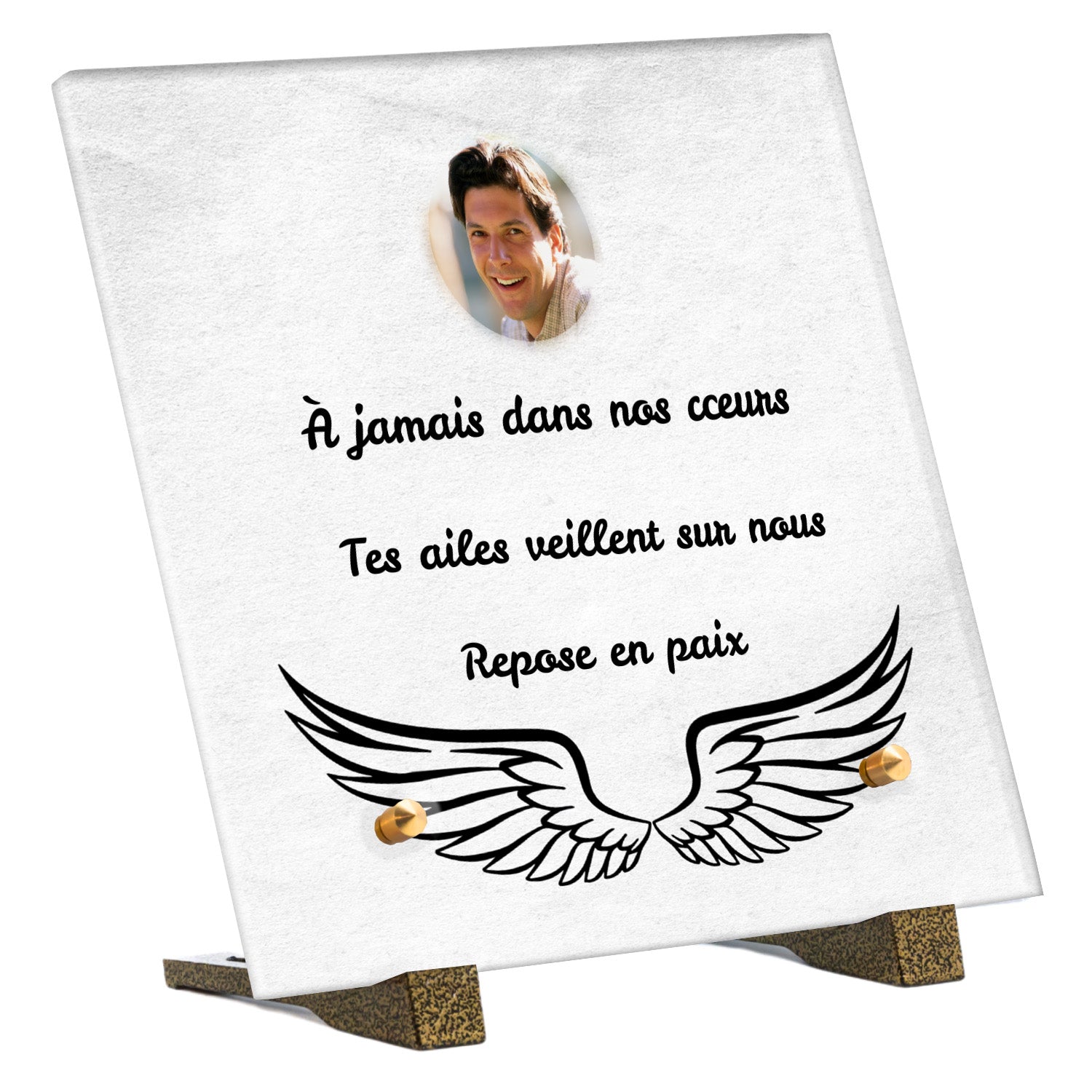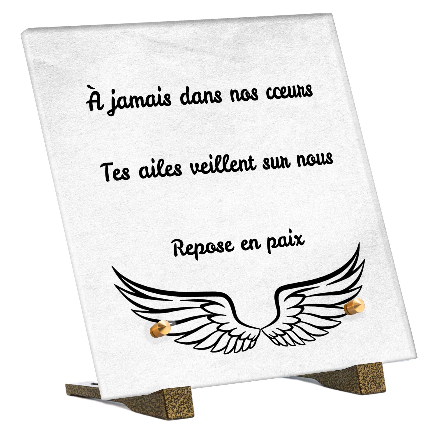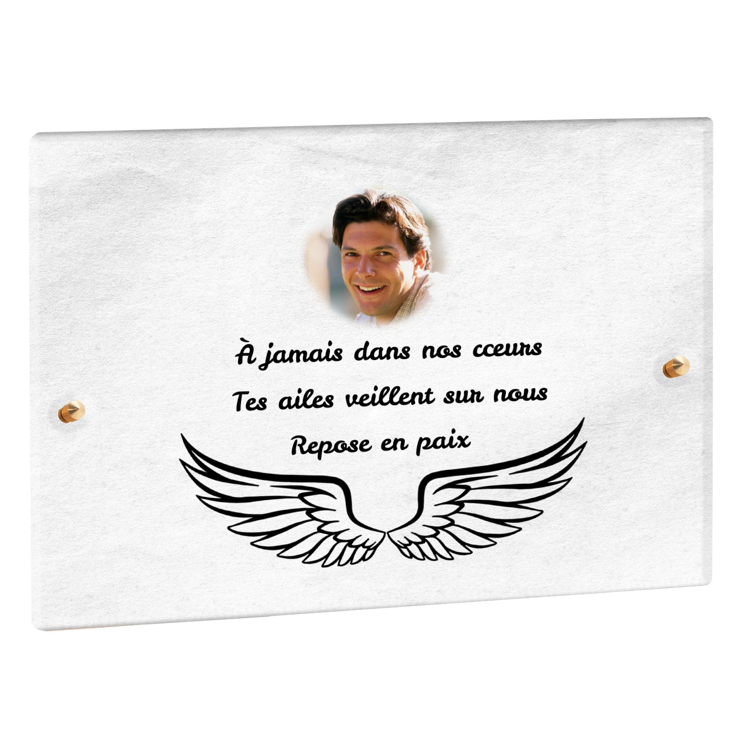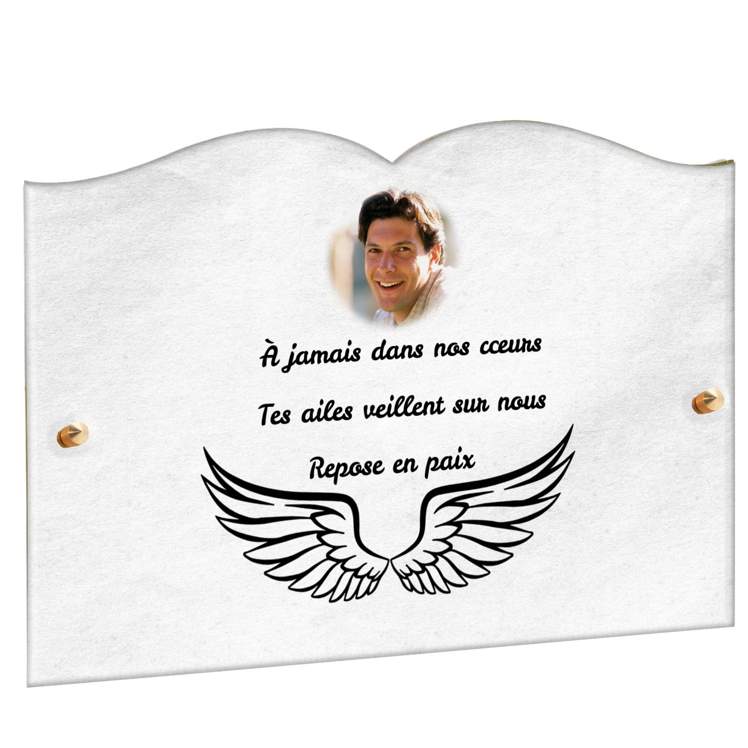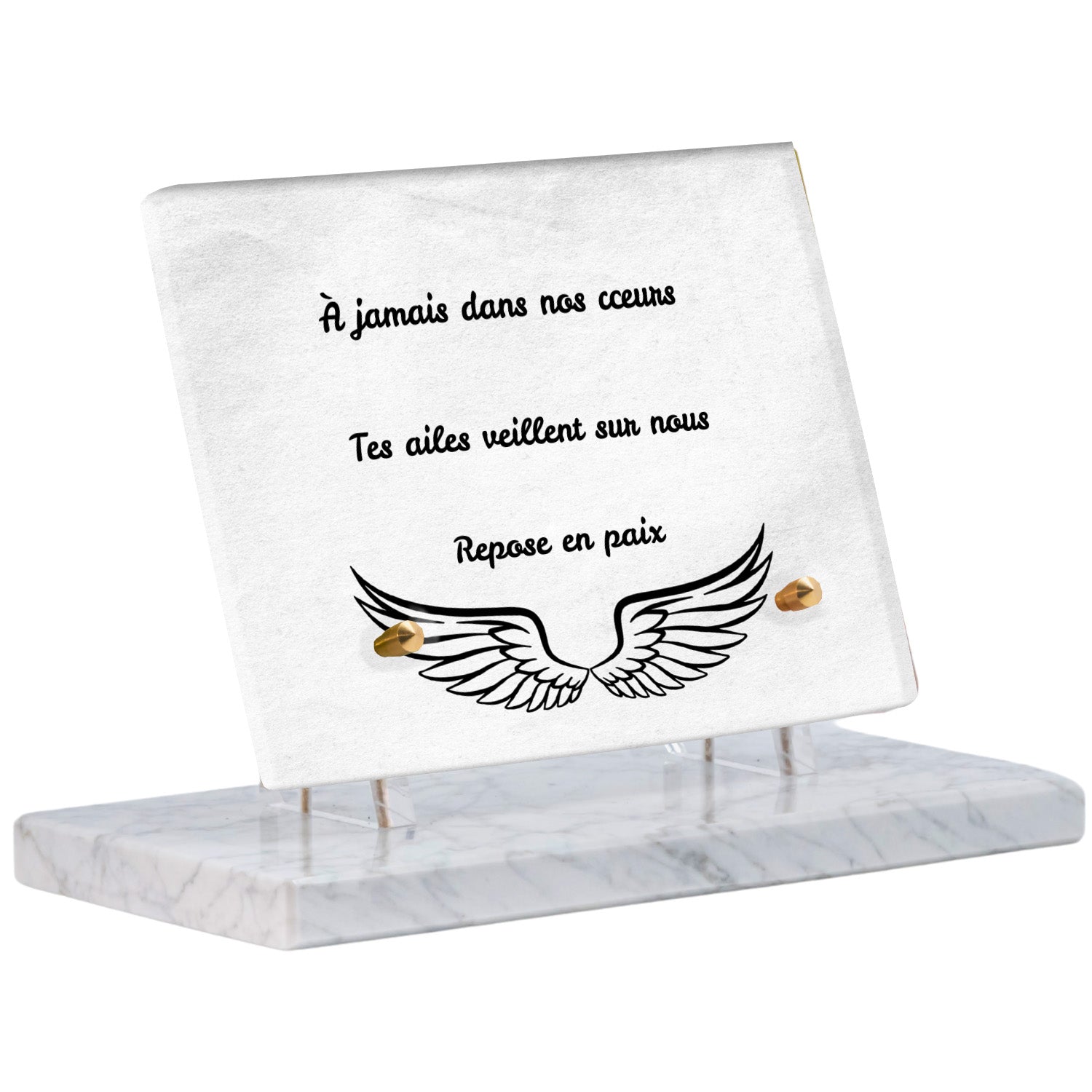 Notre plaque funéraire personnalisée « Ailes d'ange » allie design délicat et modernité. Cette plaque mortuaire, réalisée en plexiglas, présente une gravure élégante d'ailes d'ange qui symbolise la protection et la paix. Sa finition soignée en fait une plaque funéraire moderne, parfaite pour rendre hommage avec dignité.