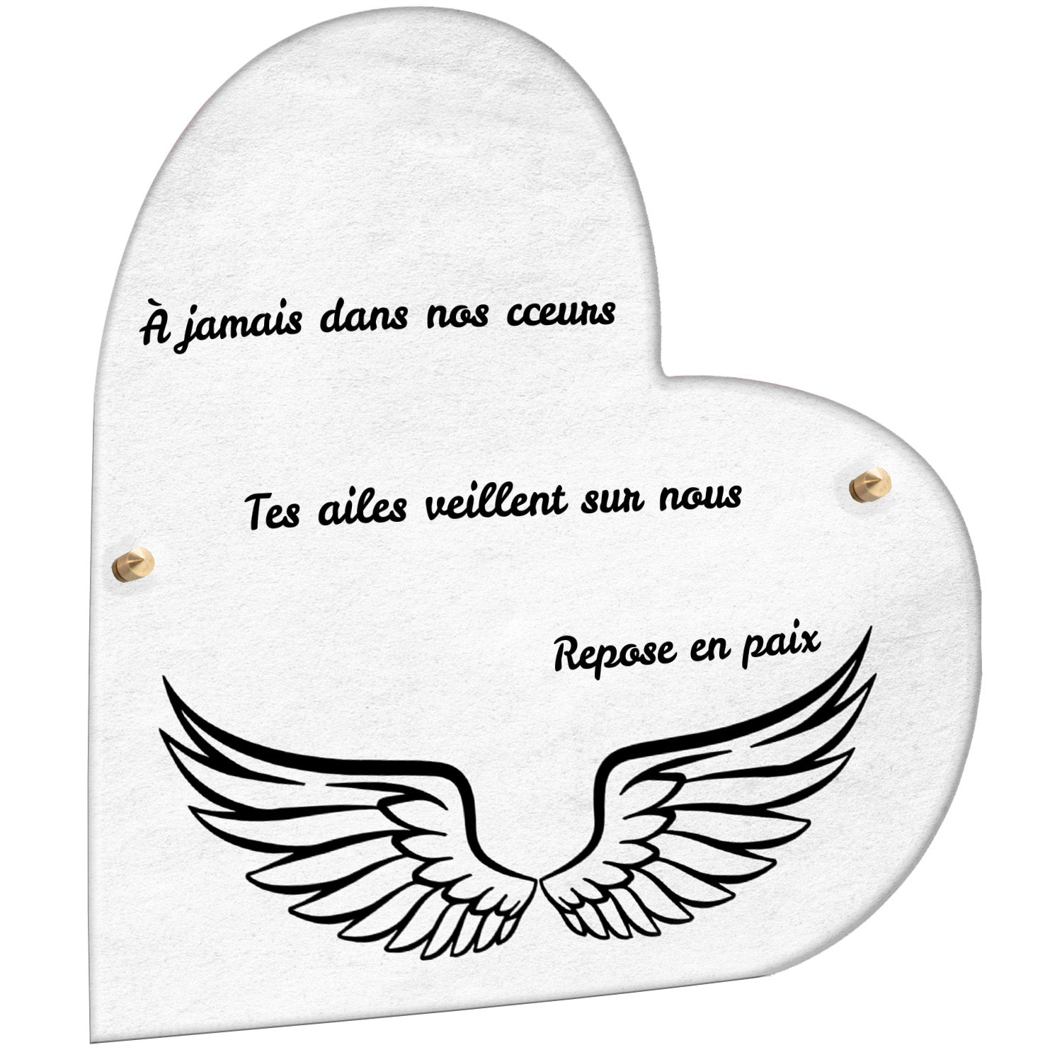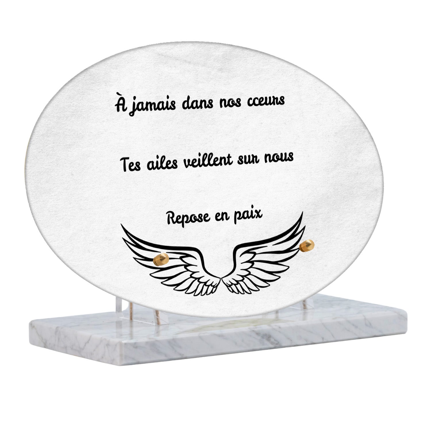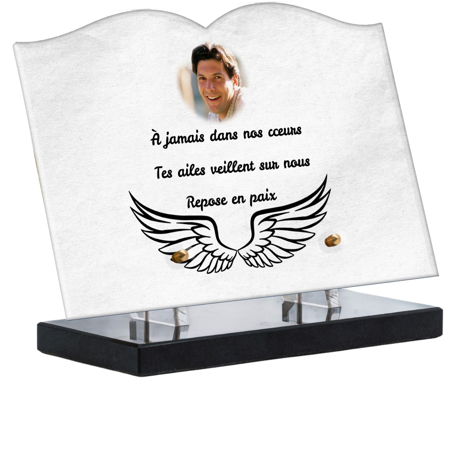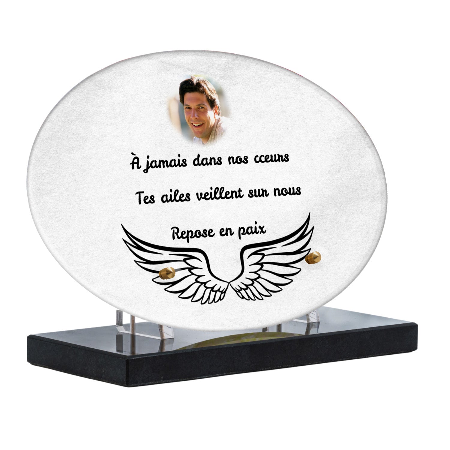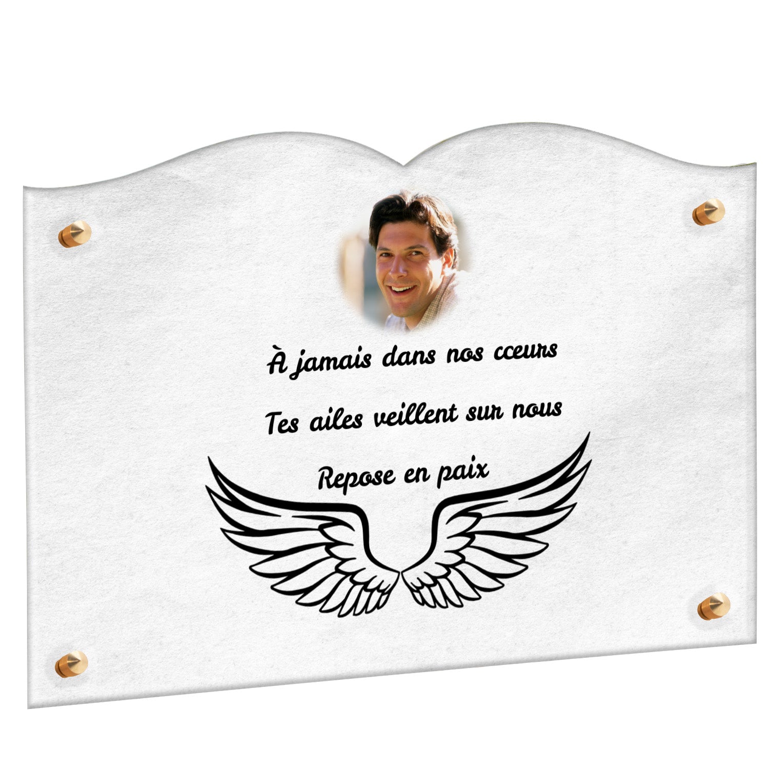Notre plaque funéraire personnalisée « Ailes d'ange » allie design délicat et modernité. Cette plaque mortuaire, réalisée en plexiglas, présente une gravure élégante d'ailes d'ange qui symbolise la protection et la paix. Sa finition soignée en fait une plaque funéraire moderne, parfaite pour rendre hommage avec dignité.