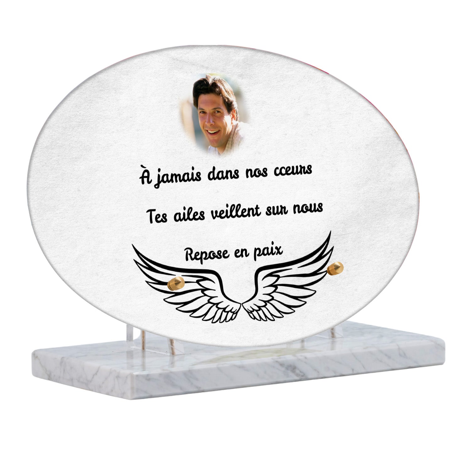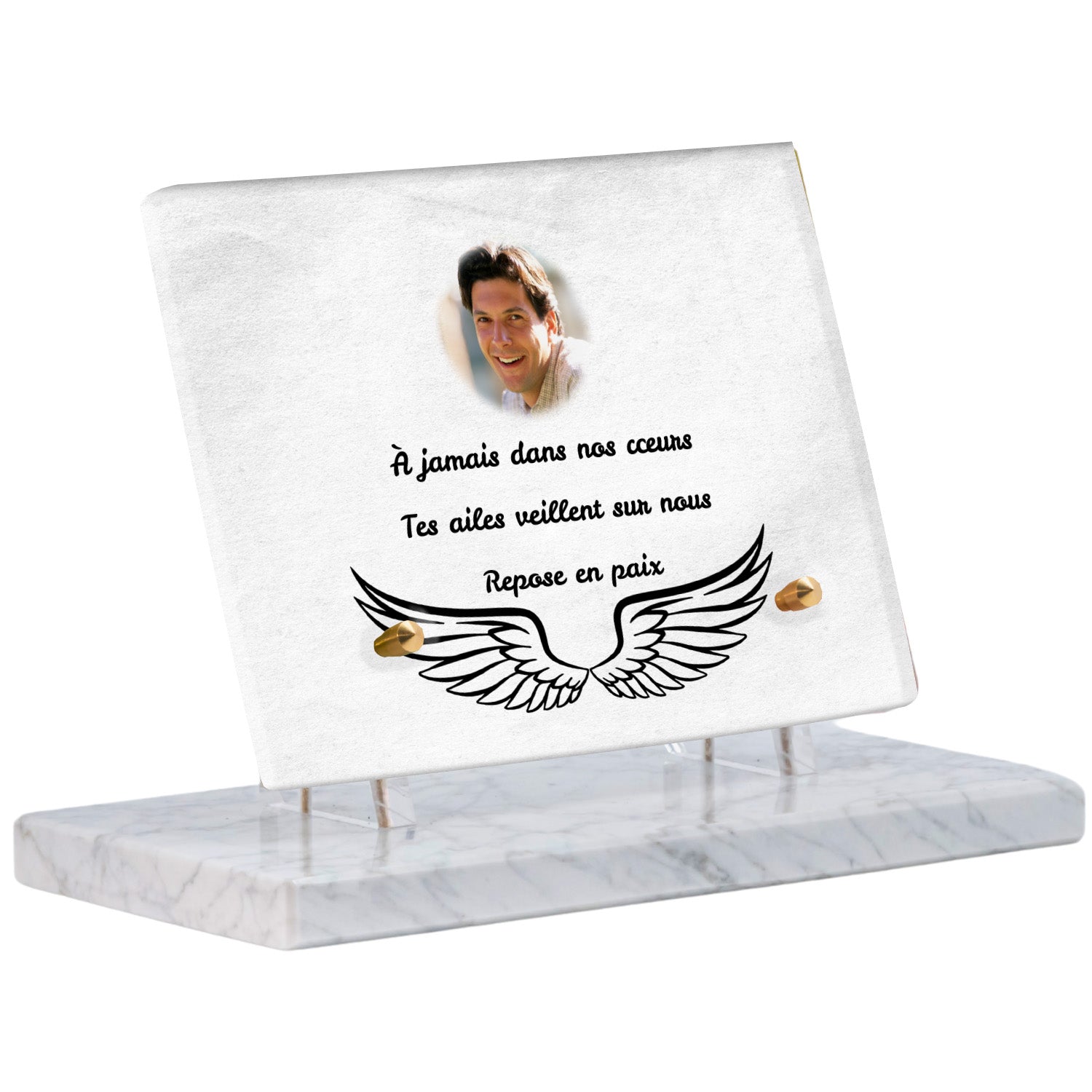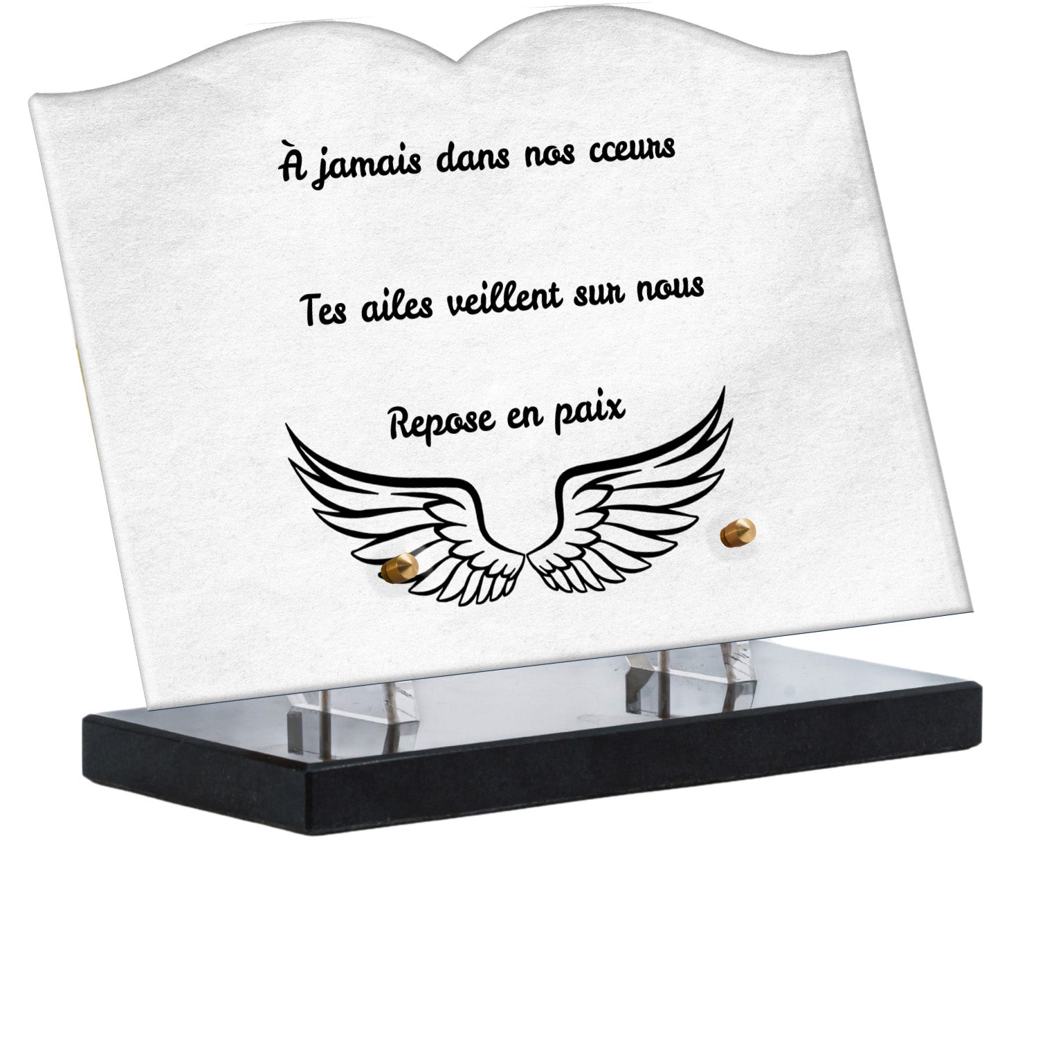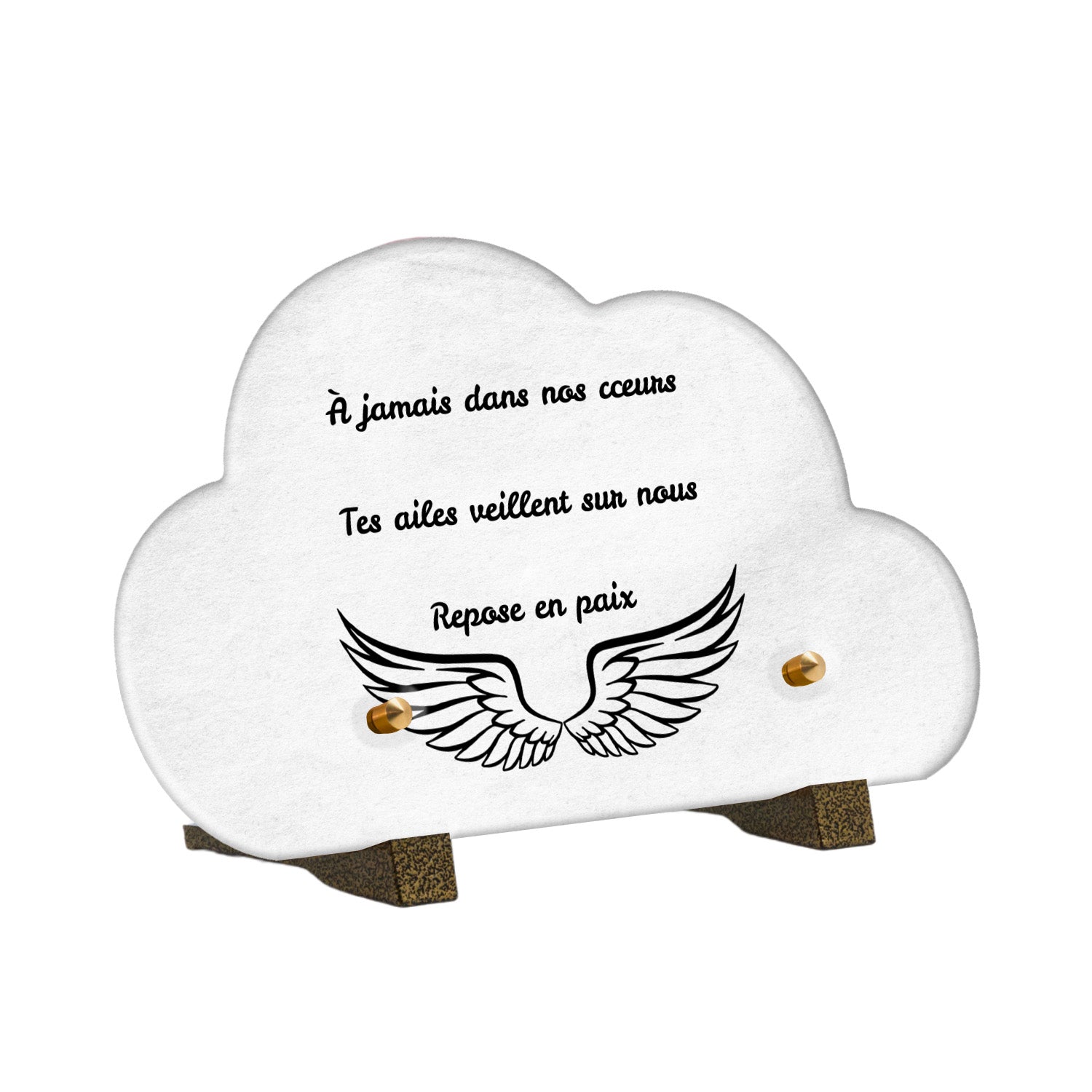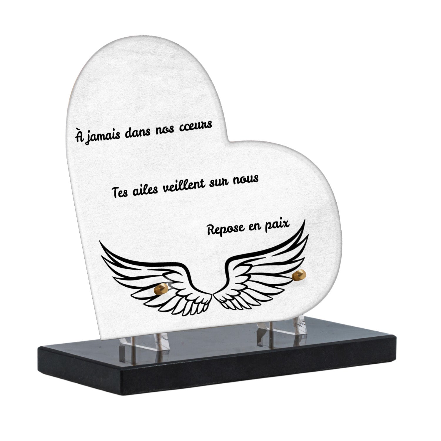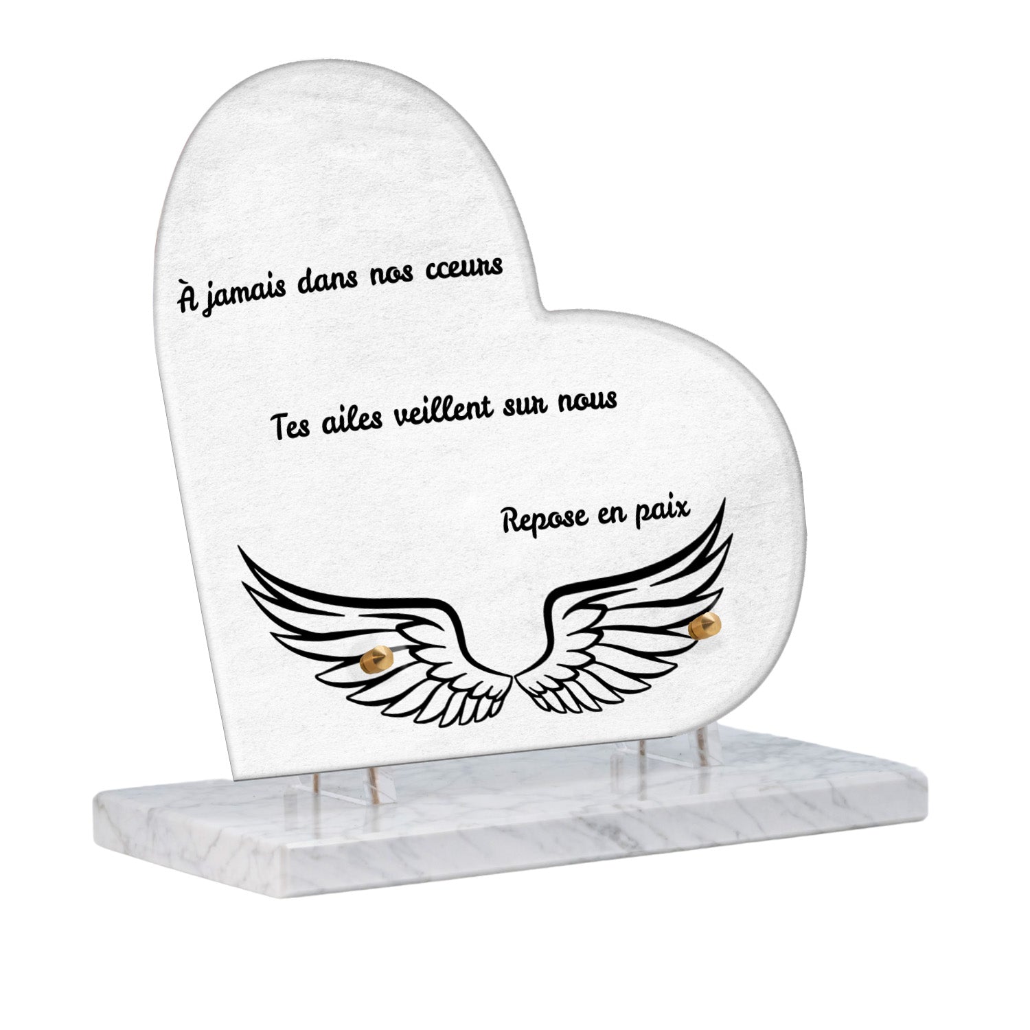 Notre plaque funéraire personnalisée « Ailes d'ange » allie design délicat et modernité. Cette plaque mortuaire, réalisée en plexiglas, présente une gravure élégante d'ailes d'ange qui symbolise la protection et la paix. Sa finition soignée en fait une plaque funéraire moderne, parfaite pour rendre hommage avec dignité.
