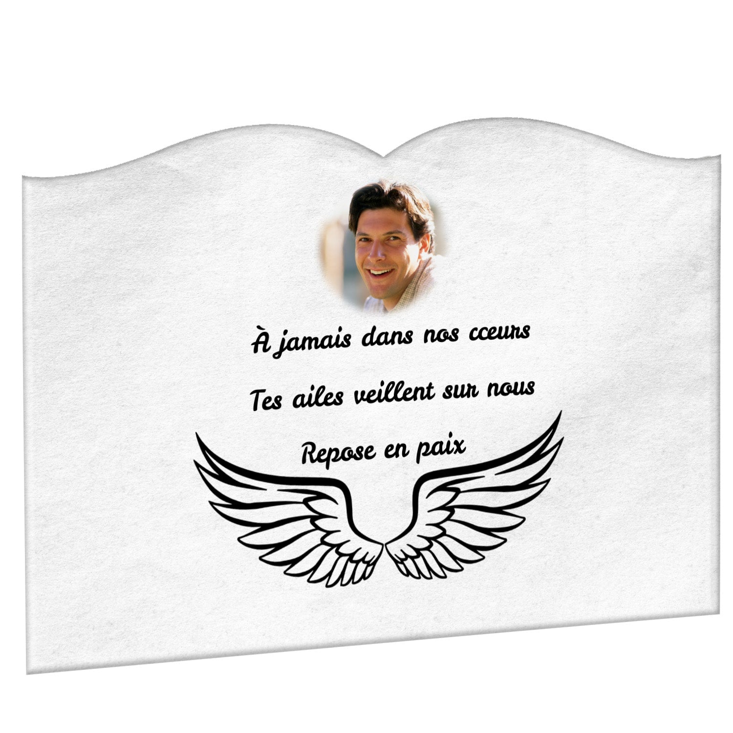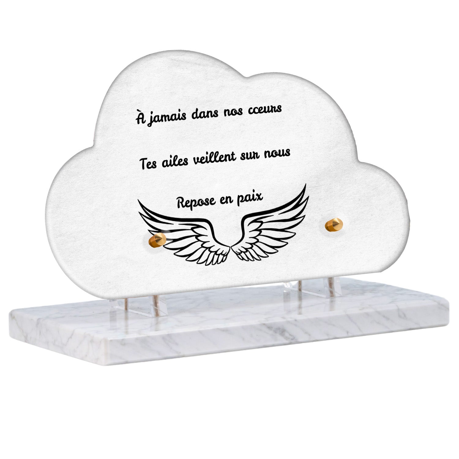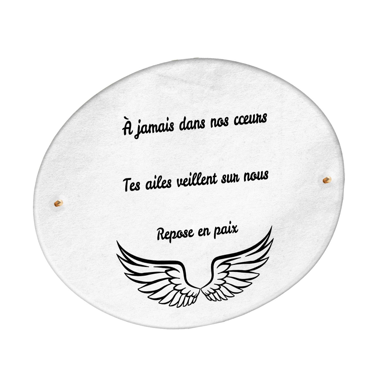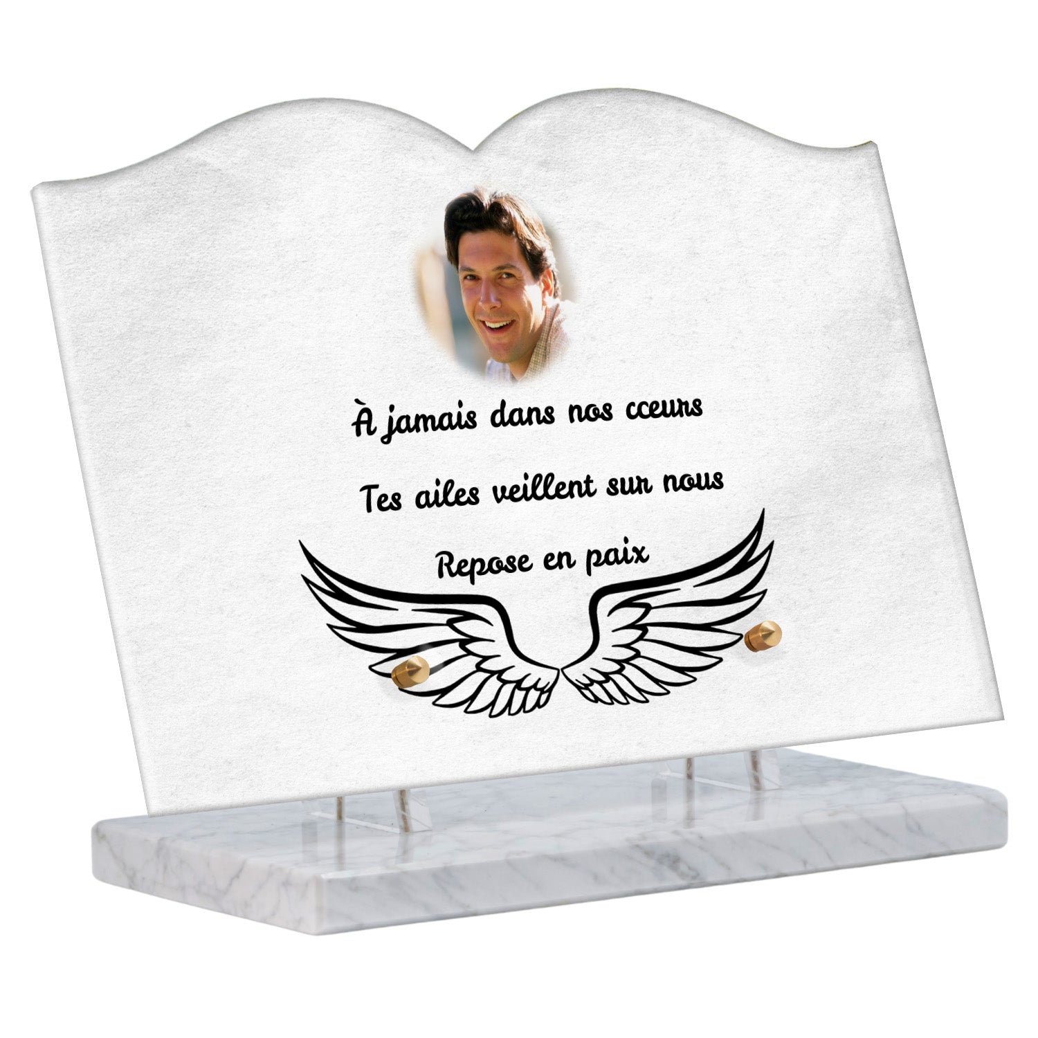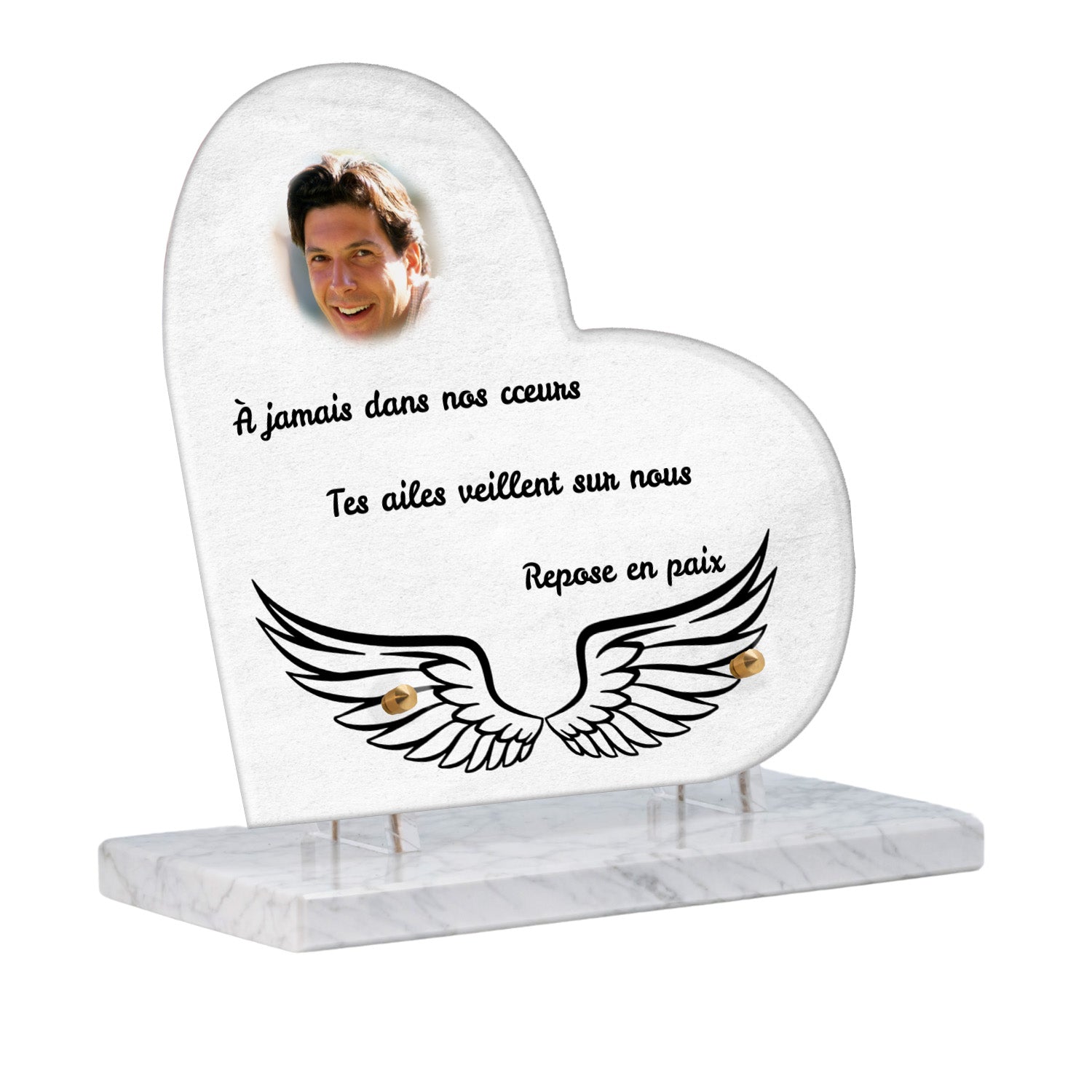 Notre plaque funéraire personnalisée « Ailes d'ange » allie design délicat et modernité. Cette plaque mortuaire, réalisée en plexiglas, présente une gravure élégante d'ailes d'ange qui symbolise la protection et la paix. Sa finition soignée en fait une plaque funéraire moderne, parfaite pour rendre hommage avec dignité.
