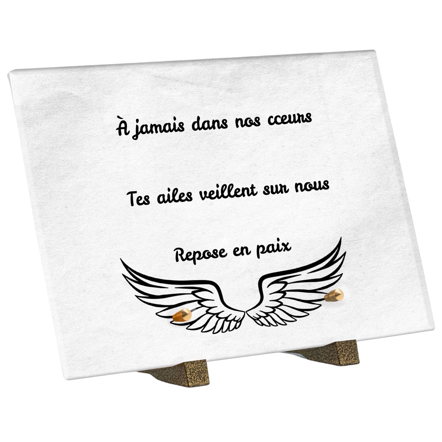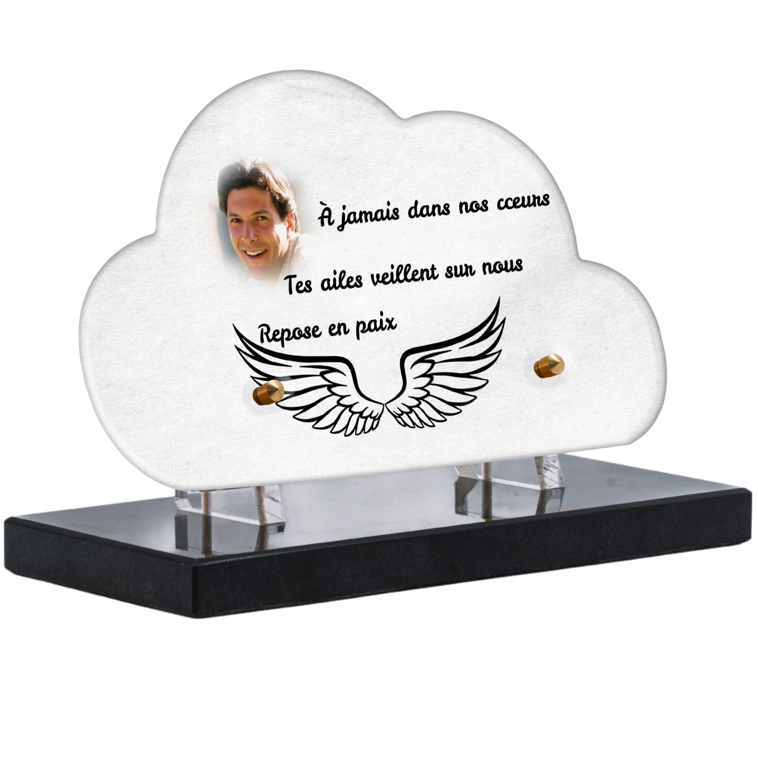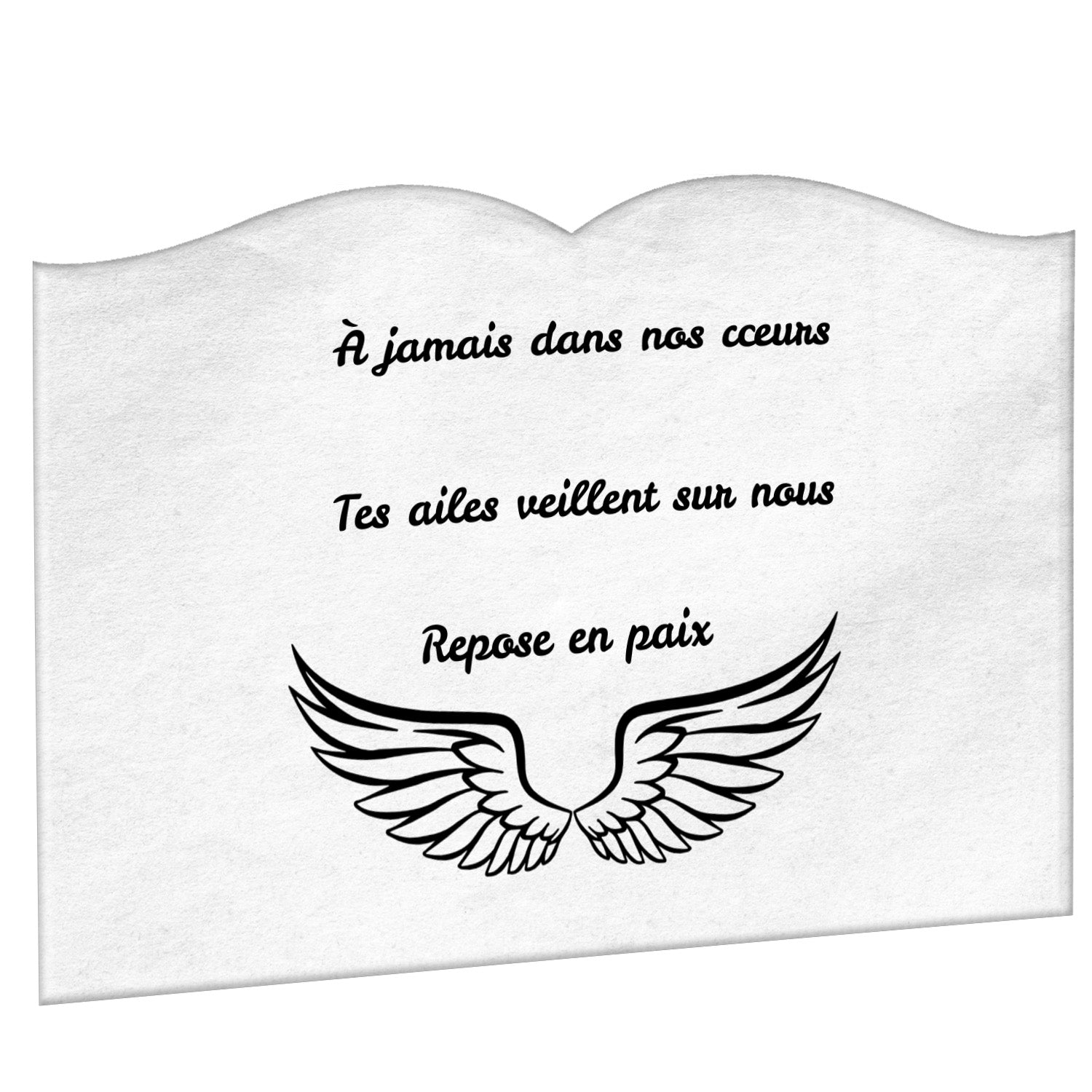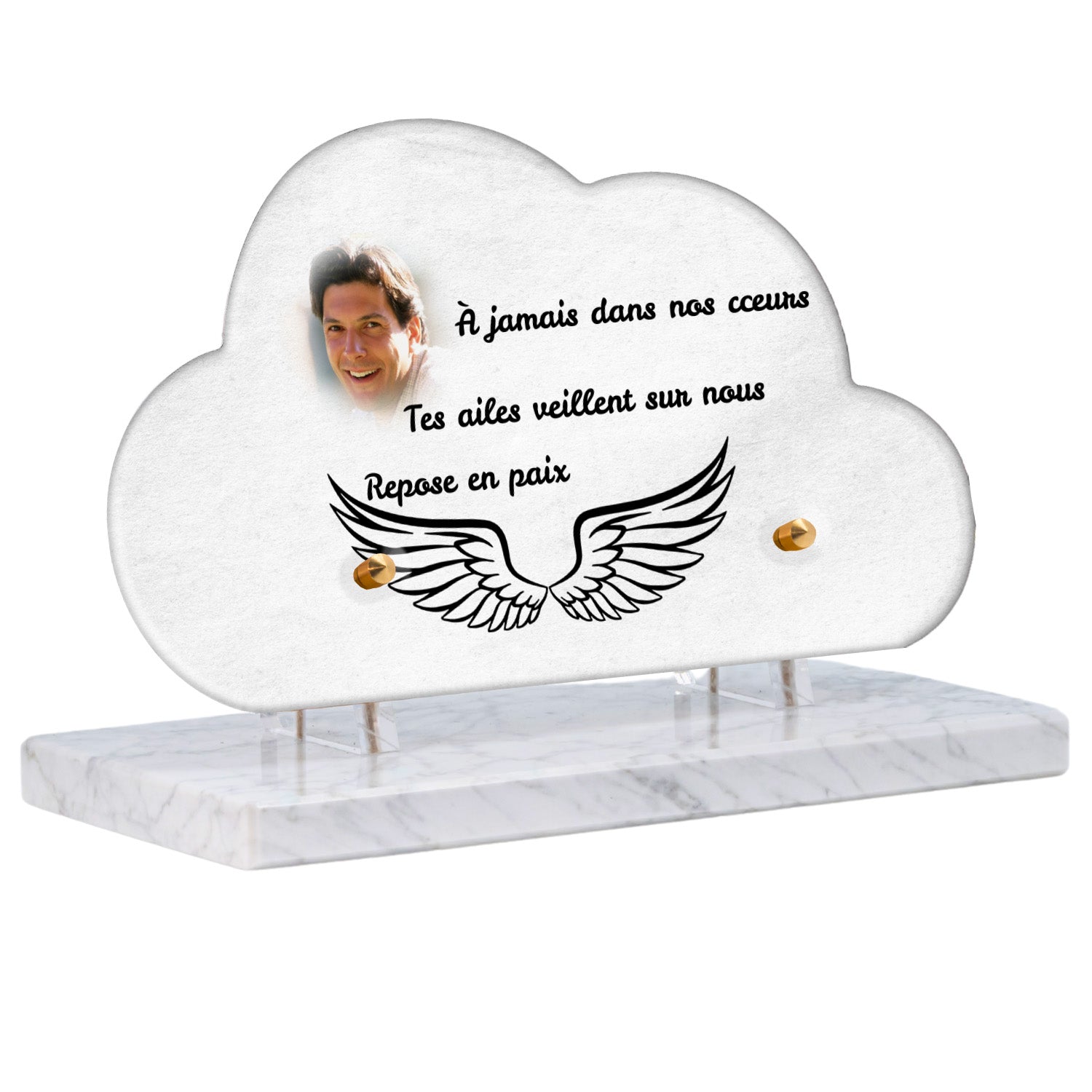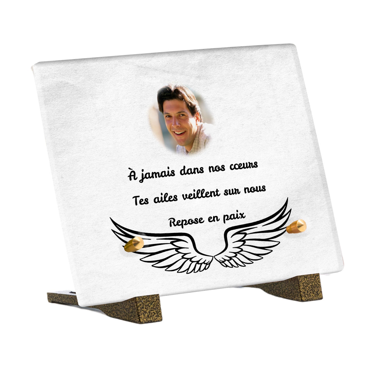 Notre plaque funéraire personnalisée « Ailes d'ange » allie design délicat et modernité. Cette plaque mortuaire, réalisée en plexiglas, présente une gravure élégante d'ailes d'ange qui symbolise la protection et la paix. Sa finition soignée en fait une plaque funéraire moderne, parfaite pour rendre hommage avec dignité.