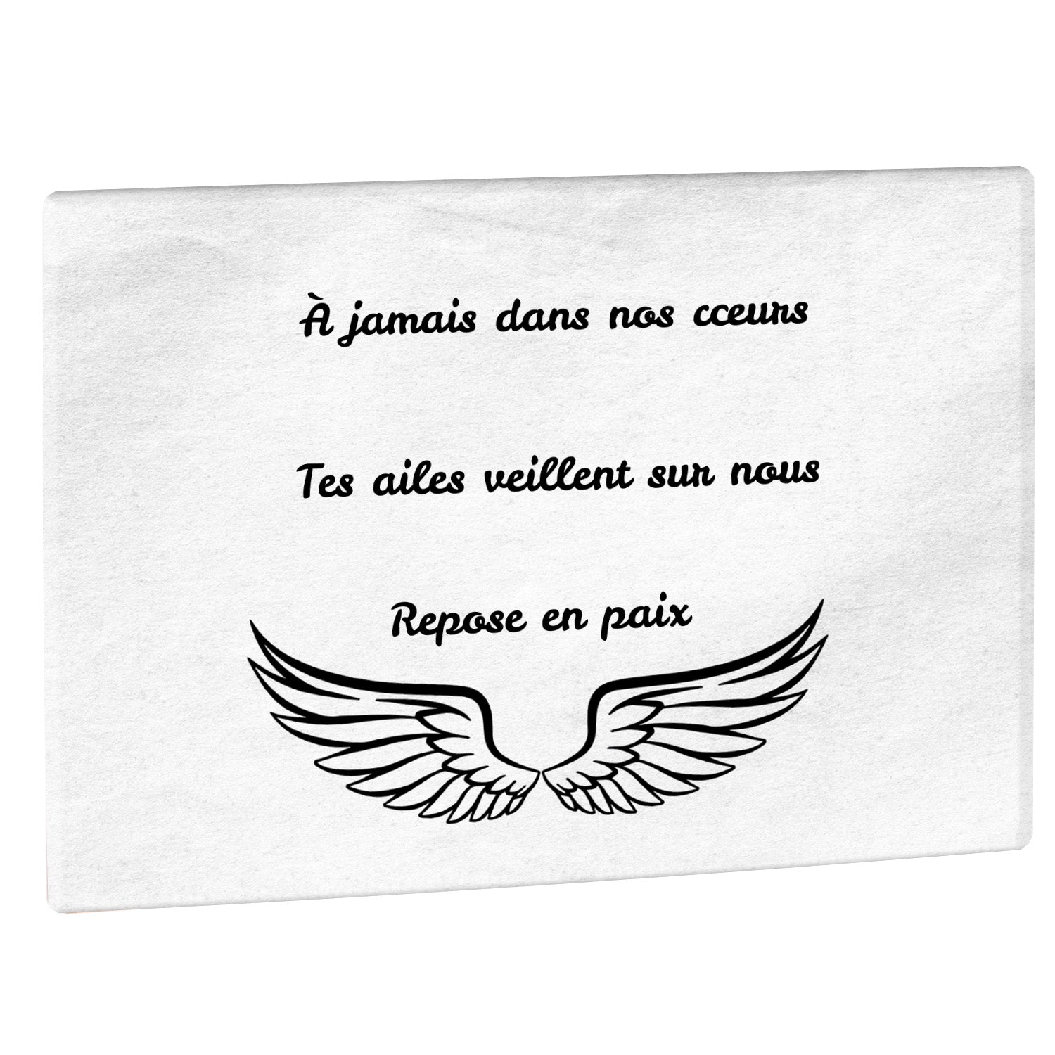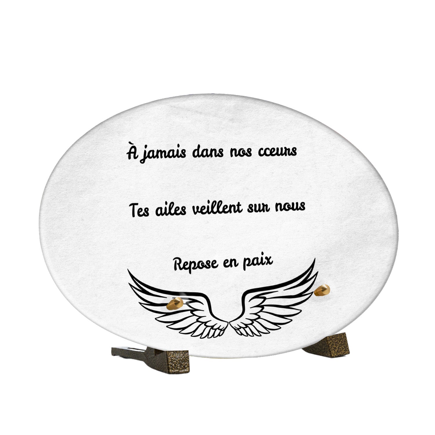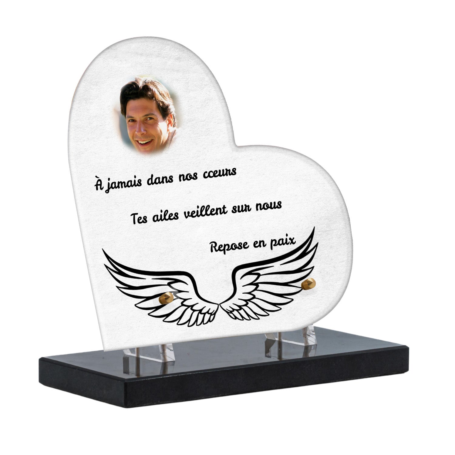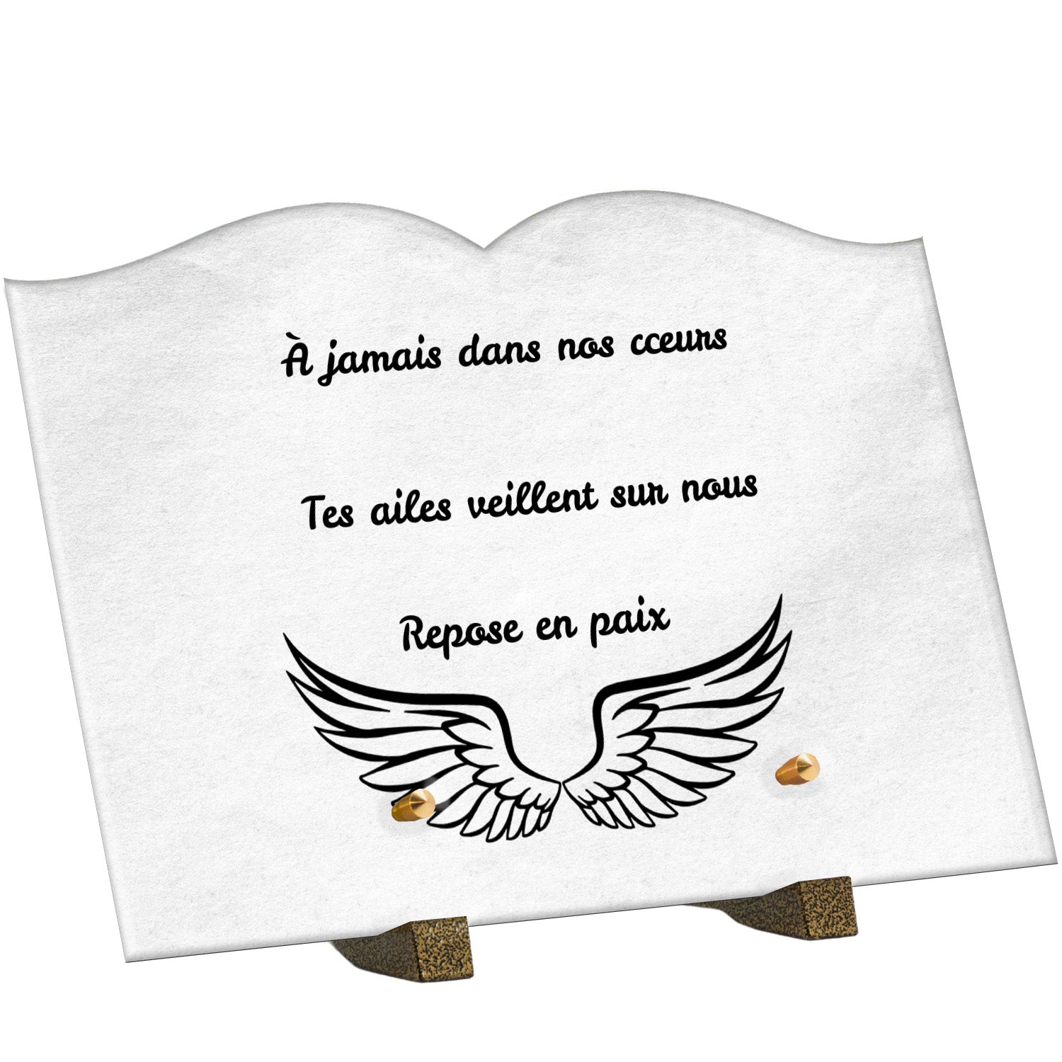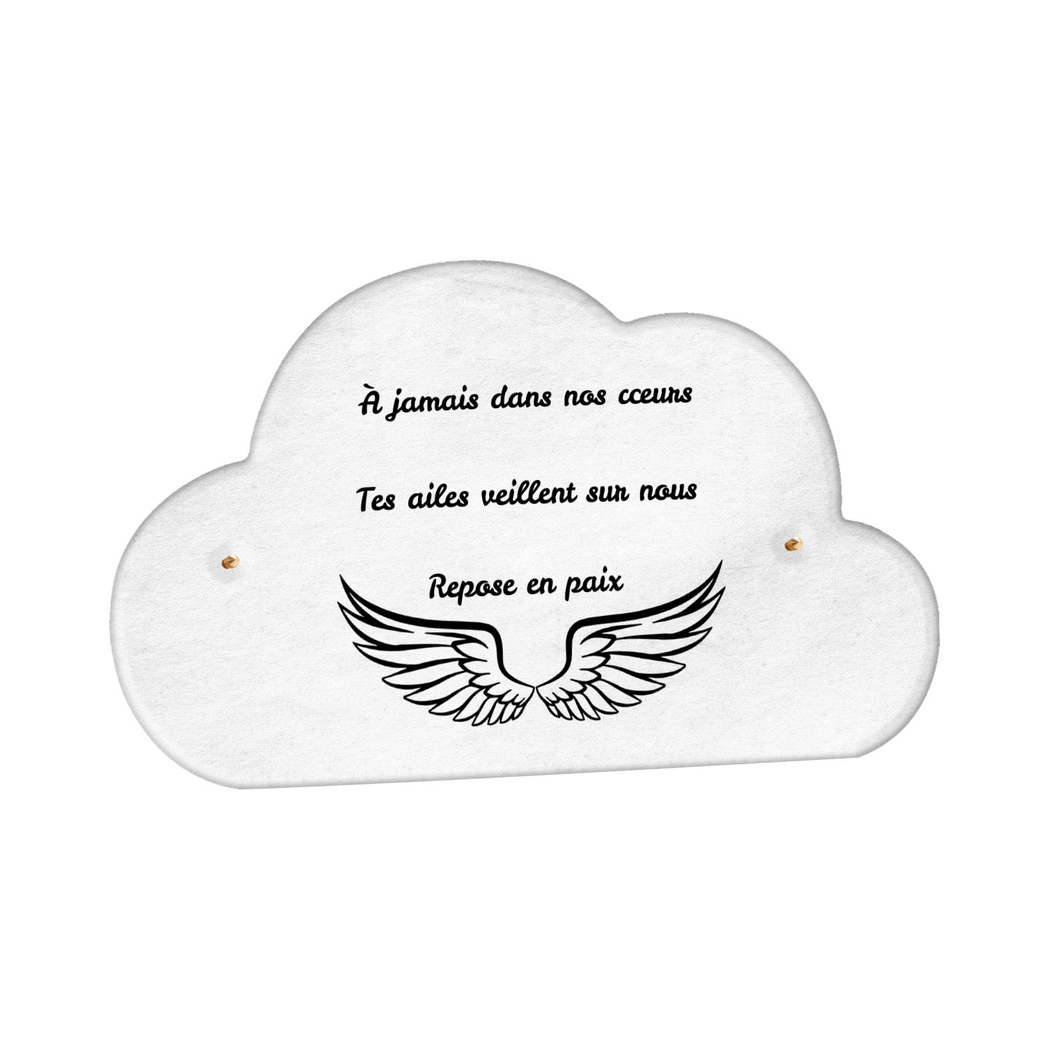 Notre plaque funéraire personnalisée « Ailes d'ange » allie design délicat et modernité. Cette plaque mortuaire, réalisée en plexiglas, présente une gravure élégante d'ailes d'ange qui symbolise la protection et la paix. Sa finition soignée en fait une plaque funéraire moderne, parfaite pour rendre hommage avec dignité.