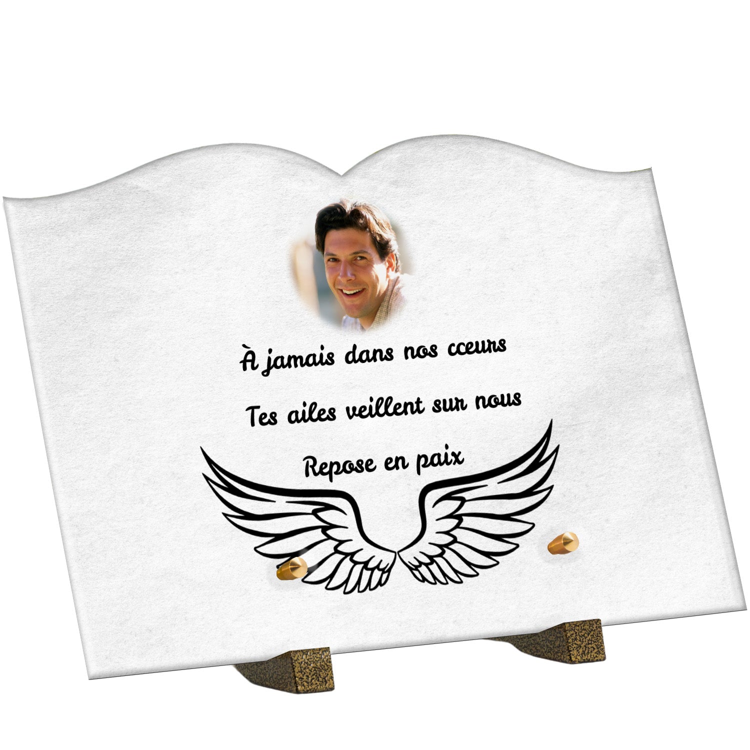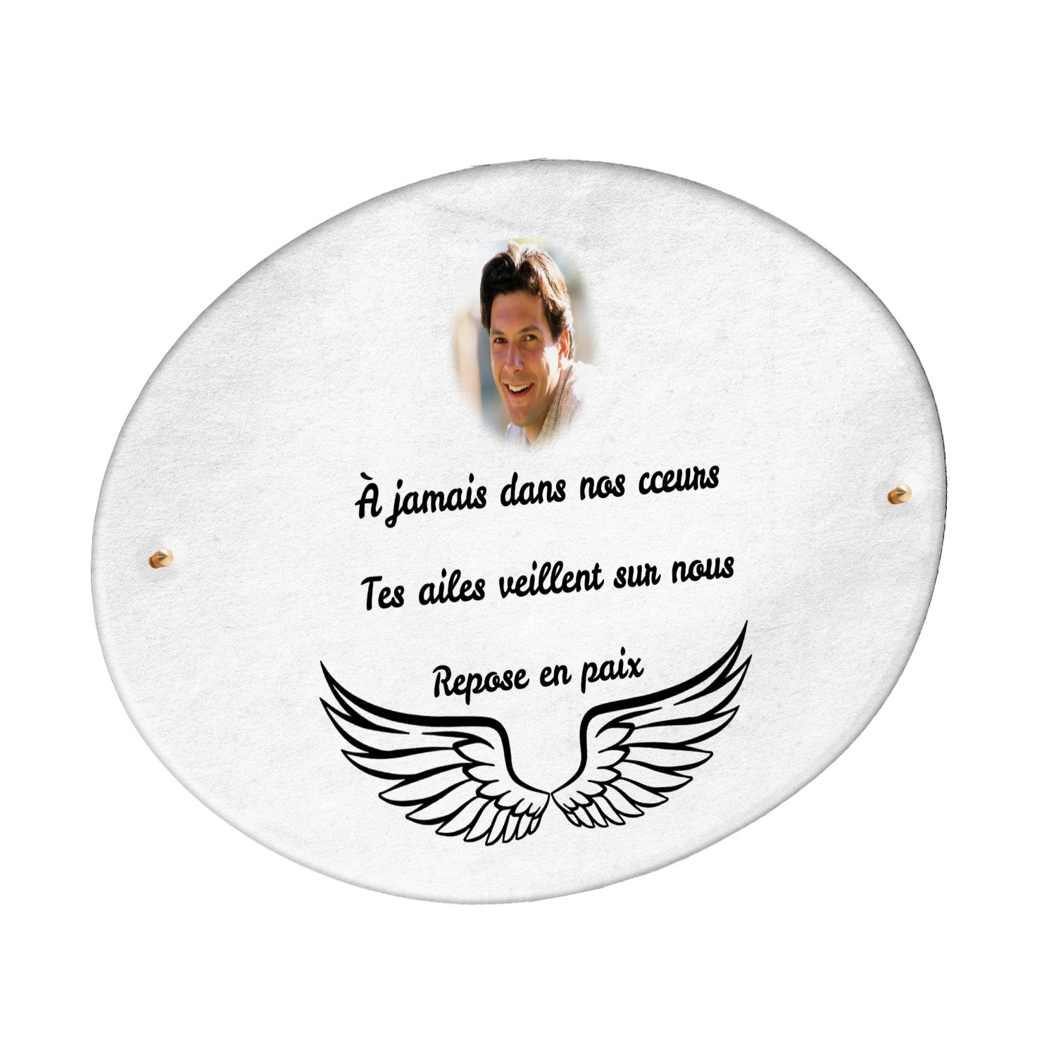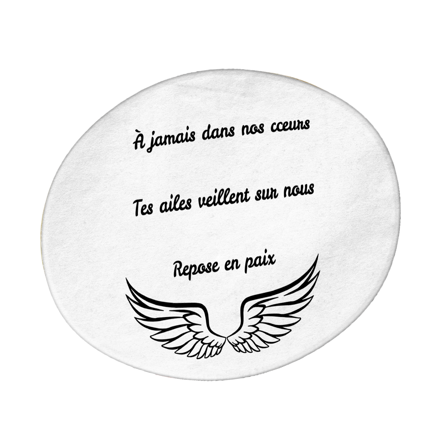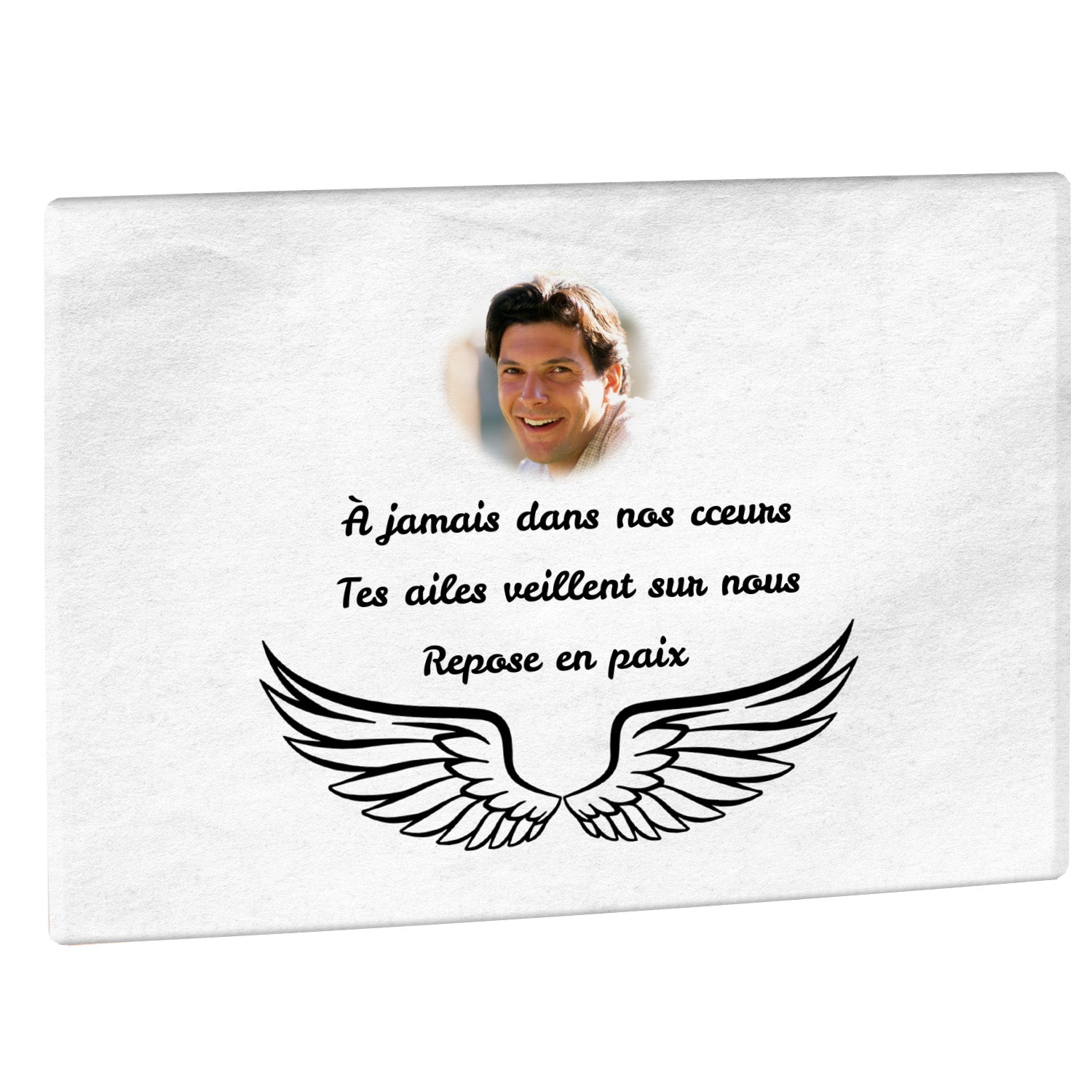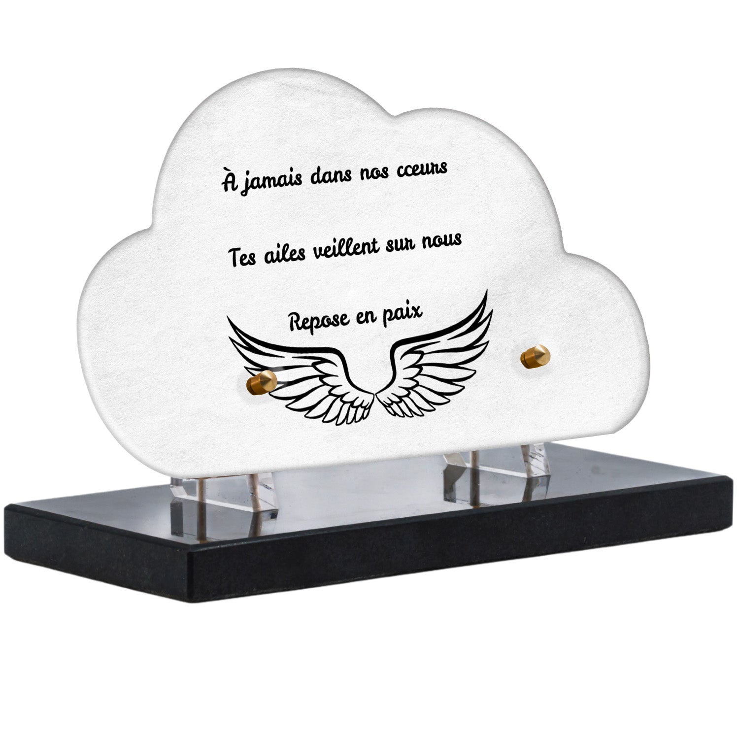Notre plaque funéraire personnalisée « Ailes d'ange » allie design délicat et modernité. Cette plaque mortuaire, réalisée en plexiglas, présente une gravure élégante d'ailes d'ange qui symbolise la protection et la paix. Sa finition soignée en fait une plaque funéraire moderne, parfaite pour rendre hommage avec dignité.
