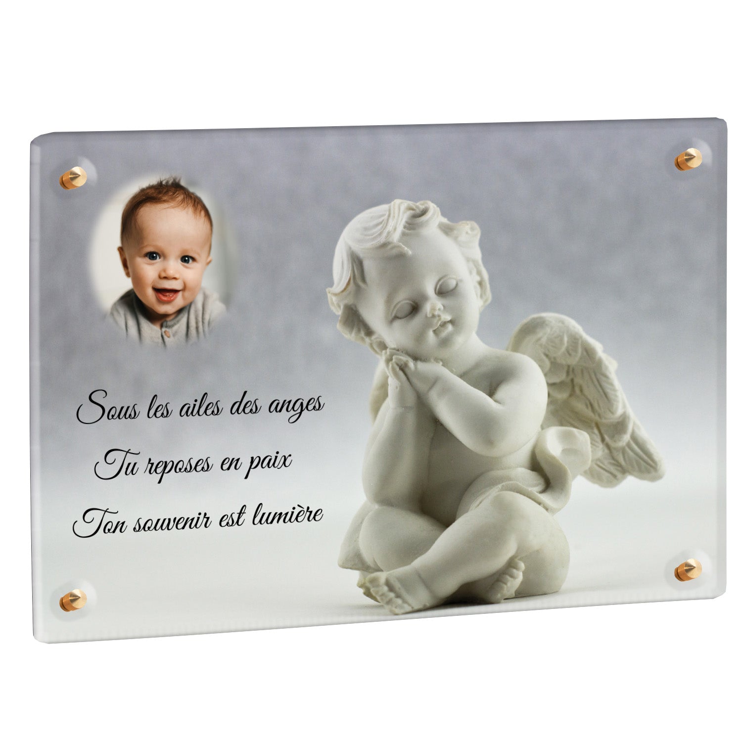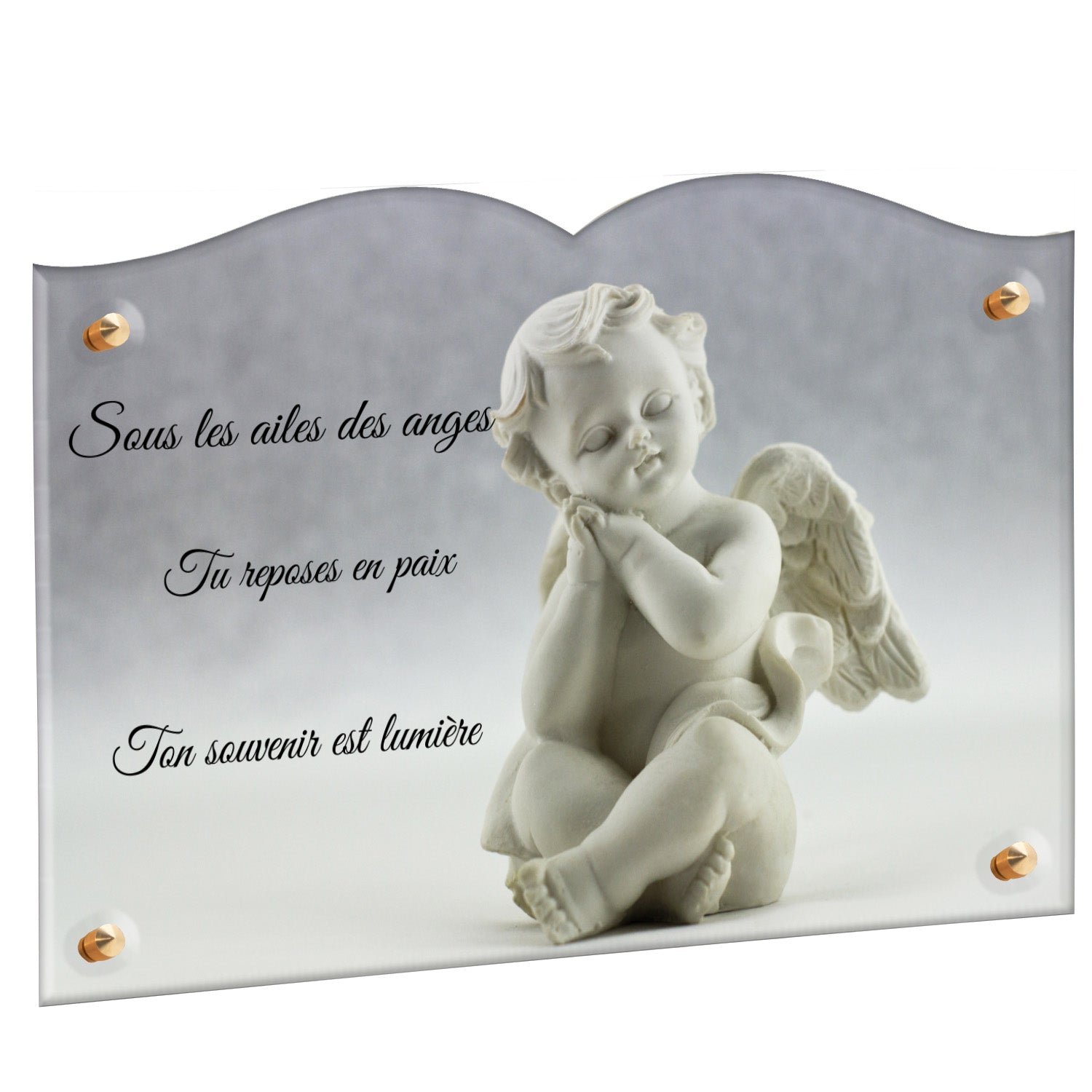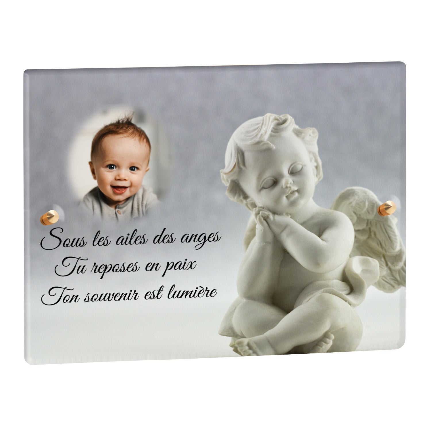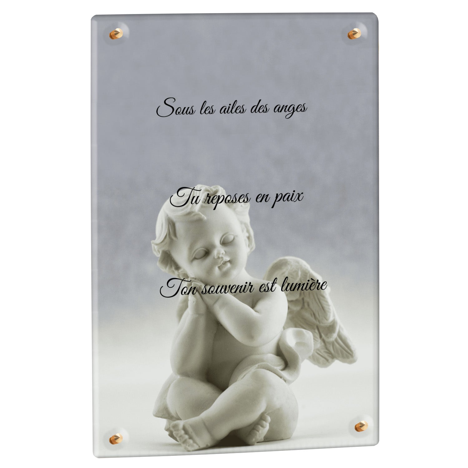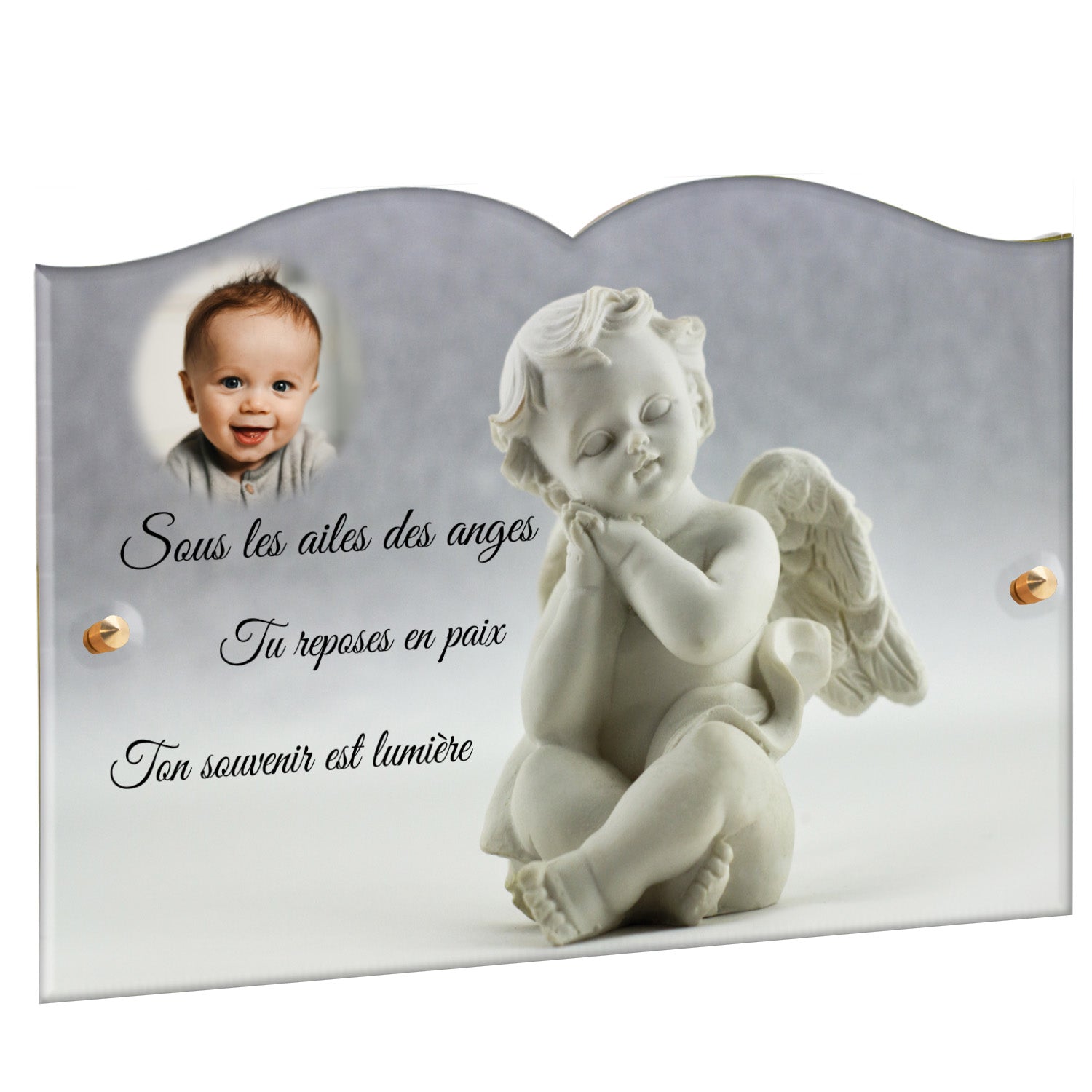 Cette plaque funéraire personnalisée présente un motif délicat d’ange, symbole de paix et de protection, offrant un hommage plein de douceur et de sérénité. Réalisée en plexiglas, cette plaque funéraire moderne combine élégance et résistance, parfaite pour une plaque mortuaire qui sublime la mémoire de vos proches.