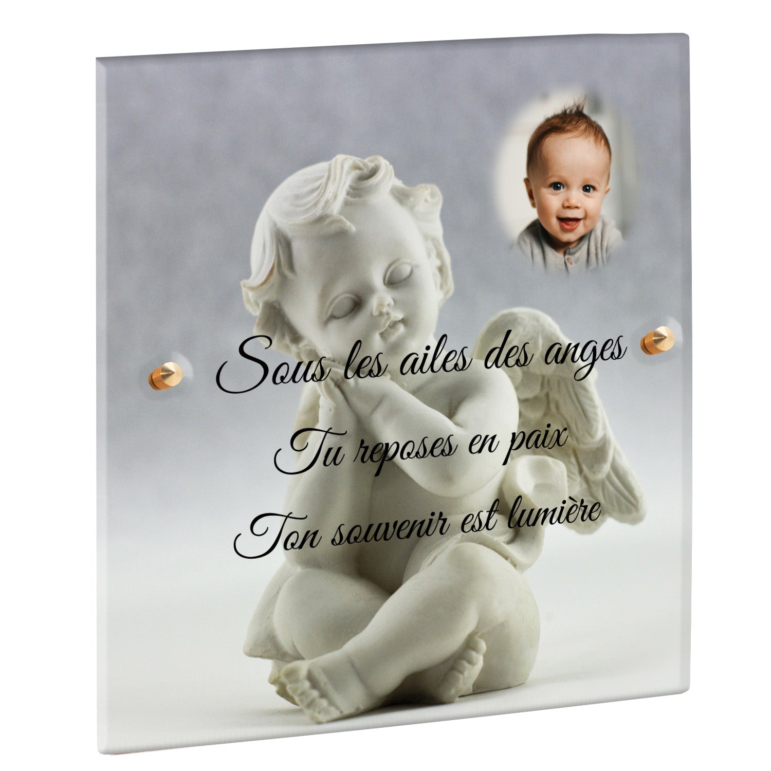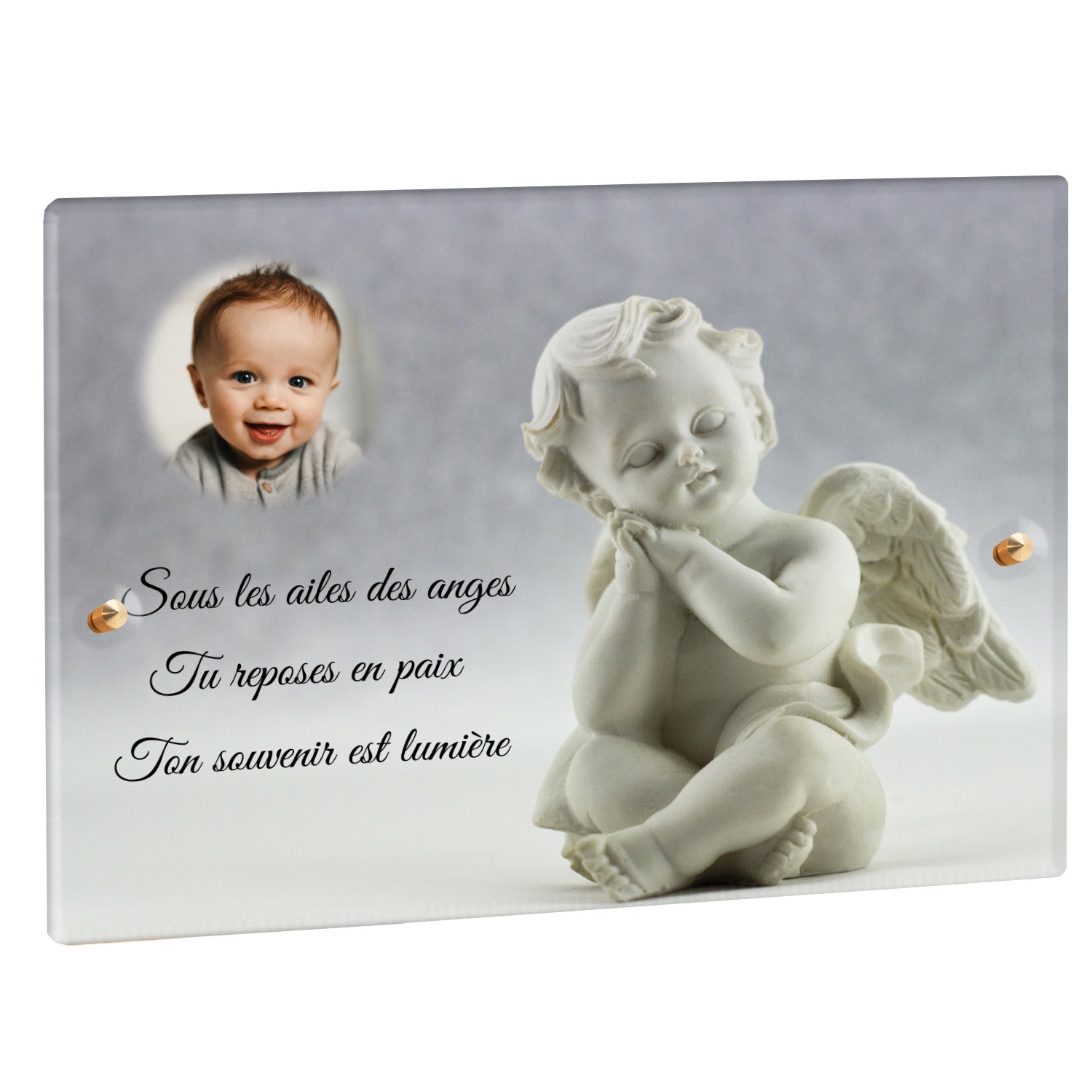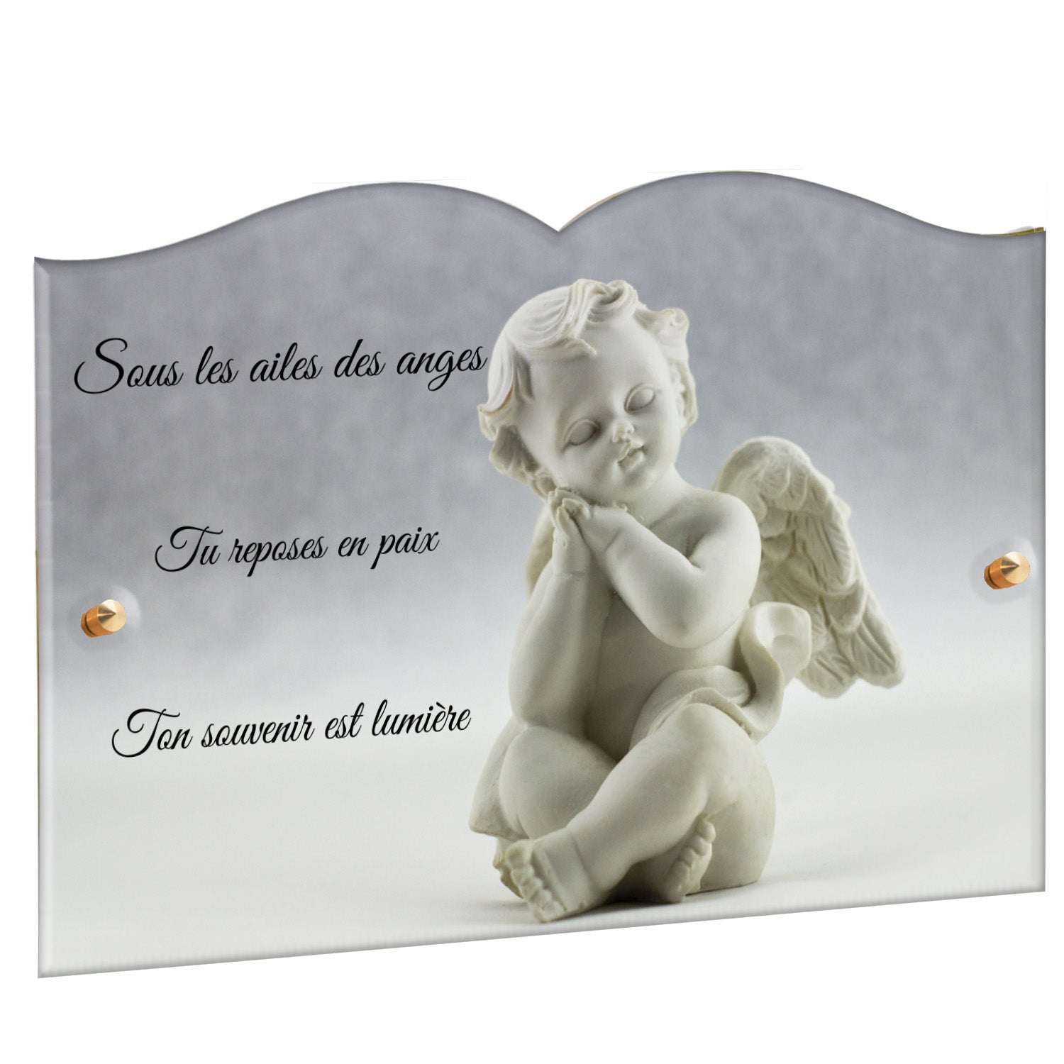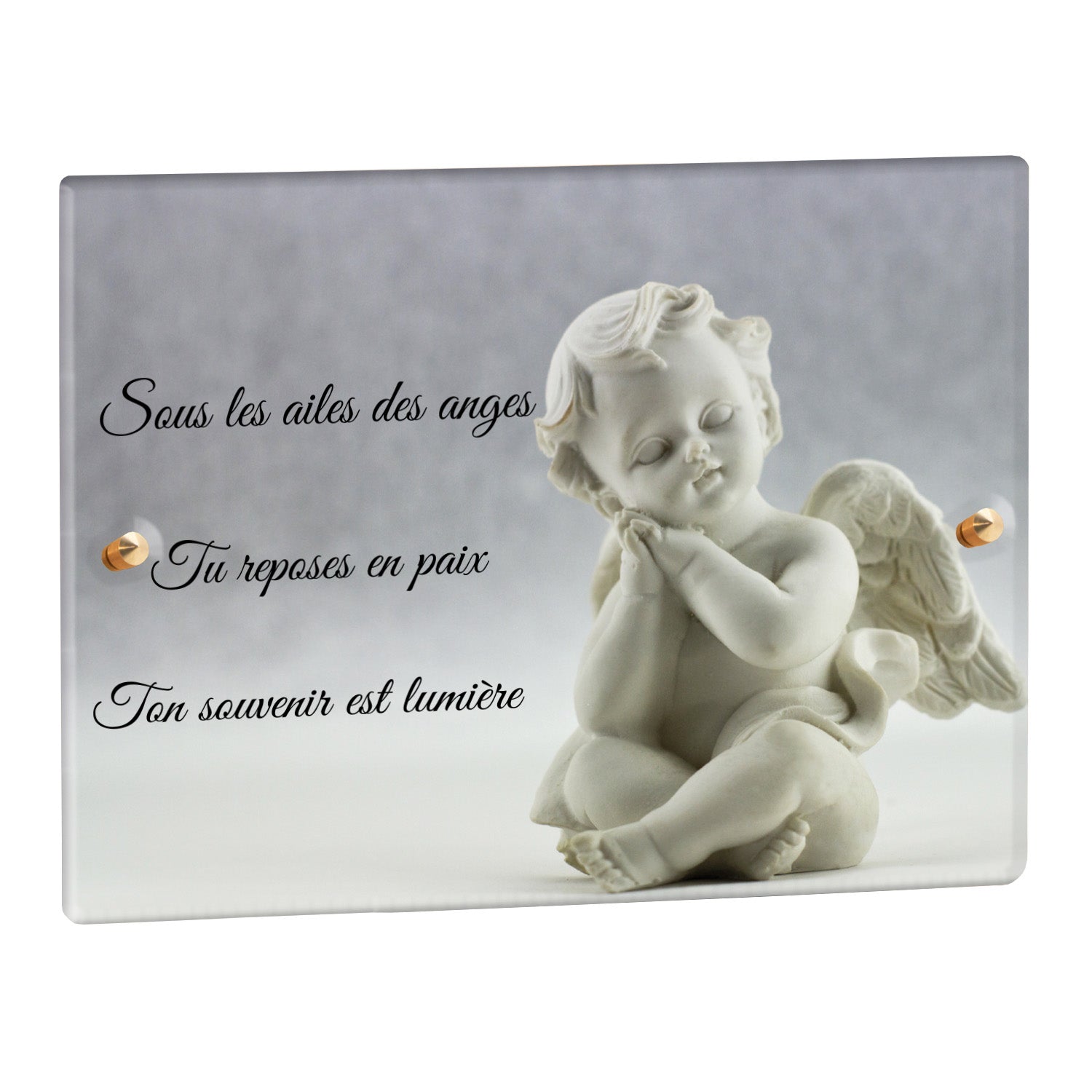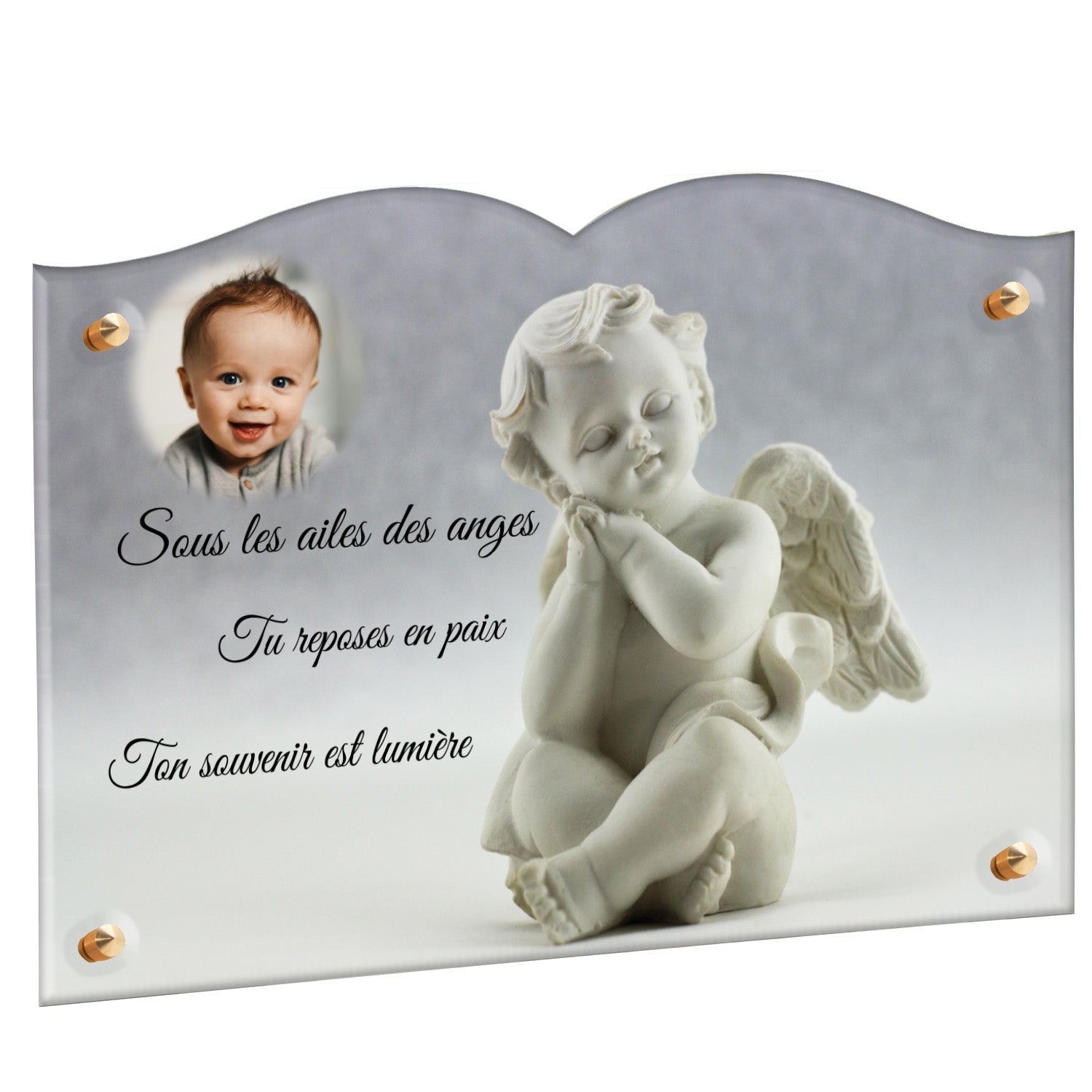 Cette plaque funéraire personnalisée présente un motif délicat d’ange, symbole de paix et de protection, offrant un hommage plein de douceur et de sérénité. Réalisée en plexiglas, cette plaque funéraire moderne combine élégance et résistance, parfaite pour une plaque mortuaire qui sublime la mémoire de vos proches.