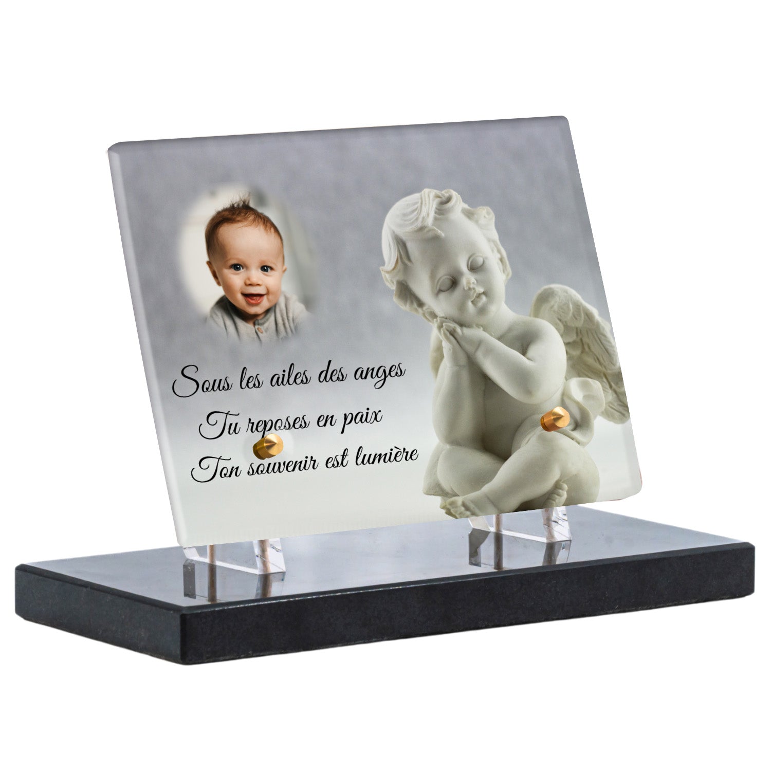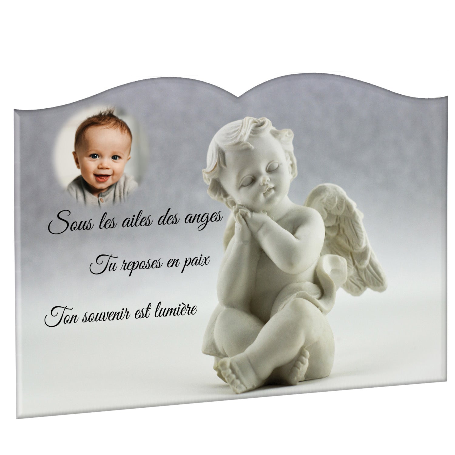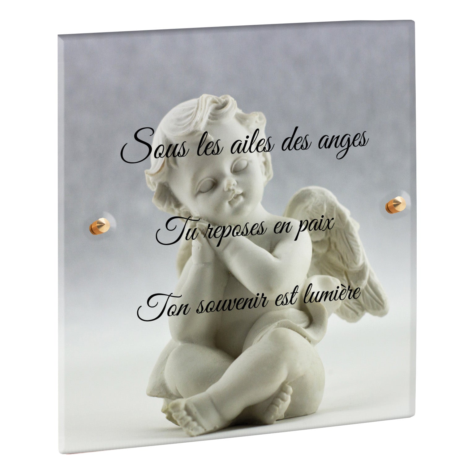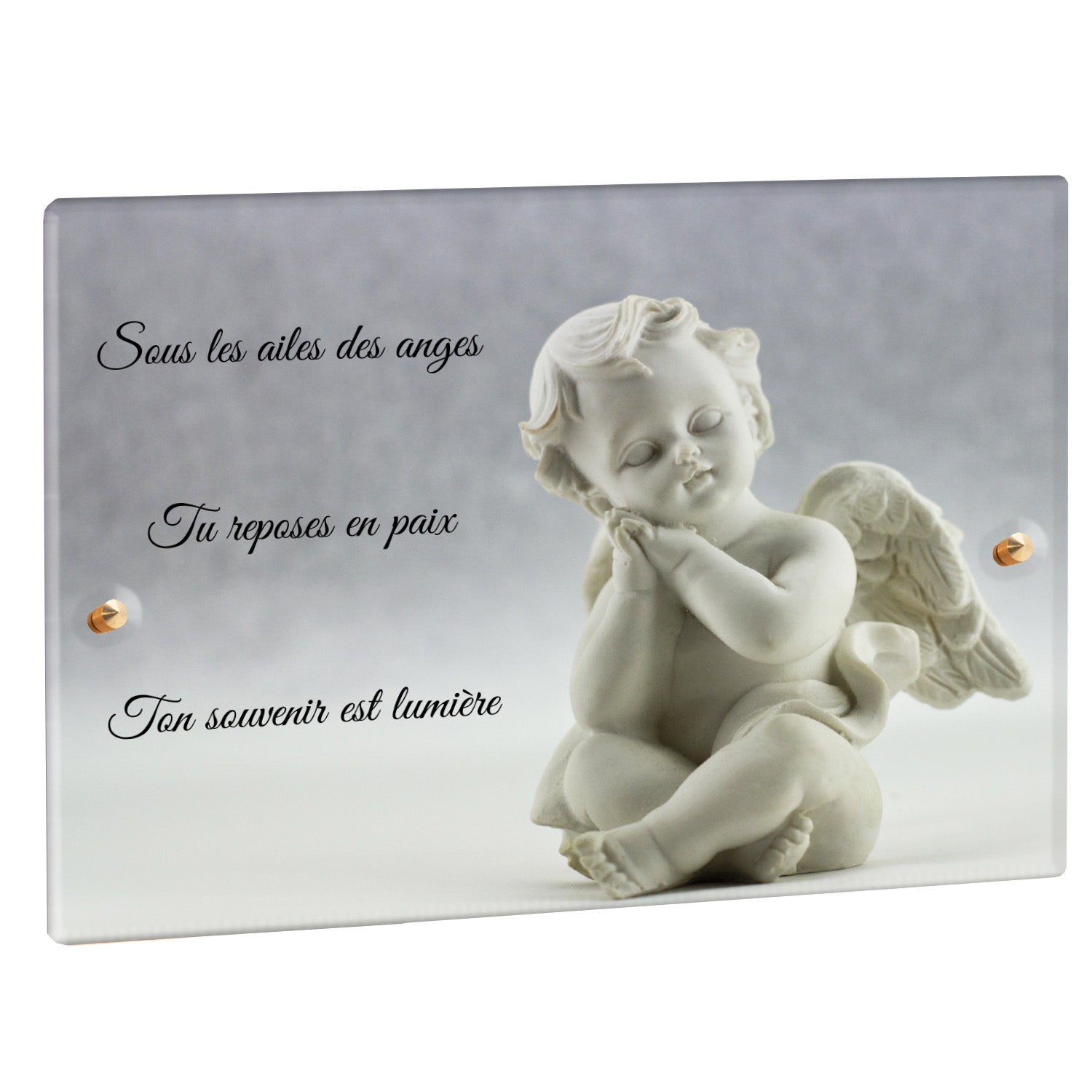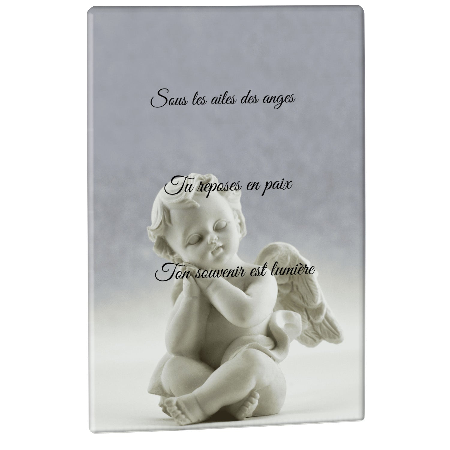 Cette plaque funéraire personnalisée présente un motif délicat d’ange, symbole de paix et de protection, offrant un hommage plein de douceur et de sérénité. Réalisée en plexiglas, cette plaque funéraire moderne combine élégance et résistance, parfaite pour une plaque mortuaire qui sublime la mémoire de vos proches.