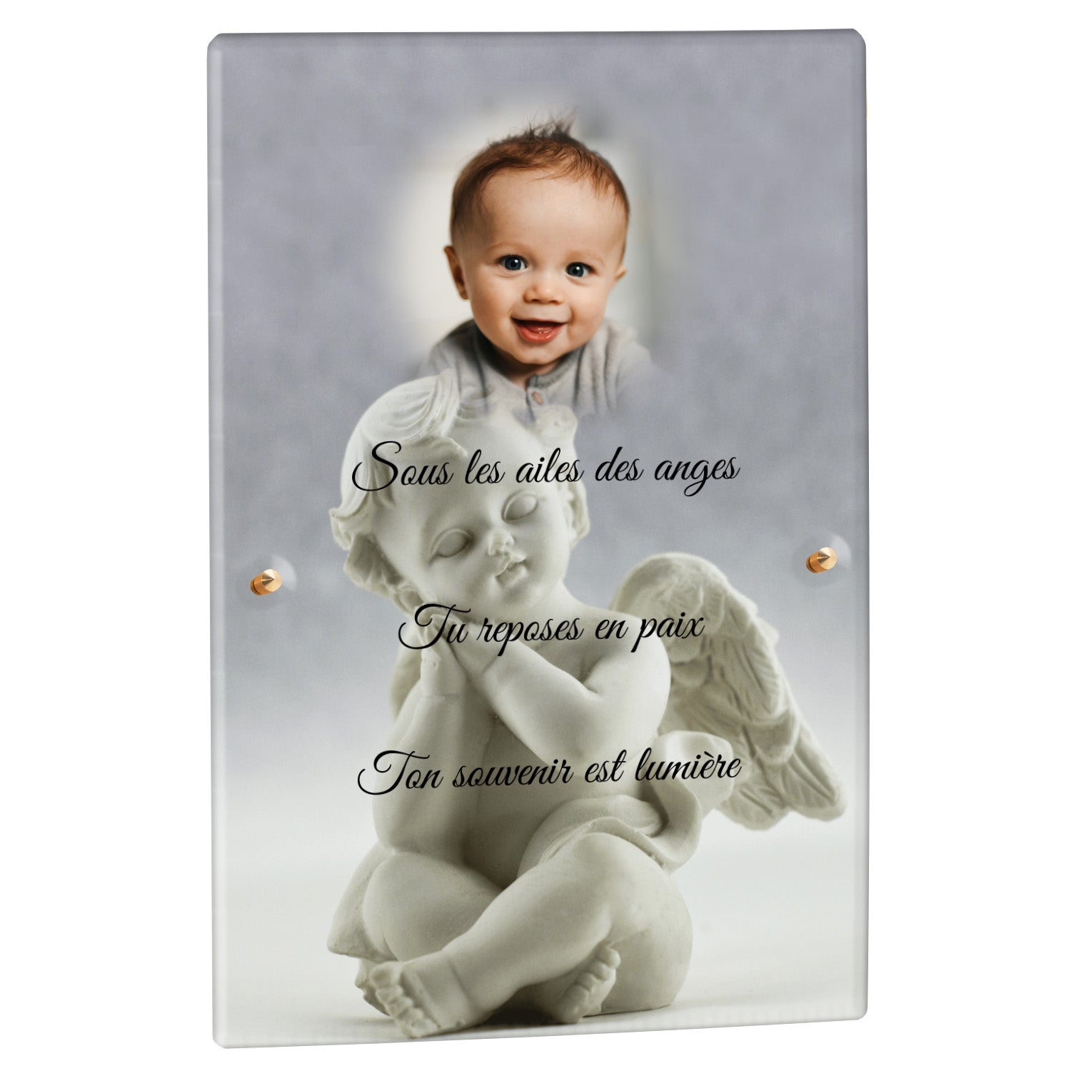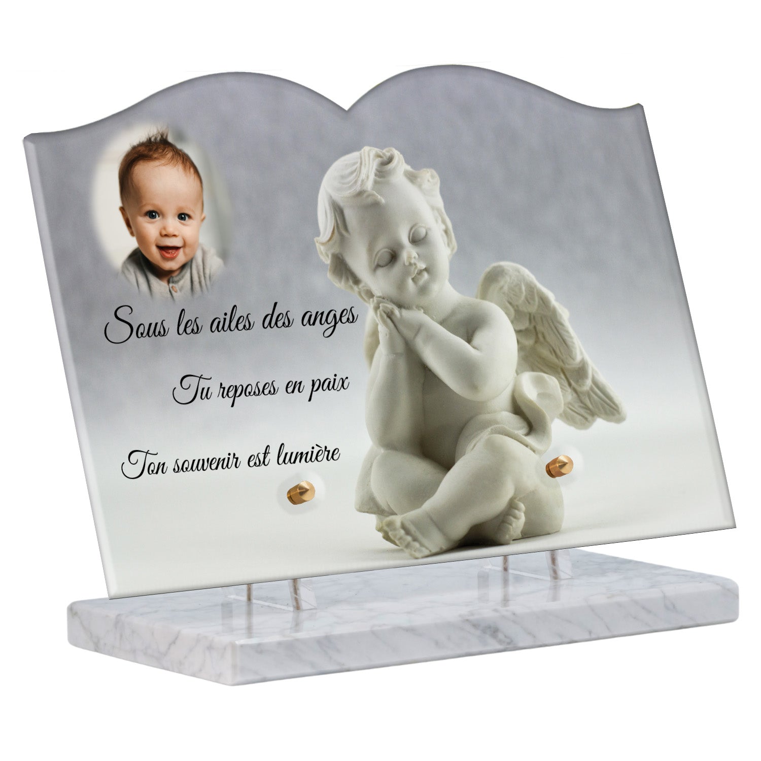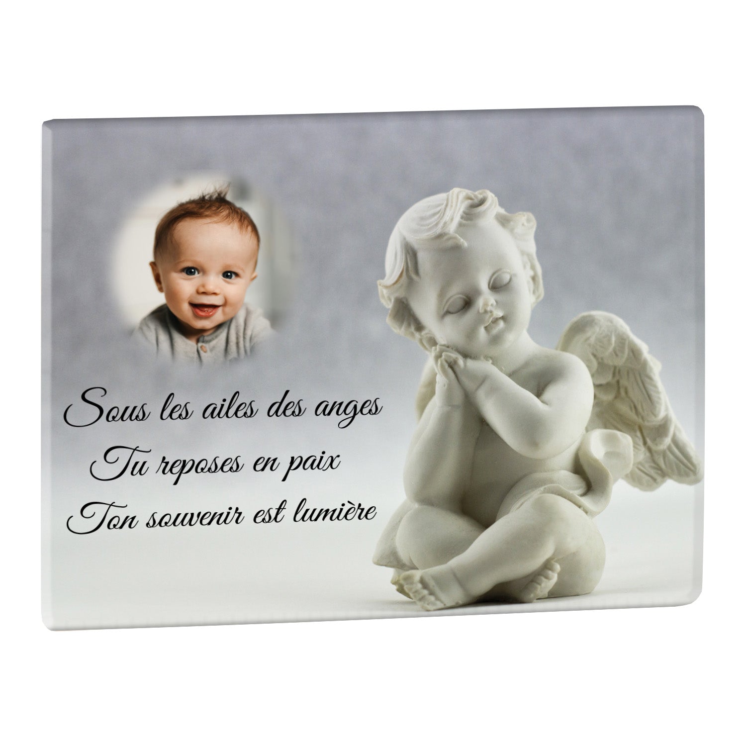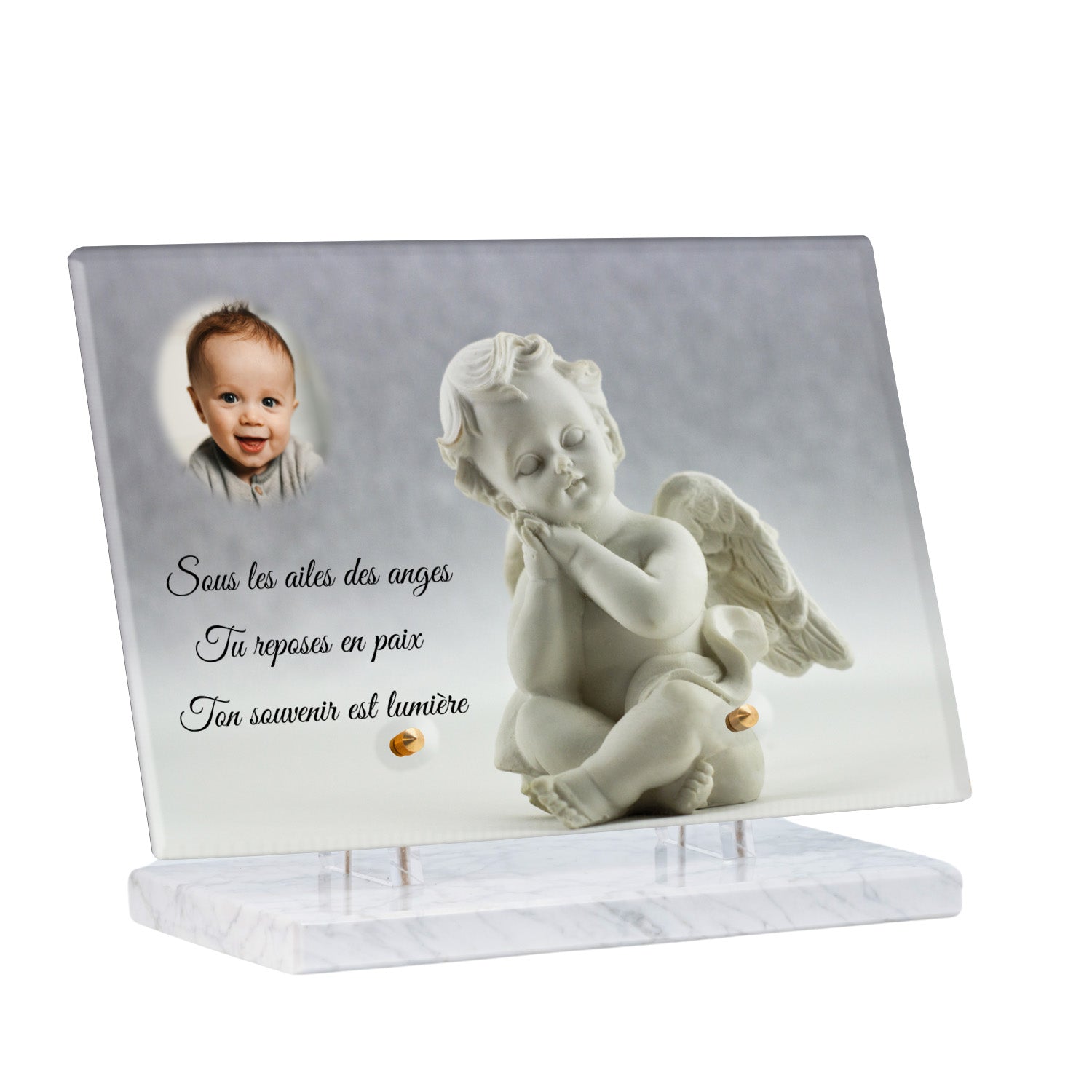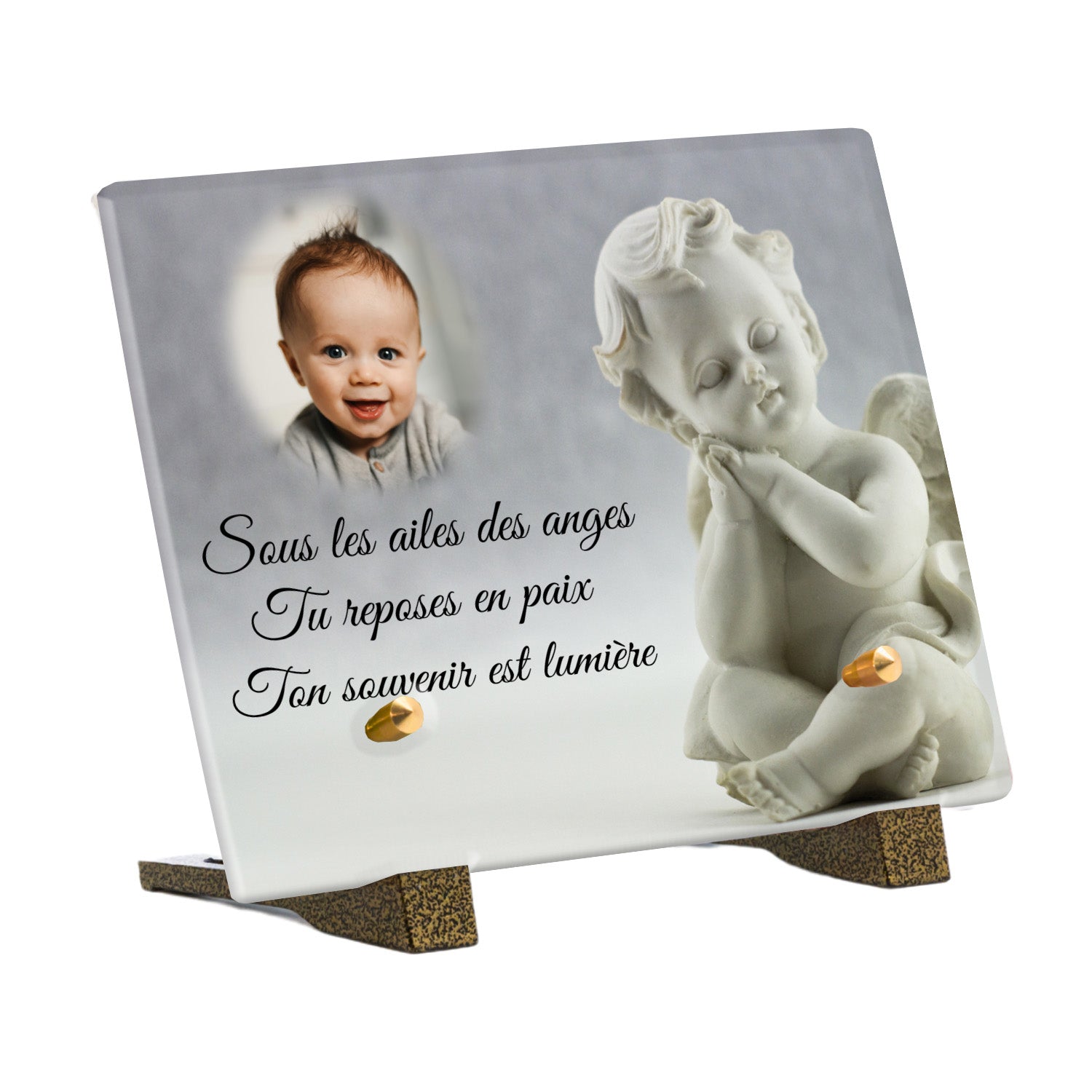 Cette plaque funéraire personnalisée présente un motif délicat d’ange, symbole de paix et de protection, offrant un hommage plein de douceur et de sérénité. Réalisée en plexiglas, cette plaque funéraire moderne combine élégance et résistance, parfaite pour une plaque mortuaire qui sublime la mémoire de vos proches.