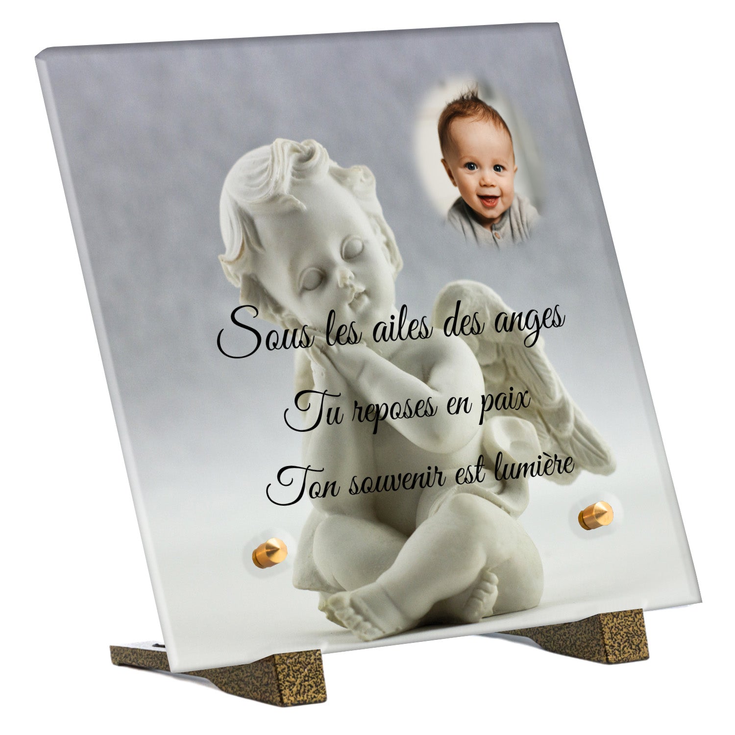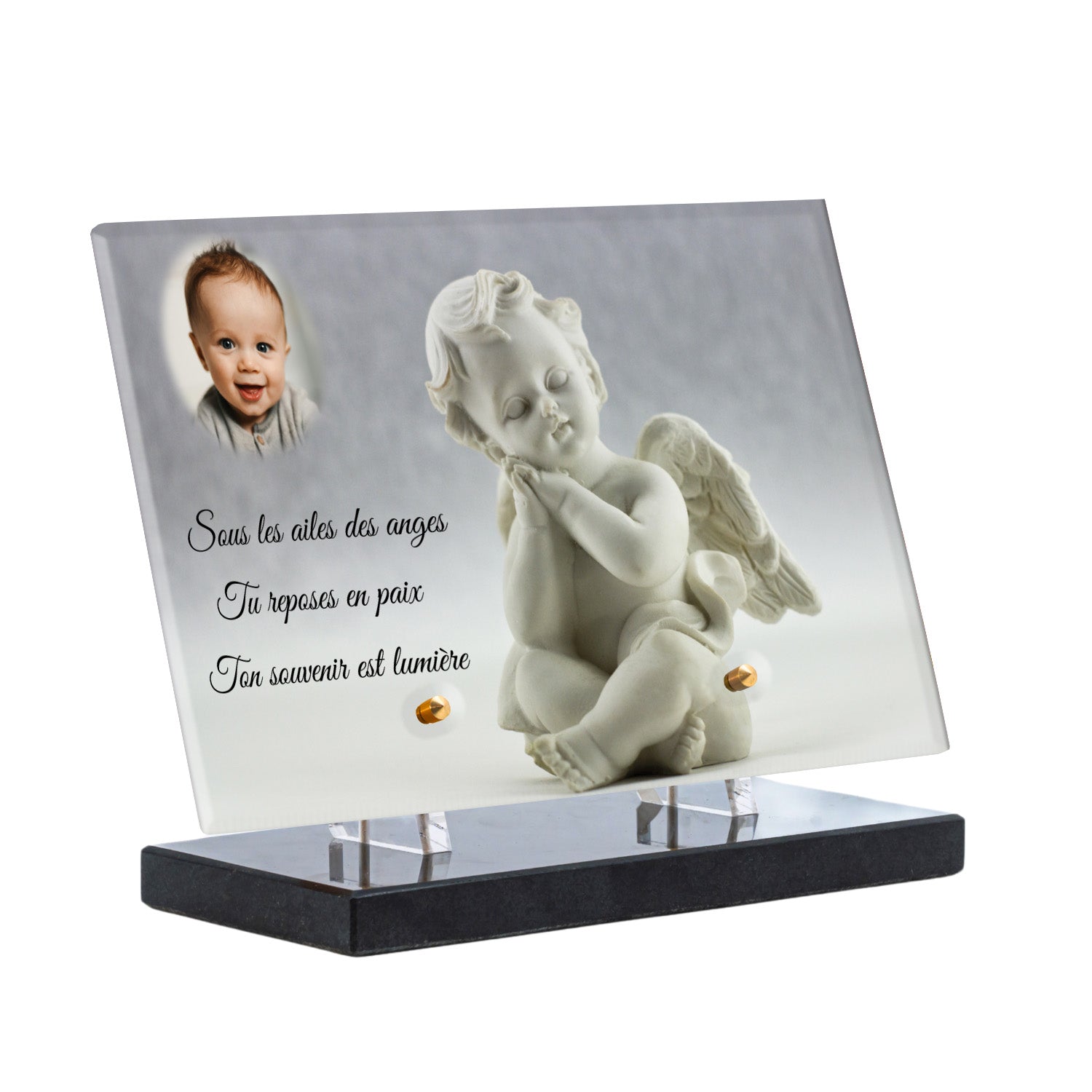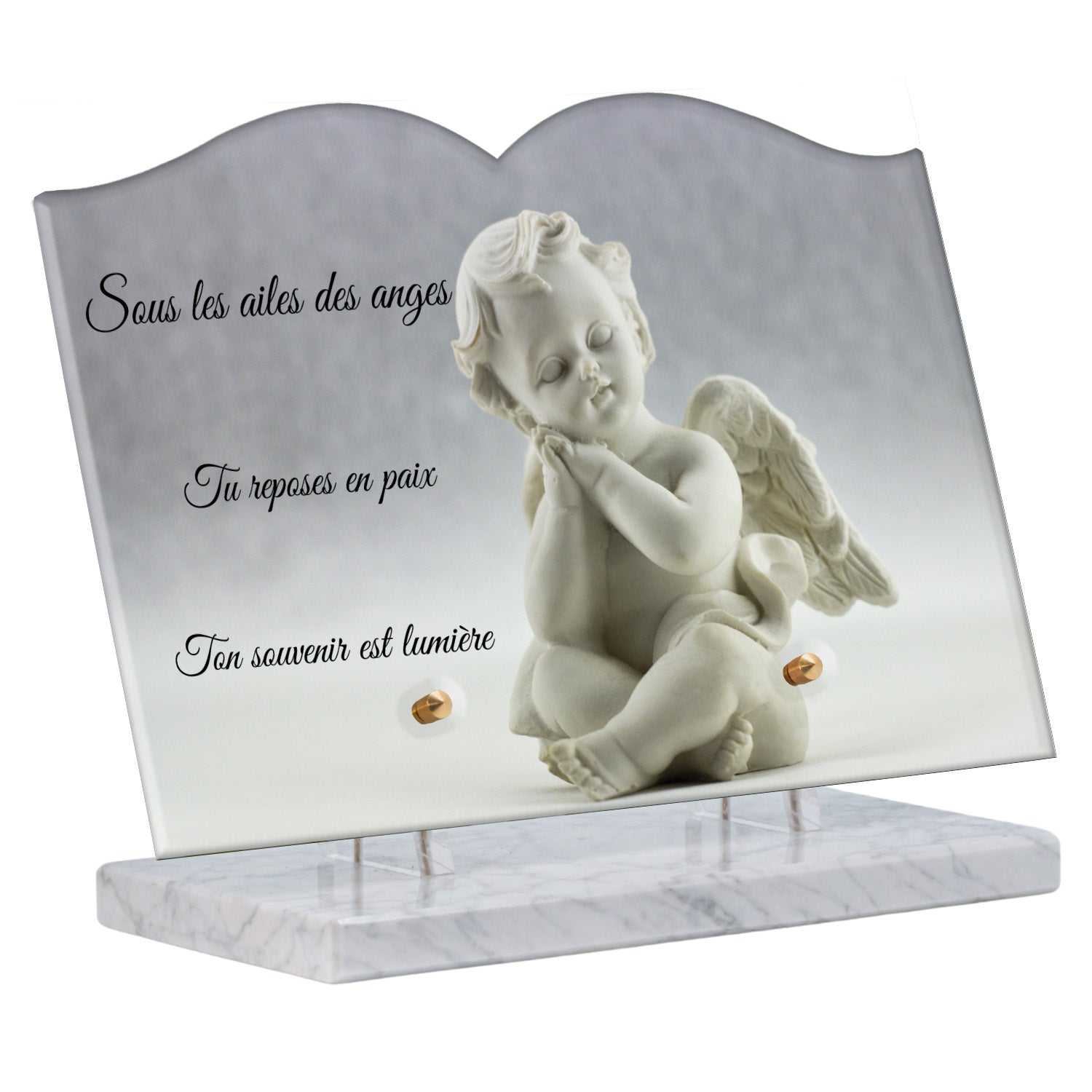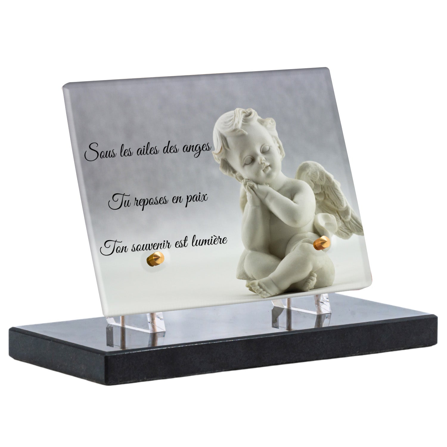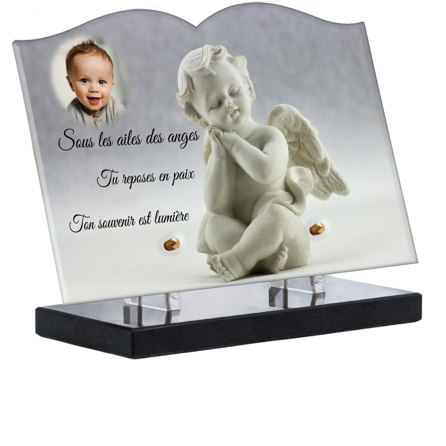 Cette plaque funéraire personnalisée présente un motif délicat d’ange, symbole de paix et de protection, offrant un hommage plein de douceur et de sérénité. Réalisée en plexiglas, cette plaque funéraire moderne combine élégance et résistance, parfaite pour une plaque mortuaire qui sublime la mémoire de vos proches.