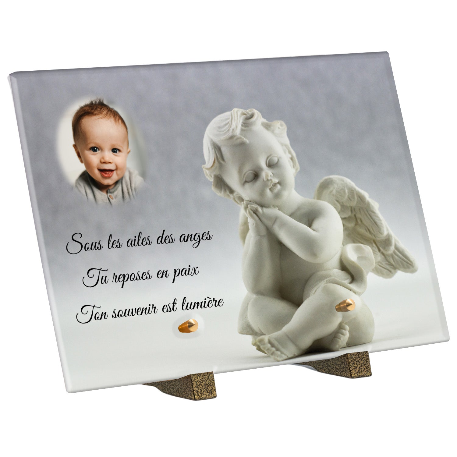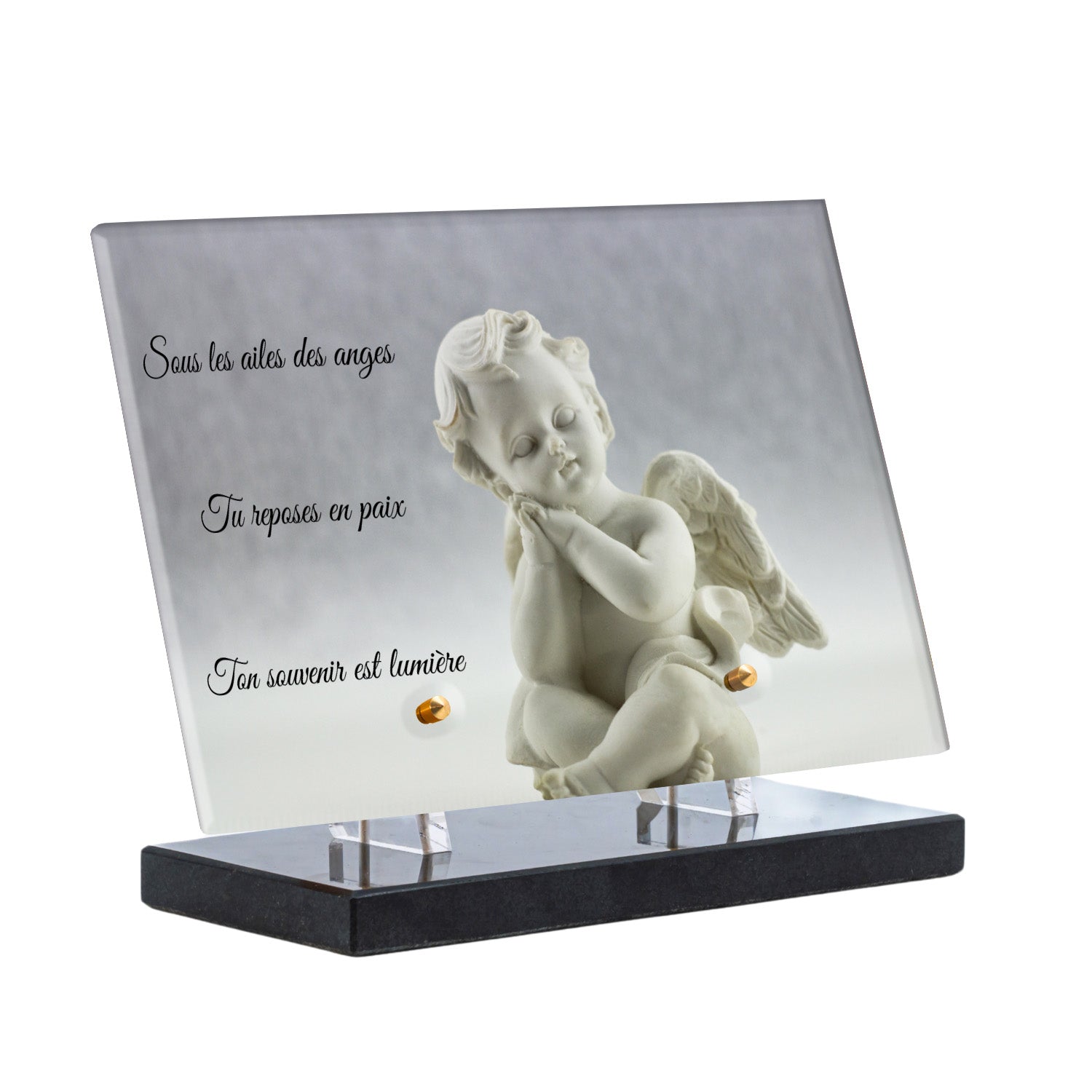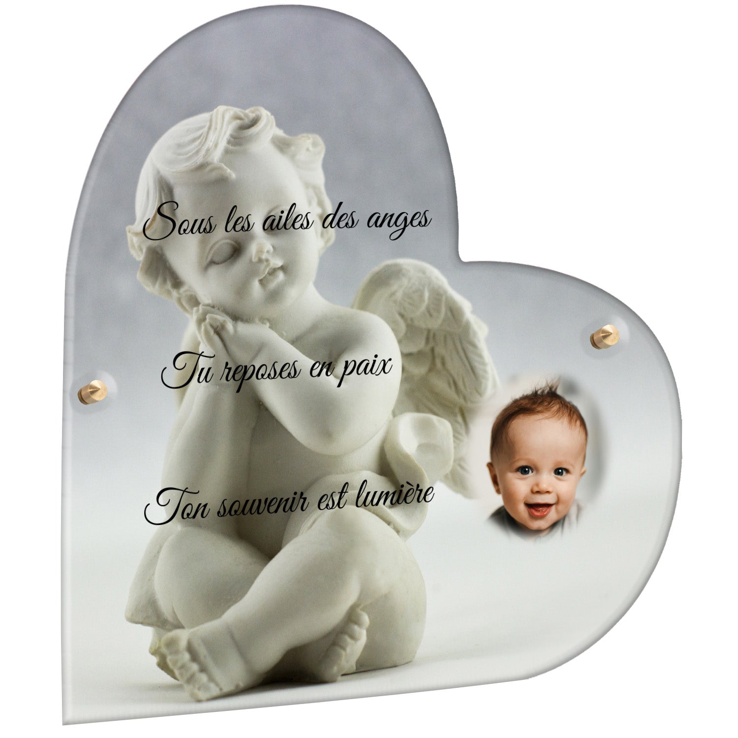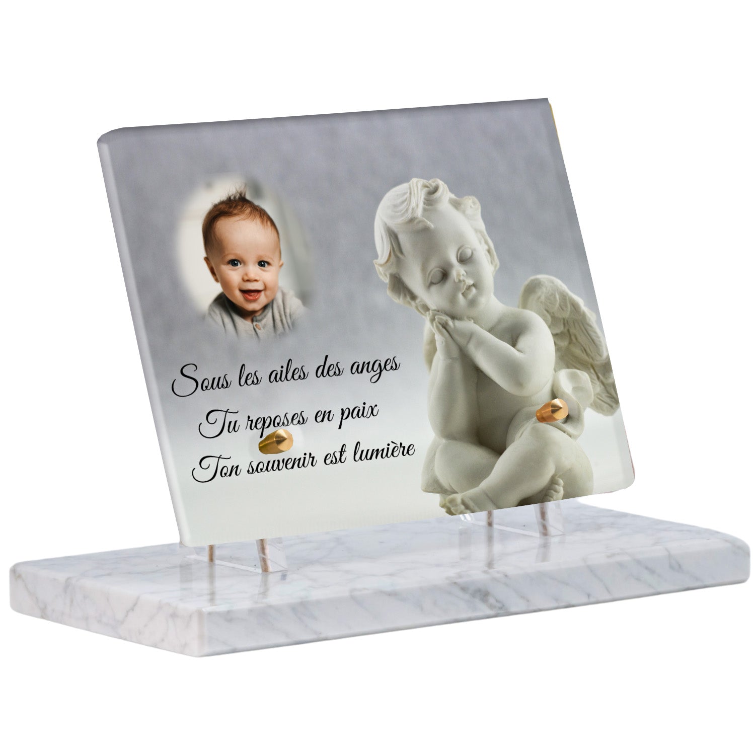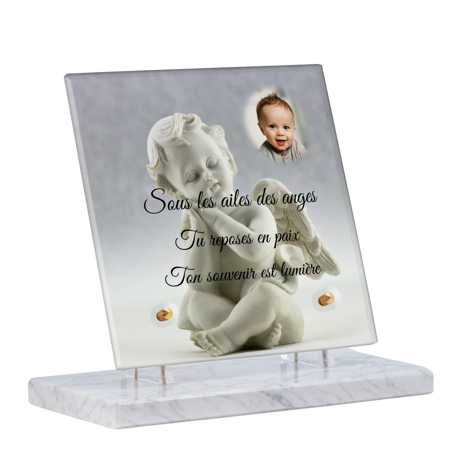 Cette plaque funéraire personnalisée présente un motif délicat d’ange, symbole de paix et de protection, offrant un hommage plein de douceur et de sérénité. Réalisée en plexiglas, cette plaque funéraire moderne combine élégance et résistance, parfaite pour une plaque mortuaire qui sublime la mémoire de vos proches.