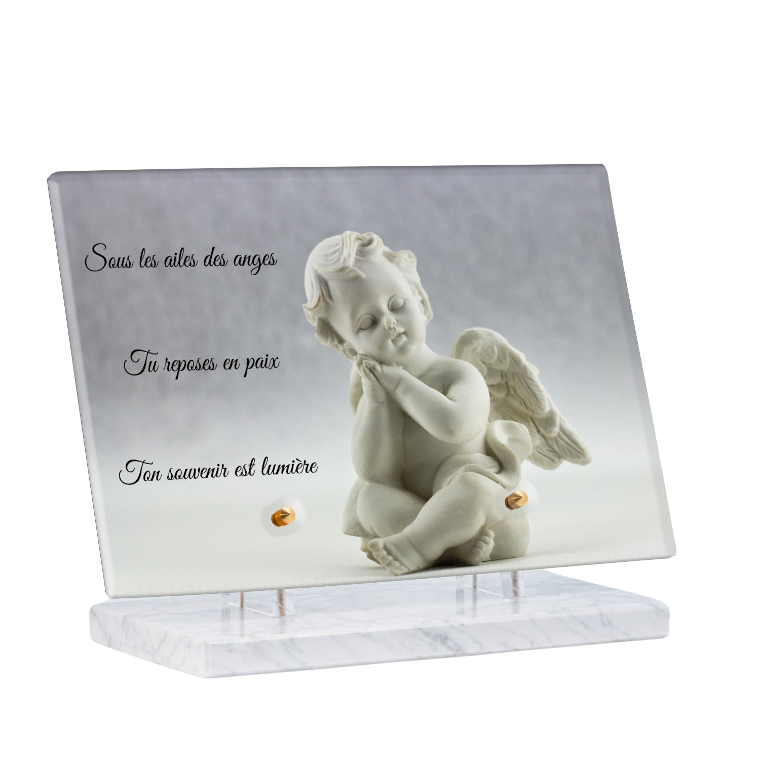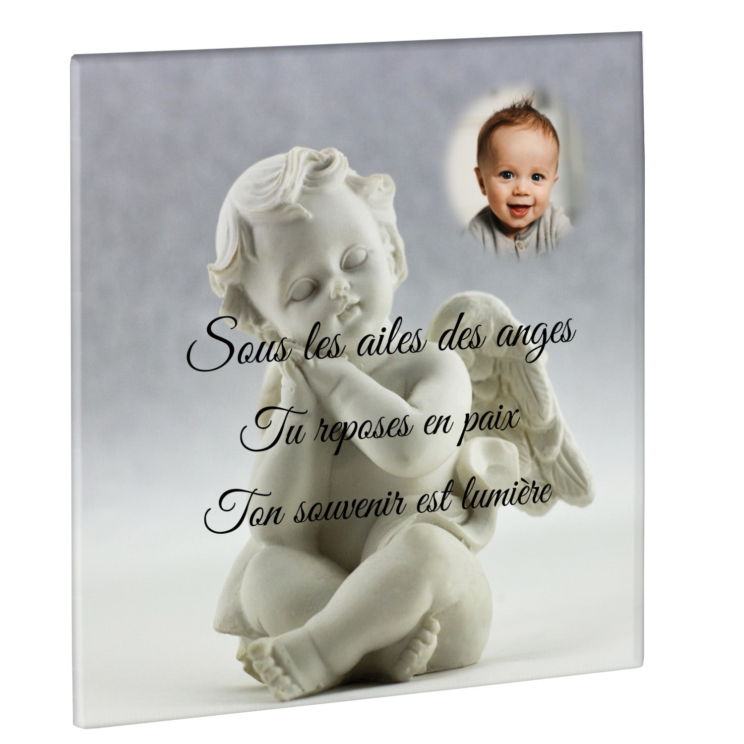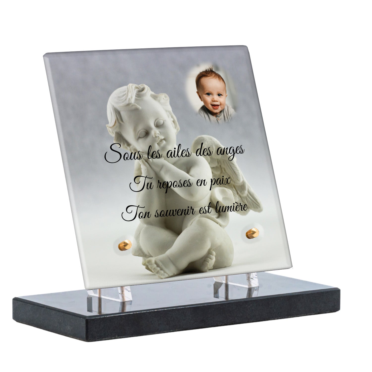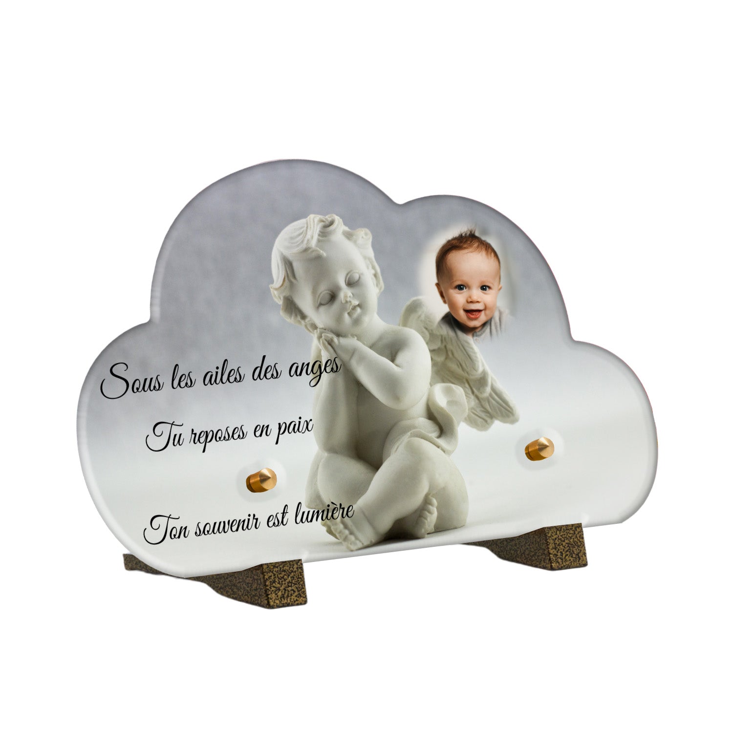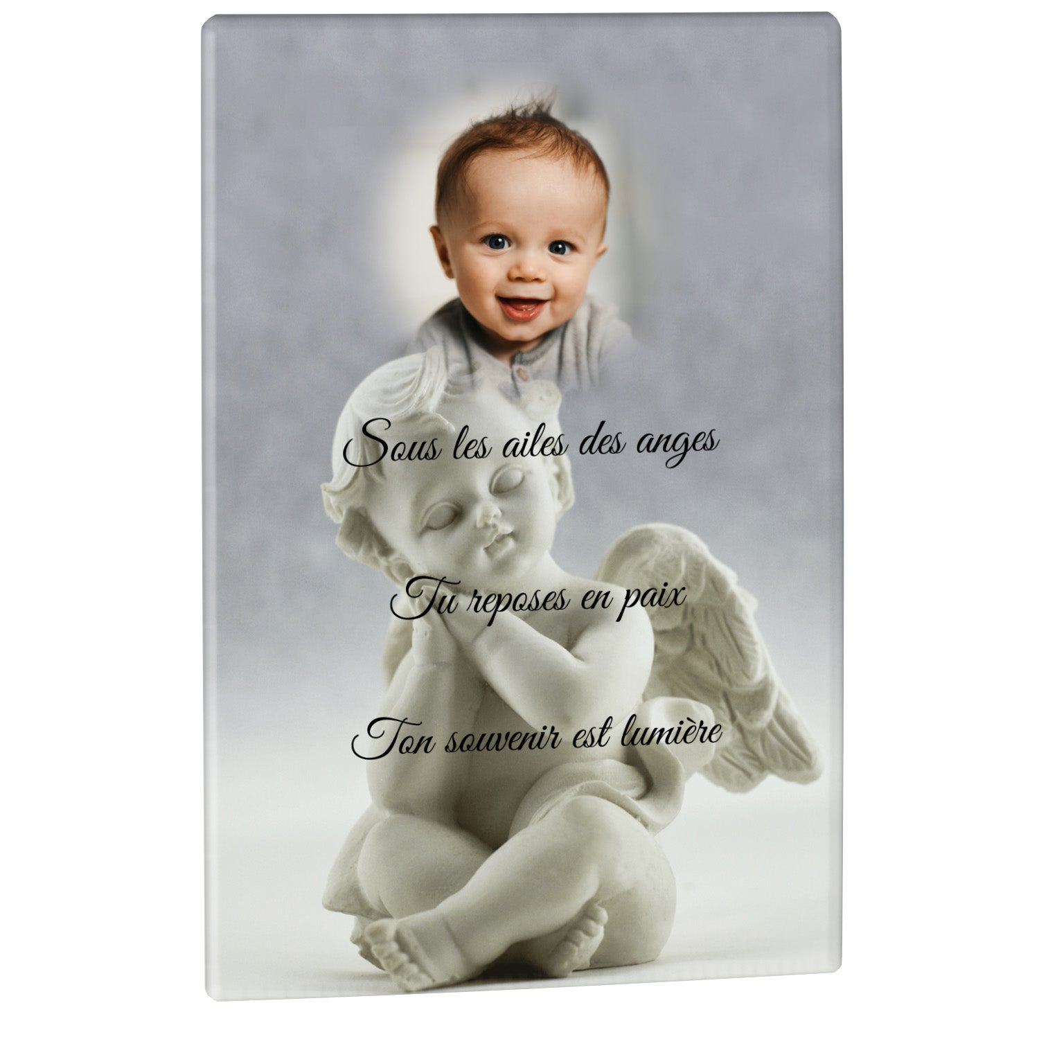 Cette plaque funéraire personnalisée présente un motif délicat d’ange, symbole de paix et de protection, offrant un hommage plein de douceur et de sérénité. Réalisée en plexiglas, cette plaque funéraire moderne combine élégance et résistance, parfaite pour une plaque mortuaire qui sublime la mémoire de vos proches.