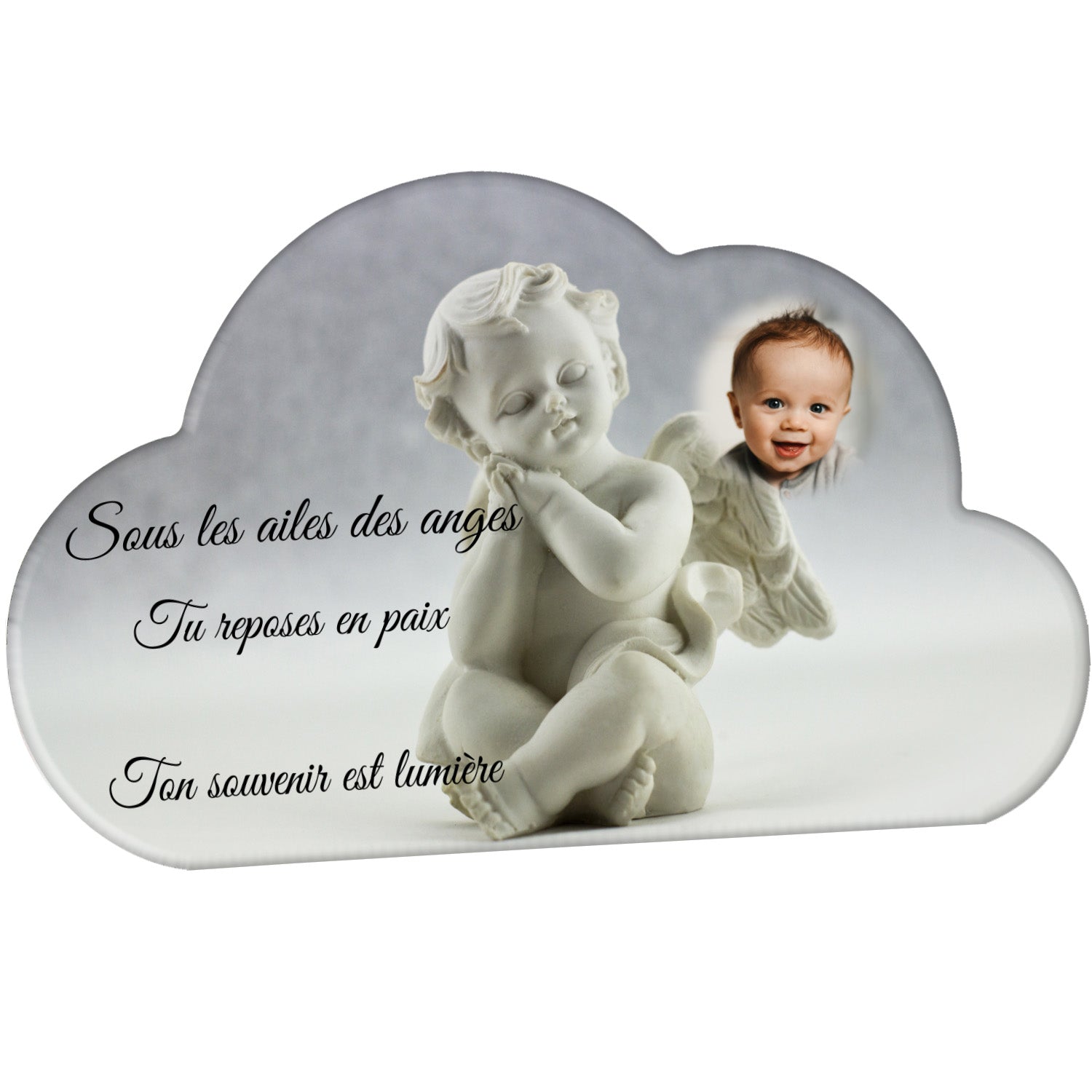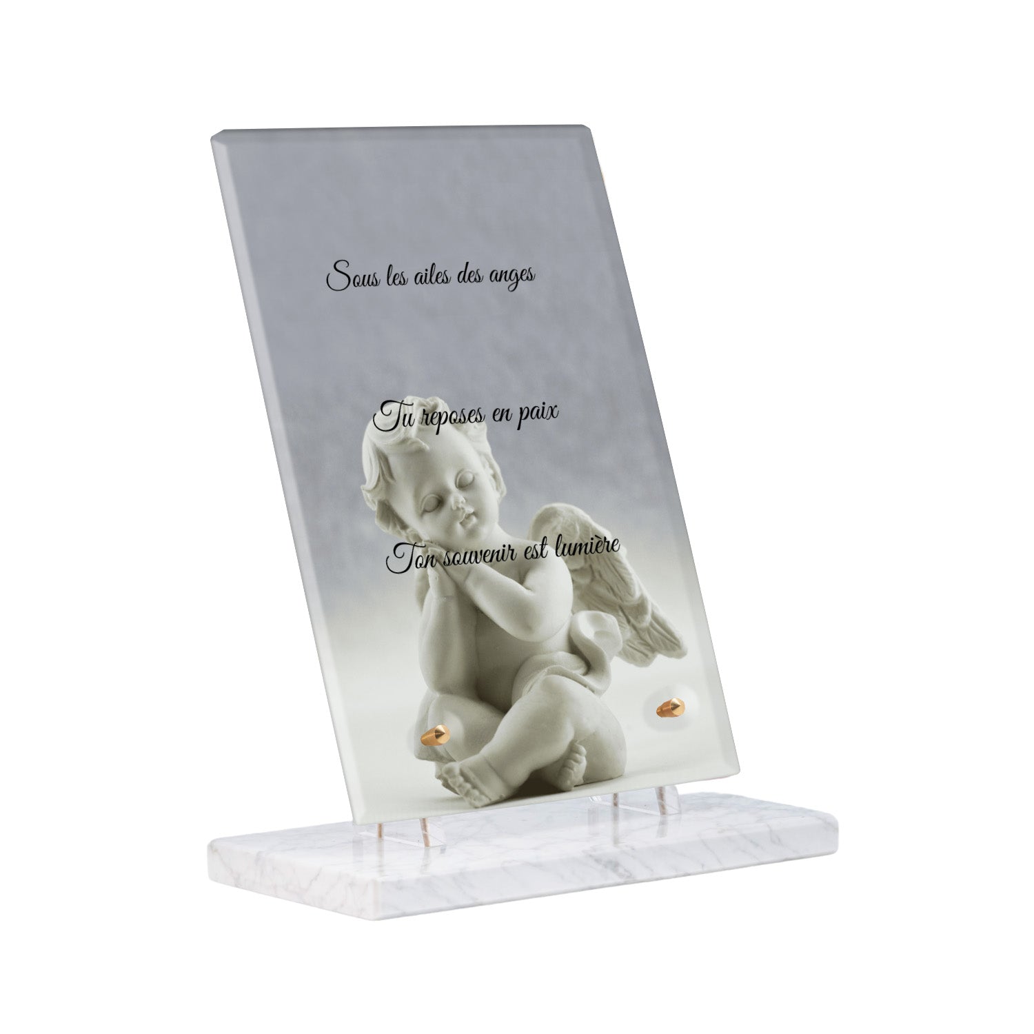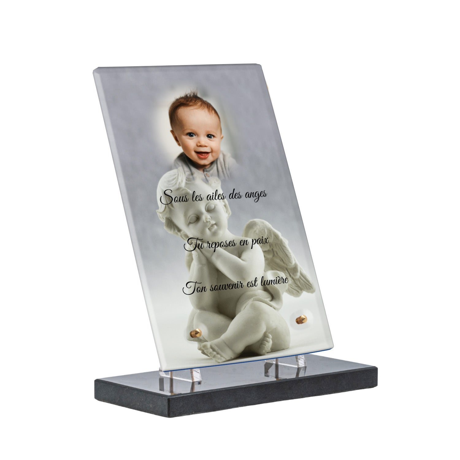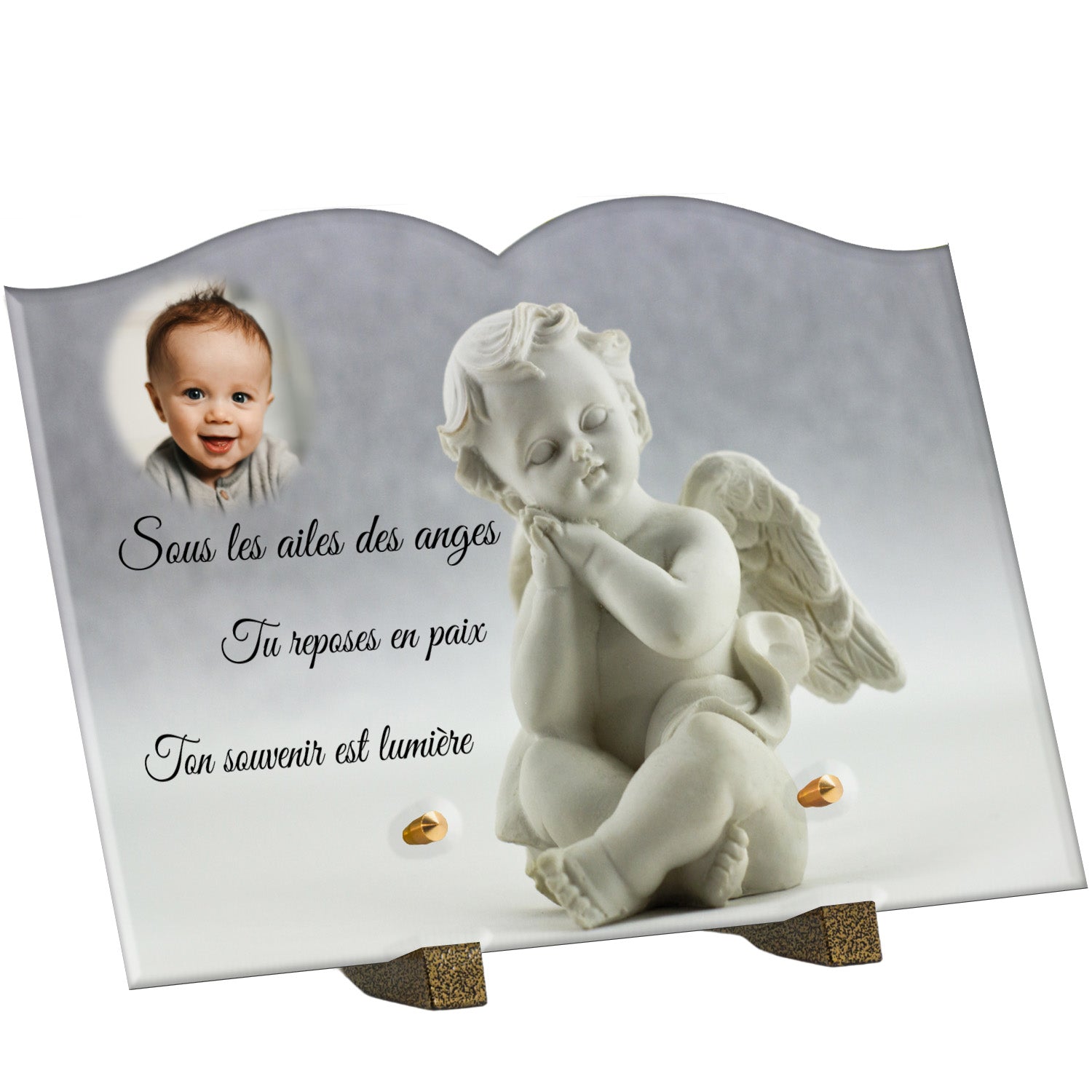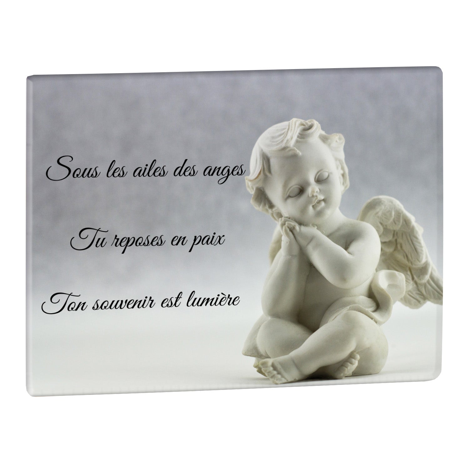 Cette plaque funéraire personnalisée présente un motif délicat d’ange, symbole de paix et de protection, offrant un hommage plein de douceur et de sérénité. Réalisée en plexiglas, cette plaque funéraire moderne combine élégance et résistance, parfaite pour une plaque mortuaire qui sublime la mémoire de vos proches.