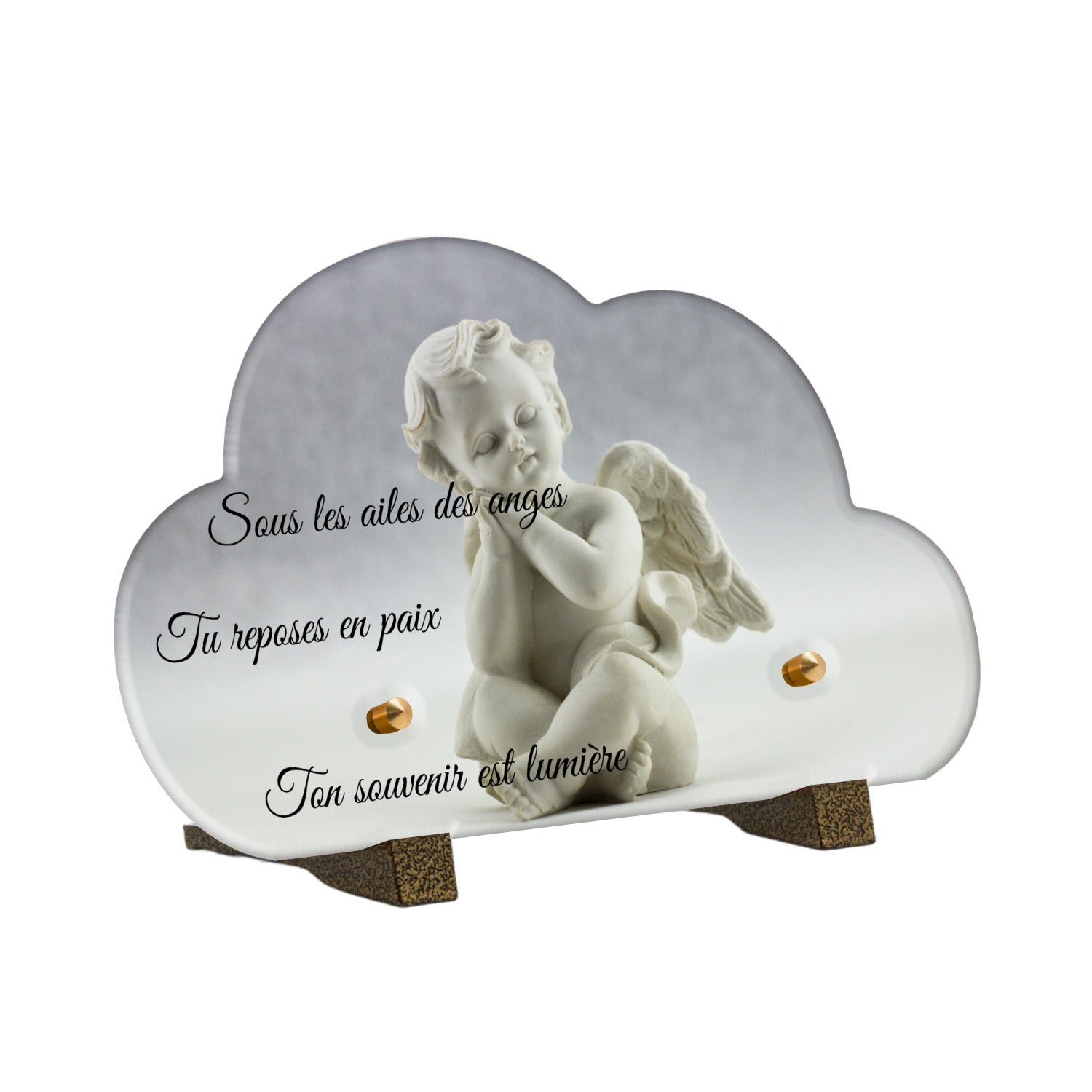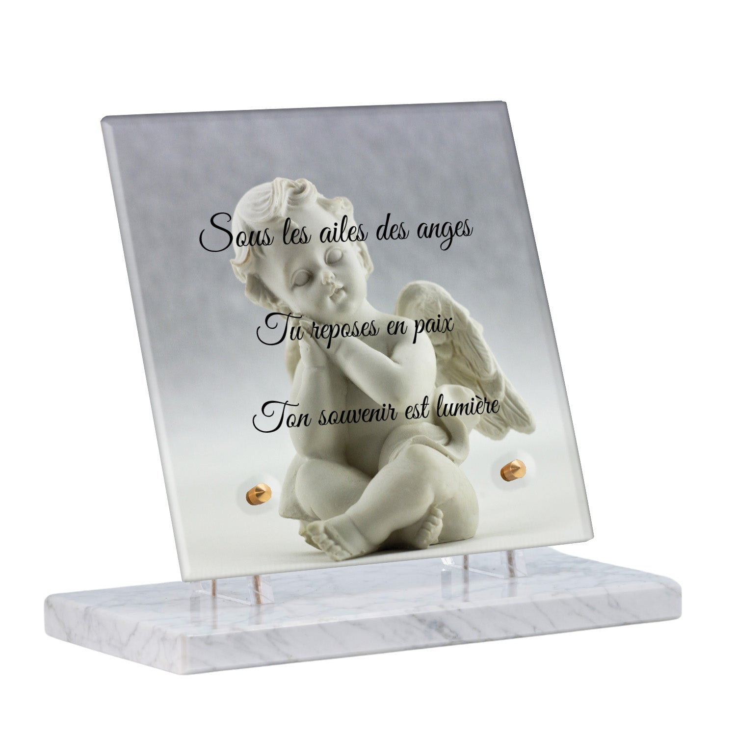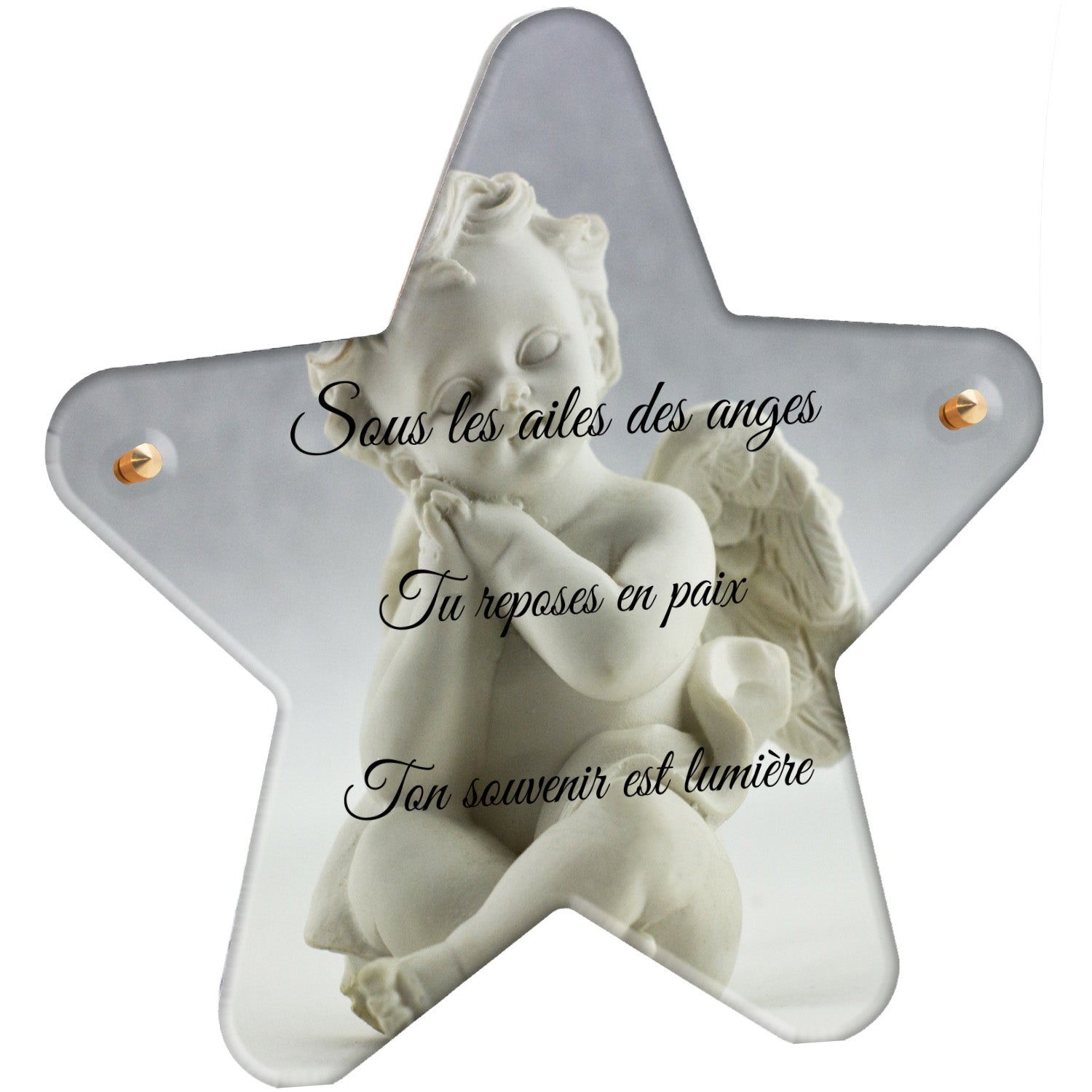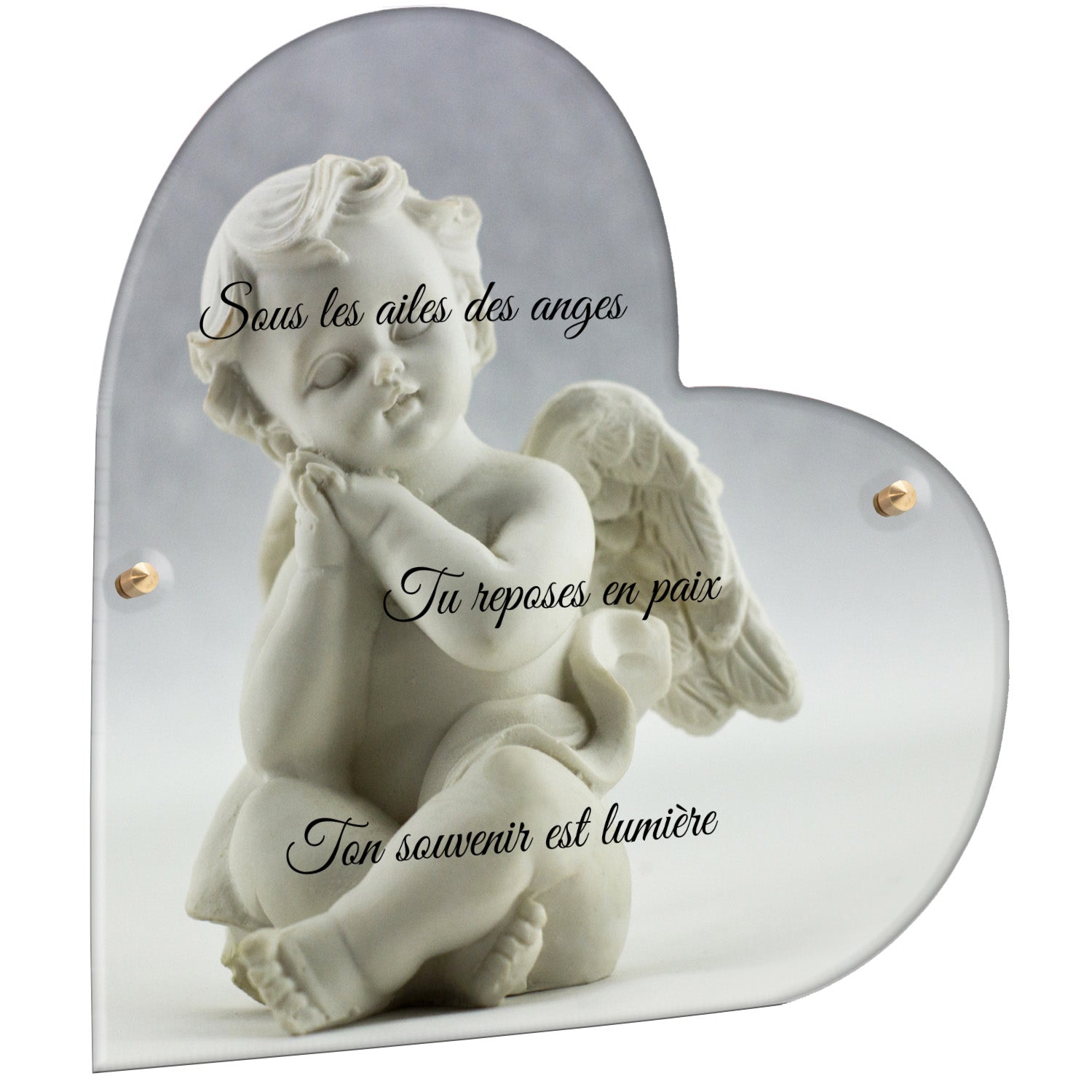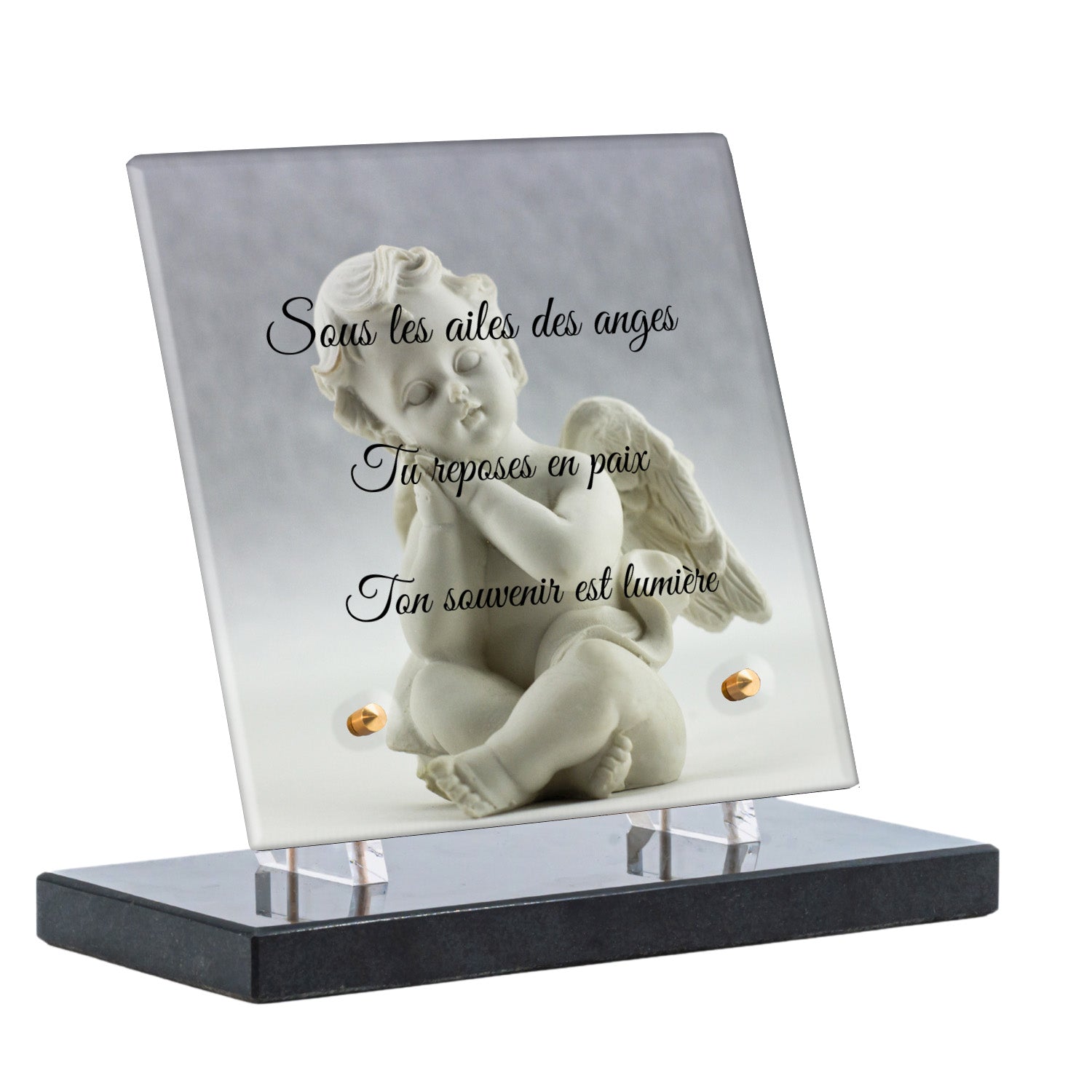 Cette plaque funéraire personnalisée présente un motif délicat d’ange, symbole de paix et de protection, offrant un hommage plein de douceur et de sérénité. Réalisée en plexiglas, cette plaque funéraire moderne combine élégance et résistance, parfaite pour une plaque mortuaire qui sublime la mémoire de vos proches.