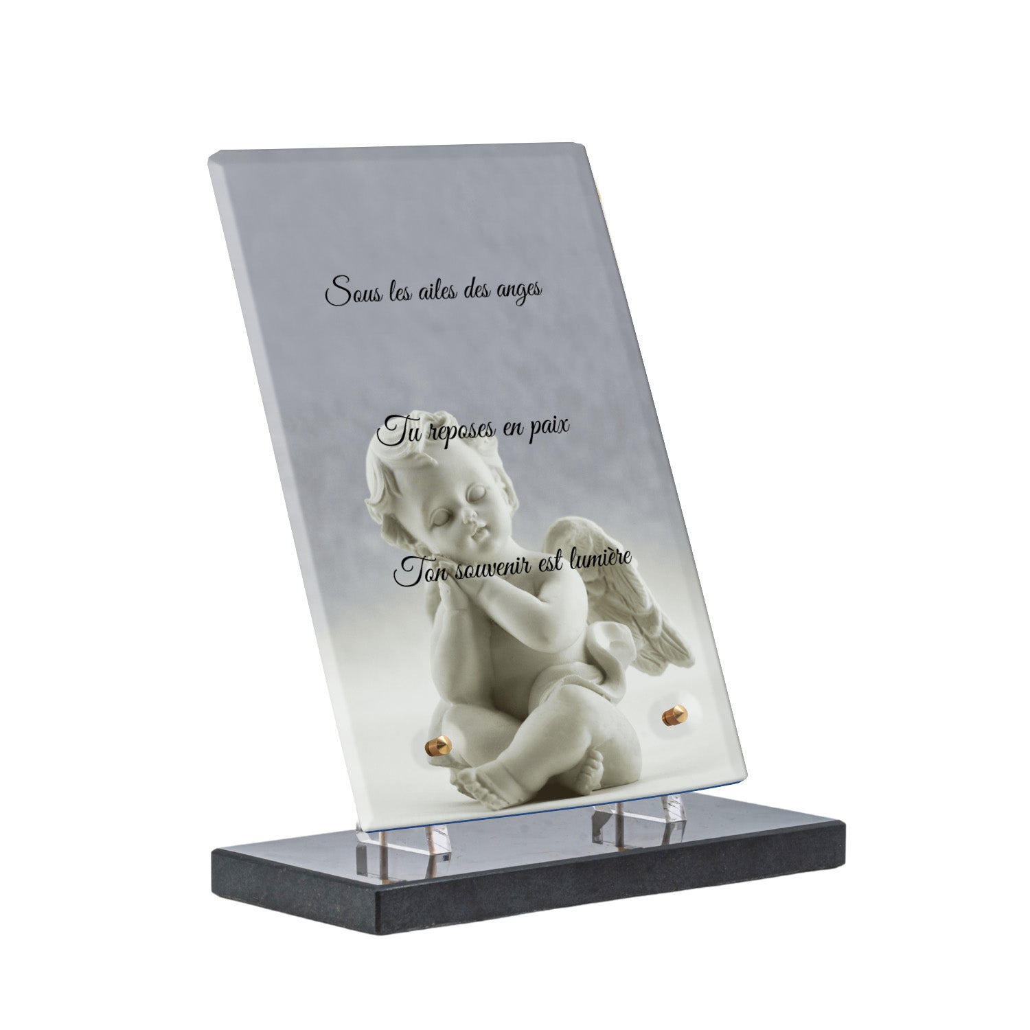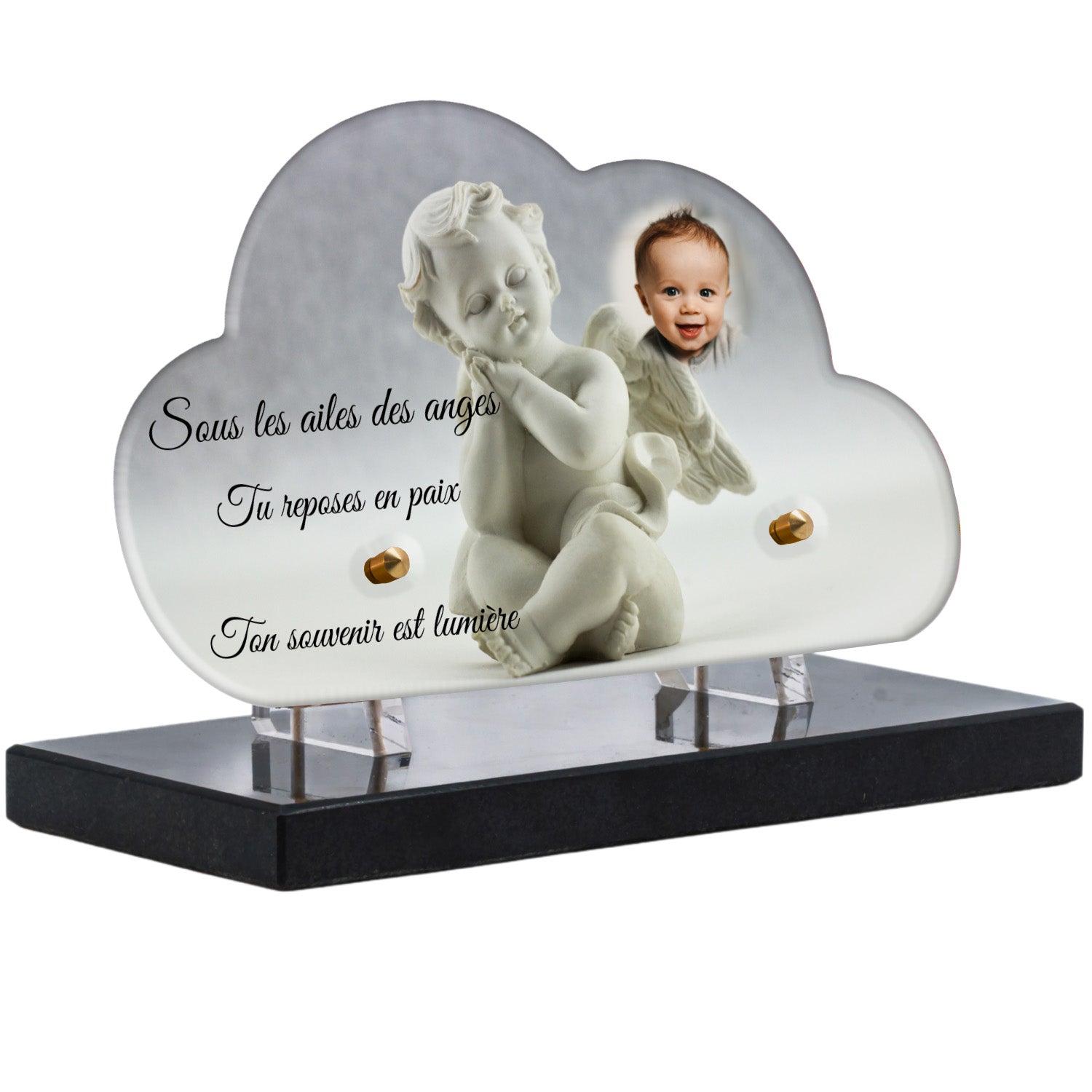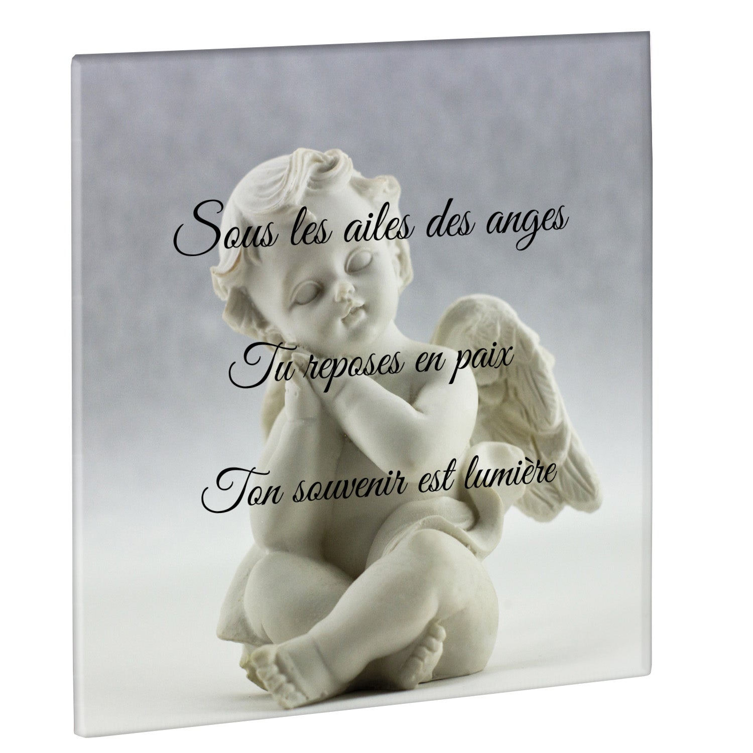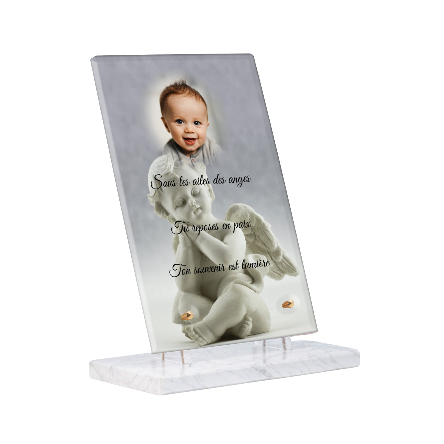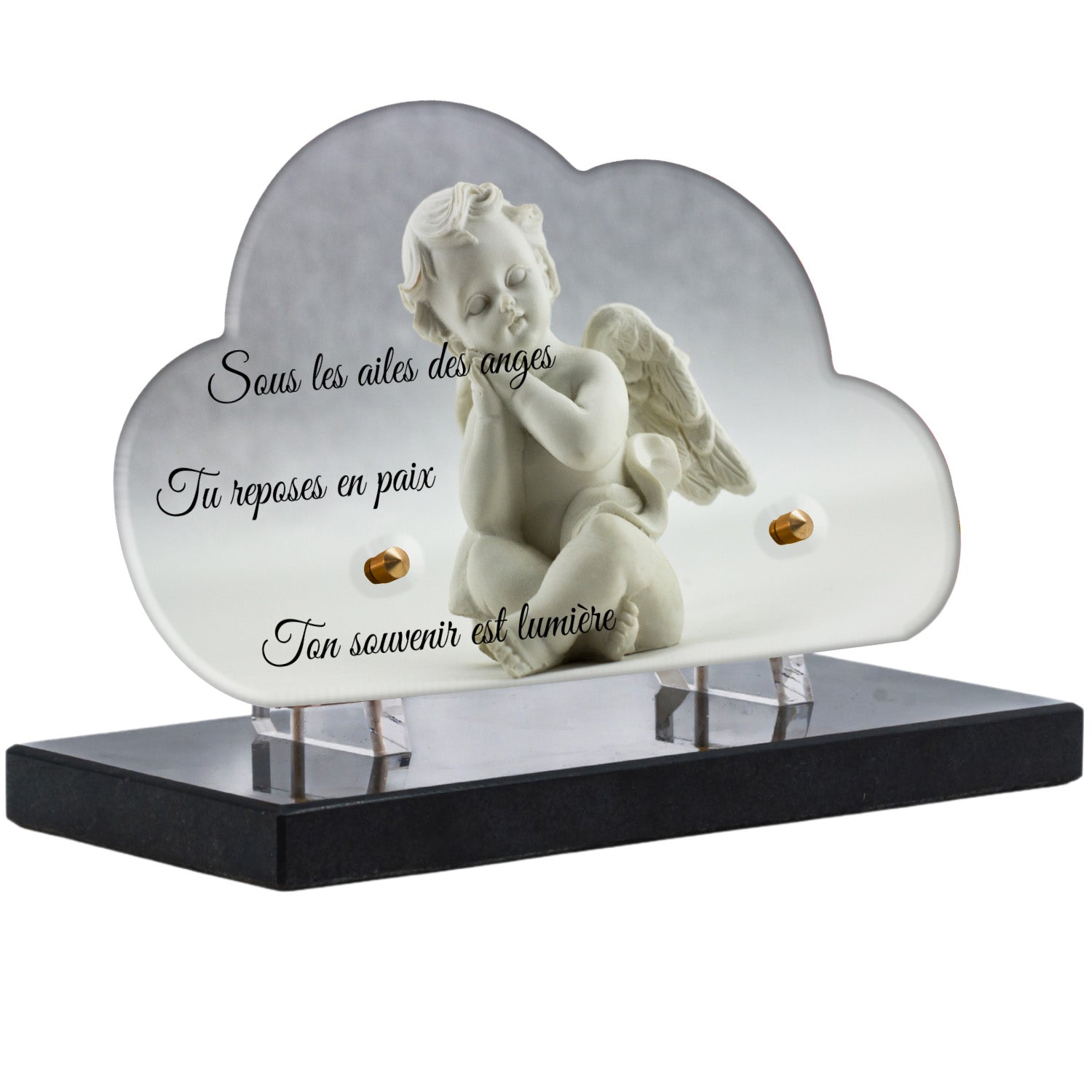Cette plaque funéraire personnalisée présente un motif délicat d’ange, symbole de paix et de protection, offrant un hommage plein de douceur et de sérénité. Réalisée en plexiglas, cette plaque funéraire moderne combine élégance et résistance, parfaite pour une plaque mortuaire qui sublime la mémoire de vos proches.