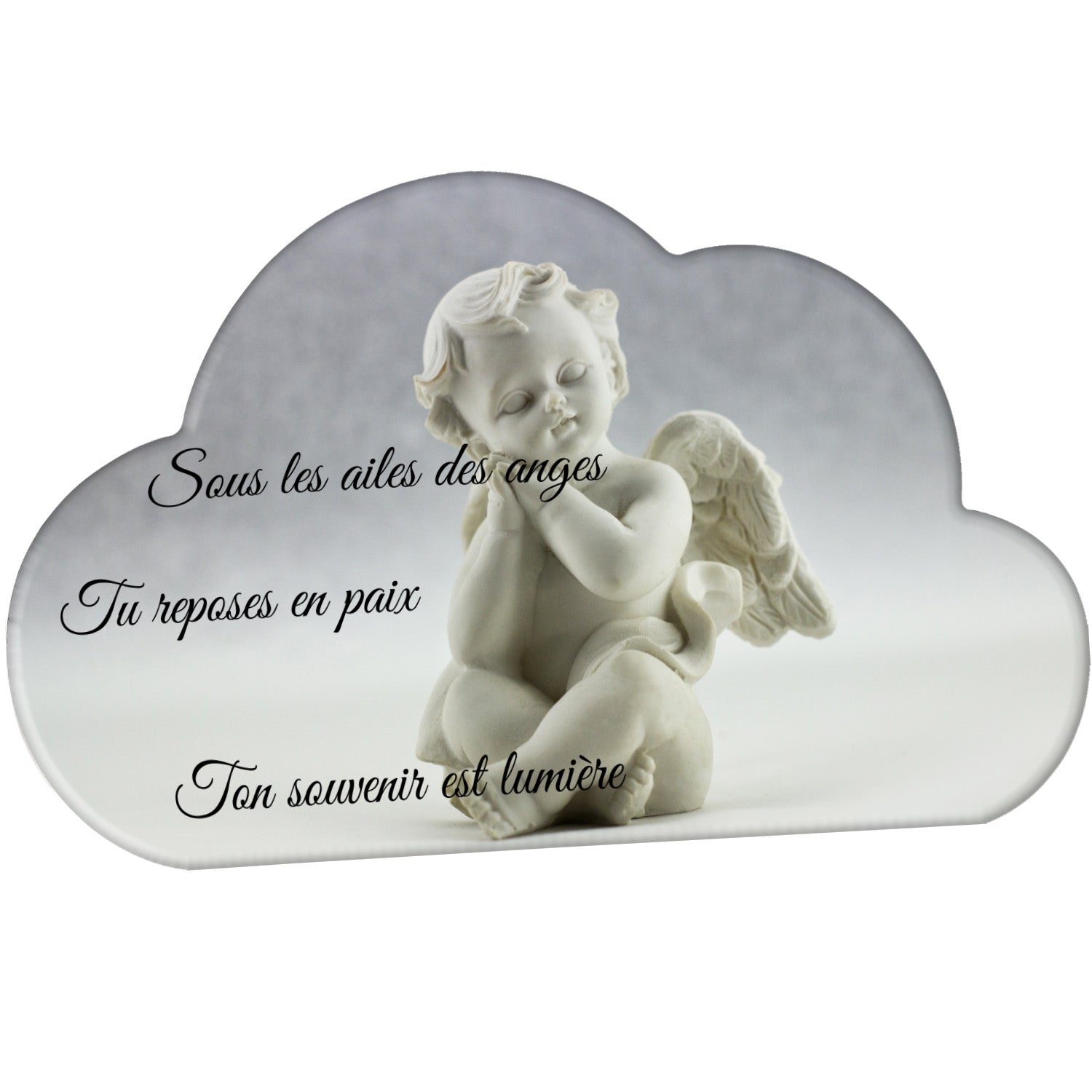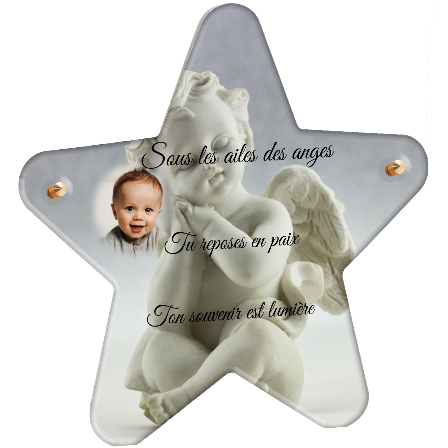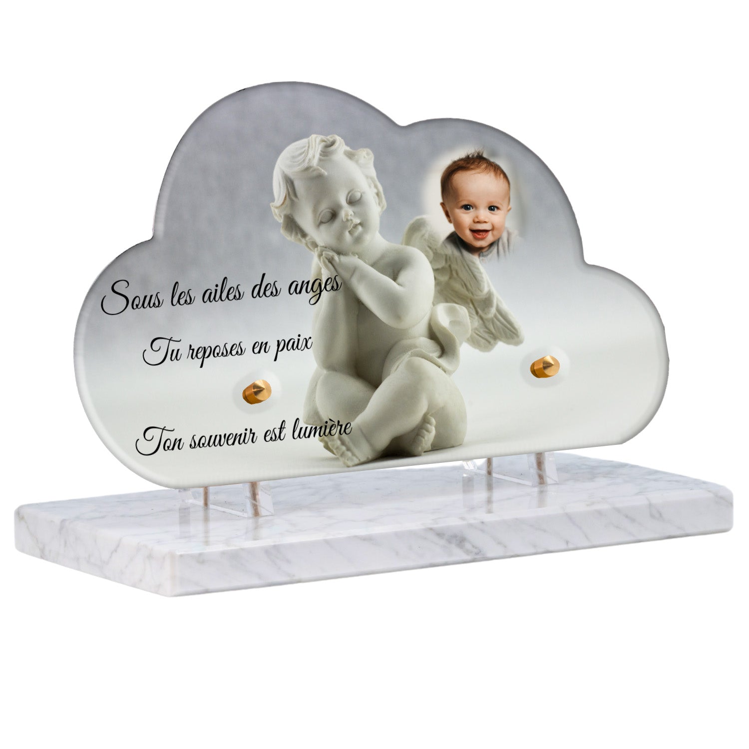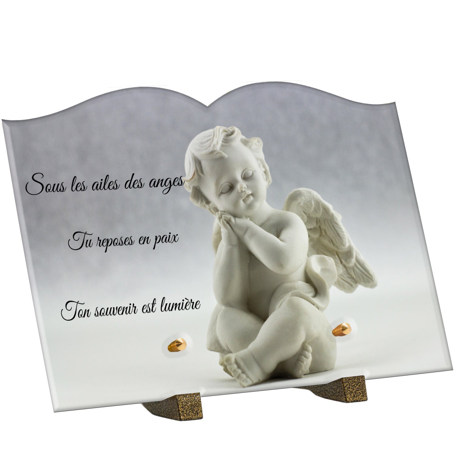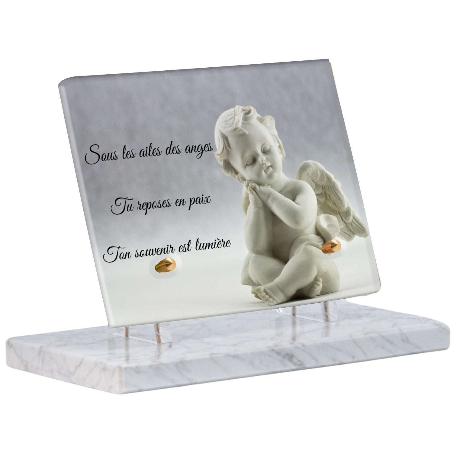 Cette plaque funéraire personnalisée présente un motif délicat d’ange, symbole de paix et de protection, offrant un hommage plein de douceur et de sérénité. Réalisée en plexiglas, cette plaque funéraire moderne combine élégance et résistance, parfaite pour une plaque mortuaire qui sublime la mémoire de vos proches.