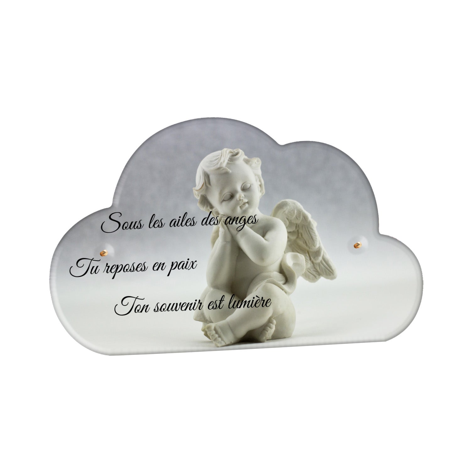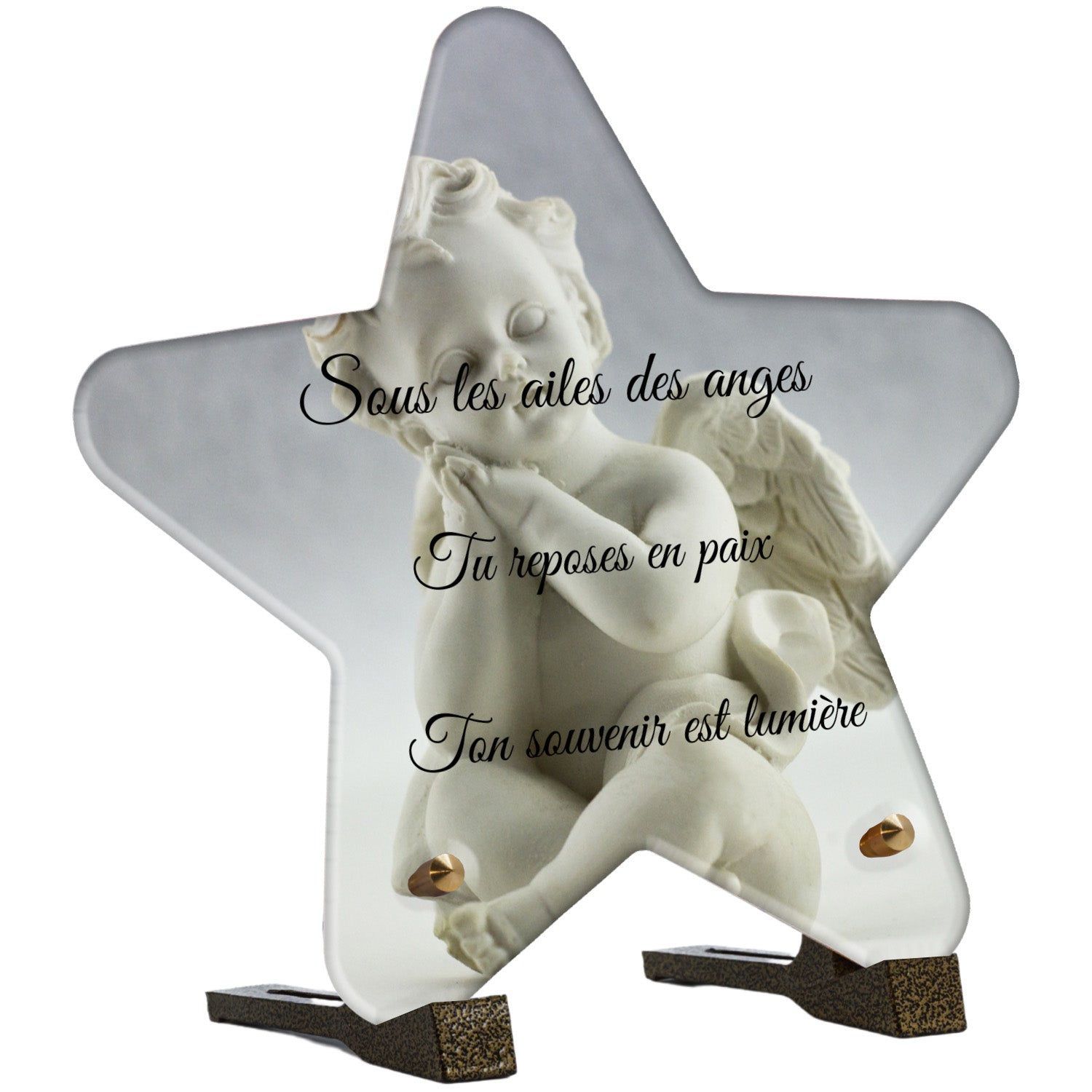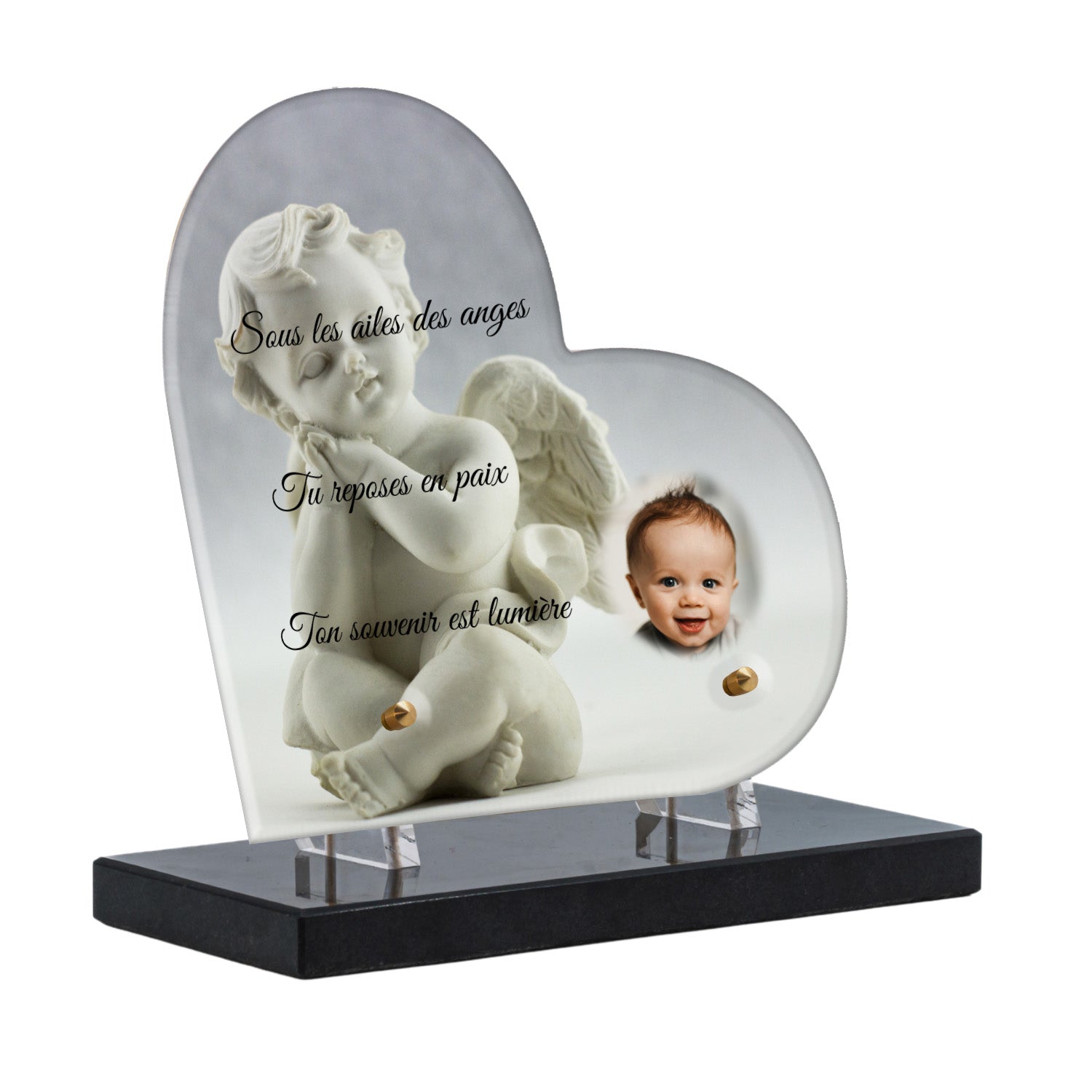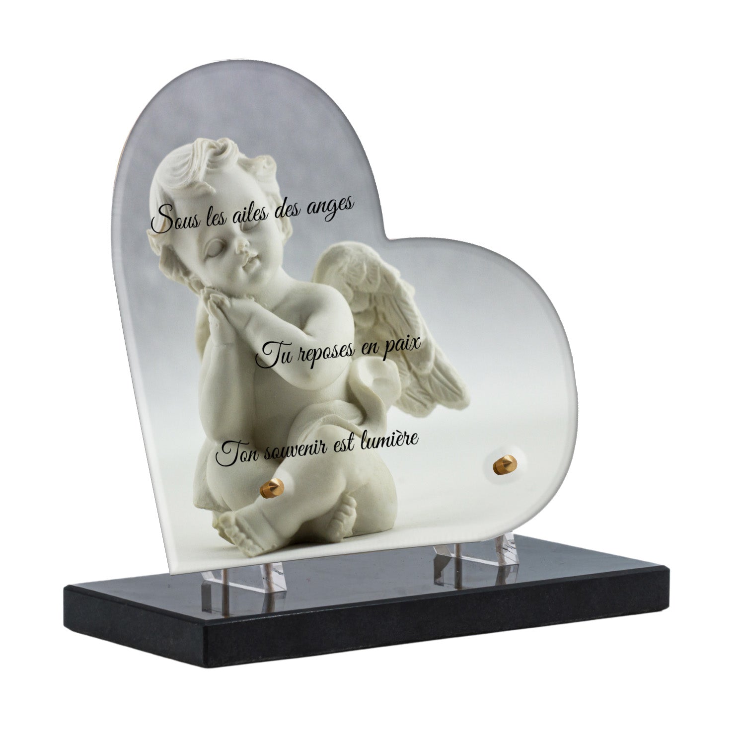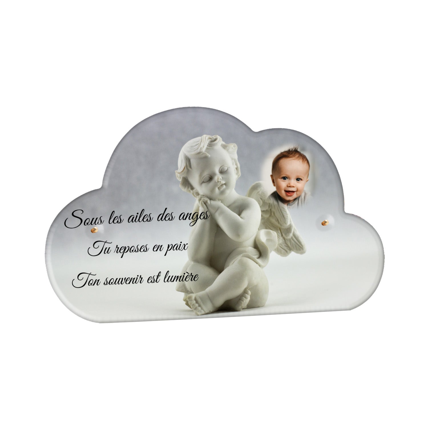 Cette plaque funéraire personnalisée présente un motif délicat d’ange, symbole de paix et de protection, offrant un hommage plein de douceur et de sérénité. Réalisée en plexiglas, cette plaque funéraire moderne combine élégance et résistance, parfaite pour une plaque mortuaire qui sublime la mémoire de vos proches.