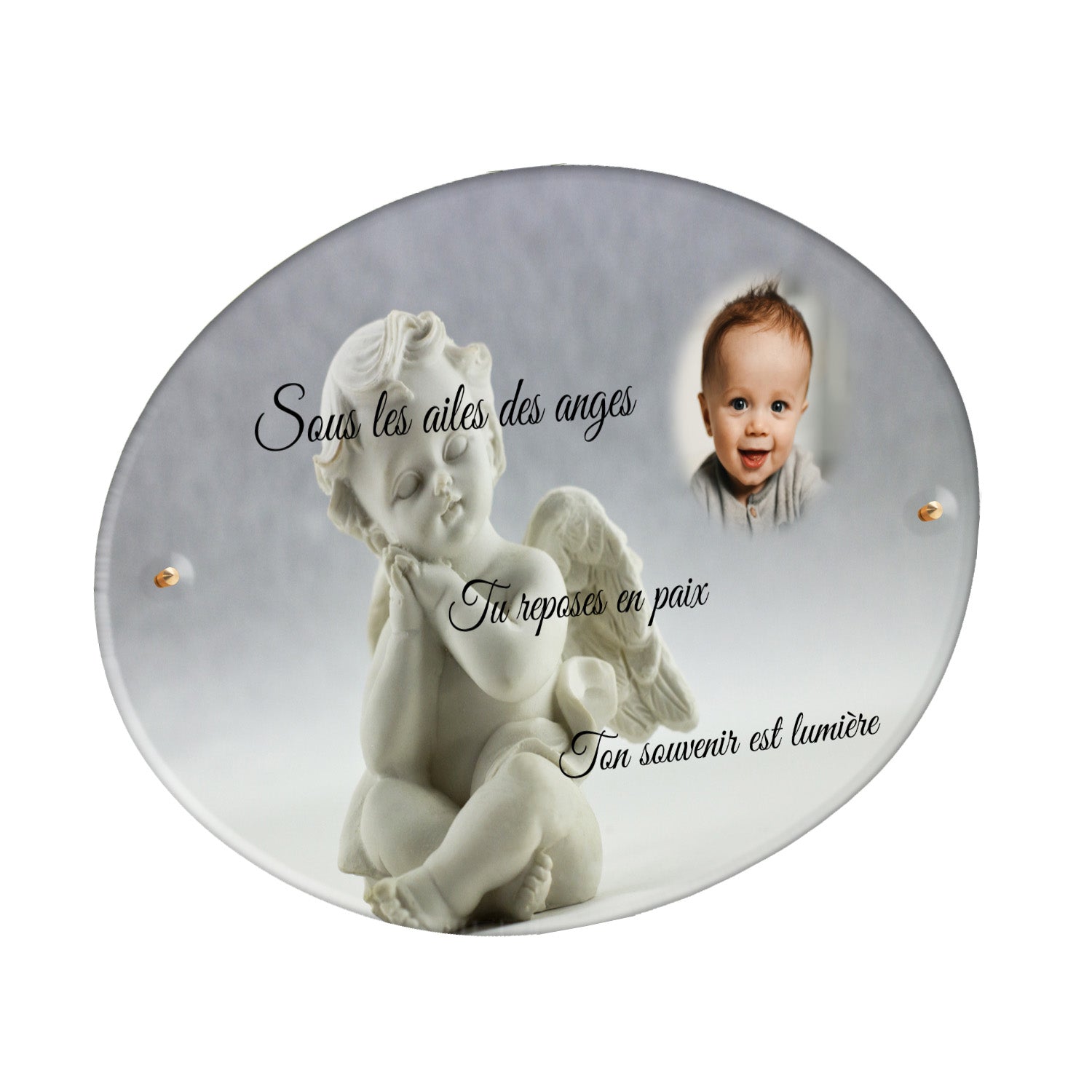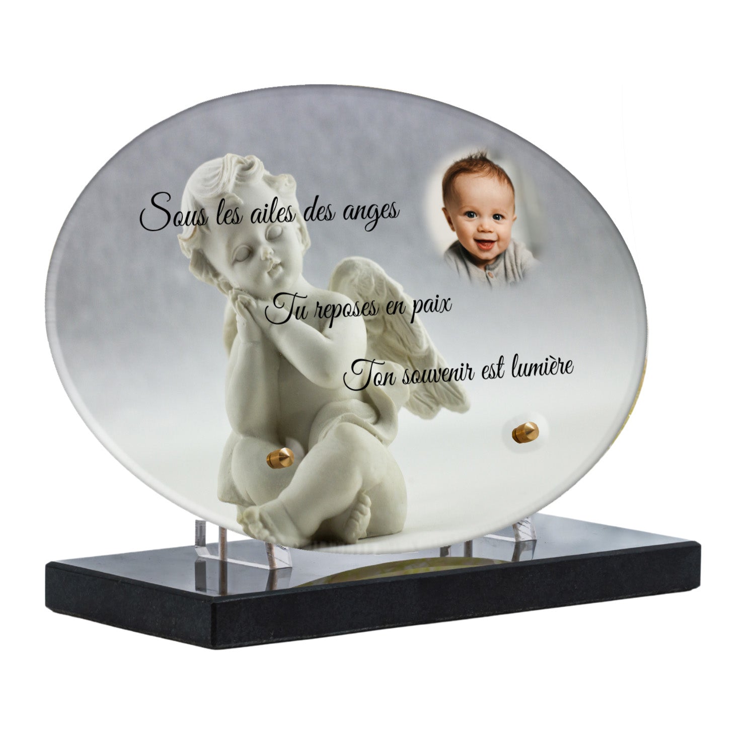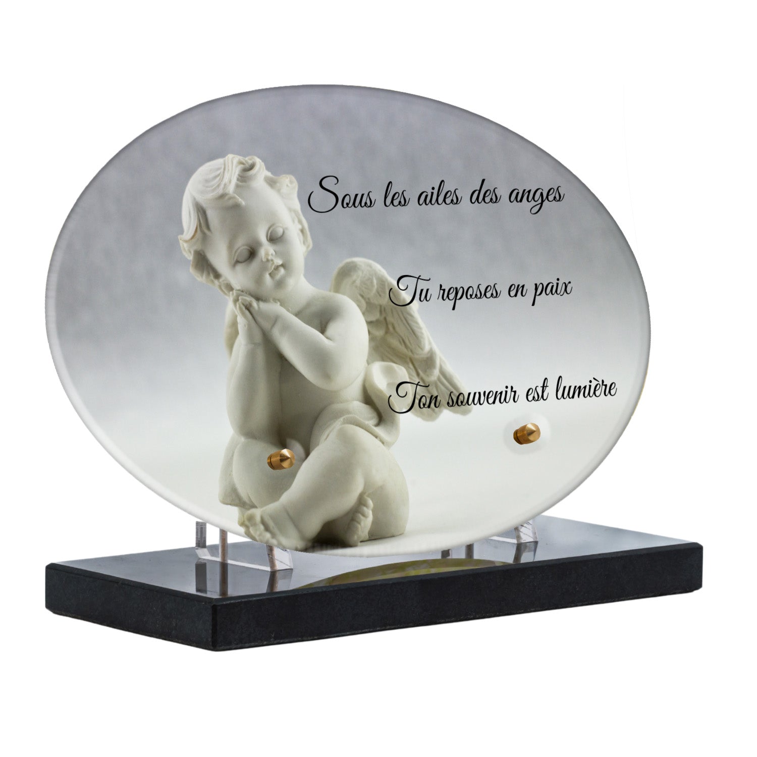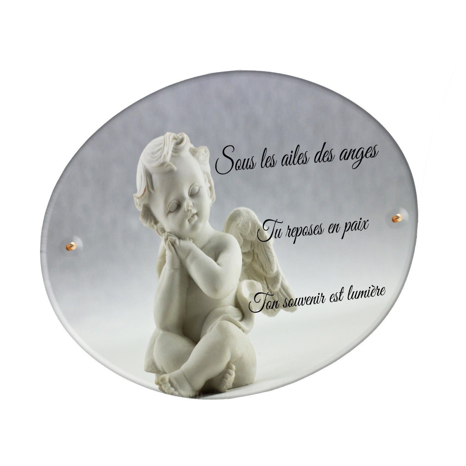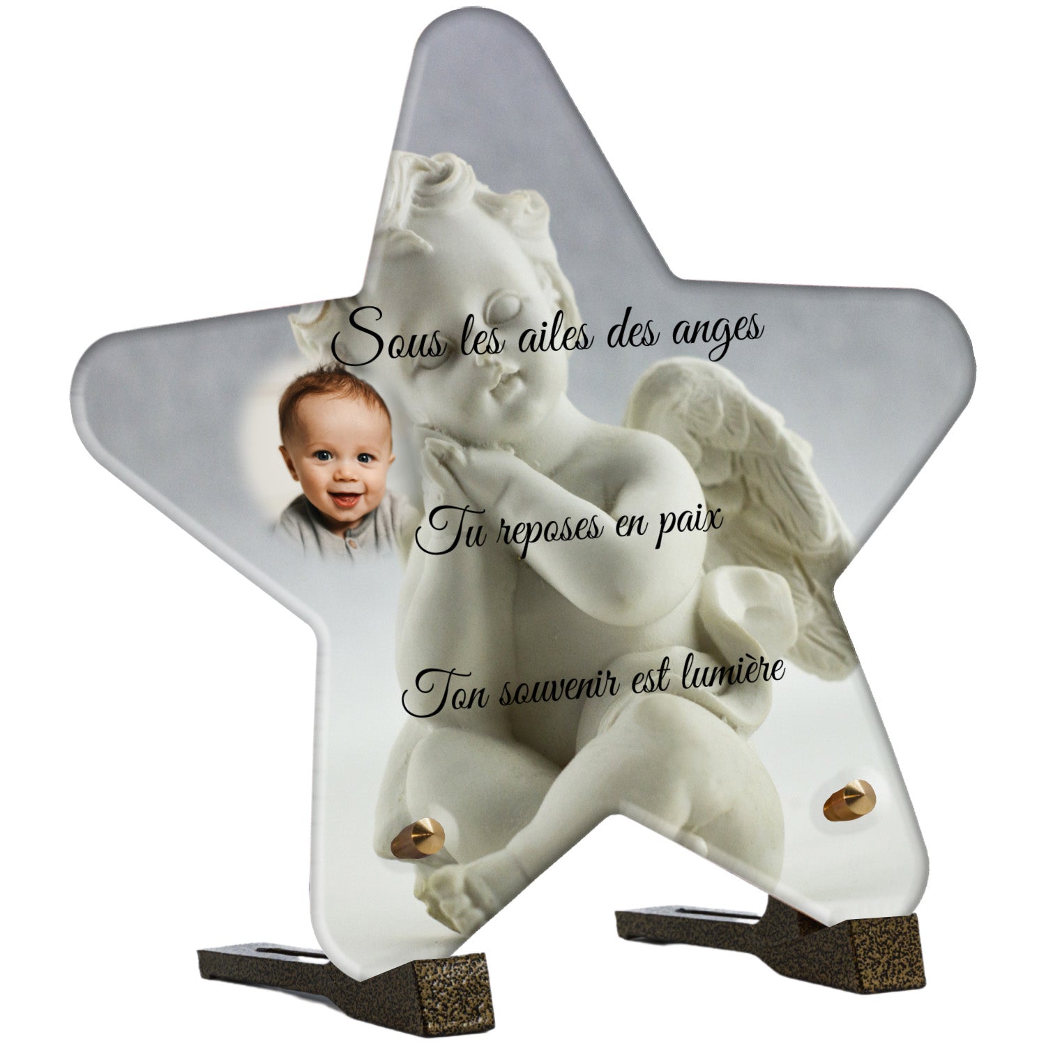 Cette plaque funéraire personnalisée présente un motif délicat d’ange, symbole de paix et de protection, offrant un hommage plein de douceur et de sérénité. Réalisée en plexiglas, cette plaque funéraire moderne combine élégance et résistance, parfaite pour une plaque mortuaire qui sublime la mémoire de vos proches.