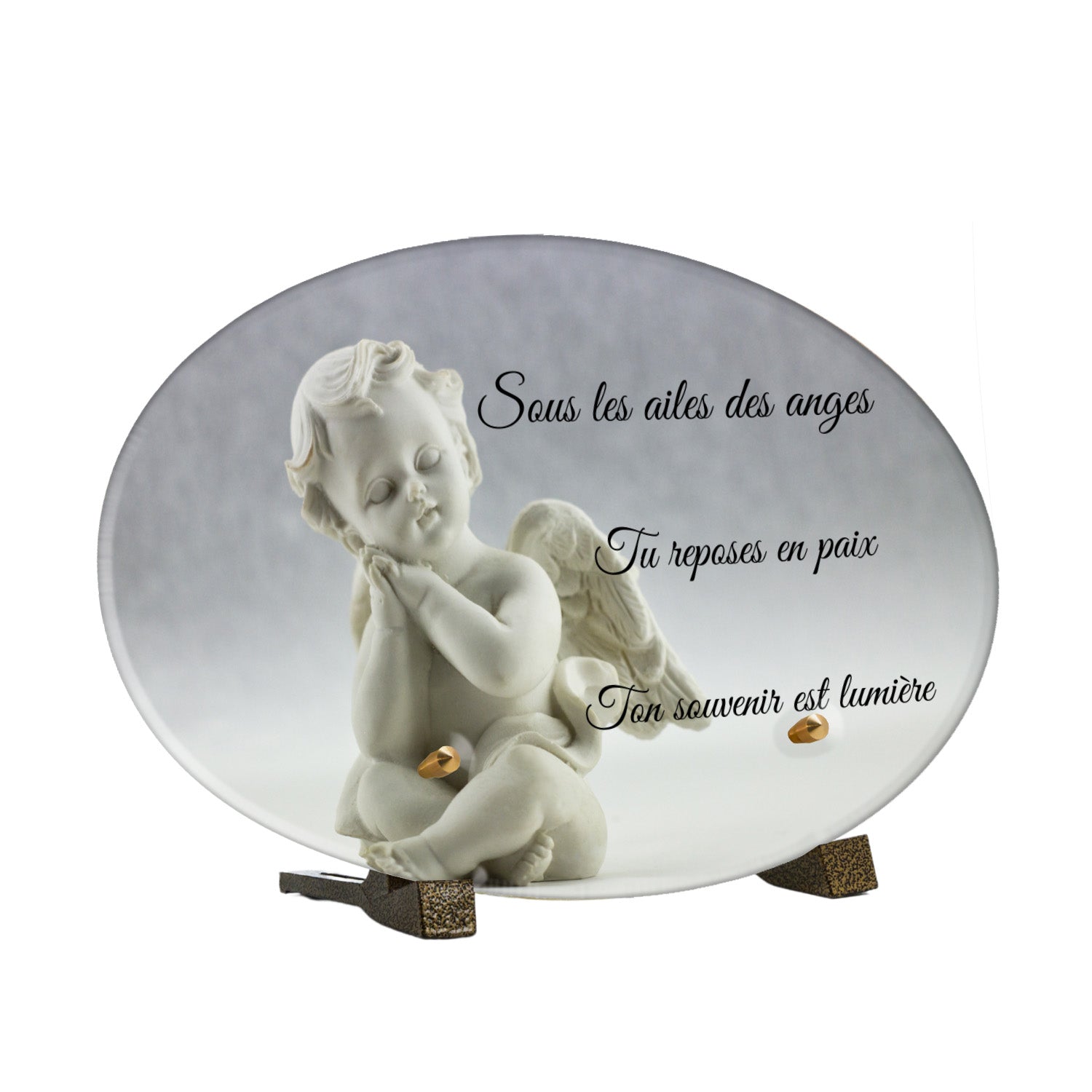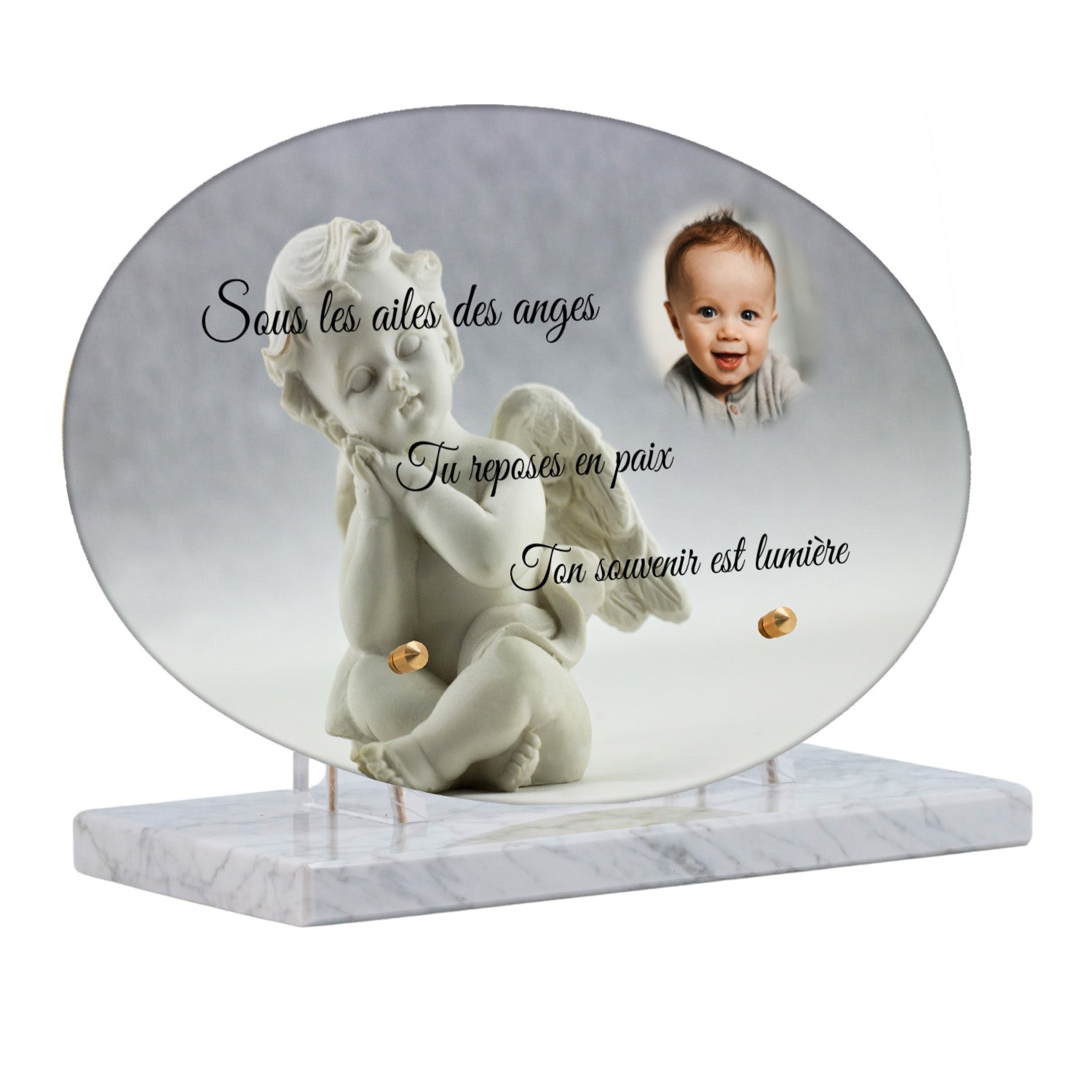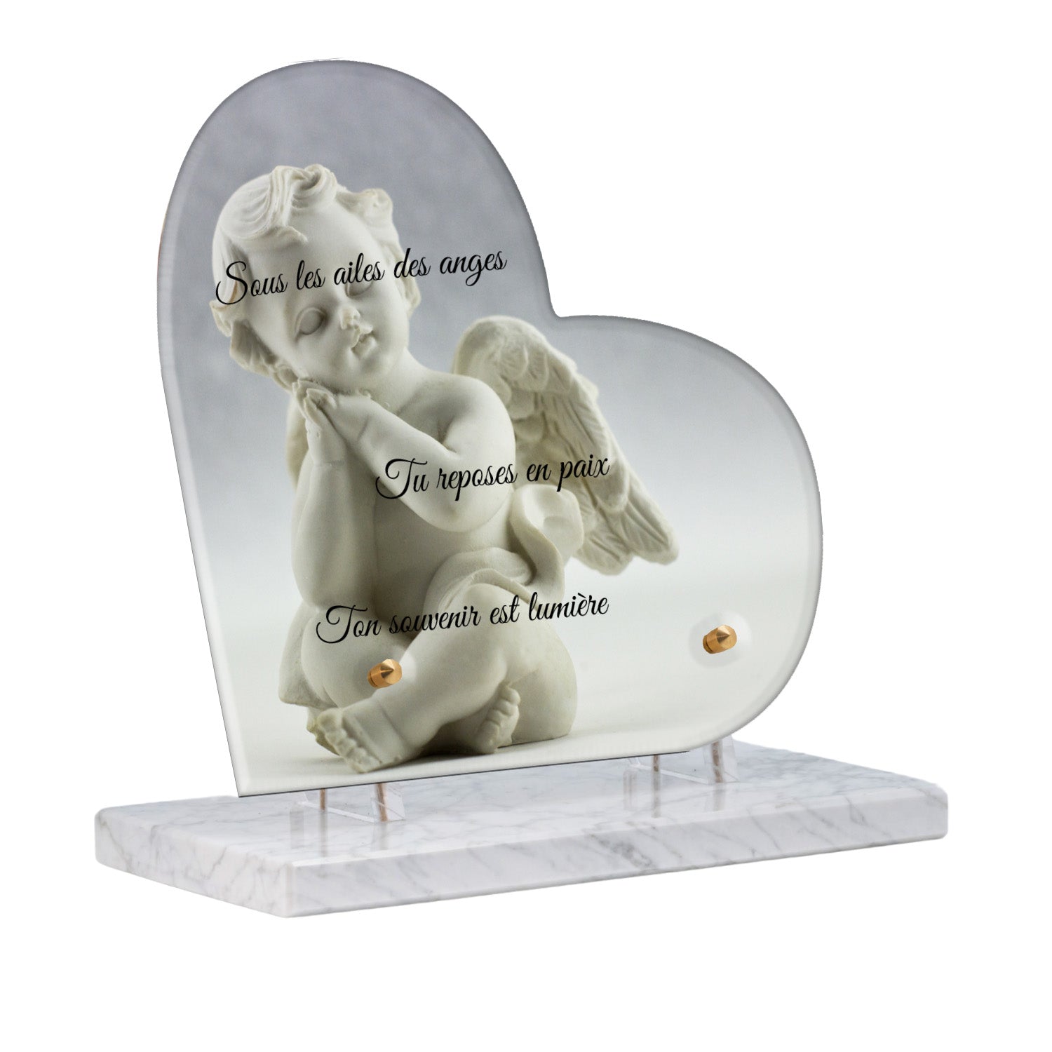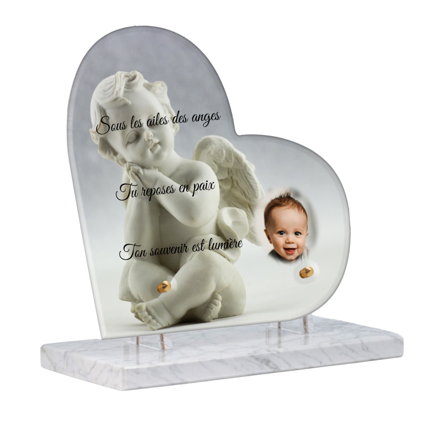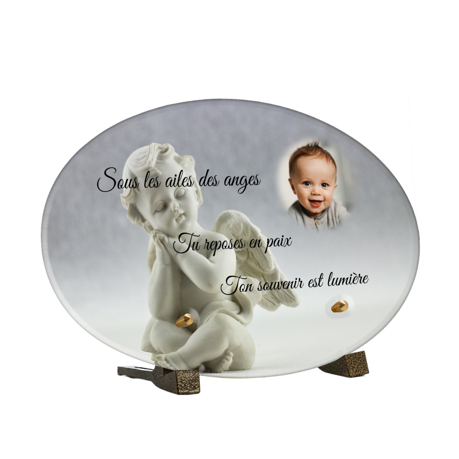Cette plaque funéraire personnalisée présente un motif délicat d’ange, symbole de paix et de protection, offrant un hommage plein de douceur et de sérénité. Réalisée en plexiglas, cette plaque funéraire moderne combine élégance et résistance, parfaite pour une plaque mortuaire qui sublime la mémoire de vos proches.