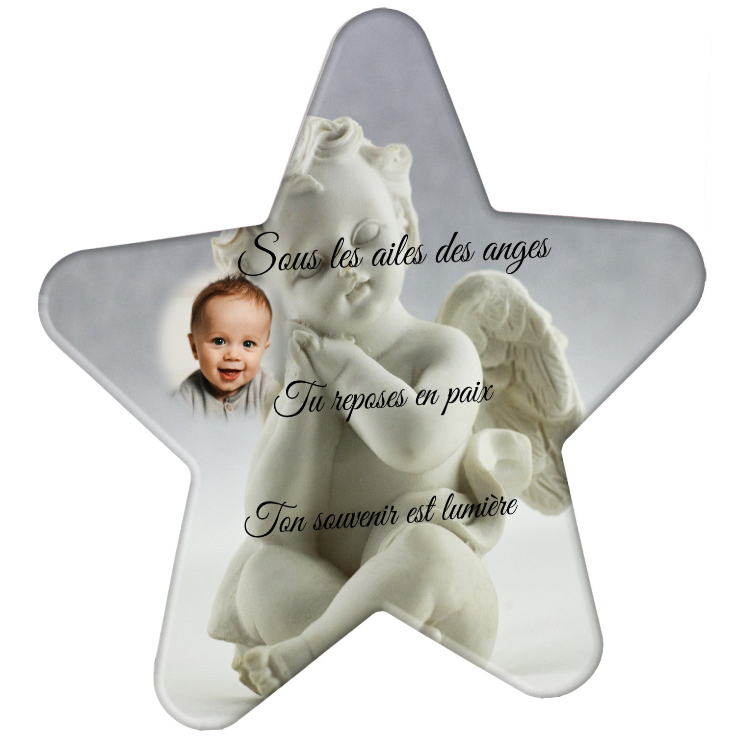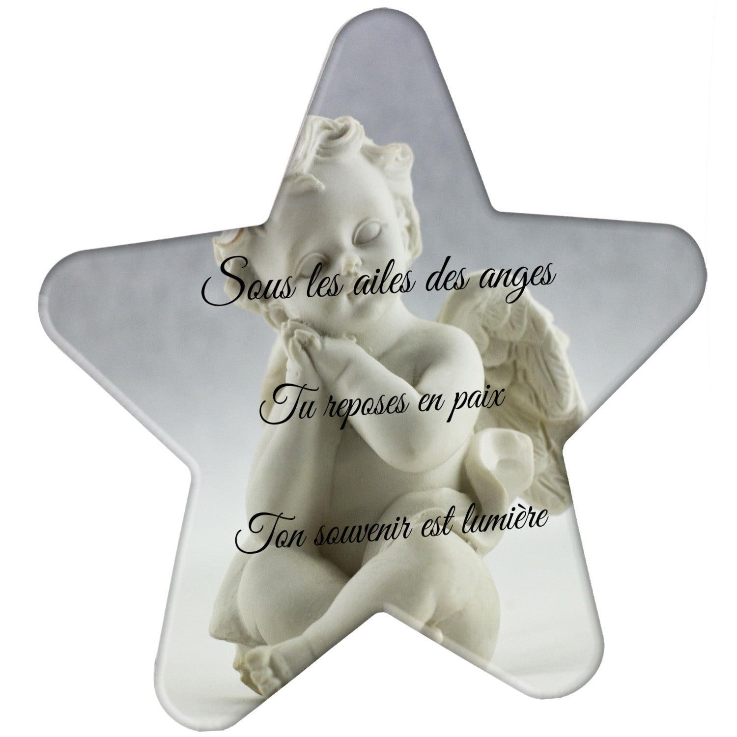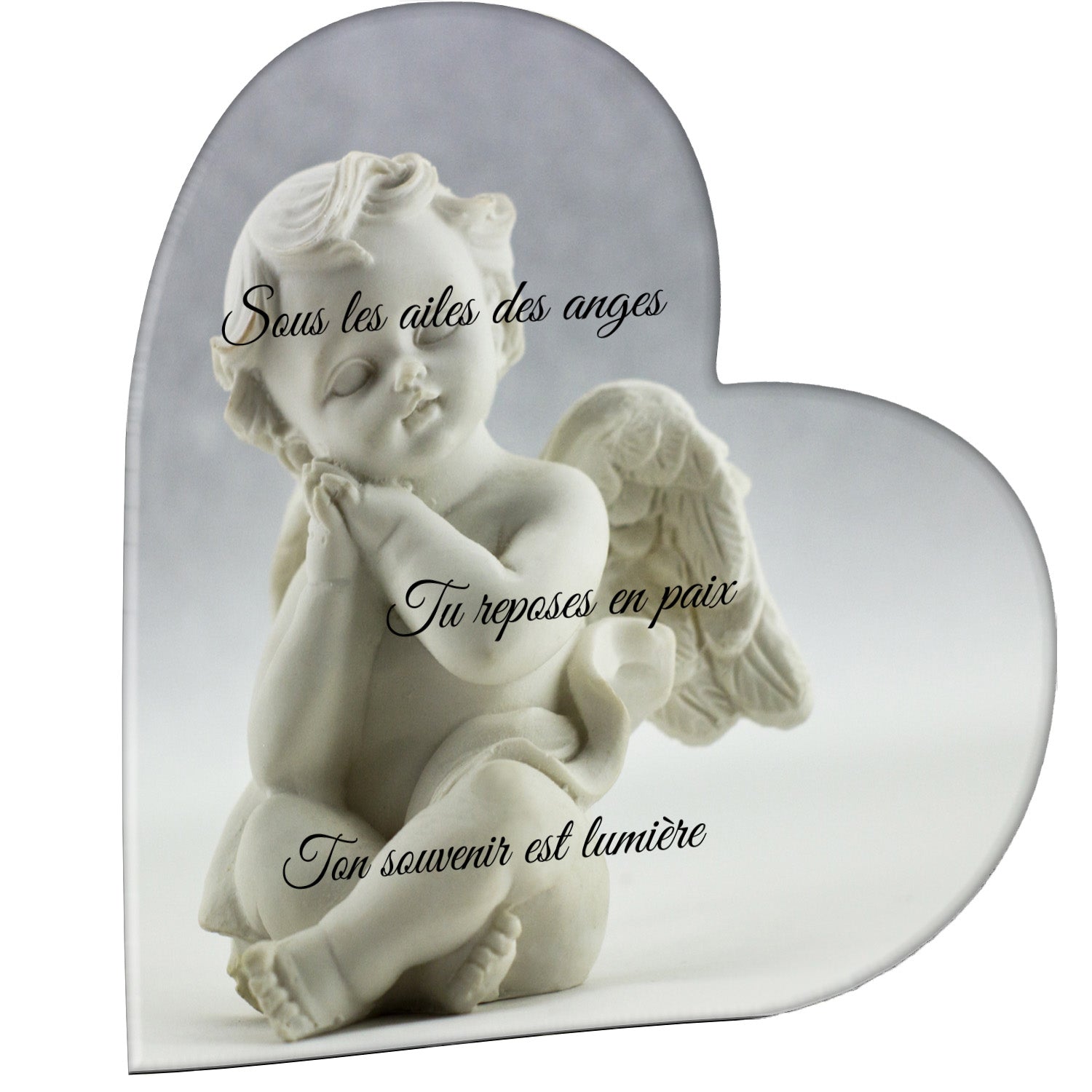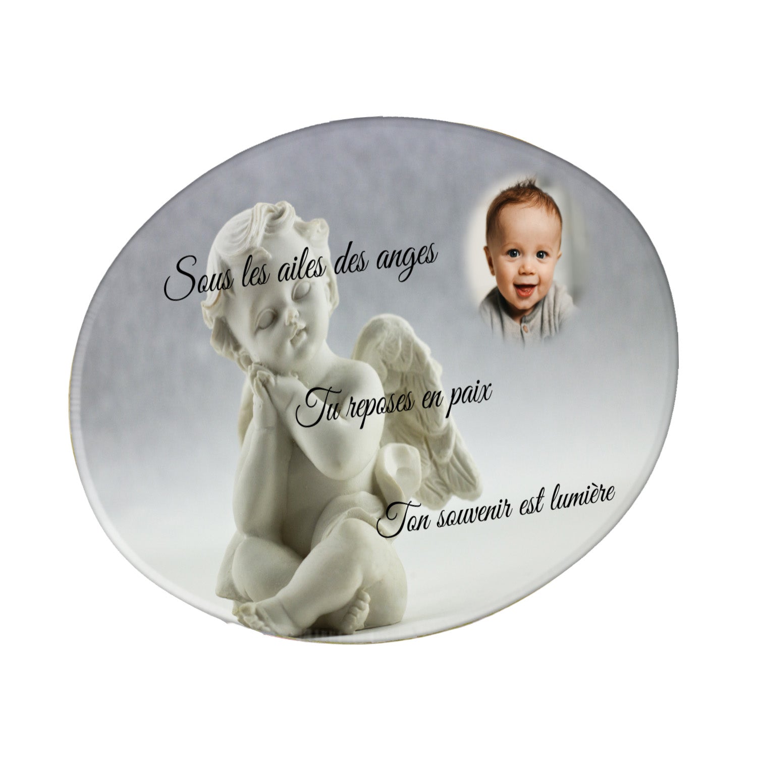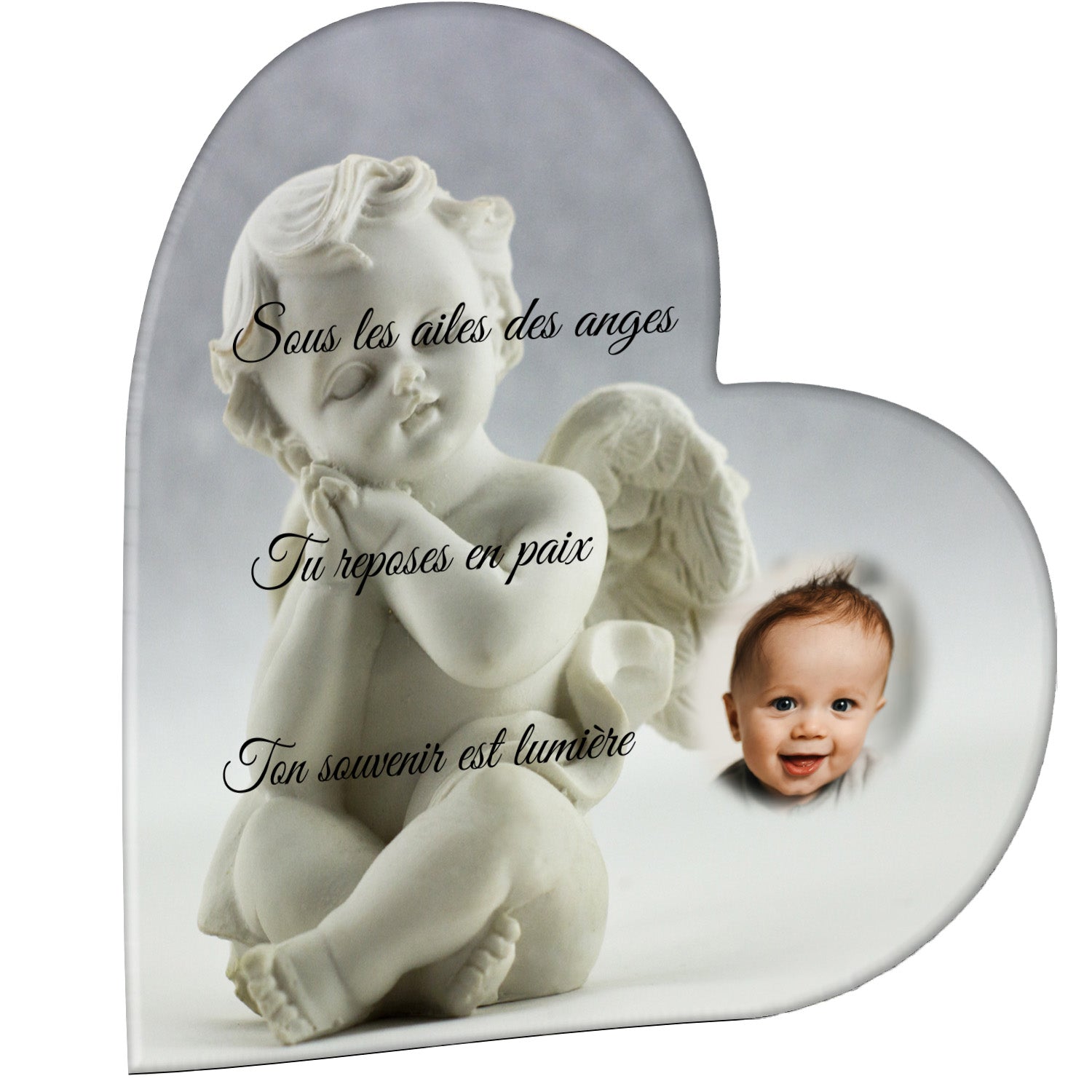 Cette plaque funéraire personnalisée présente un motif délicat d’ange, symbole de paix et de protection, offrant un hommage plein de douceur et de sérénité. Réalisée en plexiglas, cette plaque funéraire moderne combine élégance et résistance, parfaite pour une plaque mortuaire qui sublime la mémoire de vos proches.