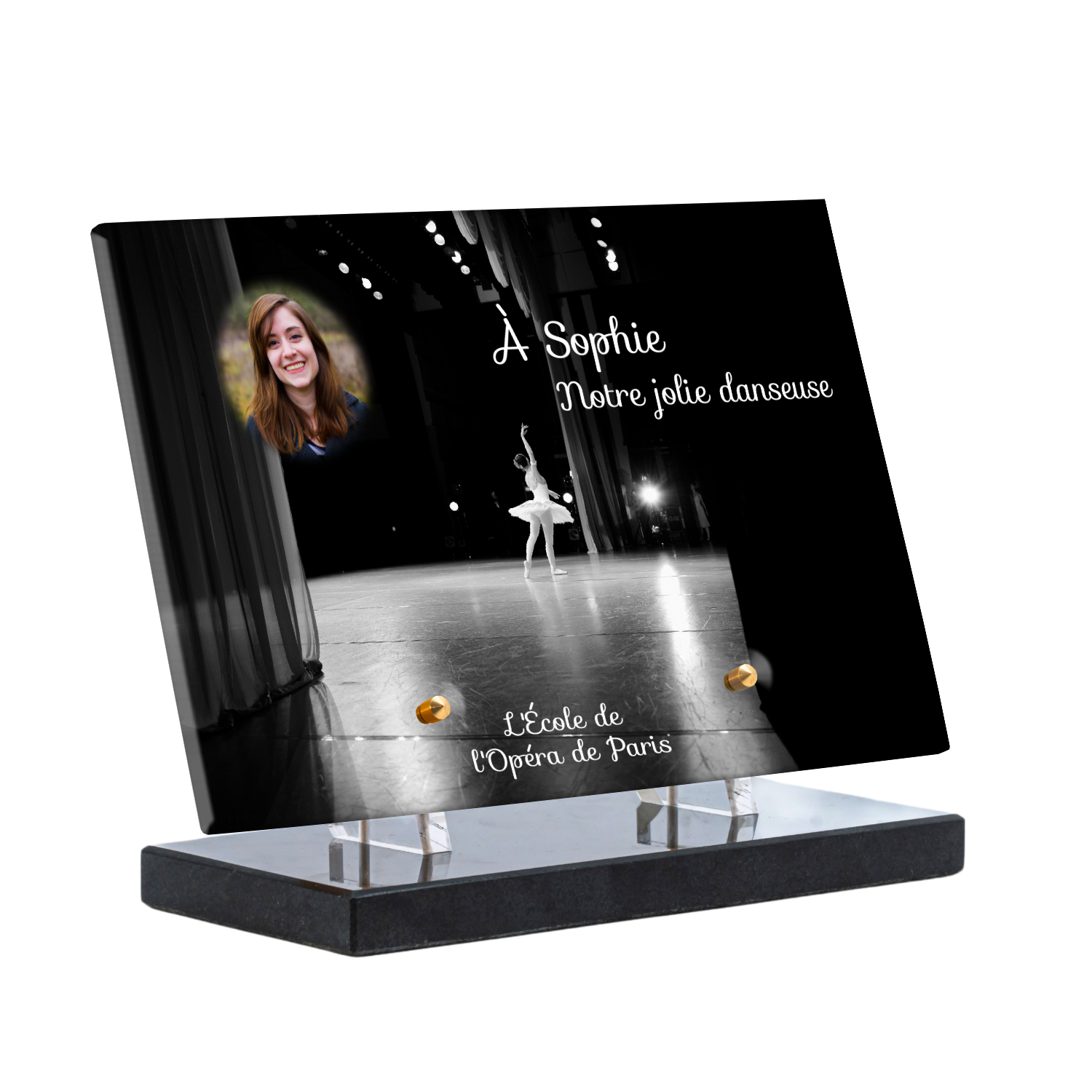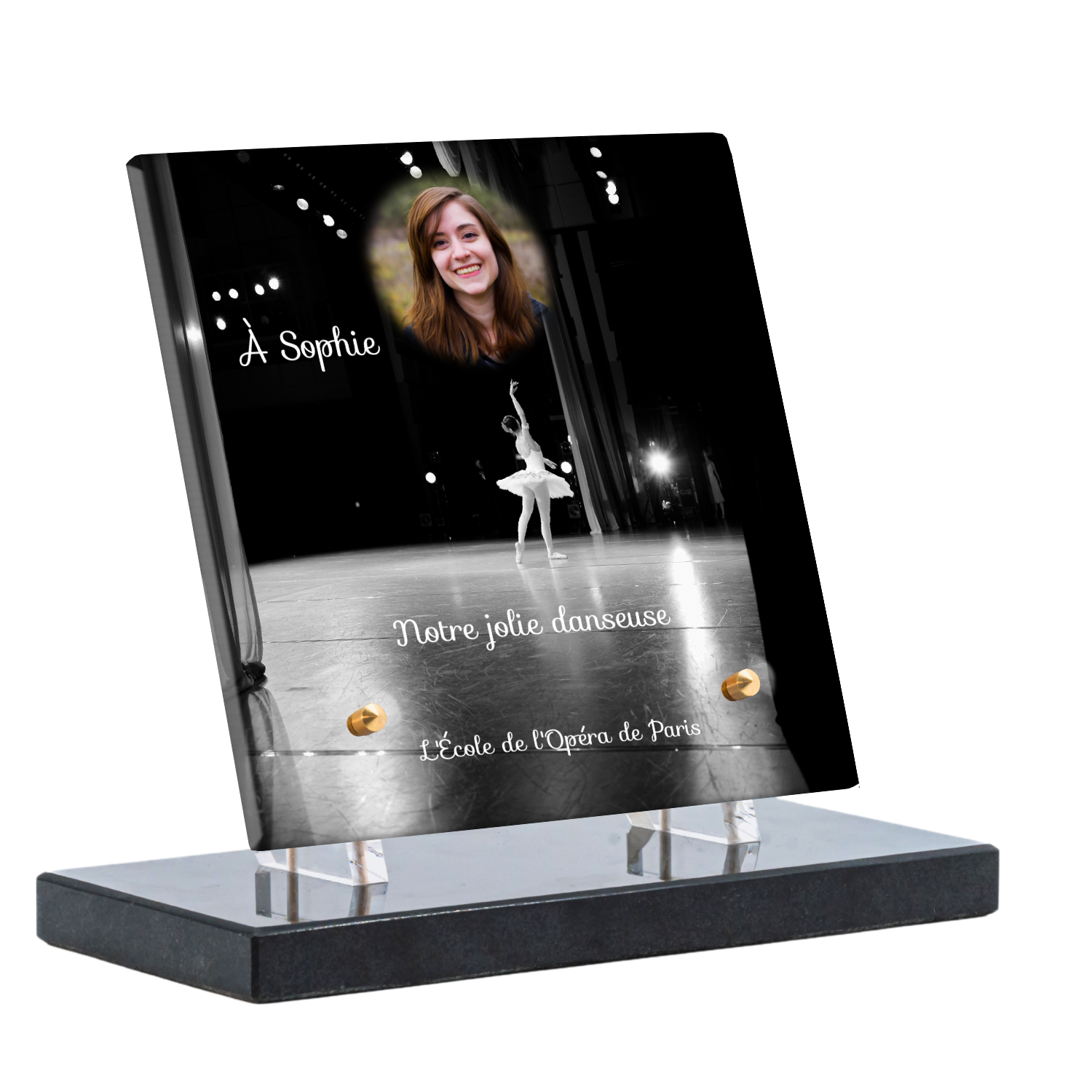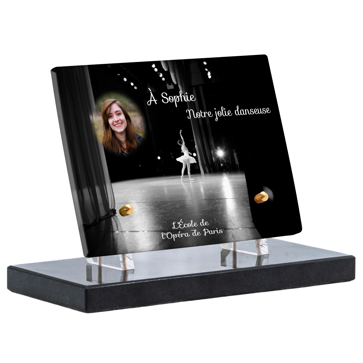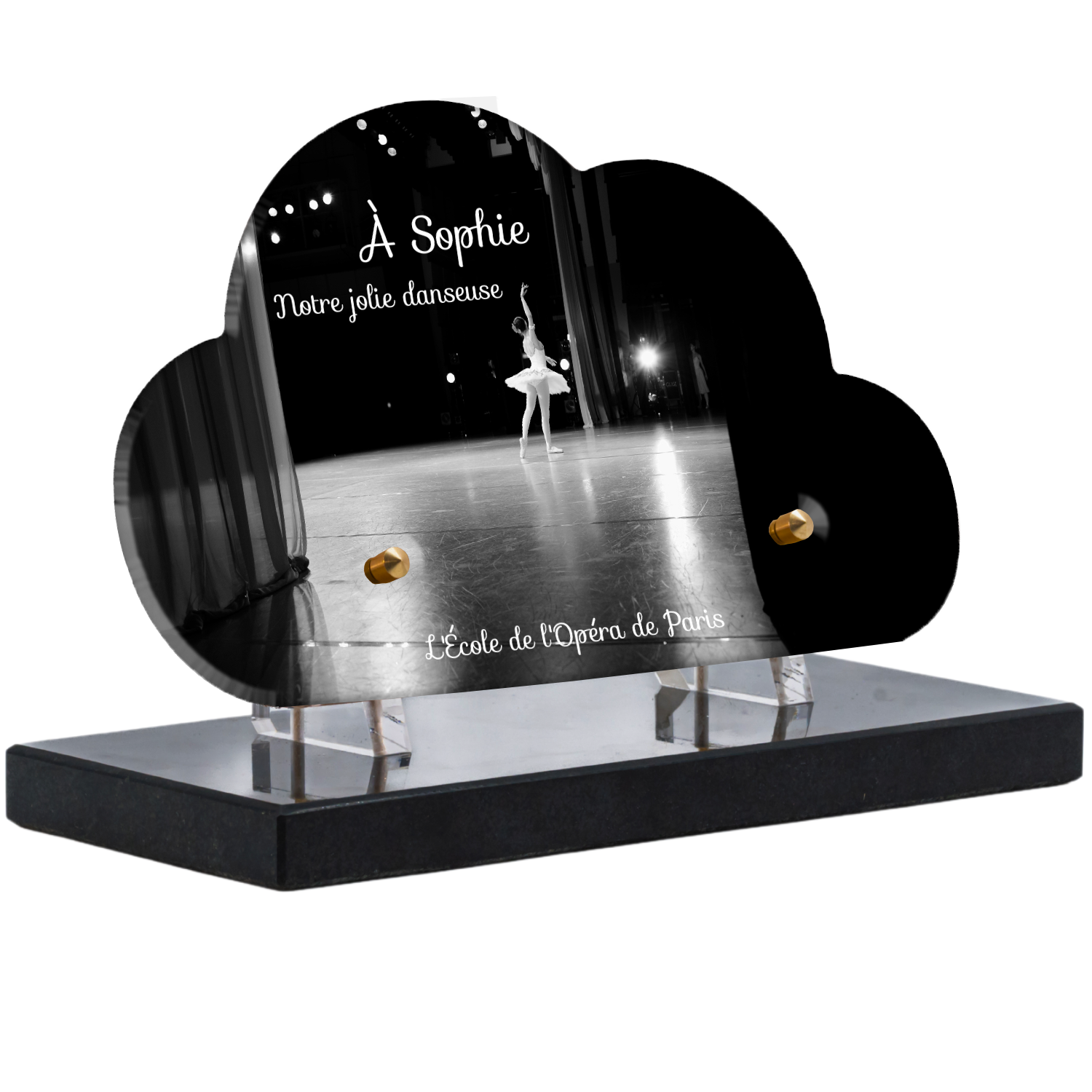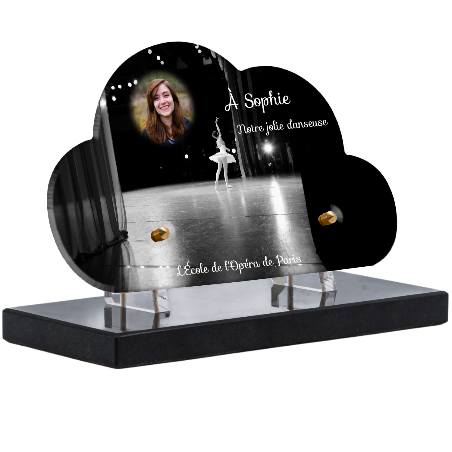 Offrez un hommage unique avec cette plaque funéraire personnalisée représentant une danseuse ballerine sur scène. Conçue en plexiglas, cette plaque funéraire moderne allie élégance et finesse pour célébrer la mémoire avec délicatesse. Son design soigné apporte une touche artistique et respectueuse, idéale pour rendre hommage à un être cher passionné de danse.