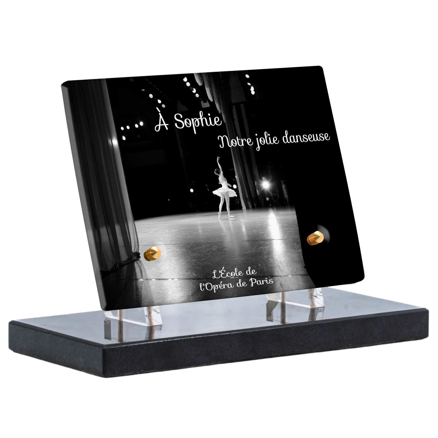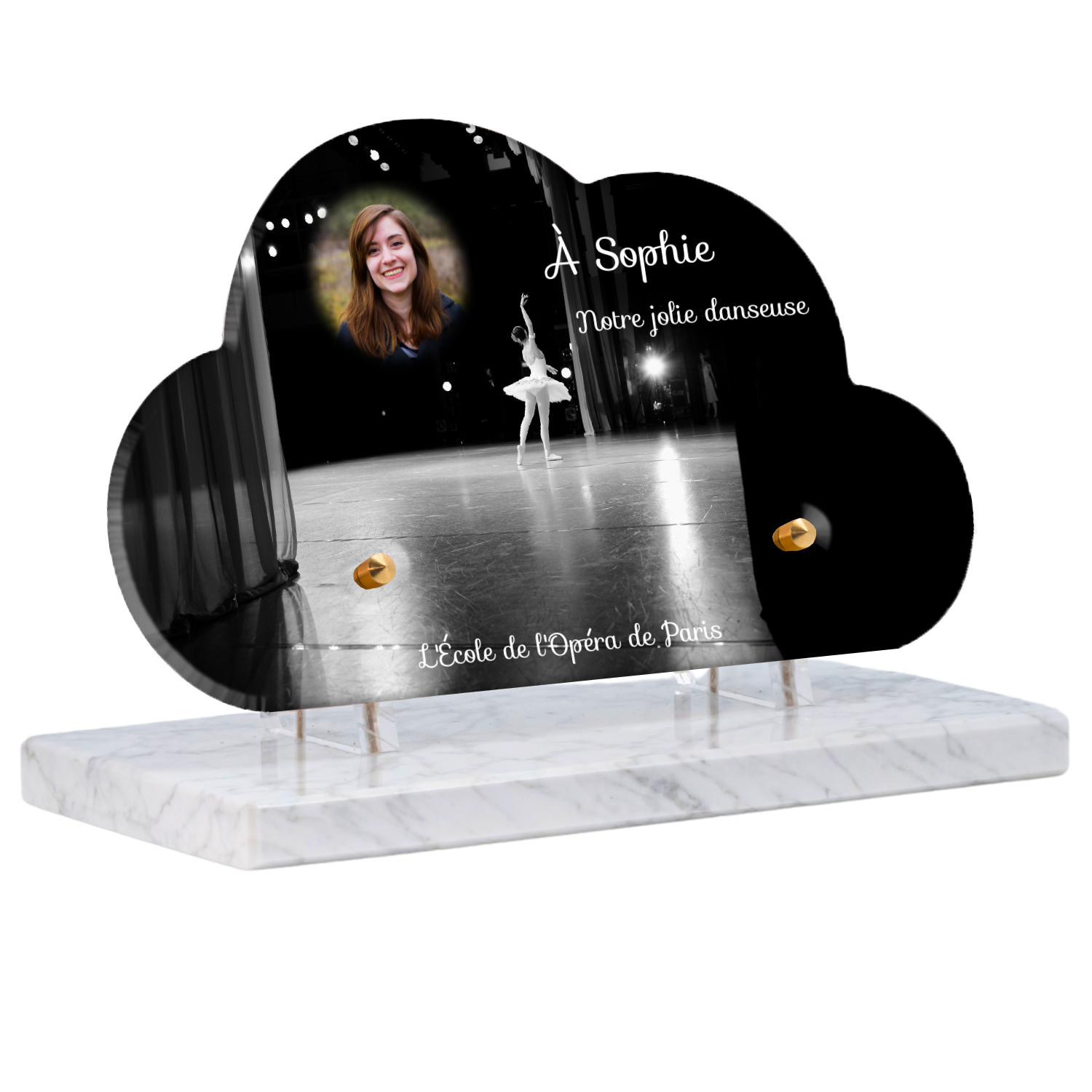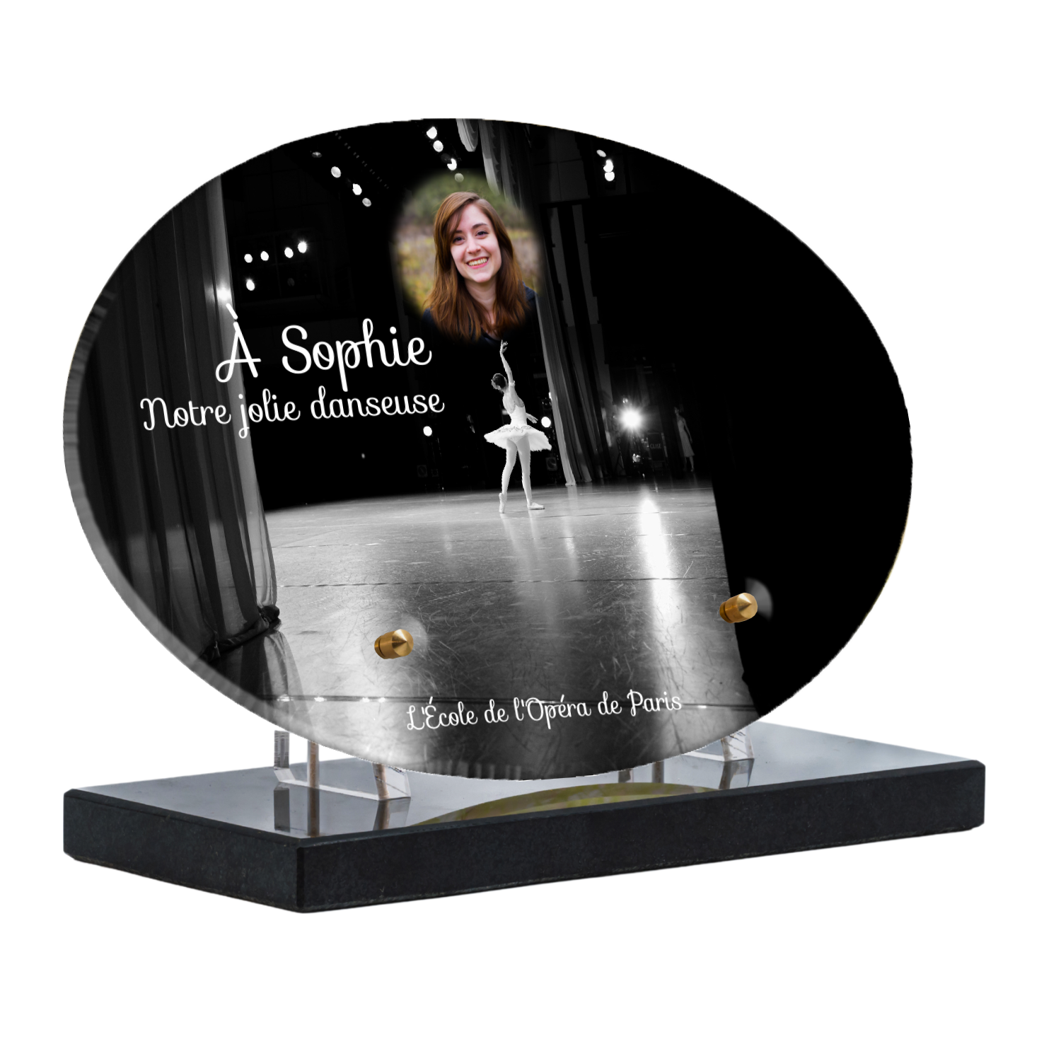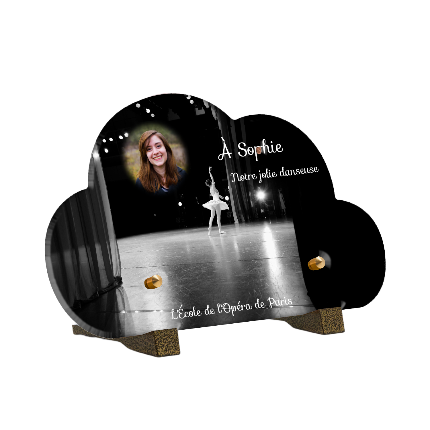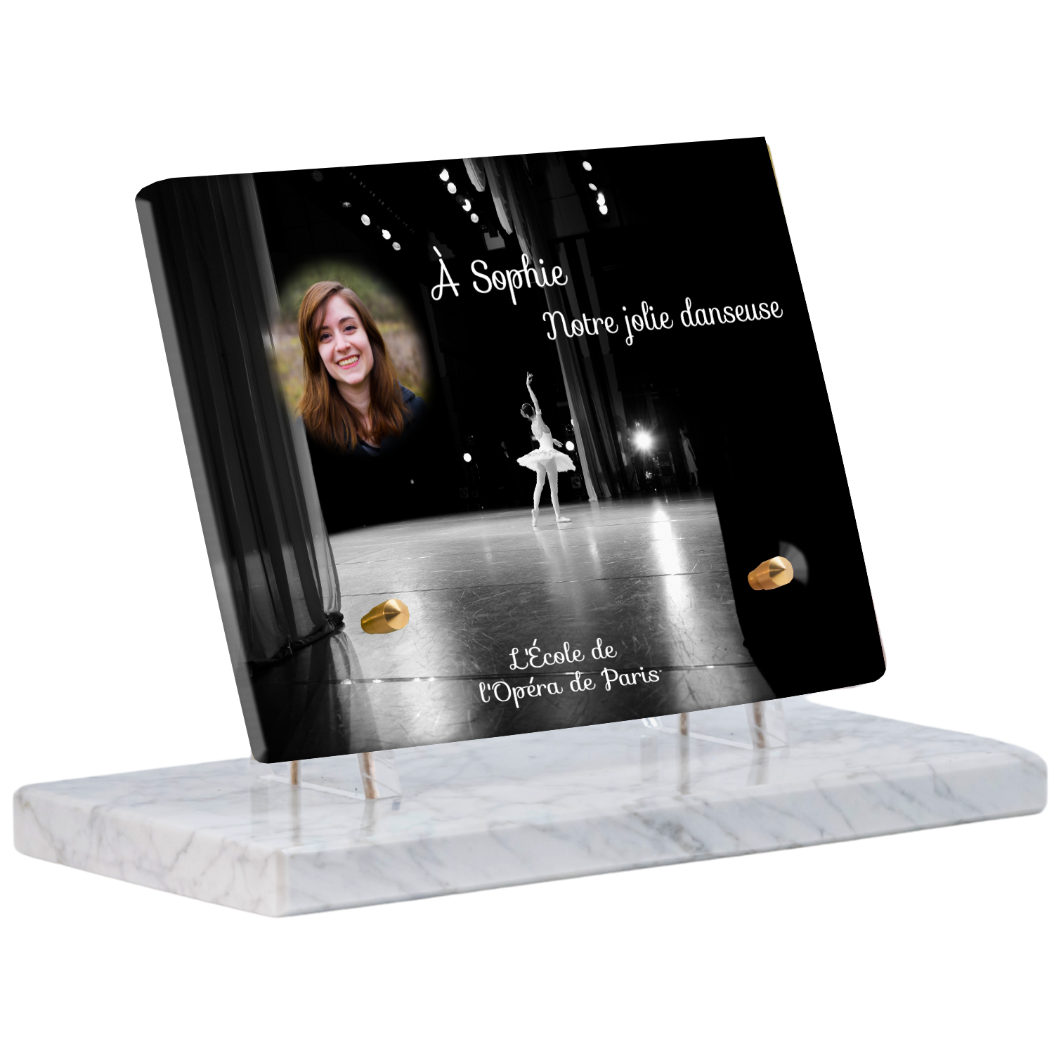 Offrez un hommage unique avec cette plaque funéraire personnalisée représentant une danseuse ballerine sur scène. Conçue en plexiglas, cette plaque funéraire moderne allie élégance et finesse pour célébrer la mémoire avec délicatesse. Son design soigné apporte une touche artistique et respectueuse, idéale pour rendre hommage à un être cher passionné de danse.
