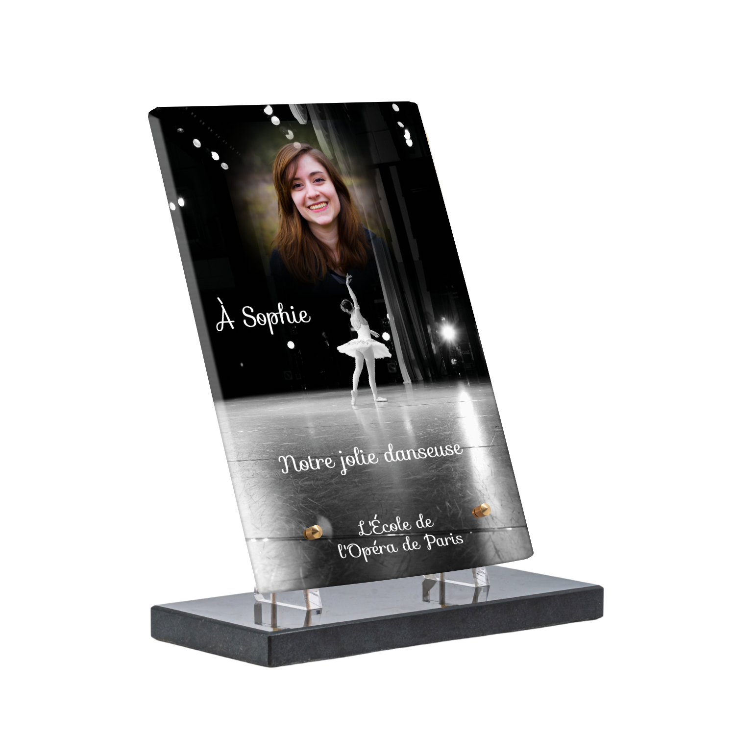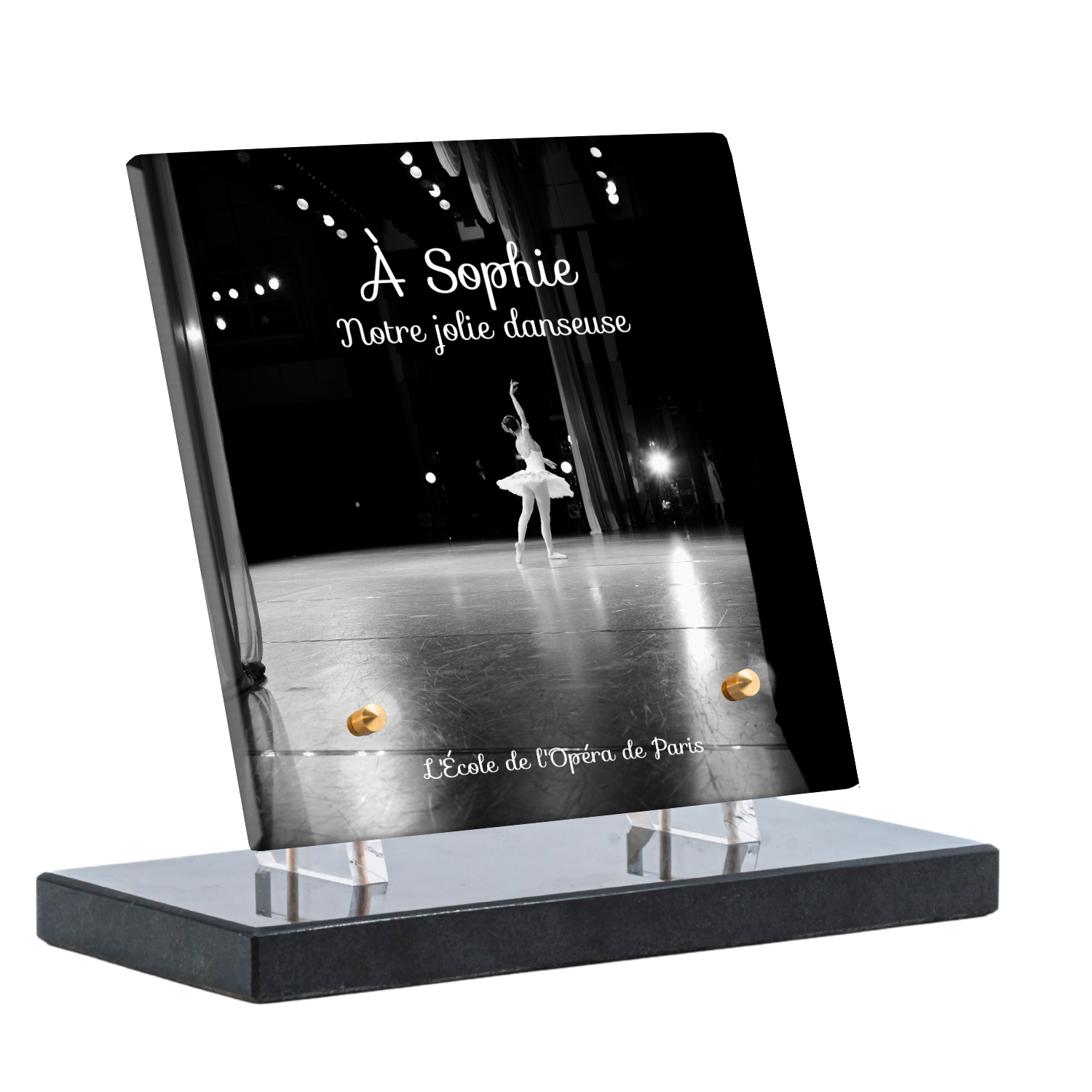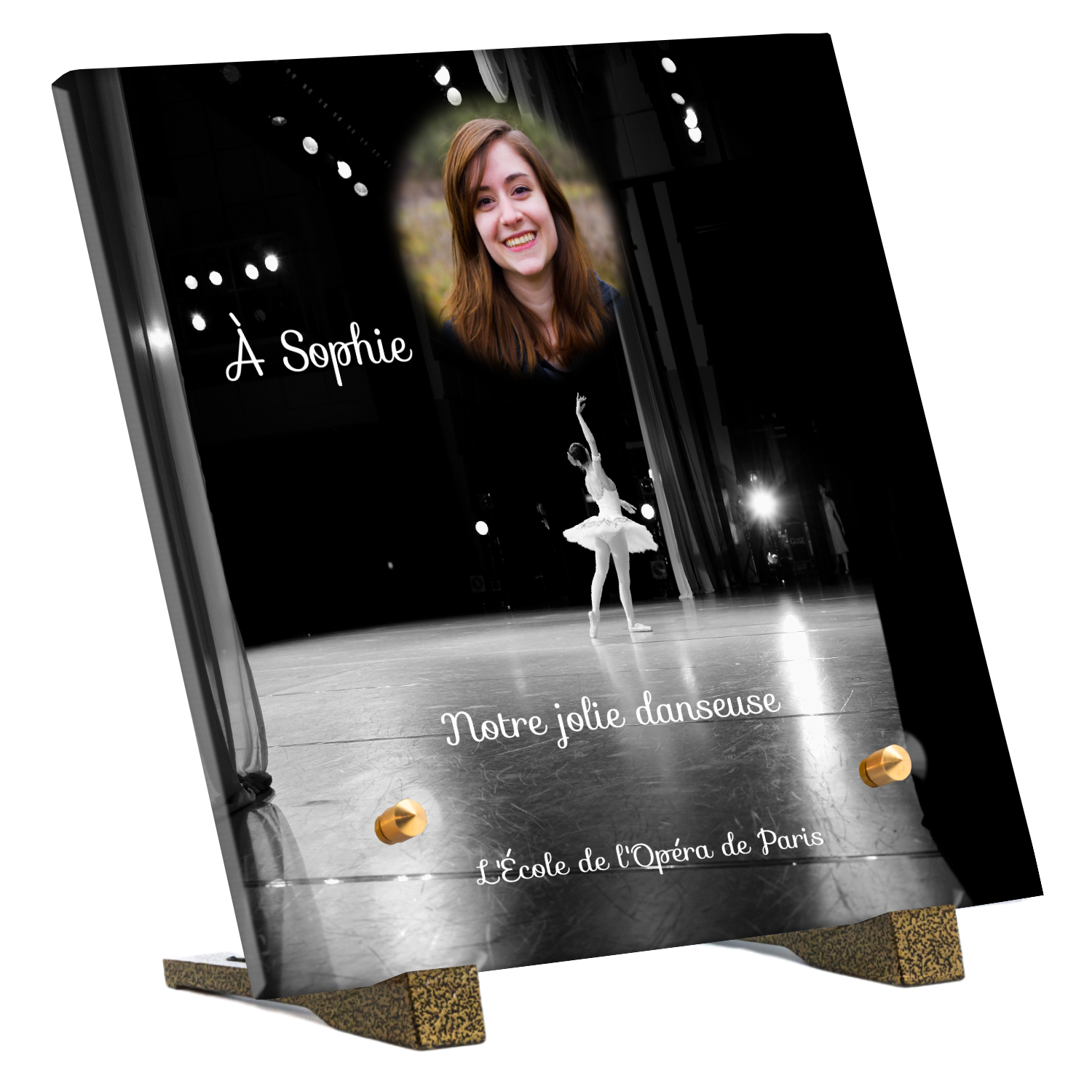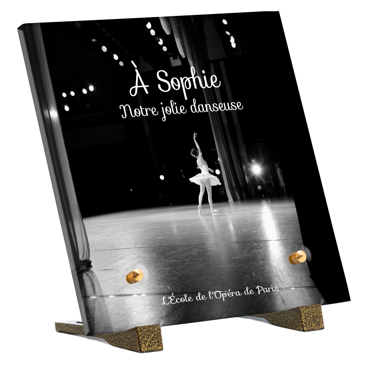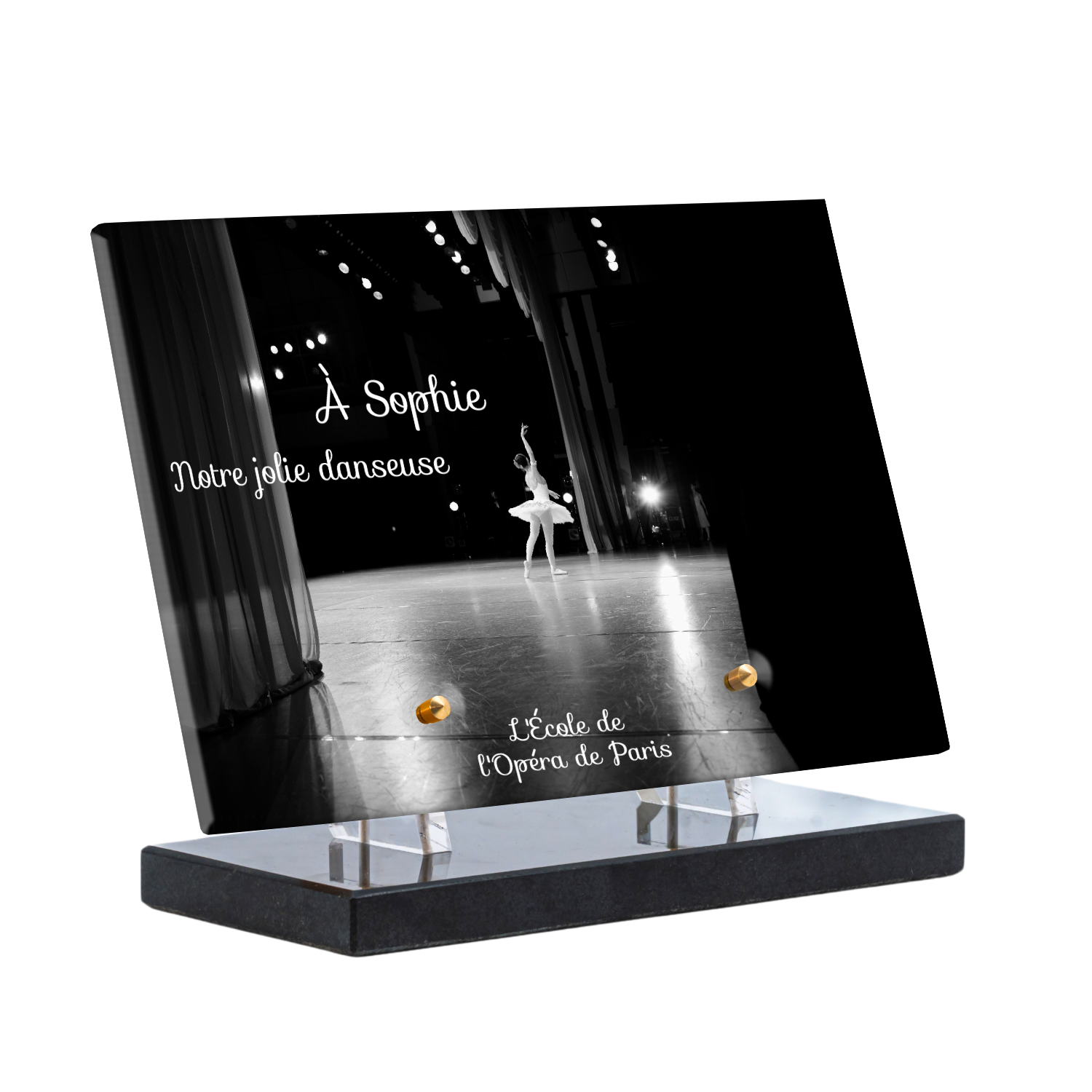 Offrez un hommage unique avec cette plaque funéraire personnalisée représentant une danseuse ballerine sur scène. Conçue en plexiglas, cette plaque funéraire moderne allie élégance et finesse pour célébrer la mémoire avec délicatesse. Son design soigné apporte une touche artistique et respectueuse, idéale pour rendre hommage à un être cher passionné de danse.
